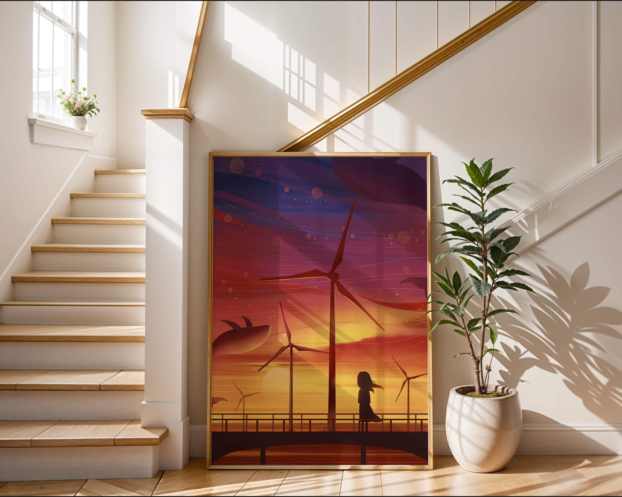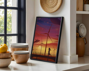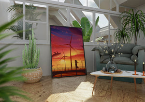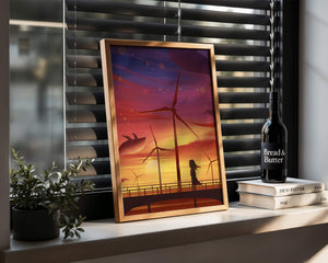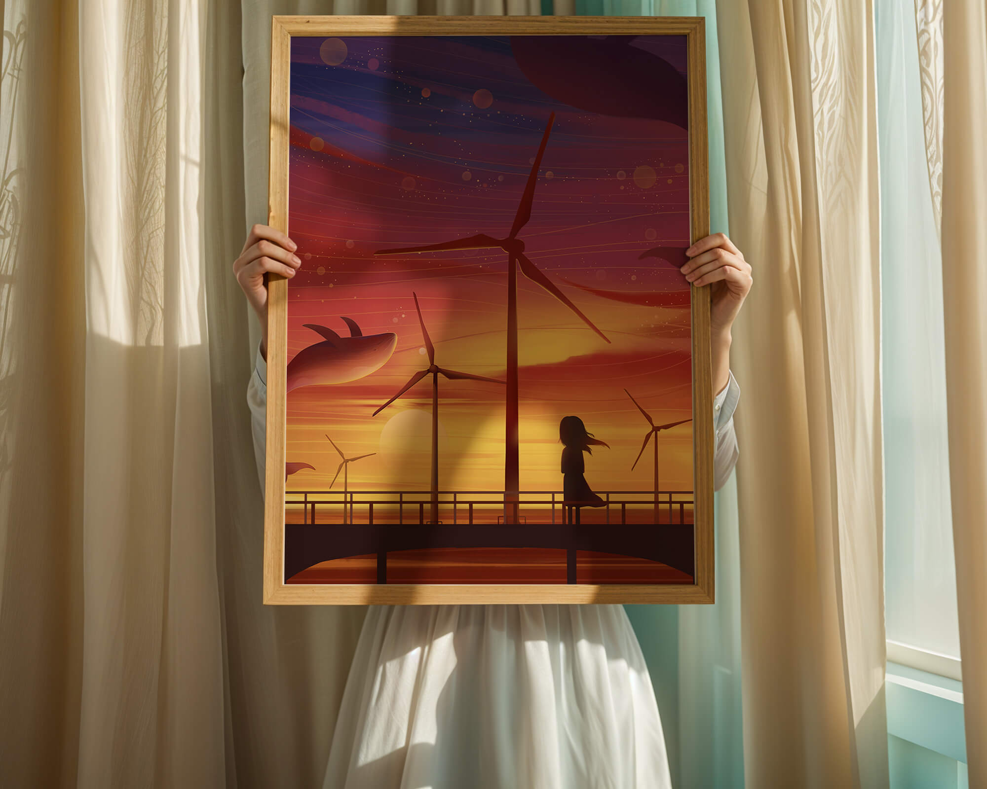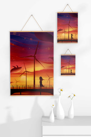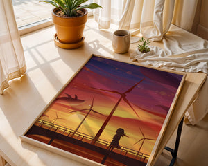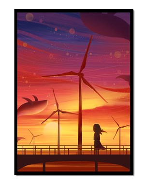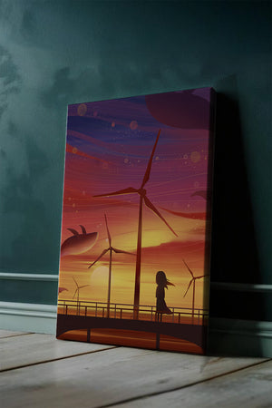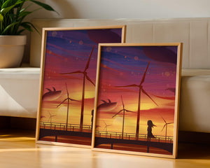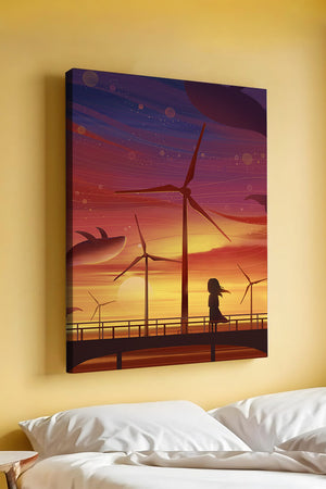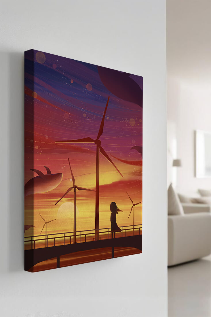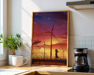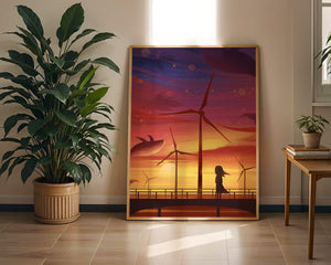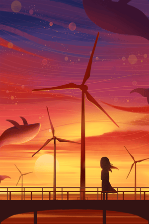 In the foreground, a silhouetted girl stands on a bridge, her hair gently swaying in the evening breeze. She gazes upon the serene landscape before her, with wind turbines capturing the energy of the moment. The whimsical addition of flying whales in the sky enhances the surreal aura, creating a dreamlike atmosphere that invites viewers to immerse themselves into a world of tranquility and wonder.This enchanting scene not only highlights the beauty of a sunset but also evokes a sense of calm and inspiration. The presence of renewable energy elements such as the wind turbines further symbolizes a harmonious balance between nature and modern innovation, offering a hopeful glimpse into a sustainable future.