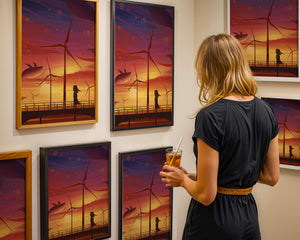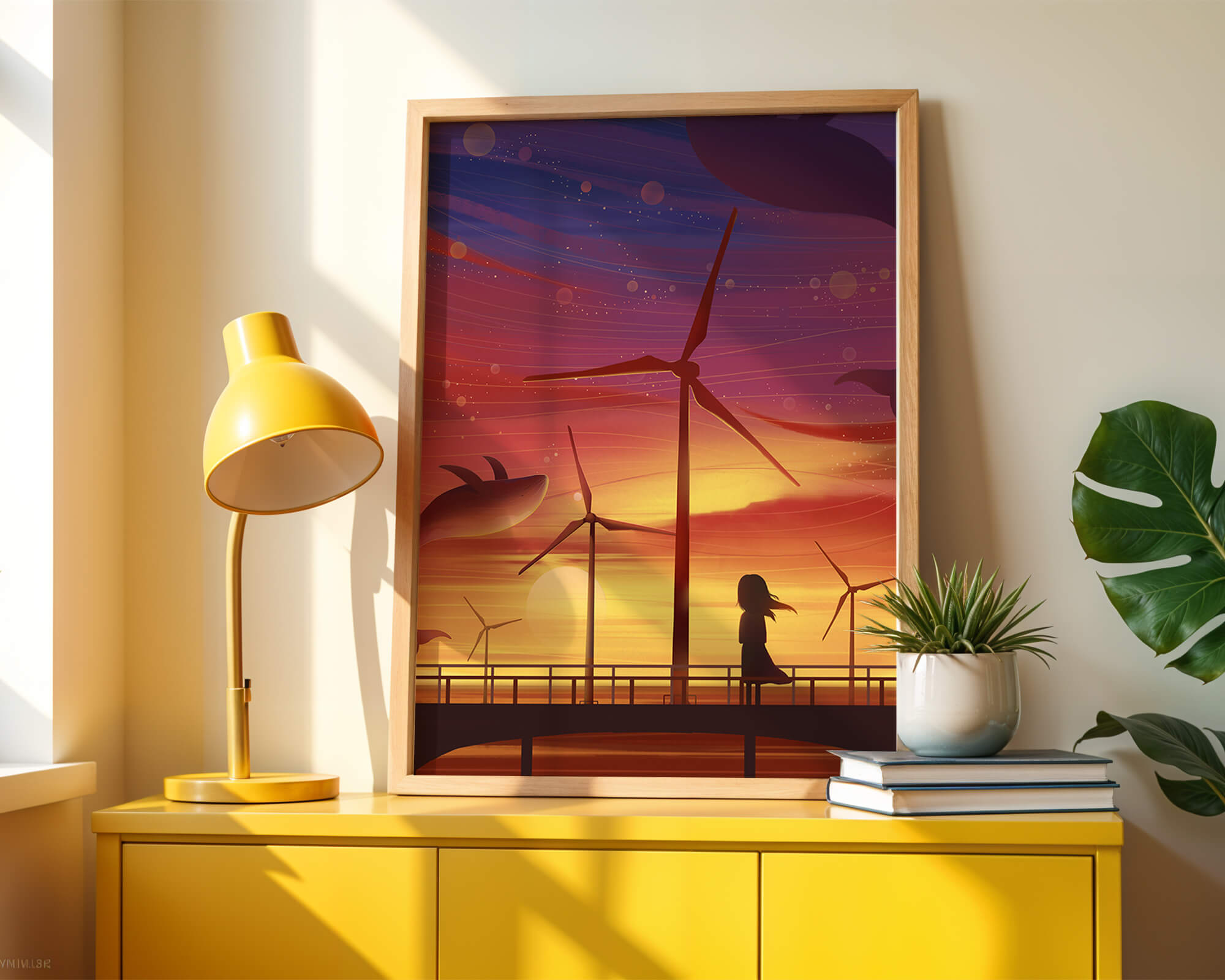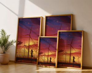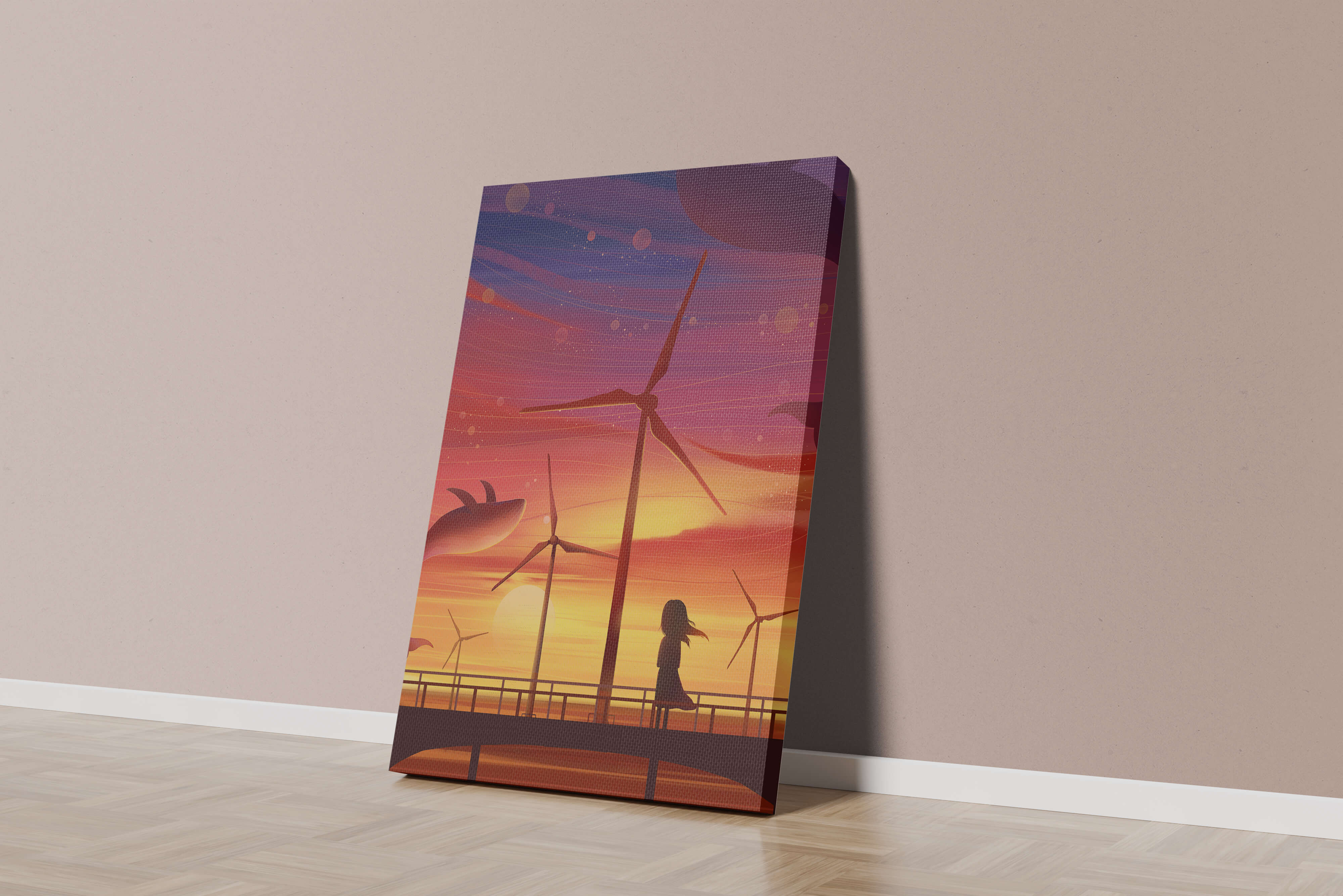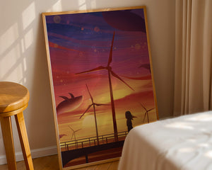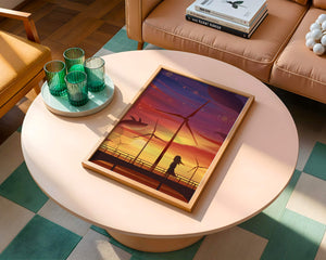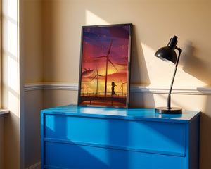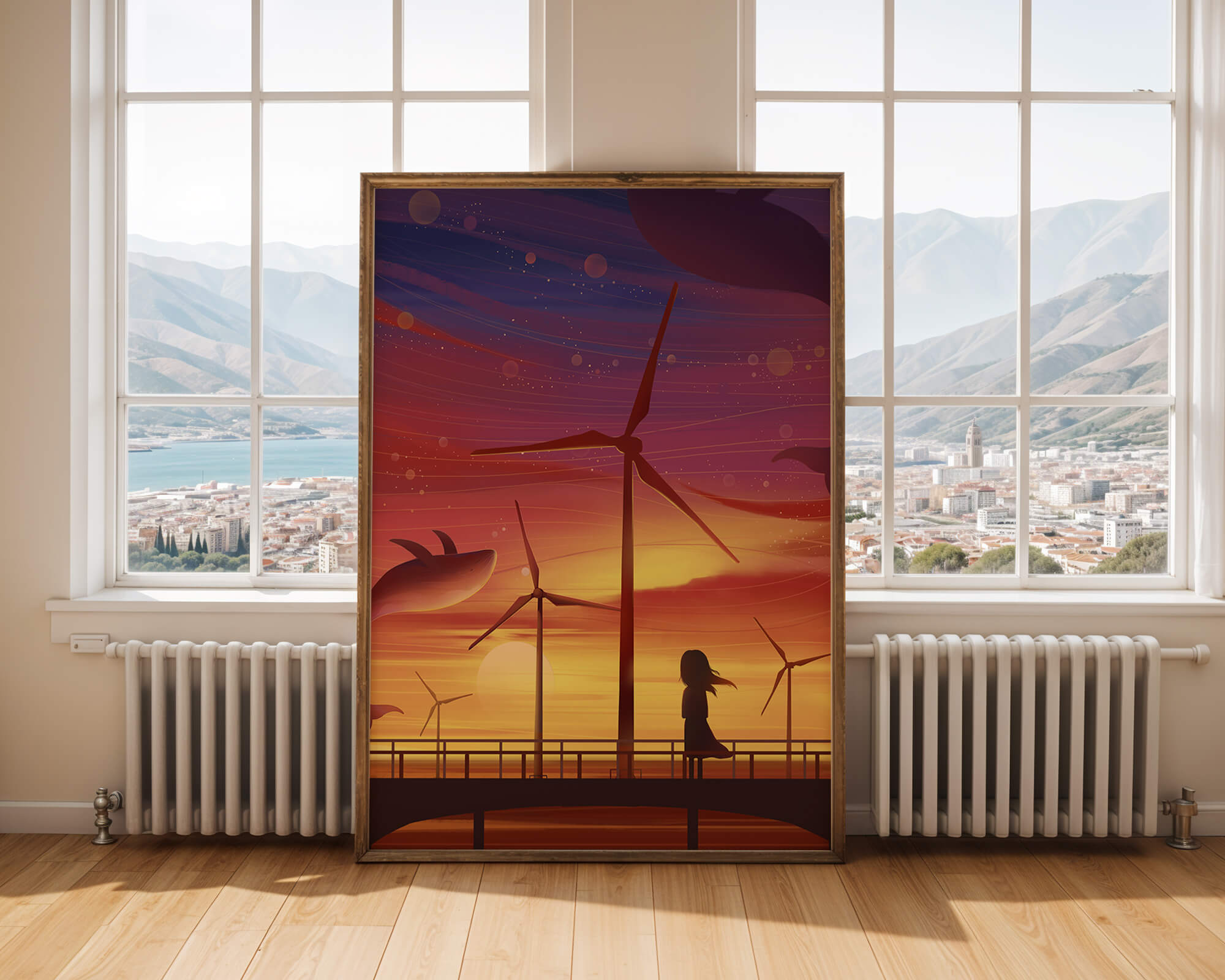 In the foreground, a silhouetted girl stands on a bridge, her hair gently swaying in the evening breeze. She gazes upon the serene landscape before her, with wind turbines capturing the energy of the moment. The whimsical addition of flying whales in the sky enhances the surreal aura, creating a dreamlike atmosphere that invites viewers to immerse themselves into a world of tranquility and wonder.This enchanting scene not only highlights the beauty of a sunset but also evokes a sense of calm and inspiration. The presence of renewable energy elements such as the wind turbines further symbolizes a harmonious balance between nature and modern innovation, offering a hopeful glimpse into a sustainable future.