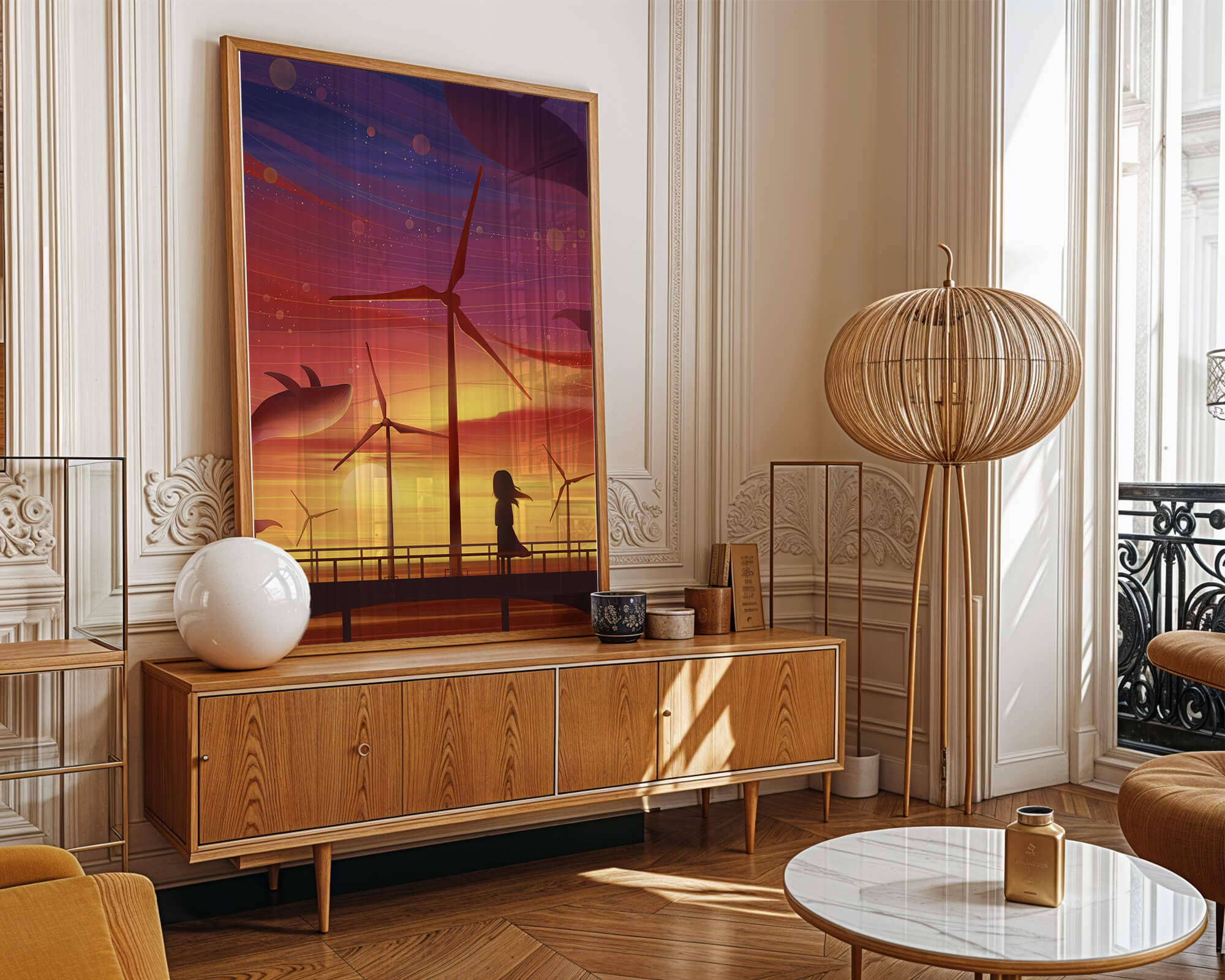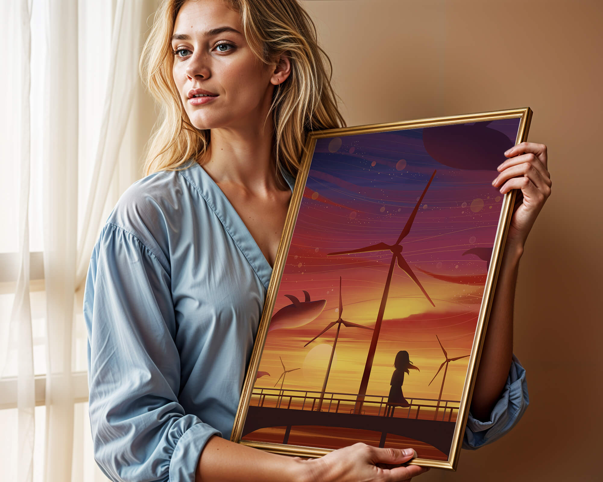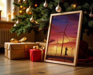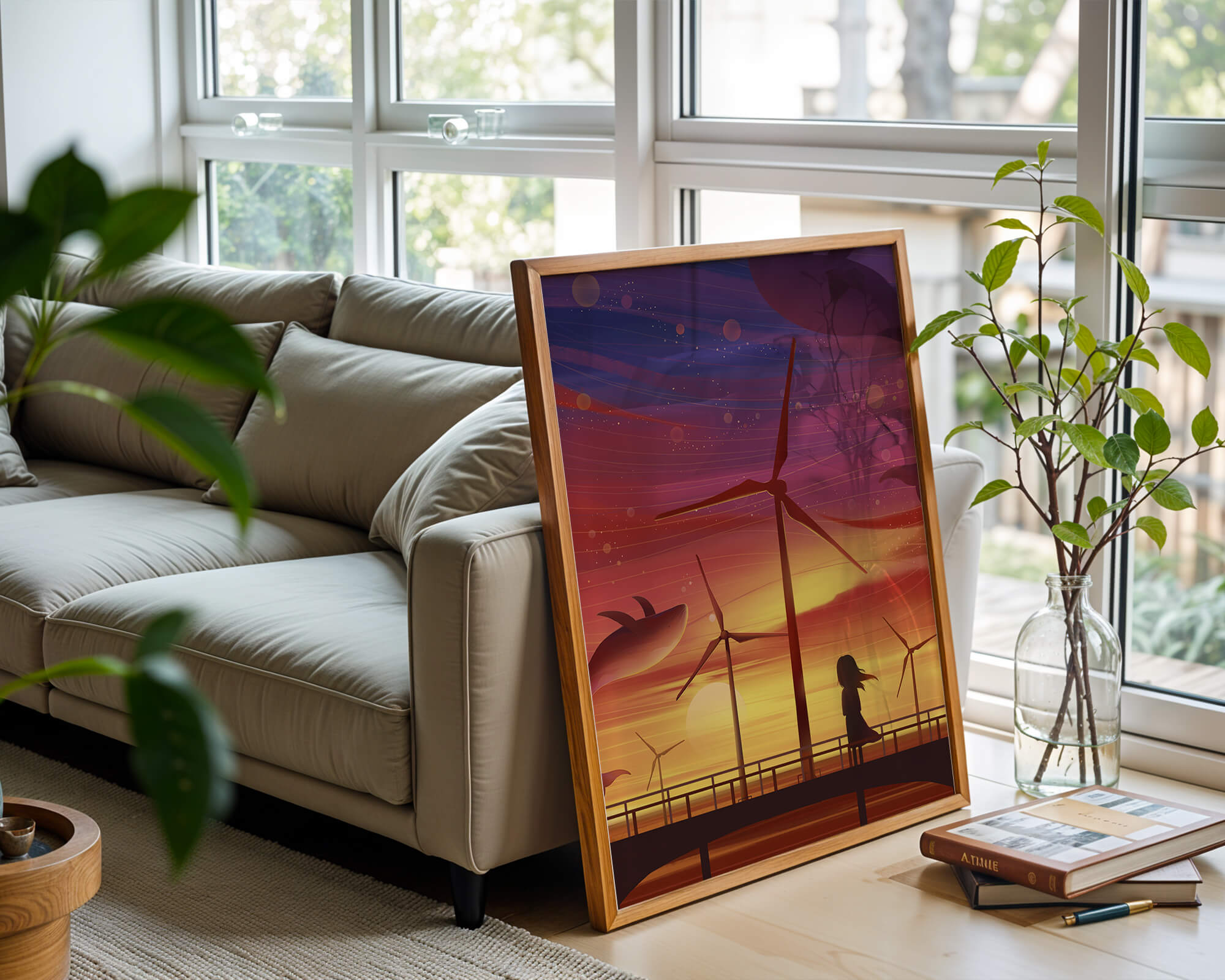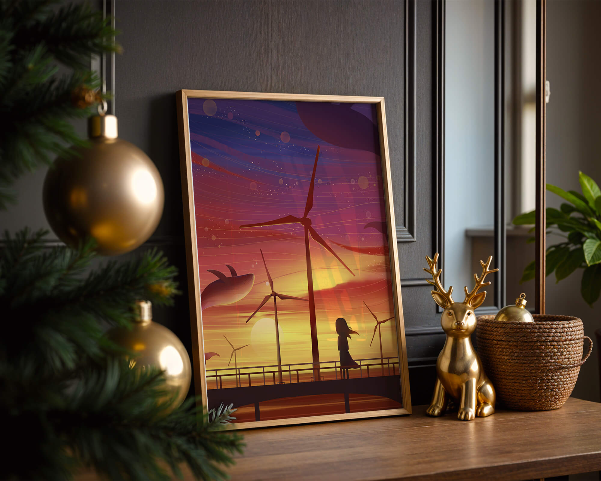 In the foreground, a silhouetted girl stands on a bridge, her hair gently swaying in the evening breeze. She gazes upon the serene landscape before her, with wind turbines capturing the energy of the moment. The whimsical addition of flying whales in the sky enhances the surreal aura, creating a dreamlike atmosphere that invites viewers to immerse themselves into a world of tranquility and wonder.This enchanting scene not only highlights the beauty of a sunset but also evokes a sense of calm and inspiration. The presence of renewable energy elements such as the wind turbines further symbolizes a harmonious balance between nature and modern innovation, offering a hopeful glimpse into a sustainable future.