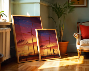 The image portrays a magical sunset, blending the natural beauty of the sky with a touch of fantasy. Wind turbines stand majestically against a stunning gradient of oranges and pinks, accentuating the warm glow of the setting sun.