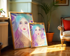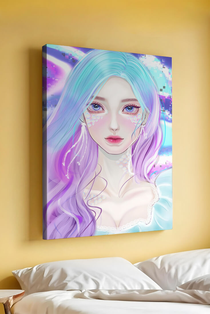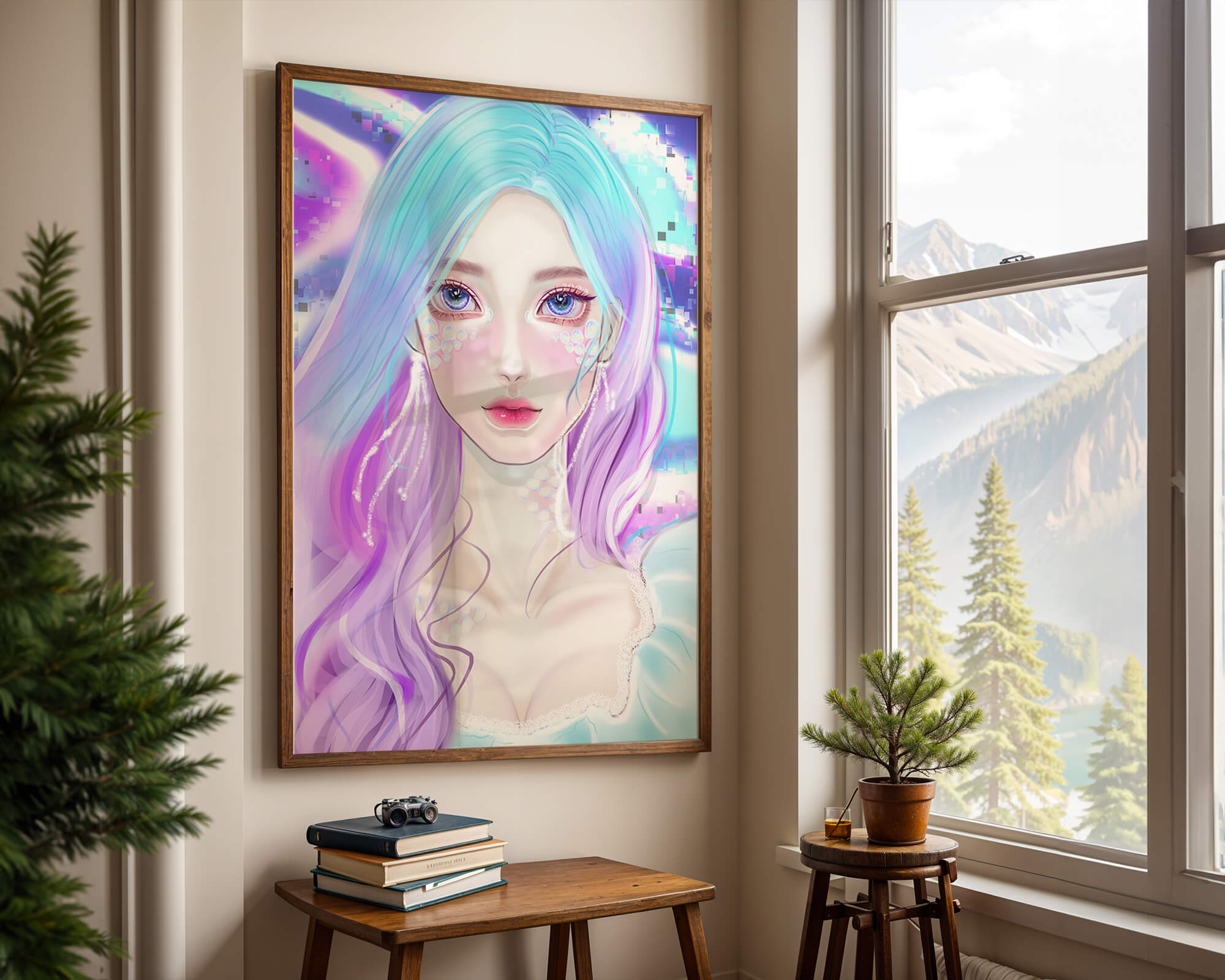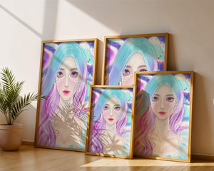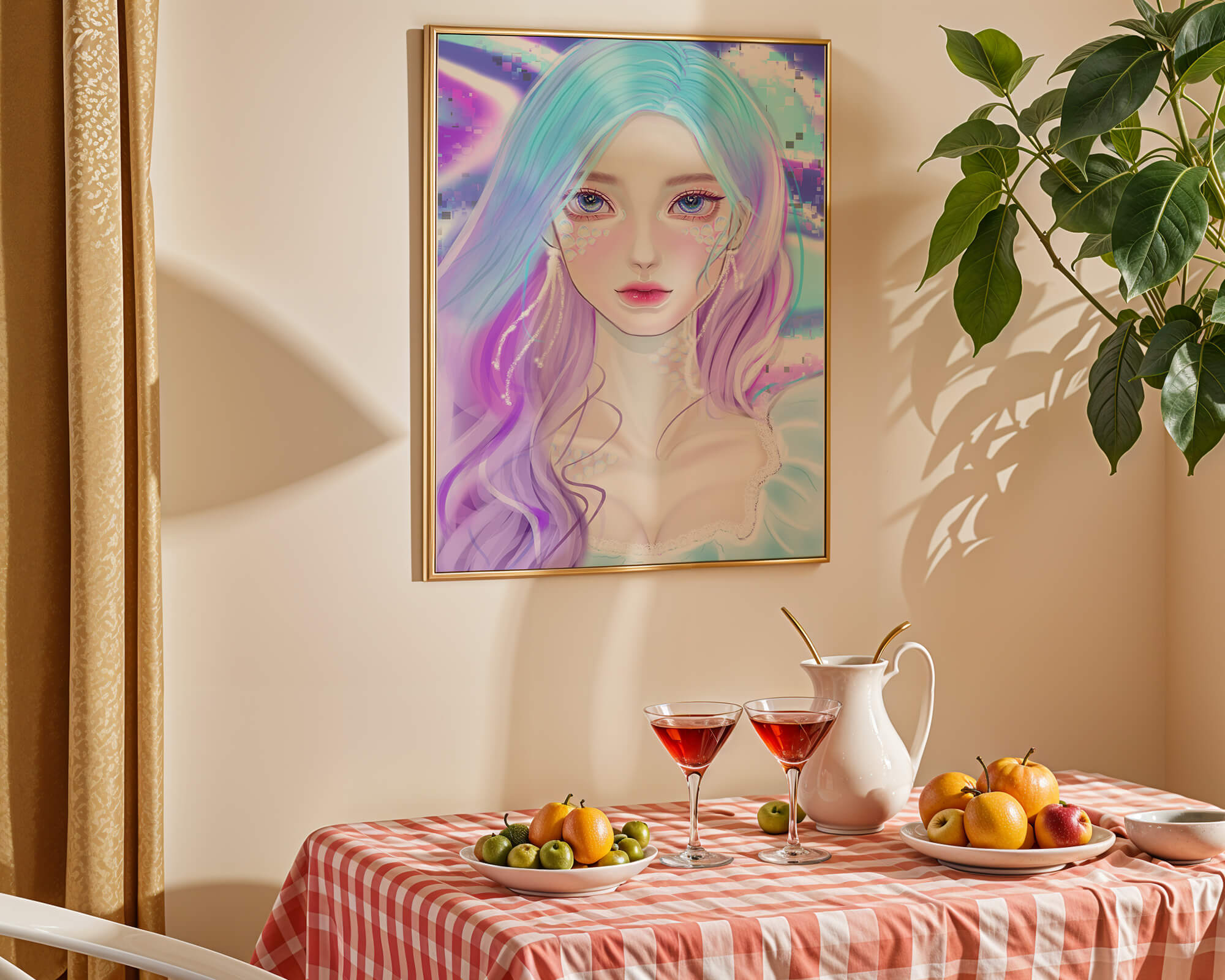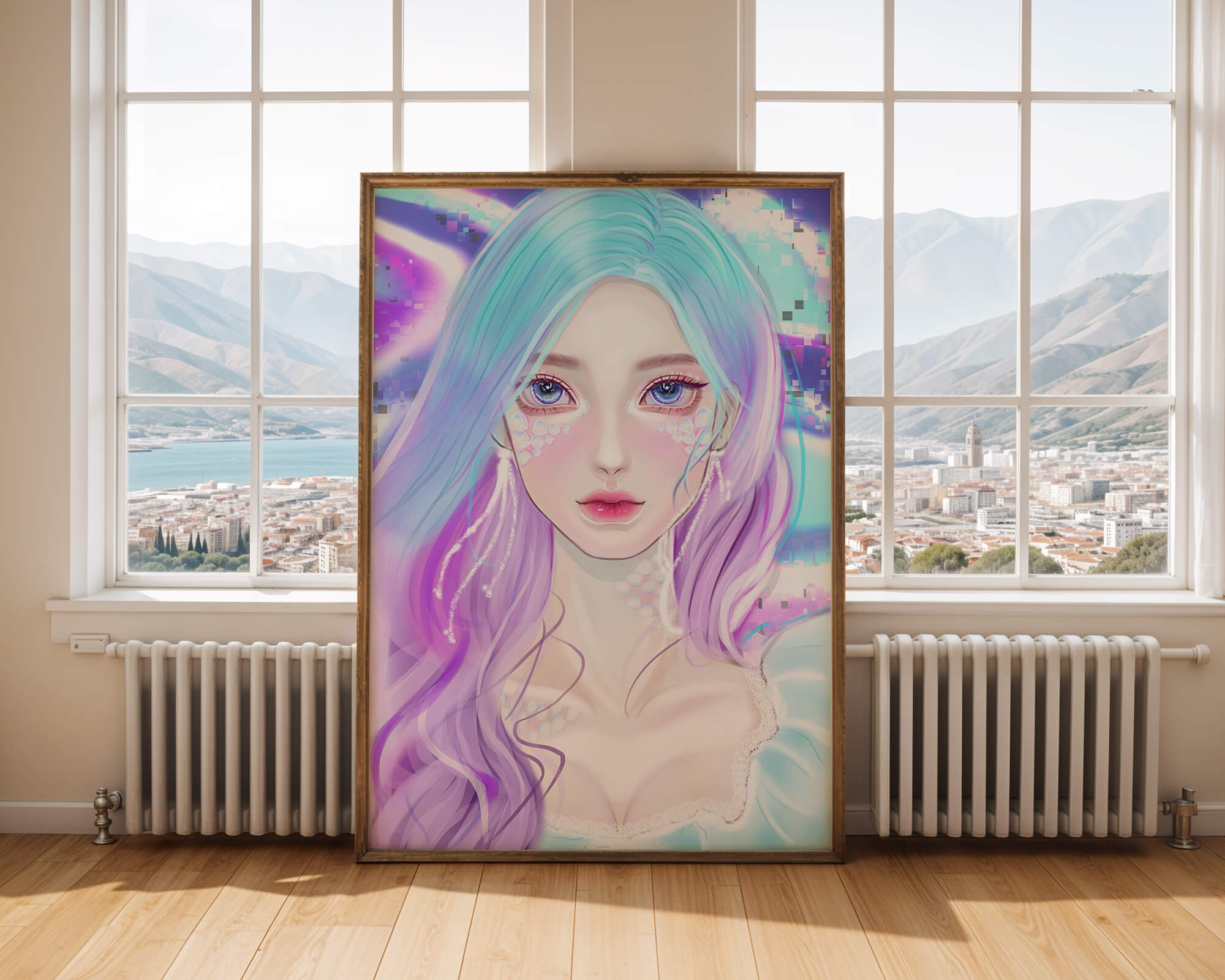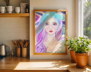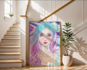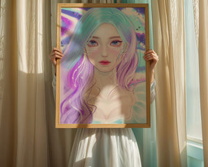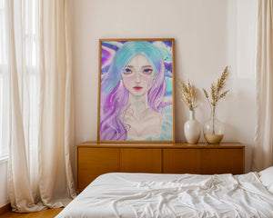 This digital artwork features a womans face with striking blue eyes and a serene expression. Her pastel-colored hair flows gracefully, enhancing the vibrant yet calming color palette that defines the overall mood. The dreamy background includes an abstract mix of colors, creating a mesmerizing effect that invites viewers into a world of imagination.The intricate details, from the delicate lace neckline to the sparkling accents around her eyes, showcase the artists skill in blending realism with fantasy elements. This piece is perfect for adding a touch of enchantment to any space, whether it be a living room, bedroom, or artistic studio. Its mystical aura and elegant style make it a unique addition to any decor collection.| Type |