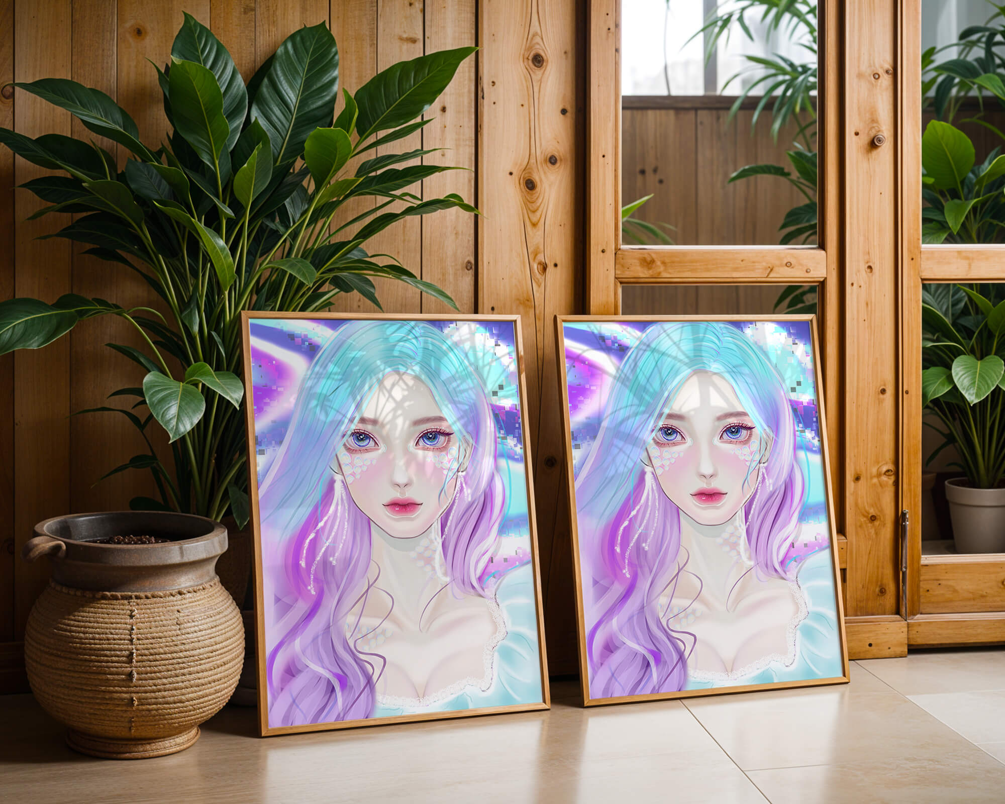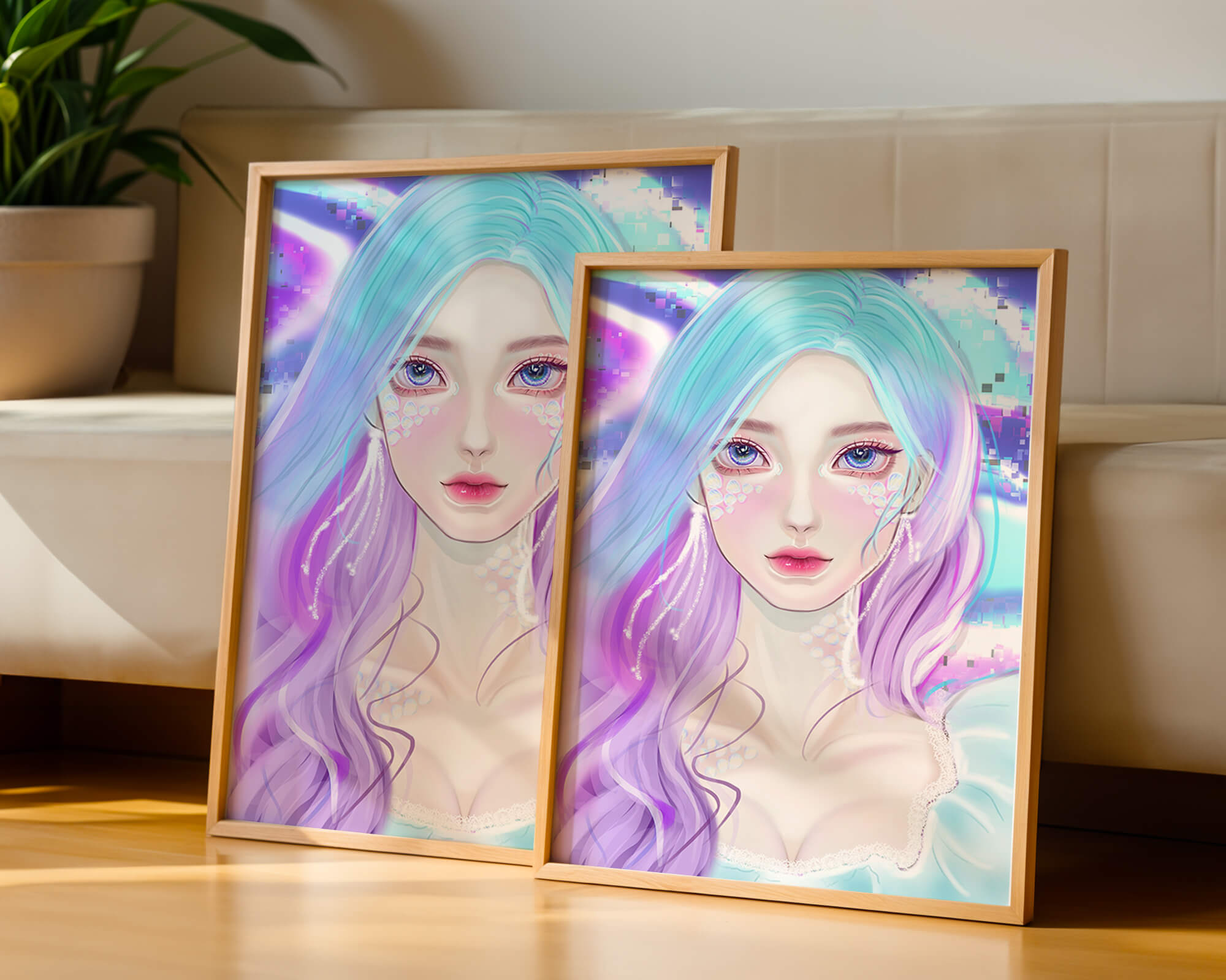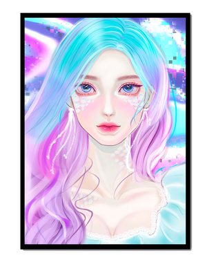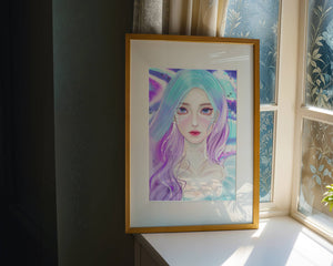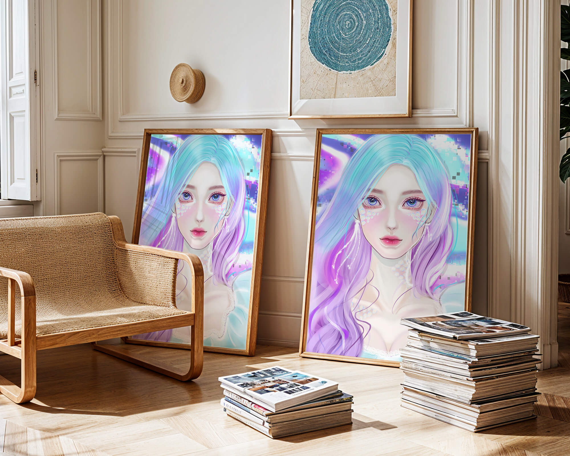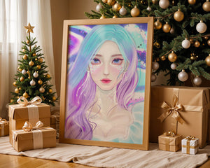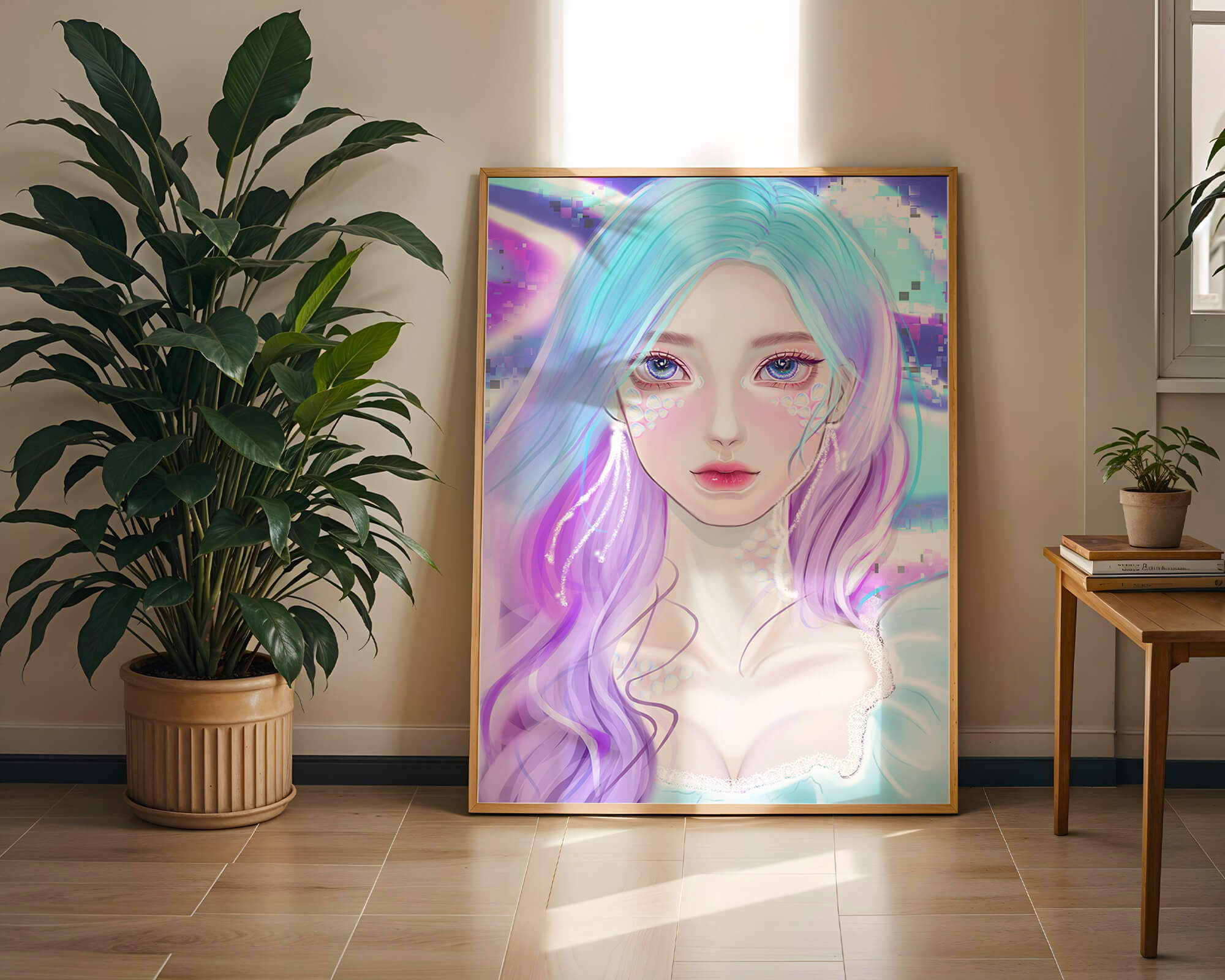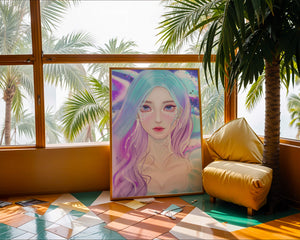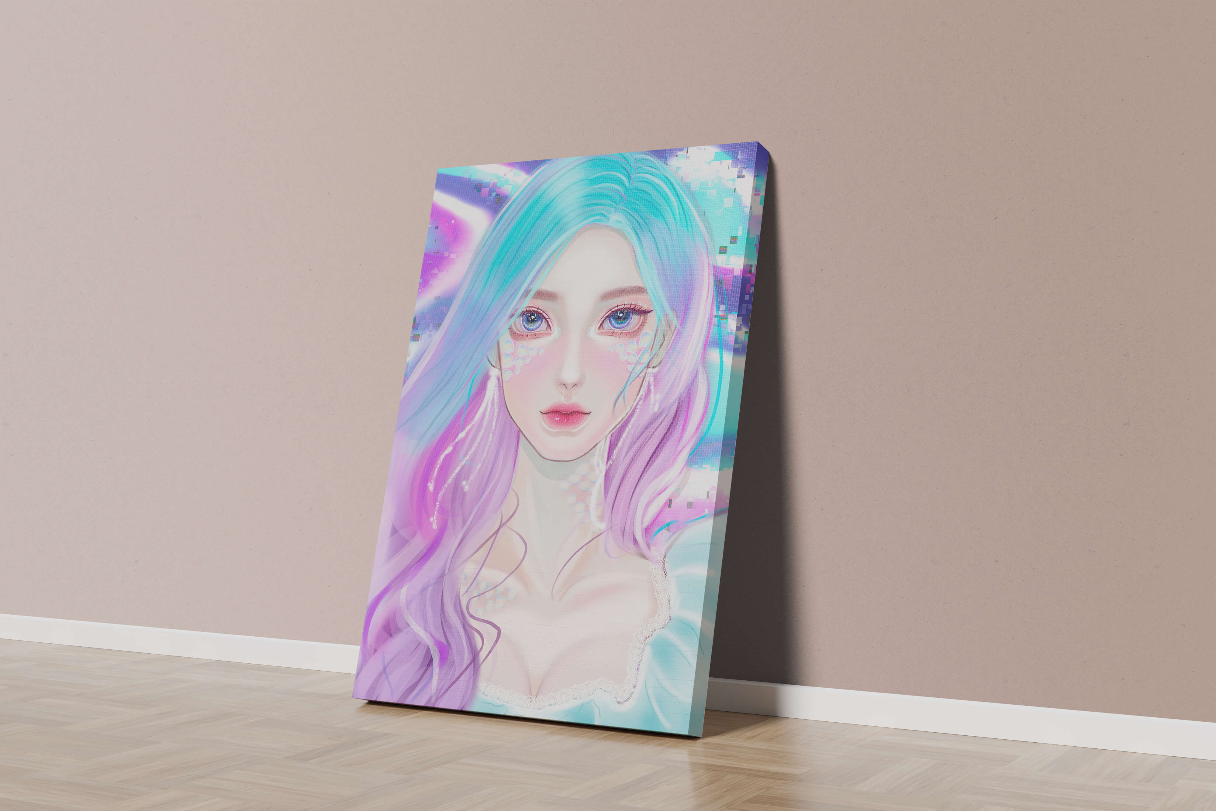 This digital artwork features a womans face with striking blue eyes and a serene expression. Her pastel-colored hair flows gracefully, enhancing the vibrant yet calming color palette that defines the overall mood. The dreamy background includes an abstract mix of colors, creating a mesmerizing effect that invites viewers into a world of imagination.The intricate details, from the delicate lace neckline to the sparkling accents around her eyes, showcase the artists skill in blending realism with fantasy elements. This piece is perfect for adding a touch of enchantment to any space, whether it be a living room, bedroom, or artistic studio. Its mystical aura and elegant style make it a unique addition to any decor collection.| Type |