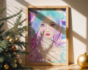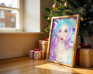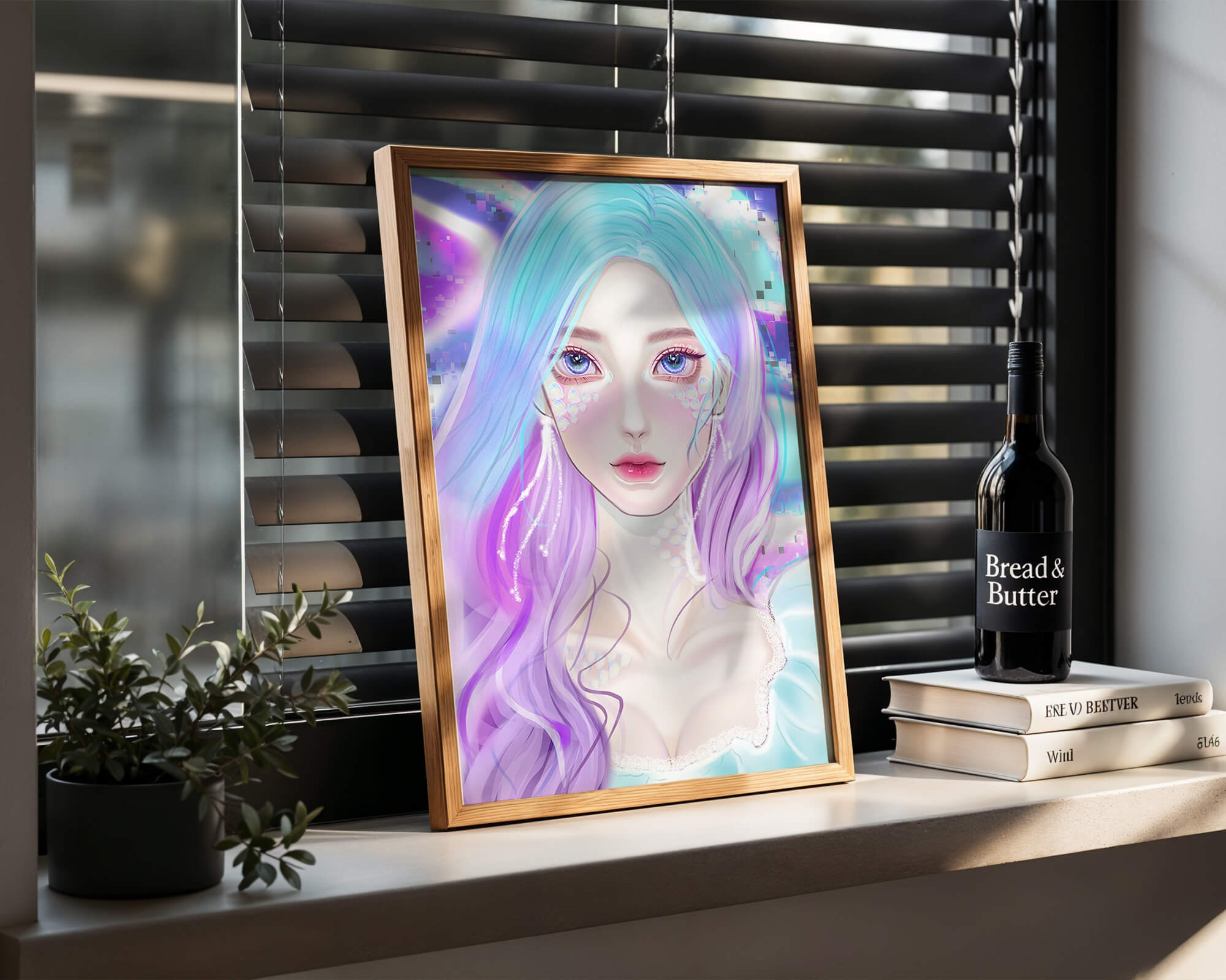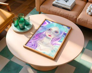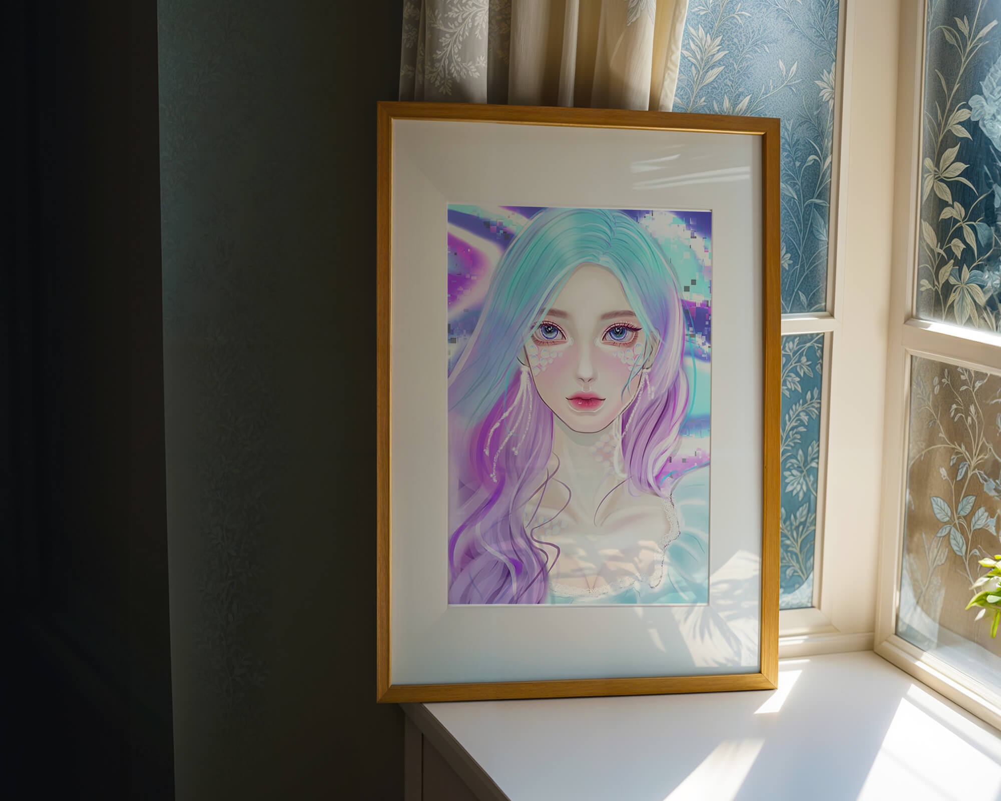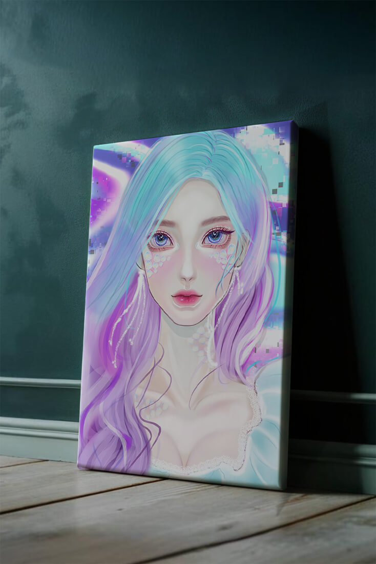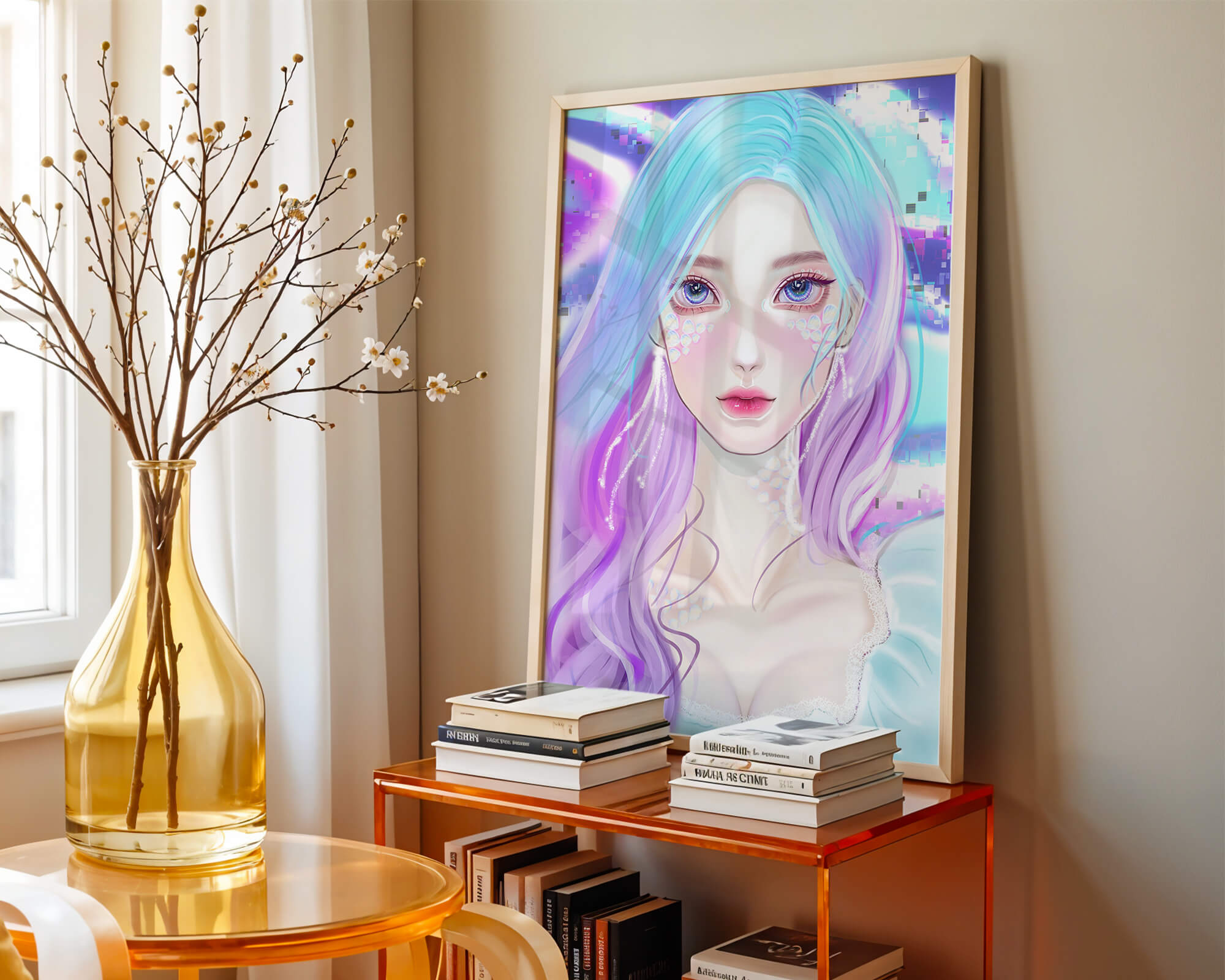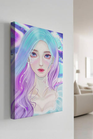 This digital artwork features a womans face with striking blue eyes and a serene expression. Her pastel-colored hair flows gracefully, enhancing the vibrant yet calming color palette that defines the overall mood. The dreamy background includes an abstract mix of colors, creating a mesmerizing effect that invites viewers into a world of imagination.The intricate details, from the delicate lace neckline to the sparkling accents around her eyes, showcase the artists skill in blending realism with fantasy elements. This piece is perfect for adding a touch of enchantment to any space, whether it be a living room, bedroom, or artistic studio. Its mystical aura and elegant style make it a unique addition to any decor collection.| Type |