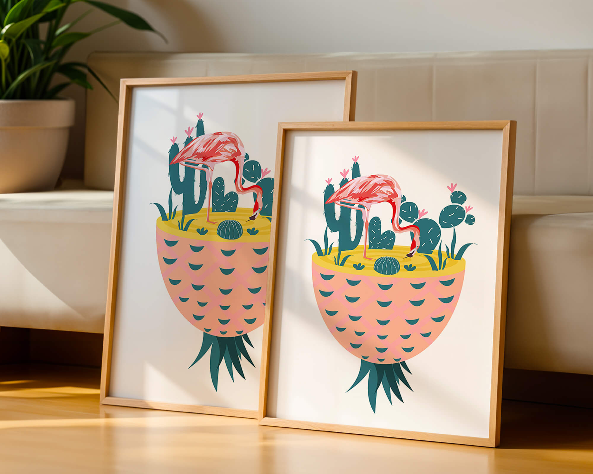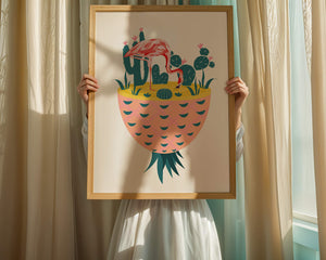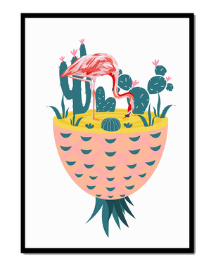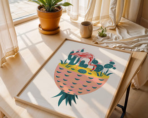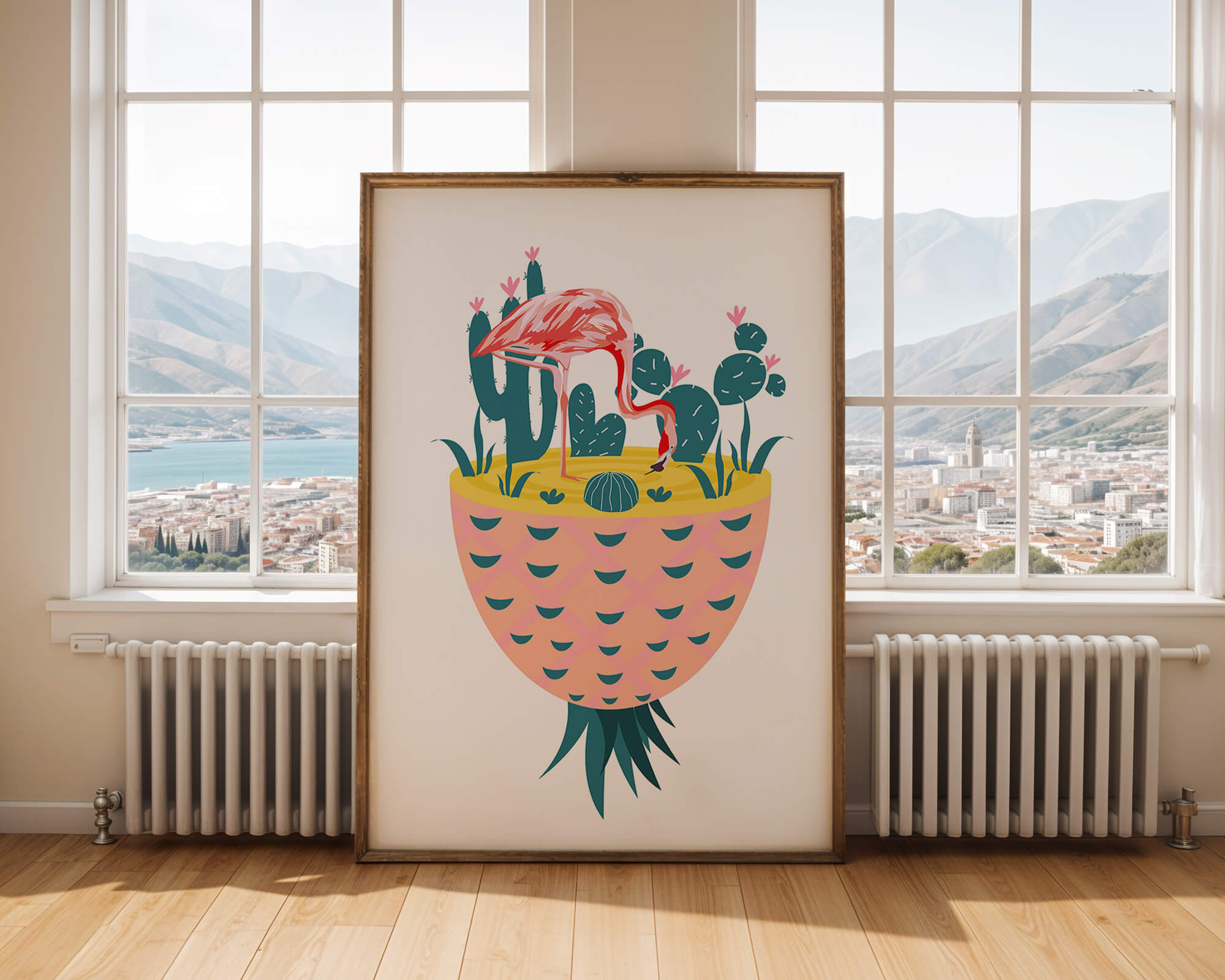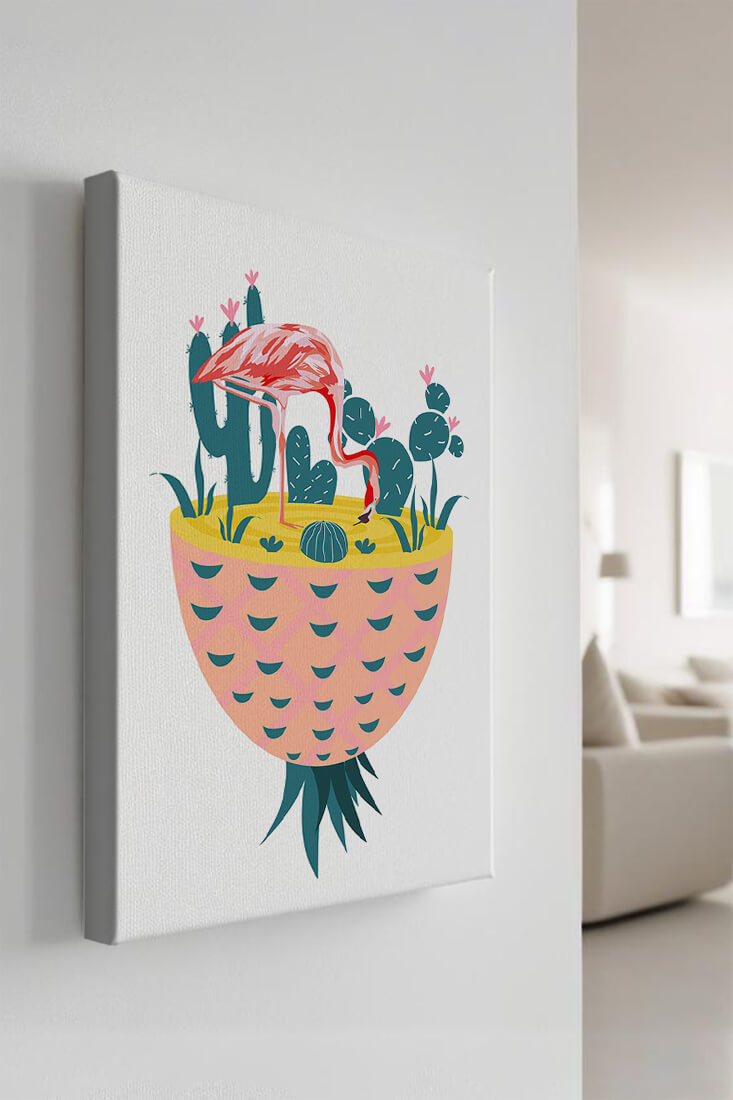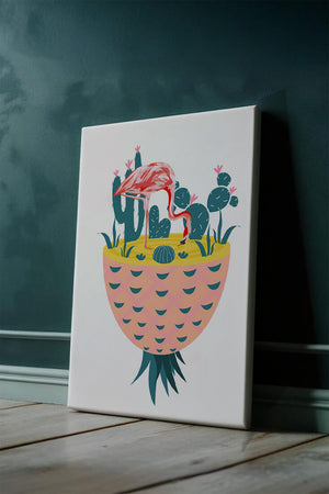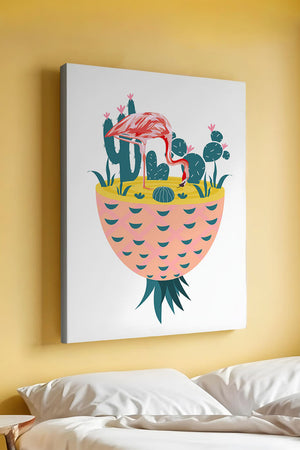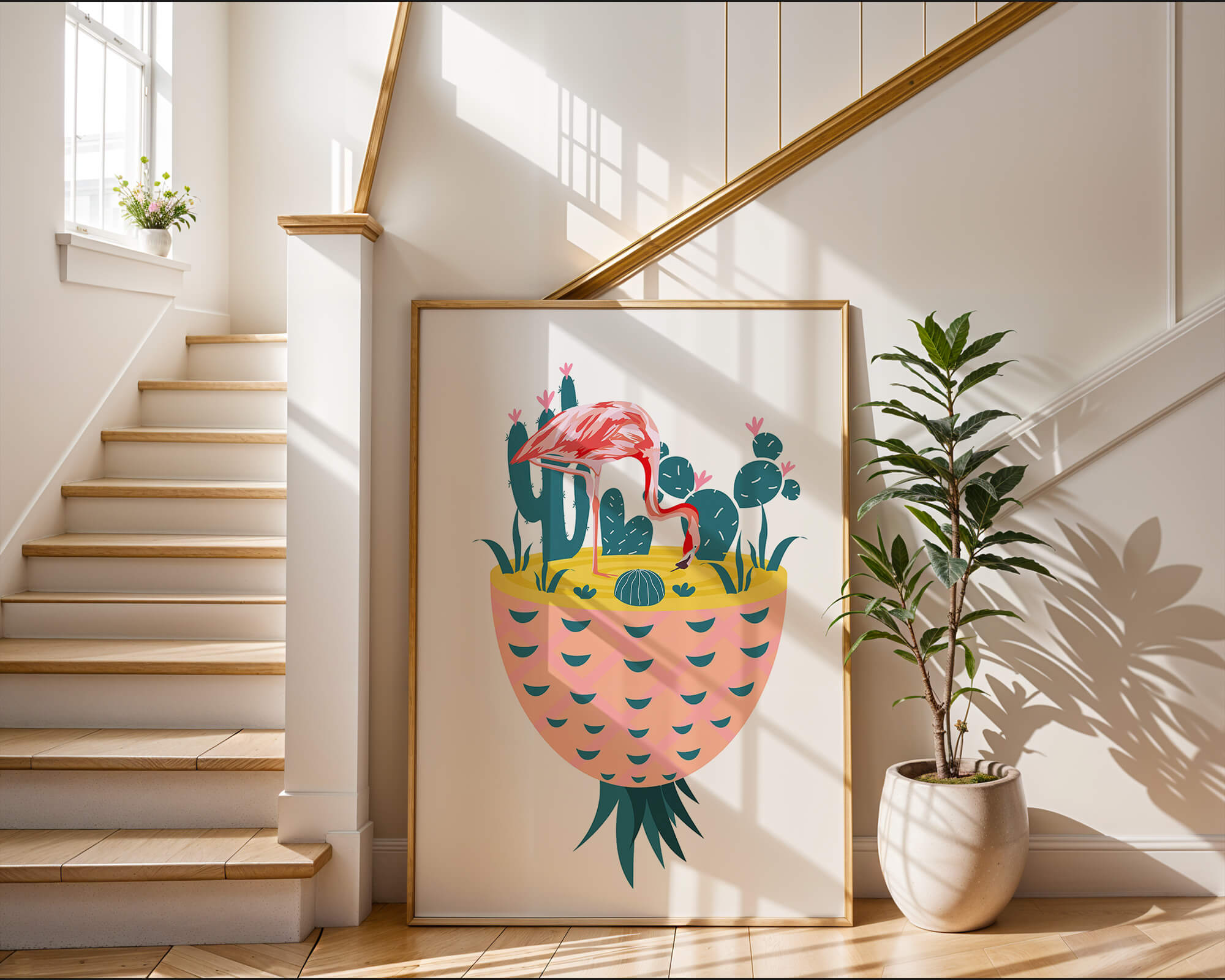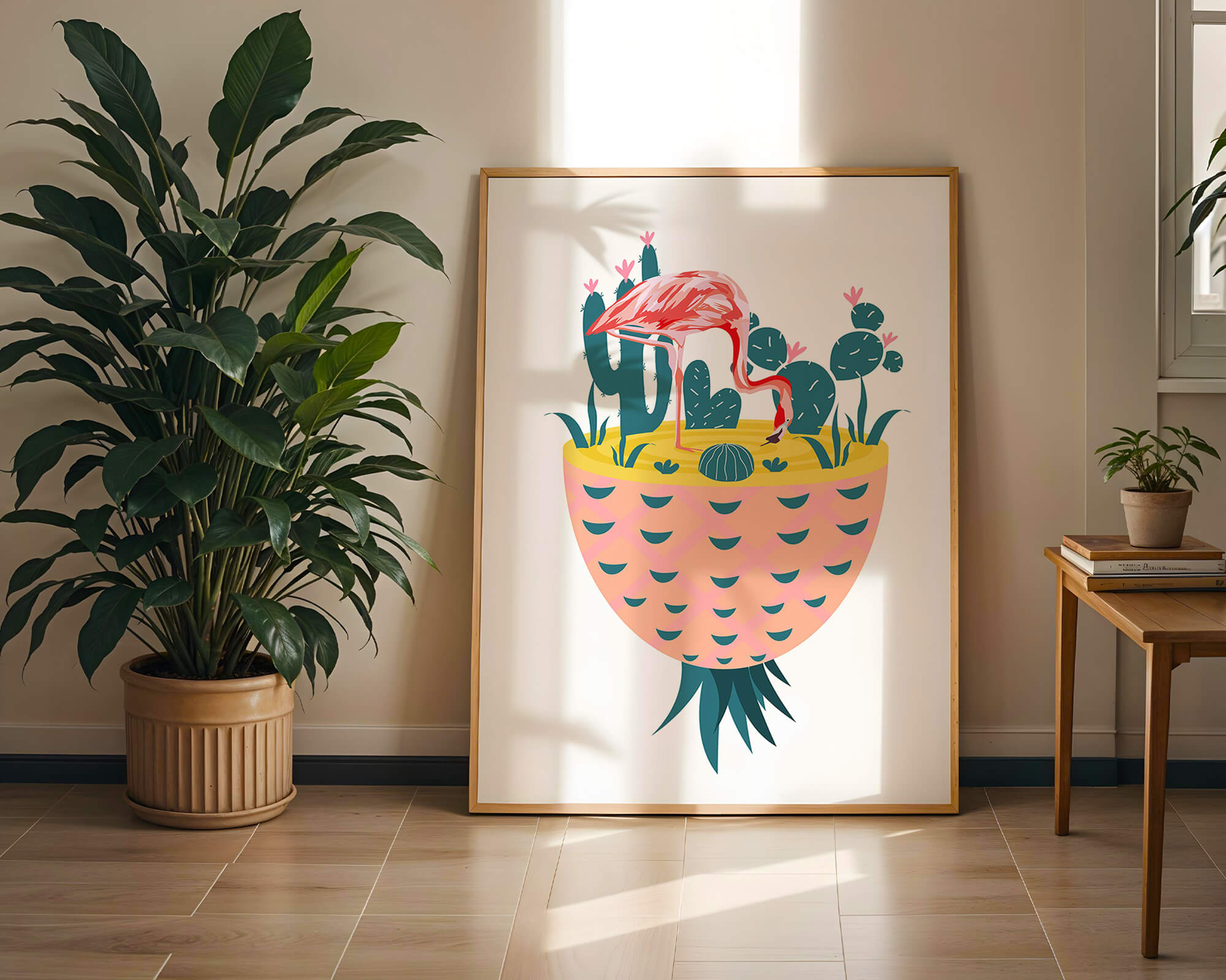 This vibrant artwork features an elegant flamingo gracefully standing amidst a cluster of cacti, set within a whimsically designed pineapple-shaped vase. The illustration is a fusion of tropical aesthetics and creative imagination, making it a captivating piece for any space.