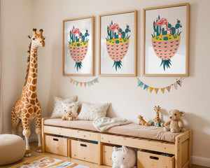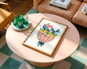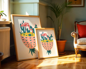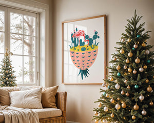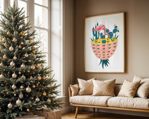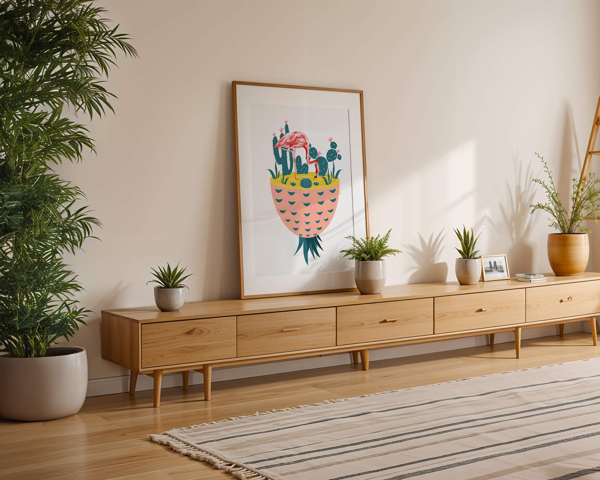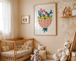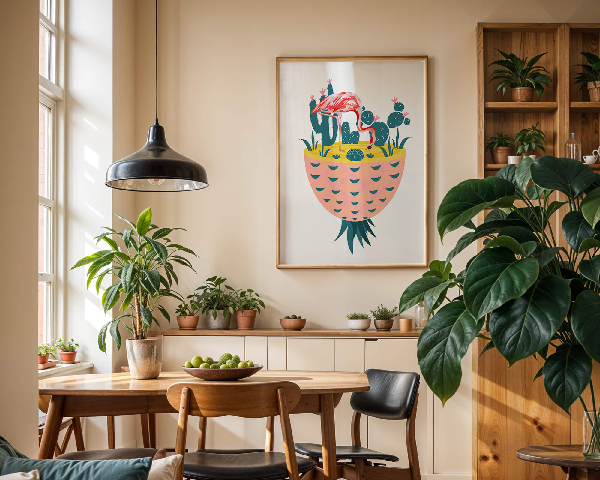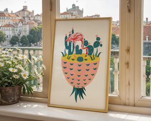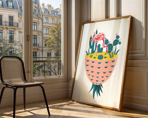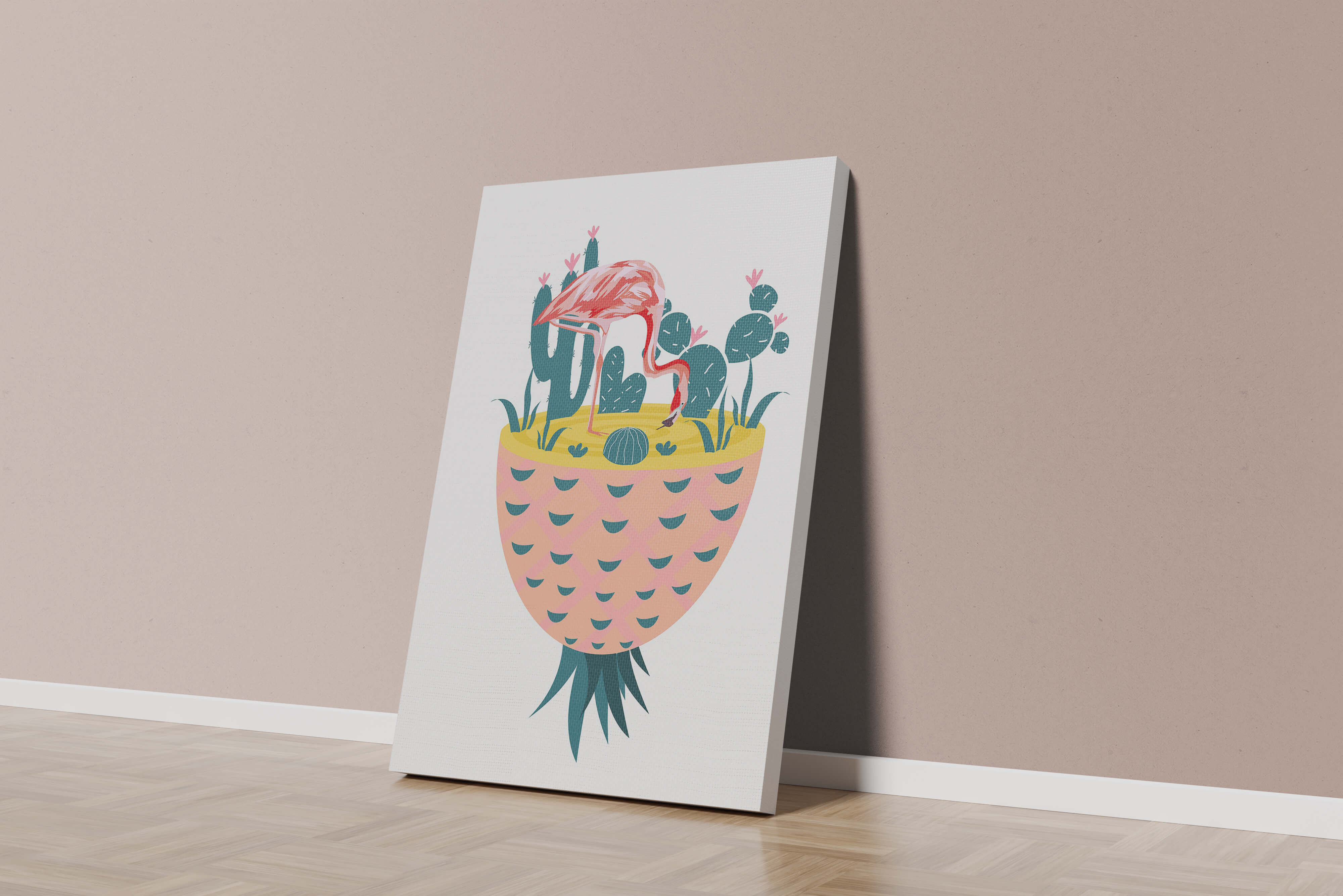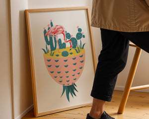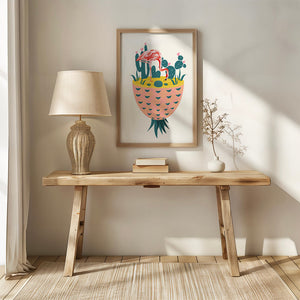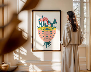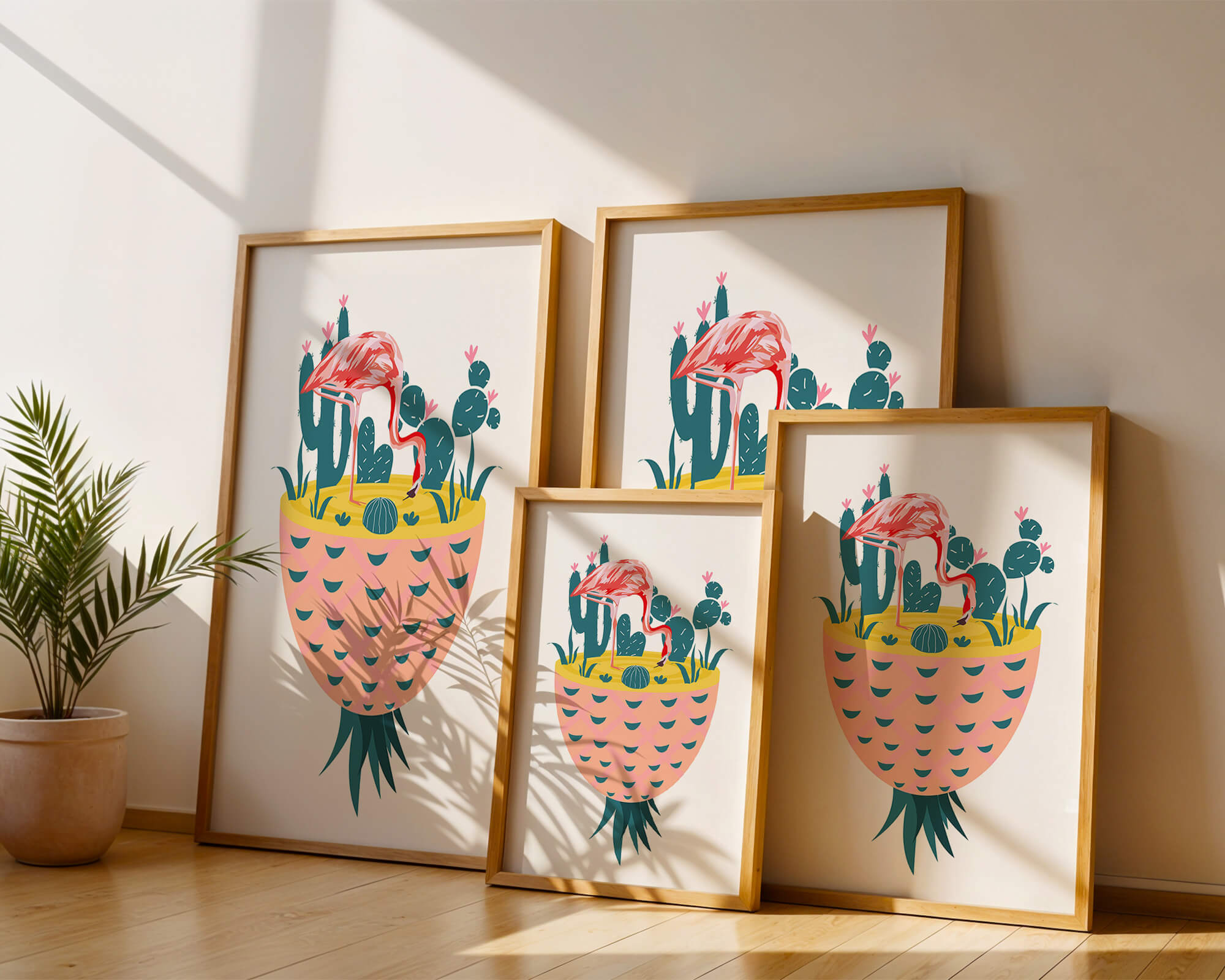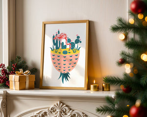 This vibrant artwork features an elegant flamingo gracefully standing amidst a cluster of cacti, set within a whimsically designed pineapple-shaped vase. The illustration is a fusion of tropical aesthetics and creative imagination, making it a captivating piece for any space.