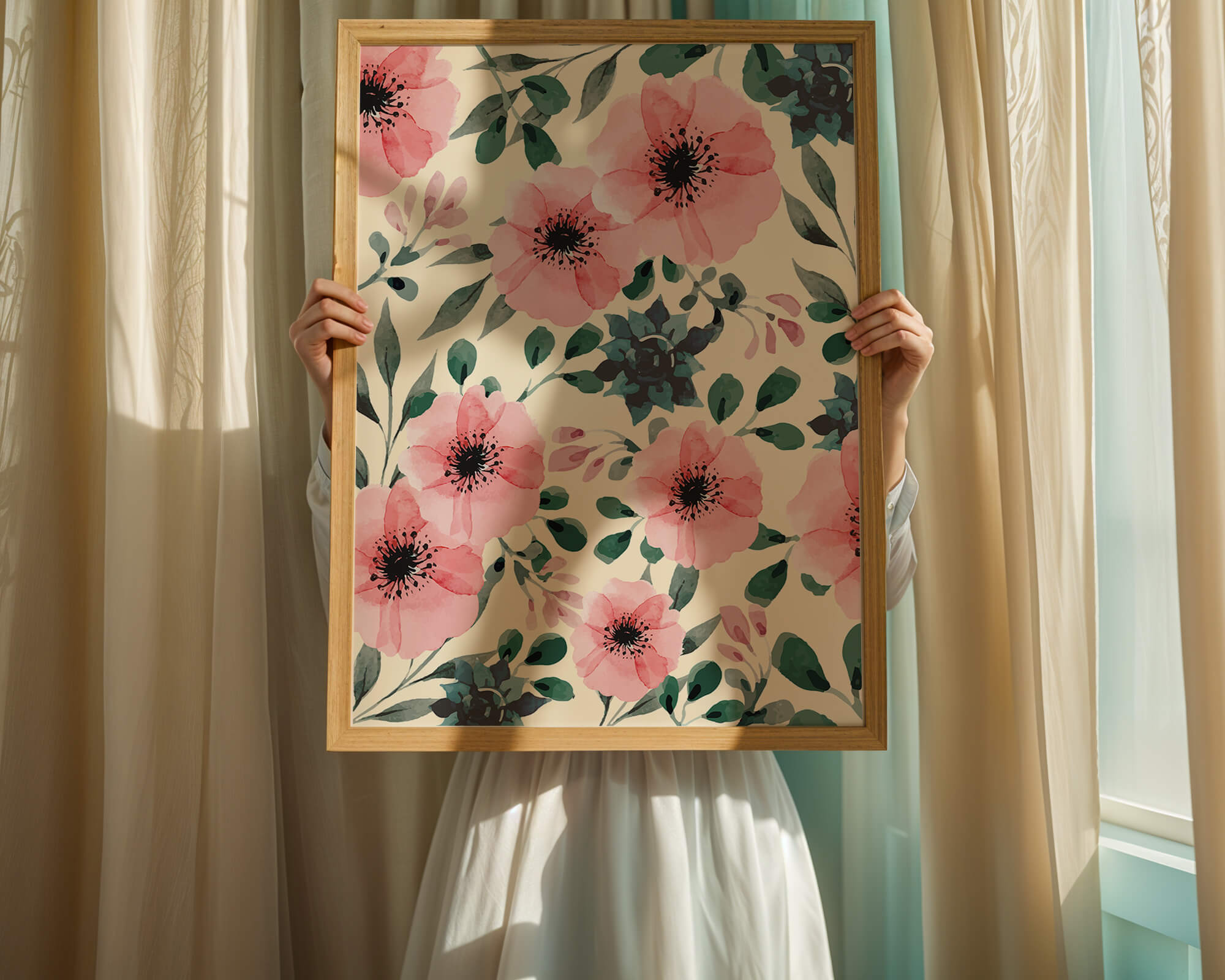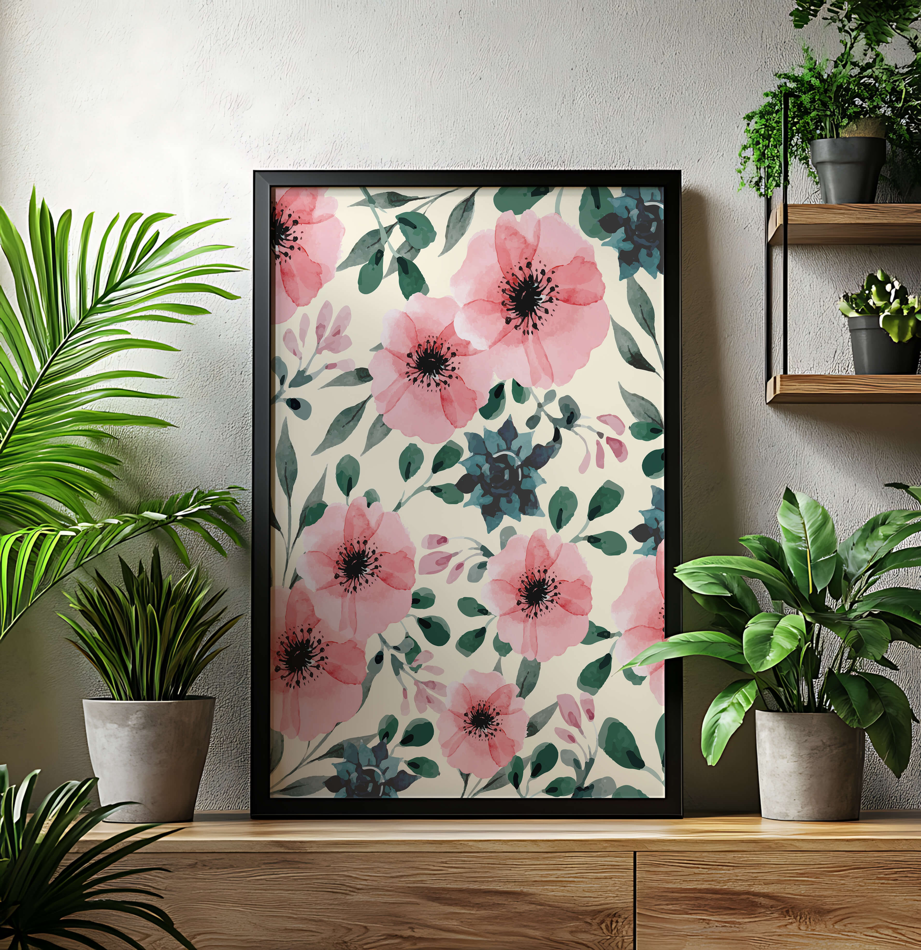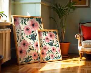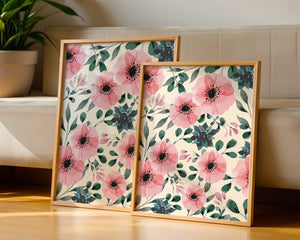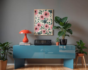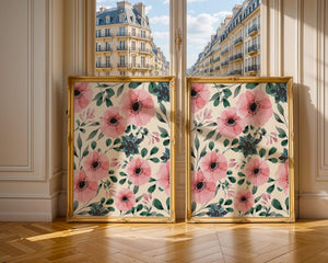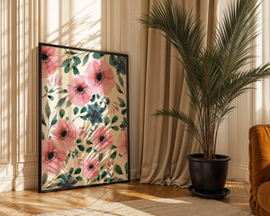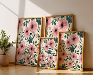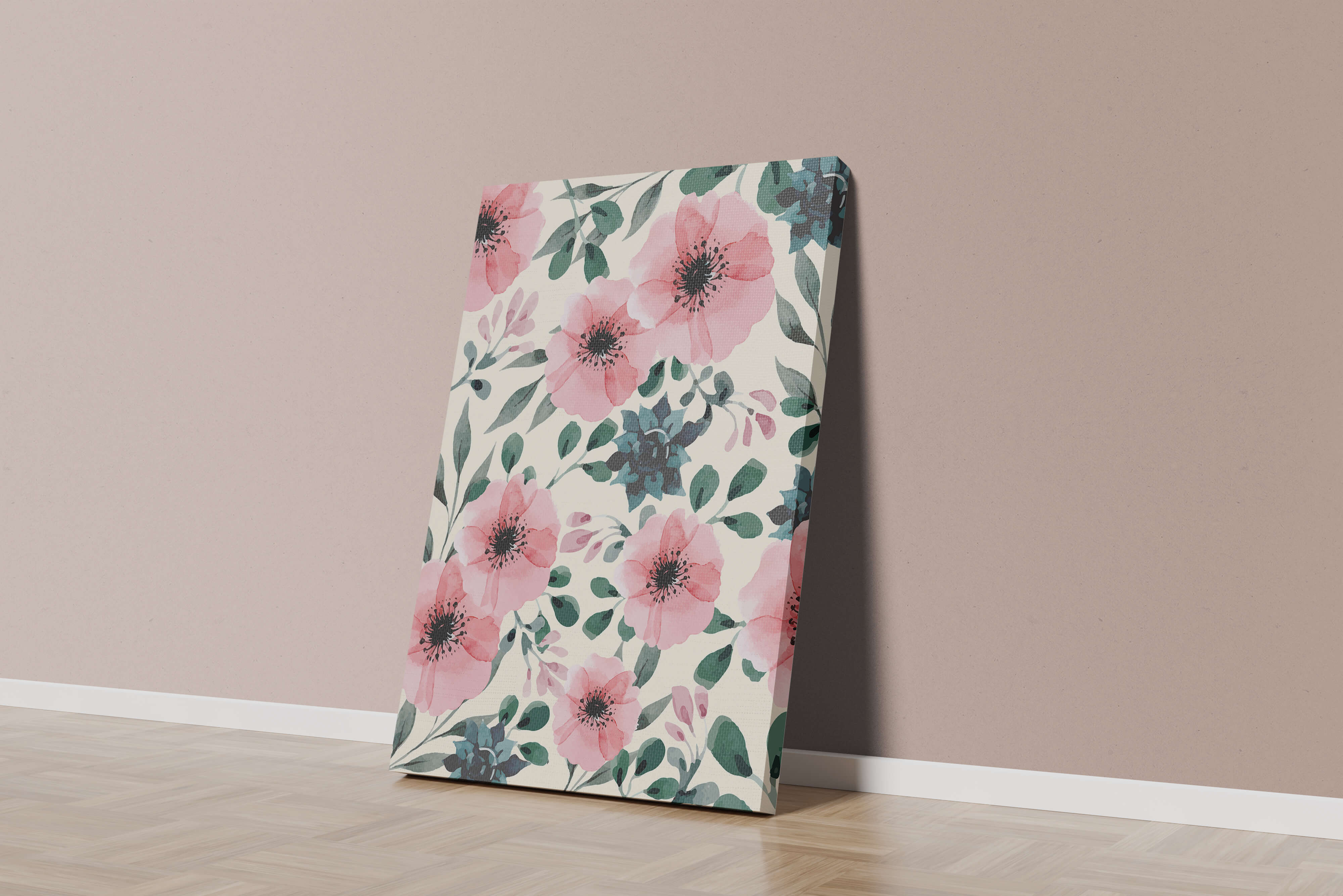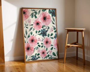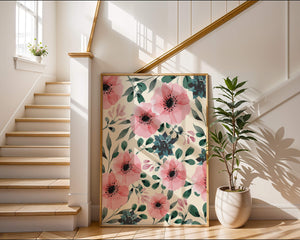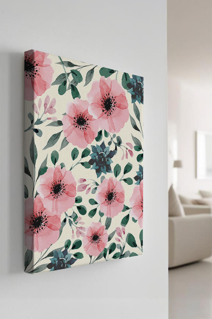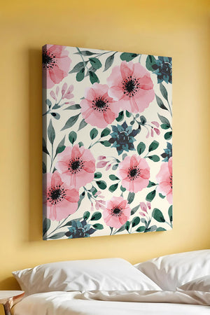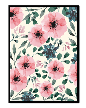 The floral design incorporates soft pink petals and rich green foliage, reflecting a harmonious blend of natural elements. This pattern captures the essence of natures beauty, making it a perfect choice for home decor, textiles, or any creative project seeking a touch of elegance and charm.Whether youre looking to refresh your interior space or add a gentle accent to your creative work, this floral watercolor pattern provides a timeless aesthetic. Its artful combination of colors and shapes offers versatility and sophistication, catering to a range of styles and preferences.