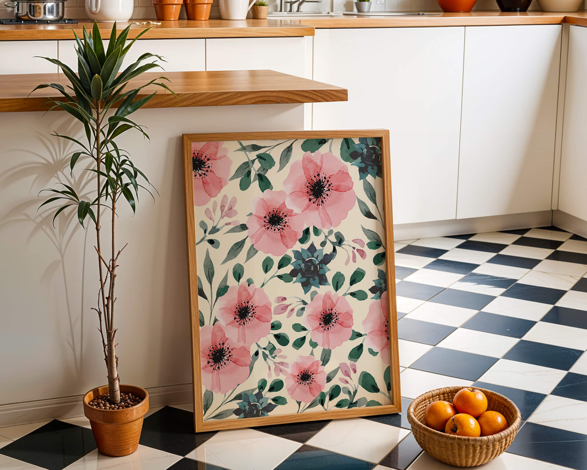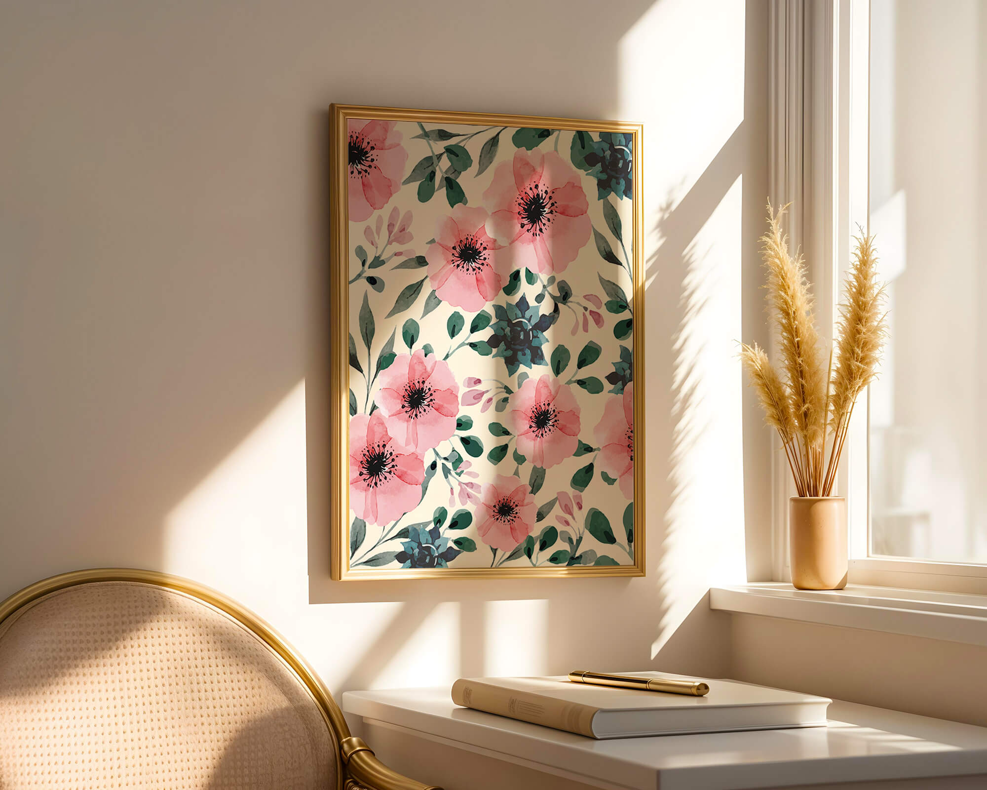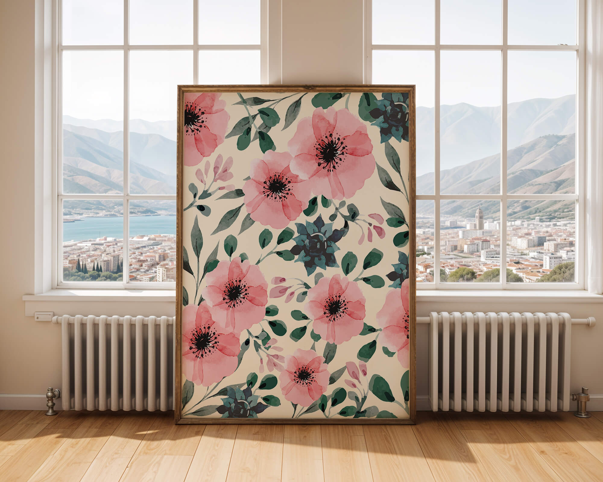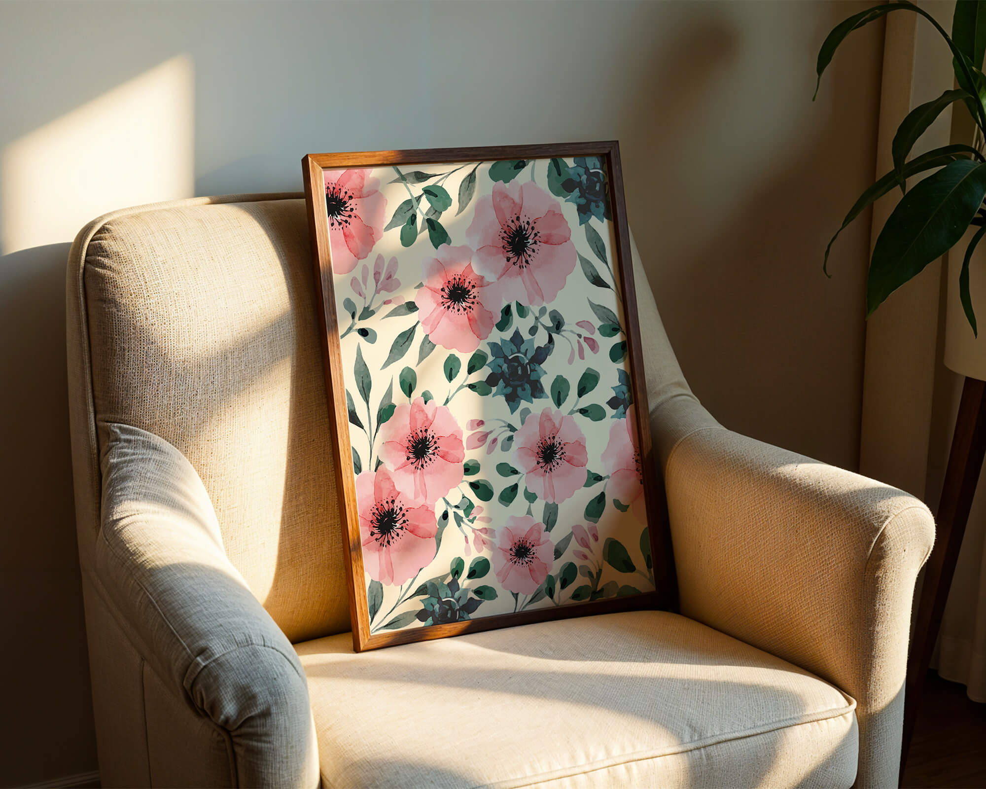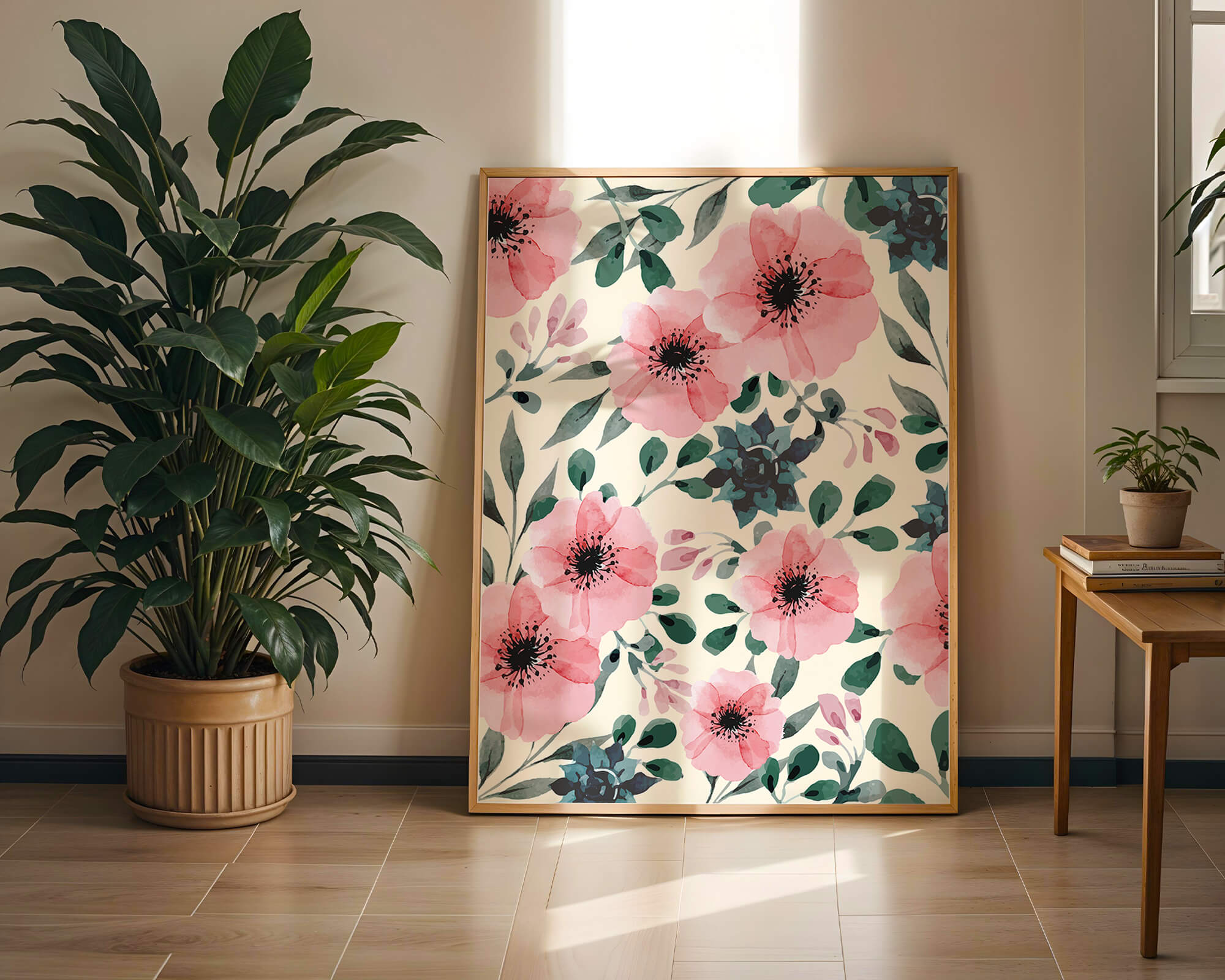 The floral design incorporates soft pink petals and rich green foliage, reflecting a harmonious blend of natural elements. This pattern captures the essence of natures beauty, making it a perfect choice for home decor, textiles, or any creative project seeking a touch of elegance and charm.Whether youre looking to refresh your interior space or add a gentle accent to your creative work, this floral watercolor pattern provides a timeless aesthetic. Its artful combination of colors and shapes offers versatility and sophistication, catering to a range of styles and preferences.