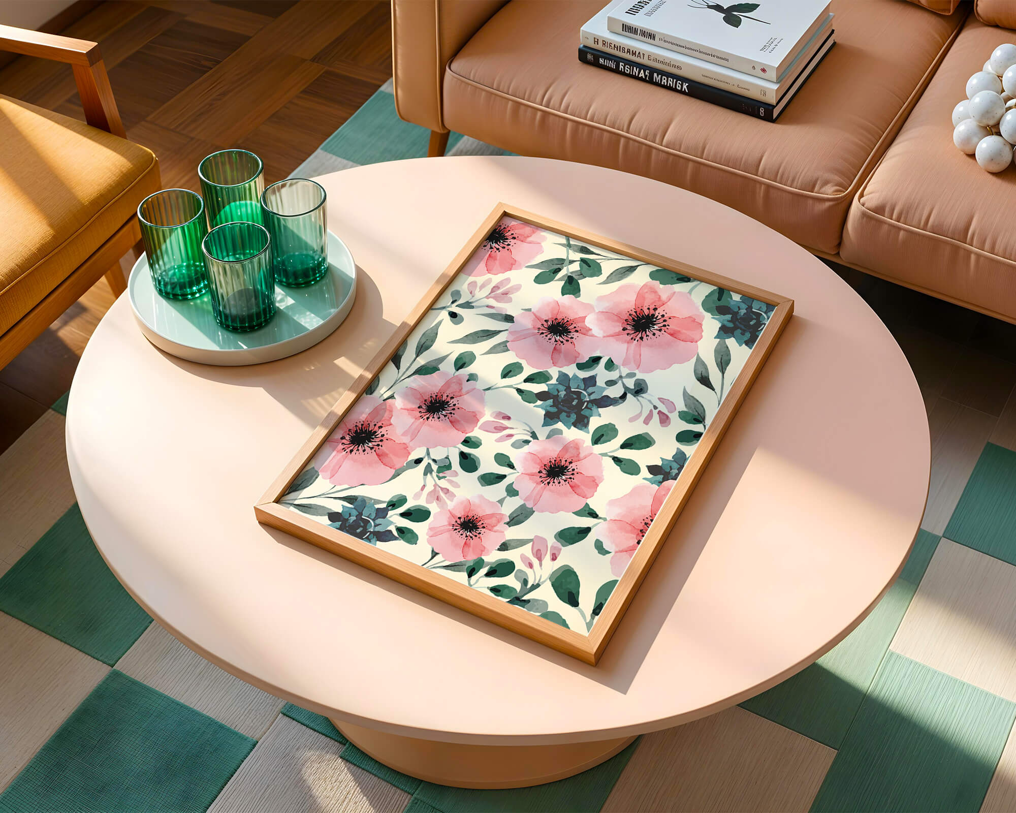 Home Floral Watercolor Pattern with Pink Flowers and Green Leaves