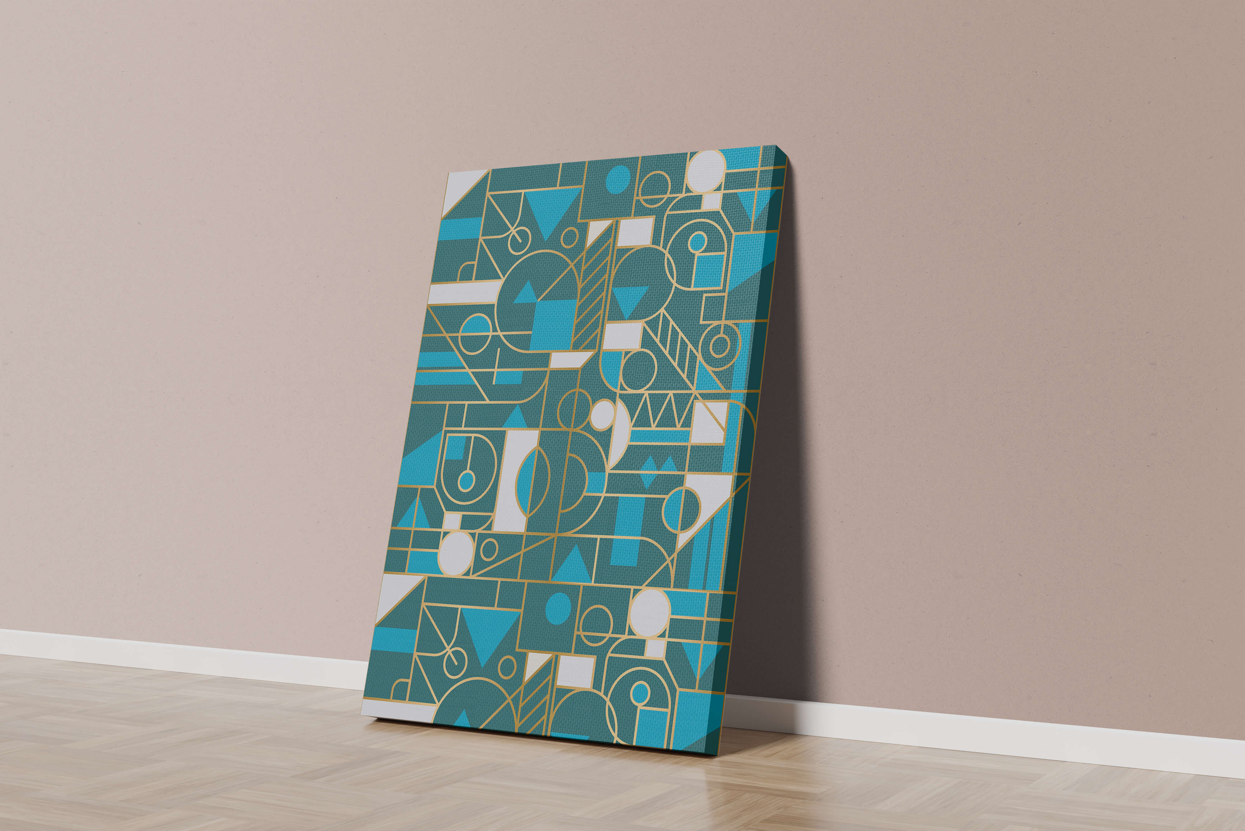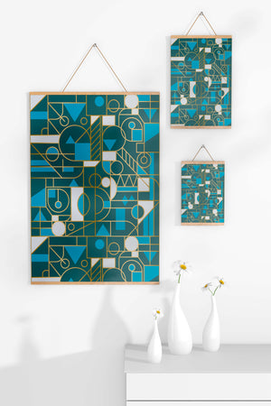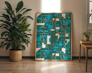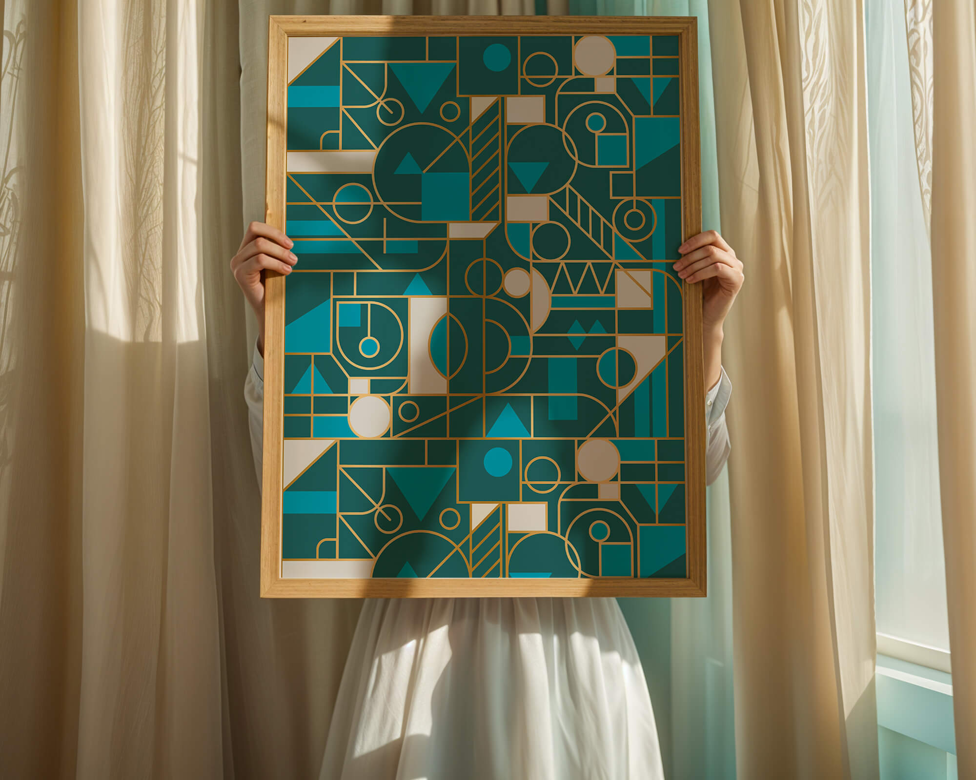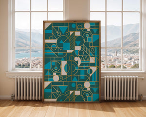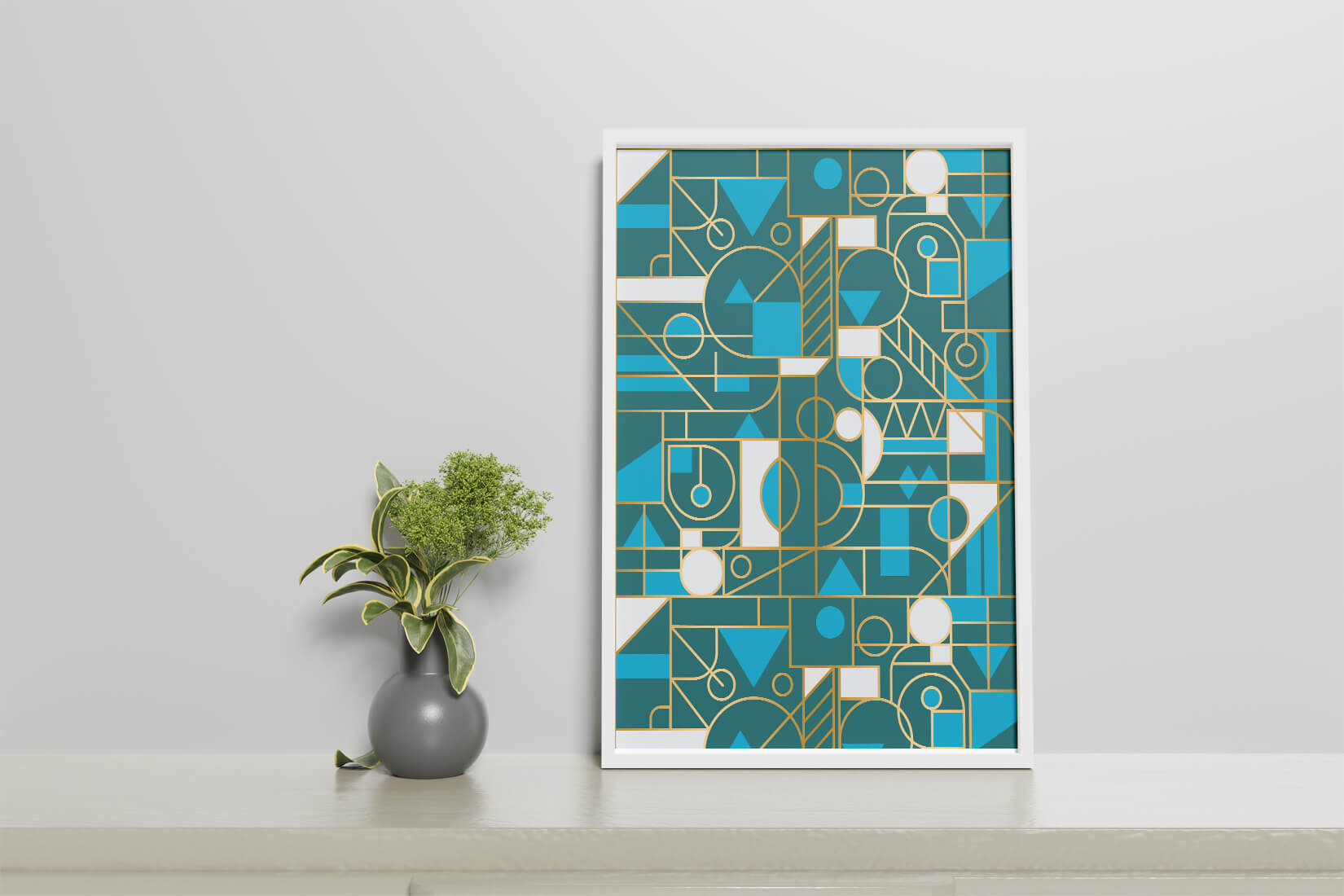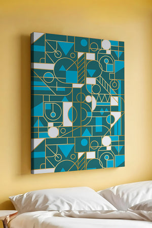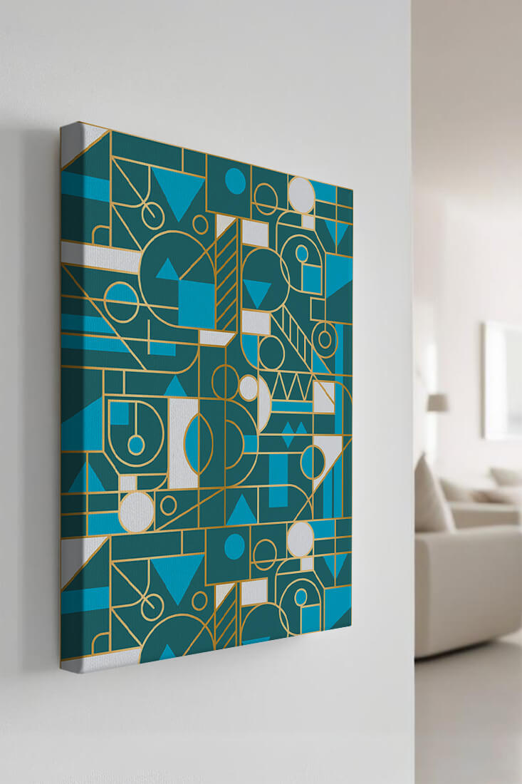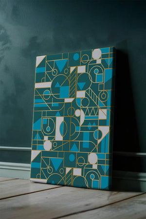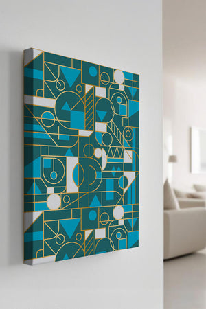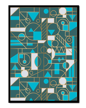This piece captures the eye with its complex interplay of shapes and colors. The use of circles, triangles, and squares creates a dynamic balance within the artwork. Each geometric form is outlined with gold, adding a touch of sophistication and elegance to the overall composition.The color palette is rich, featuring shades of green and blue that harmonize beautifully. This design would be a perfect fit for contemporary spaces, offering a striking visual element that adds character and depth. Its modern aesthetic and intricate pattern make it a versatile addition to any decor.| Type |