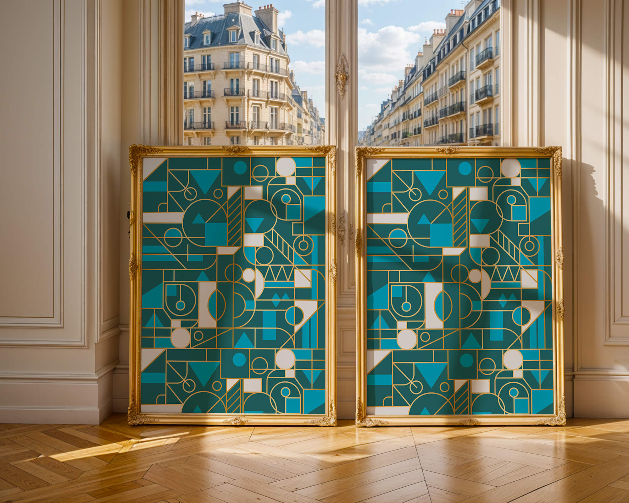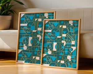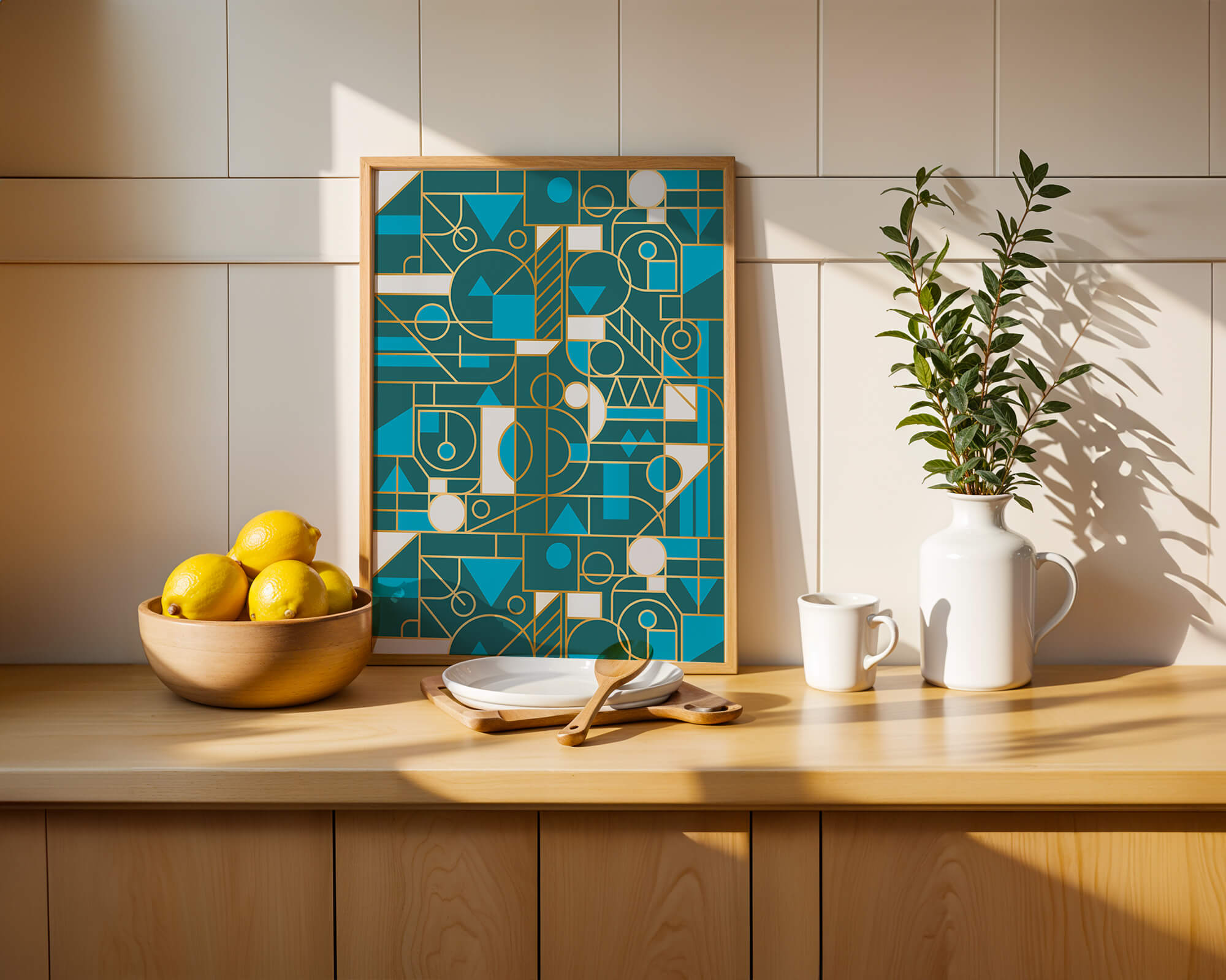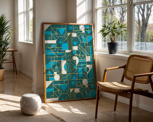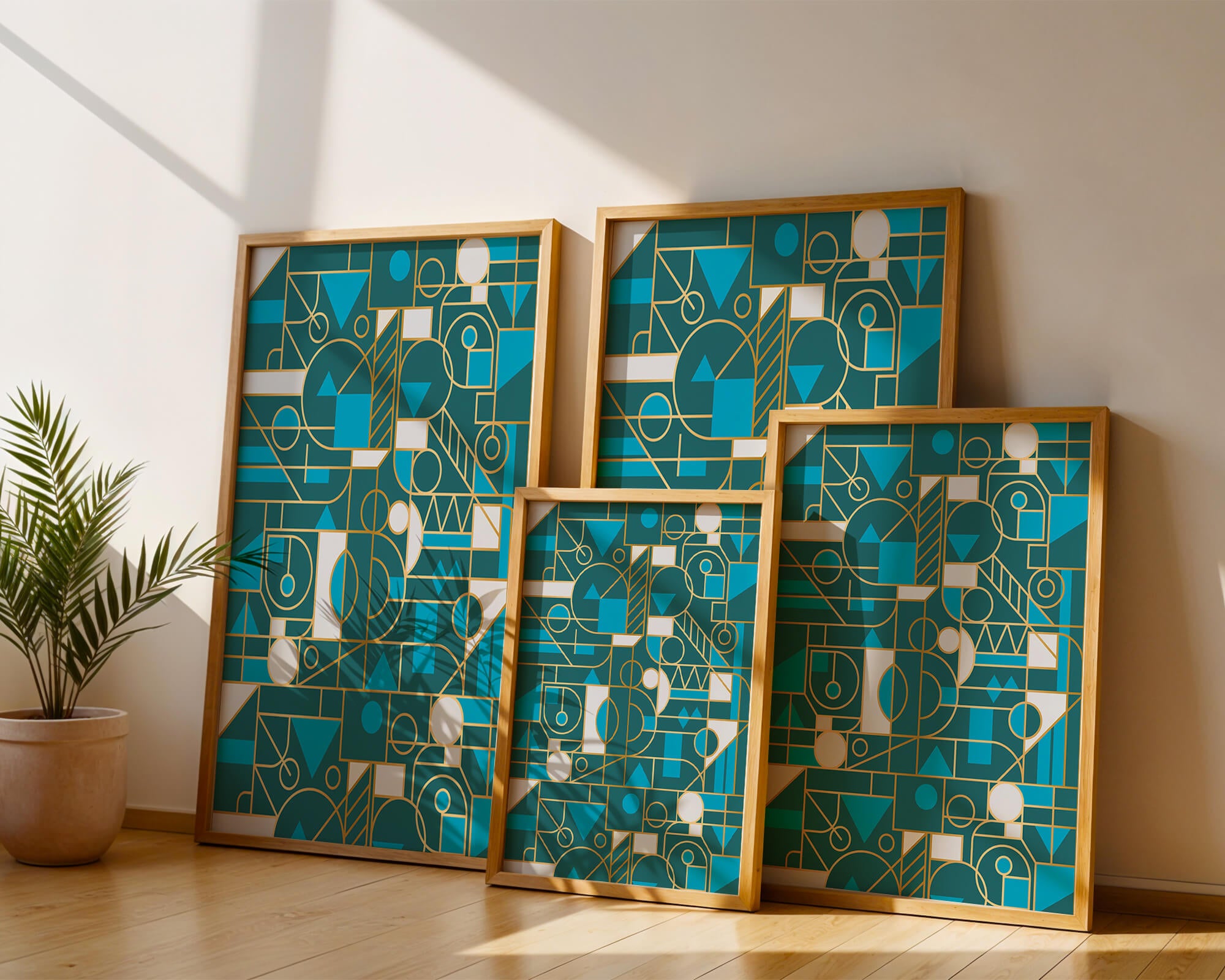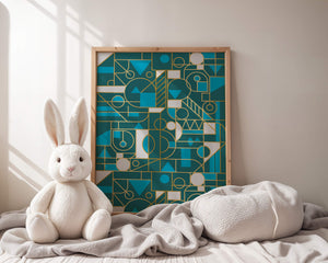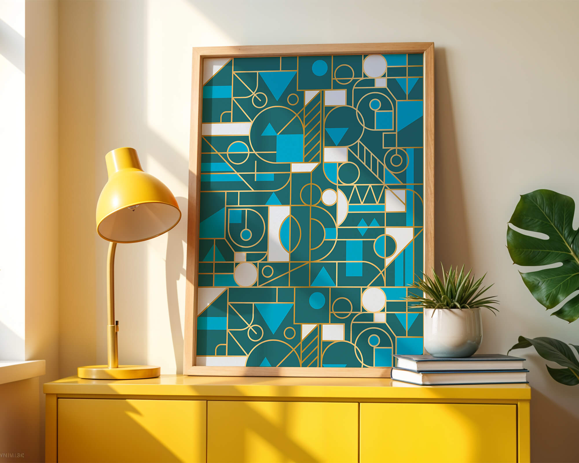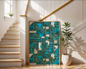 This piece captures the eye with its complex interplay of shapes and colors. The use of circles, triangles, and squares creates a dynamic balance within the artwork. Each geometric form is outlined with gold, adding a touch of sophistication and elegance to the overall composition.The color palette is rich, featuring shades of green and blue that harmonize beautifully. This design would be a perfect fit for contemporary spaces, offering a striking visual element that adds character and depth. Its modern aesthetic and intricate pattern make it a versatile addition to any decor.| Type |
