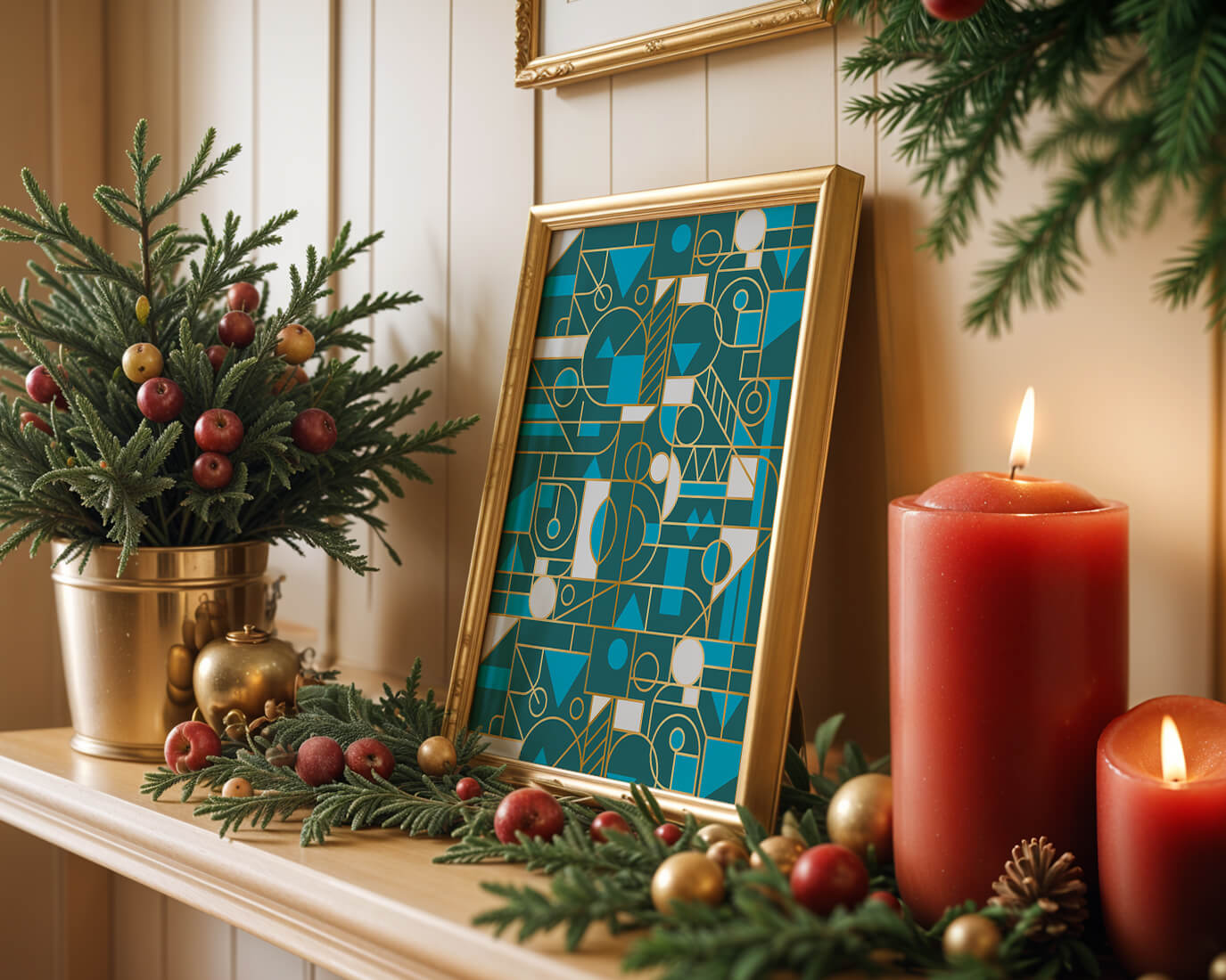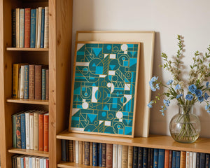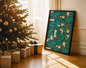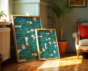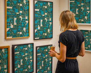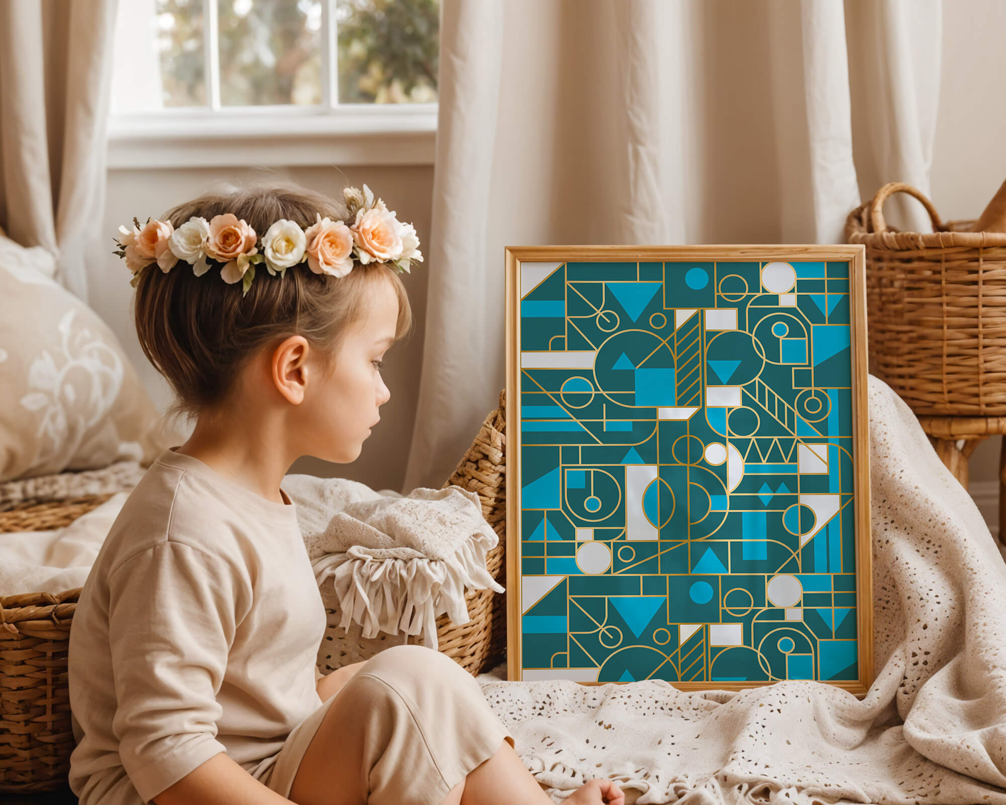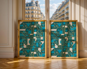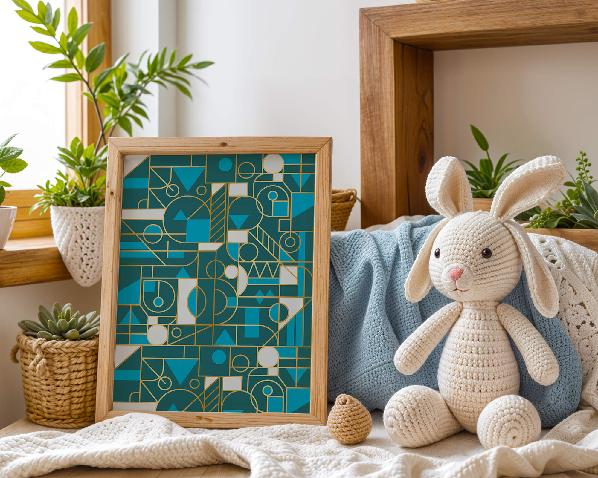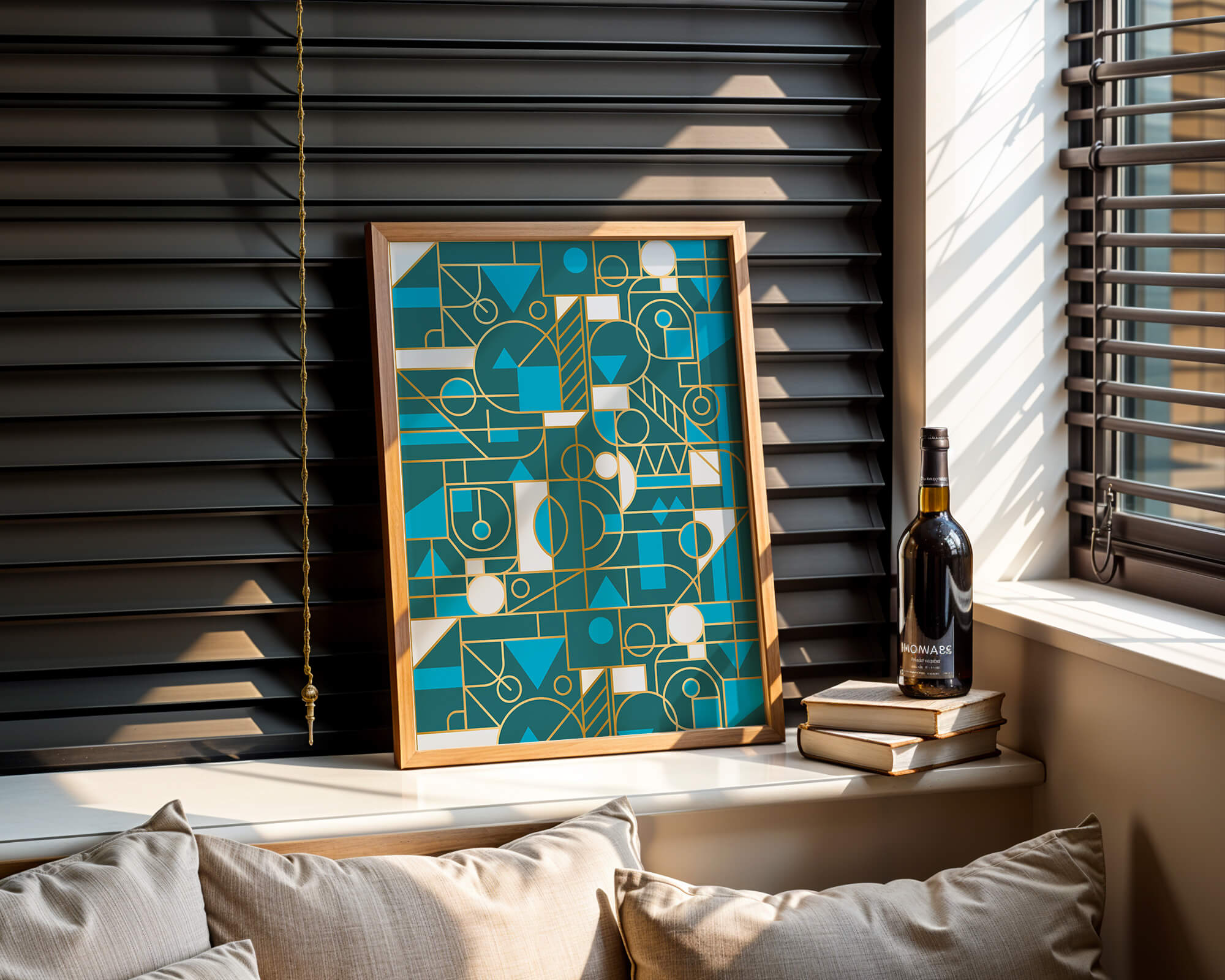 This piece captures the eye with its complex interplay of shapes and colors. The use of circles, triangles, and squares creates a dynamic balance within the artwork. Each geometric form is outlined with gold, adding a touch of sophistication and elegance to the overall composition.The color palette is rich, featuring shades of green and blue that harmonize beautifully. This design would be a perfect fit for contemporary spaces, offering a striking visual element that adds character and depth. Its modern aesthetic and intricate pattern make it a versatile addition to any decor.| Type |