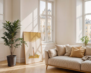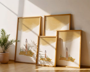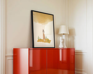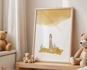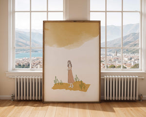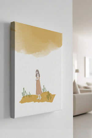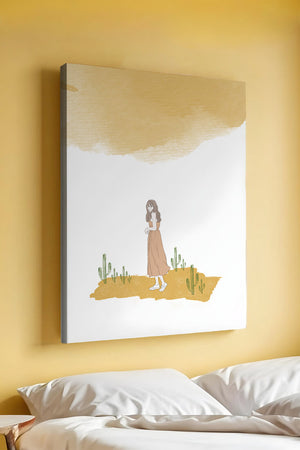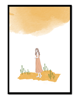 The image presents an artistic vision combining the serenity of nature with a fashion-forward element. The girls flowing dress adds a touch of grace, while the cacti depict a desert-like environment. The watercolor effect in the sky enhances the dreamlike quality of the scene.In this artwork, the minimalistic style is emphasized through the use of subtle colors and clean lines. The girls pose suggests a moment of personal reflection, making the image relatable and thought-provoking. Perfect for those who appreciate simplicity and elegance in art.