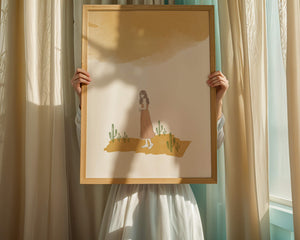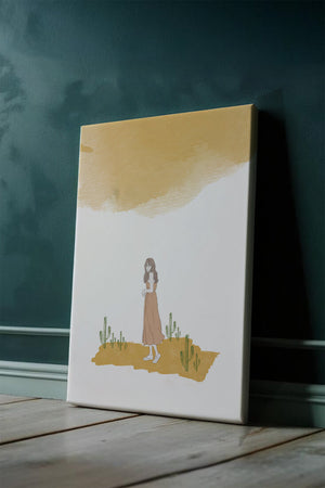 An elegant scene illustrates a girl in a long pink dress standing amidst cacti, set against a watercolor-like orange sky. The minimalist composition captures a sense of calm and introspection.