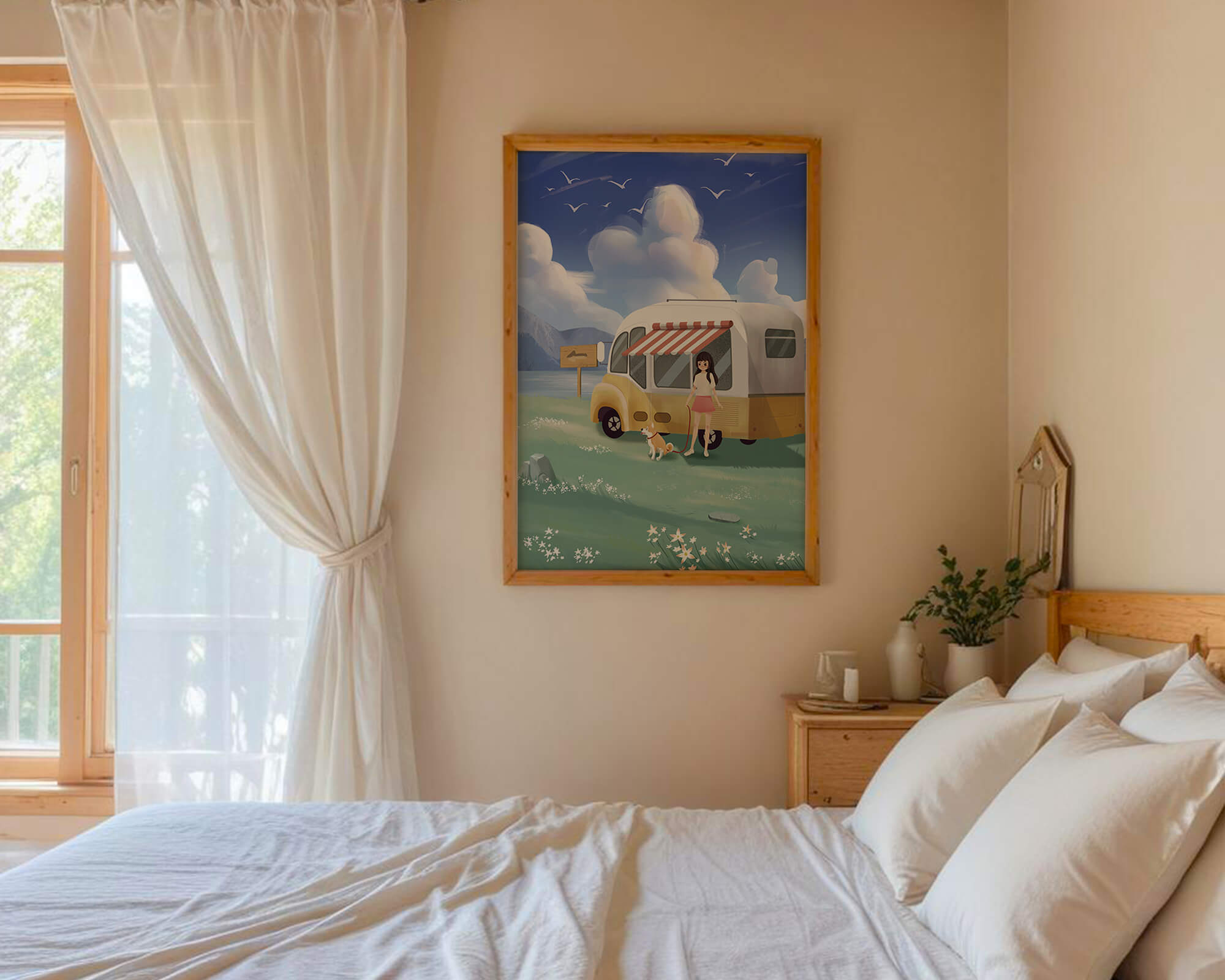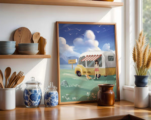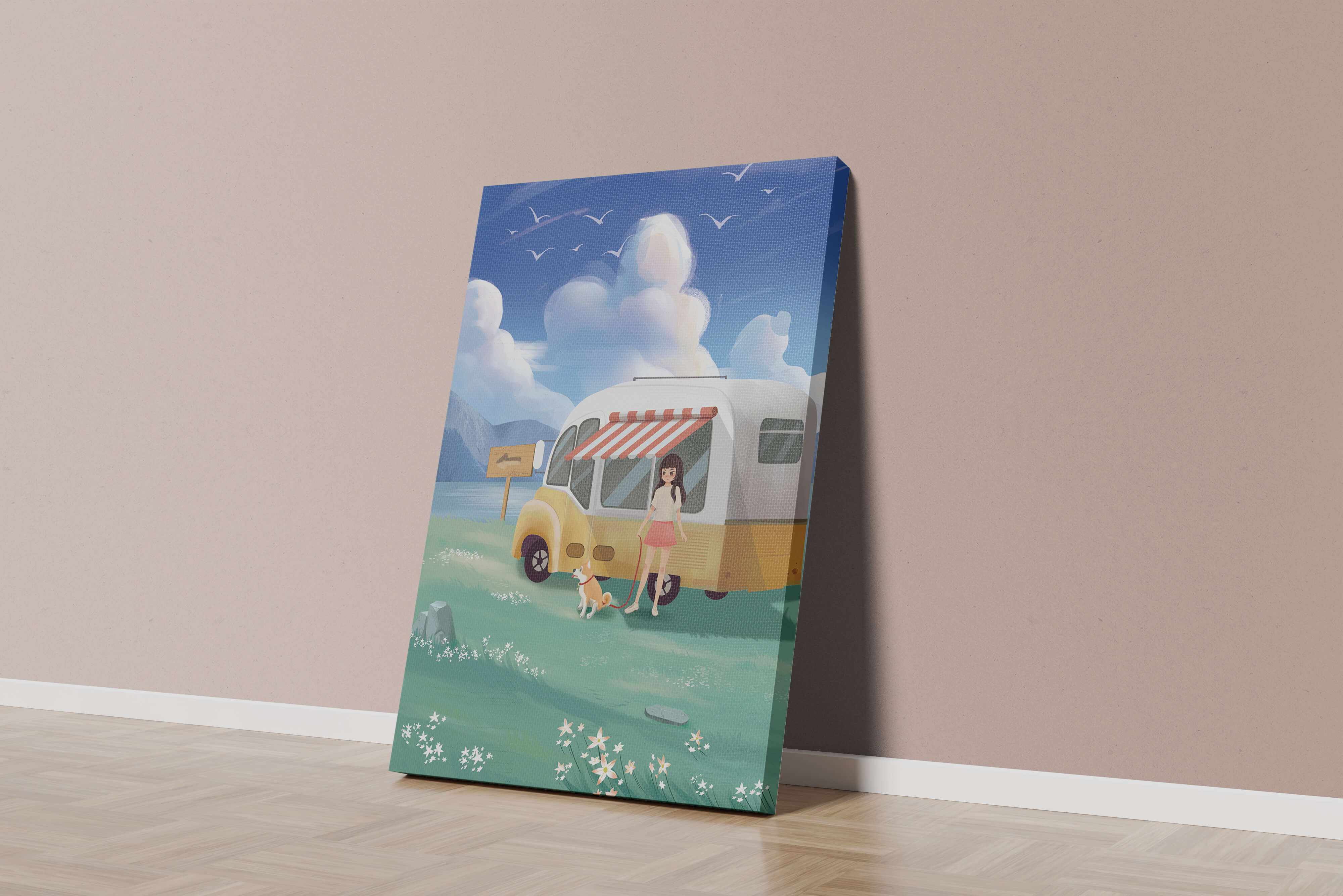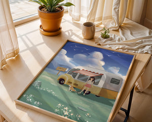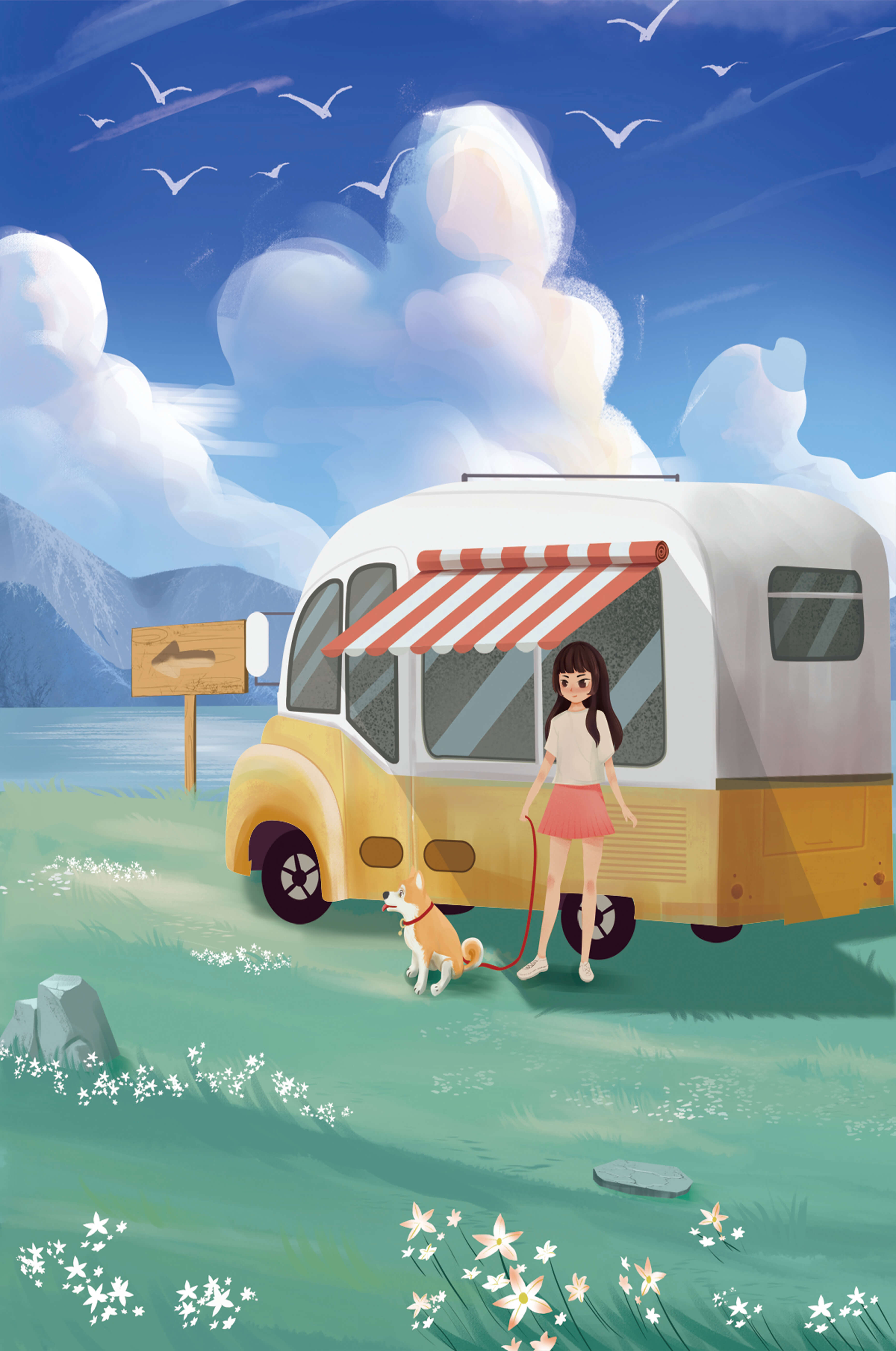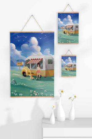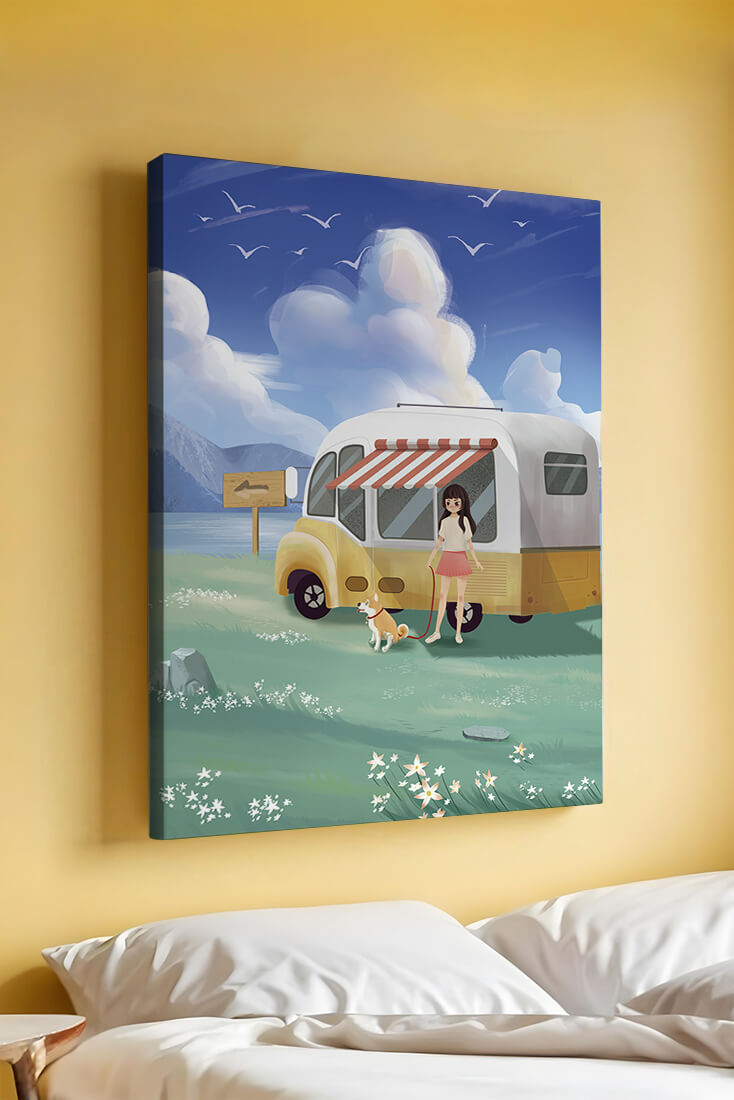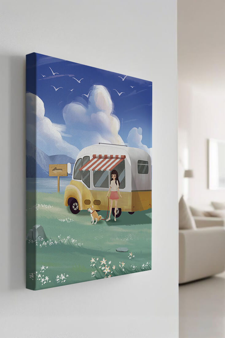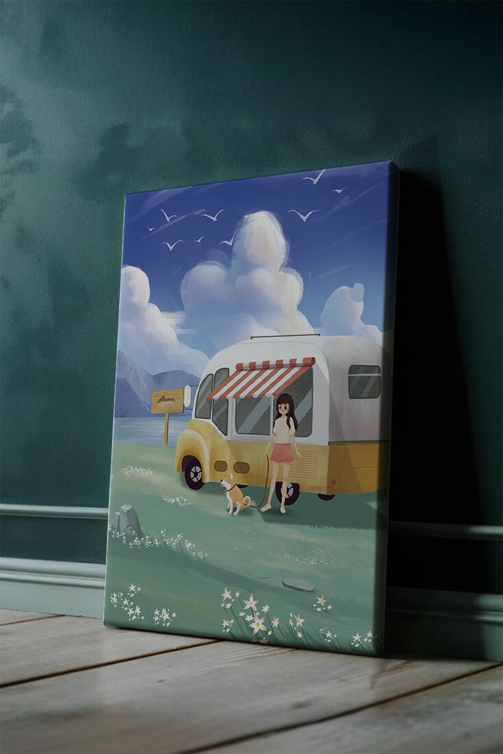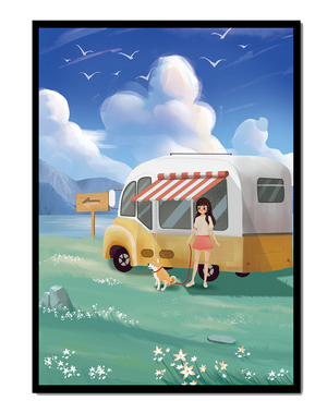 The illustration strikingly captures the essence of a tranquil outdoor adventure, with the girl and her dog exuding an air of freedom and joy. The camper van, with its retro aesthetic, suggests an enchanting journey through landscapes yet to be discovered. Surrounding them is a serene expanse of green grass sprinkled with delicate flowers, heightening the sense of a peaceful retreat.Above, a soft azure sky hosts gentle clouds and soaring birds, contributing to an idyllic scene that invites viewers to imagine their own travels. The harmonious blend of vivid colors and soothing elements makes this image a perfect representation of the allure of escaping into nature.| Type |