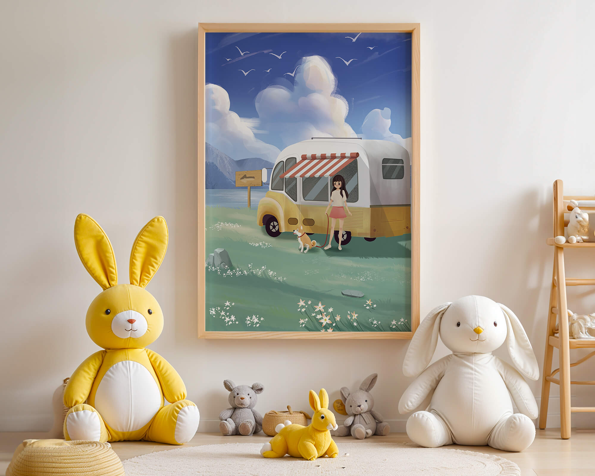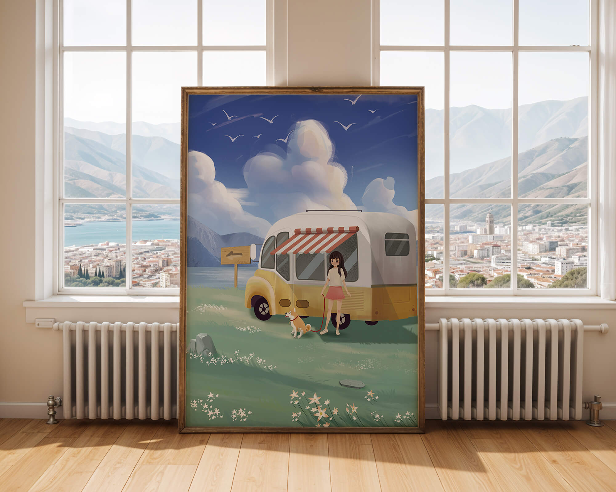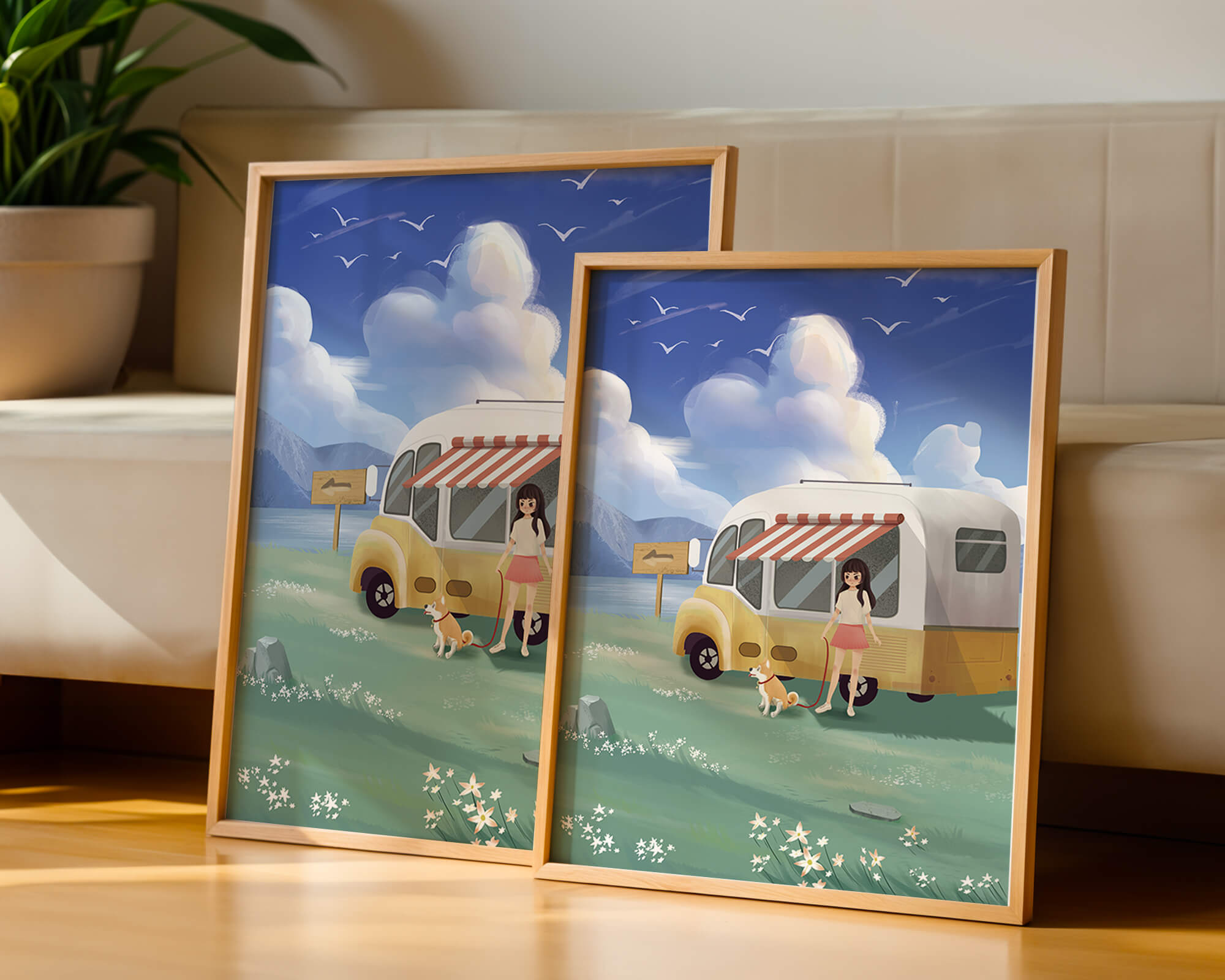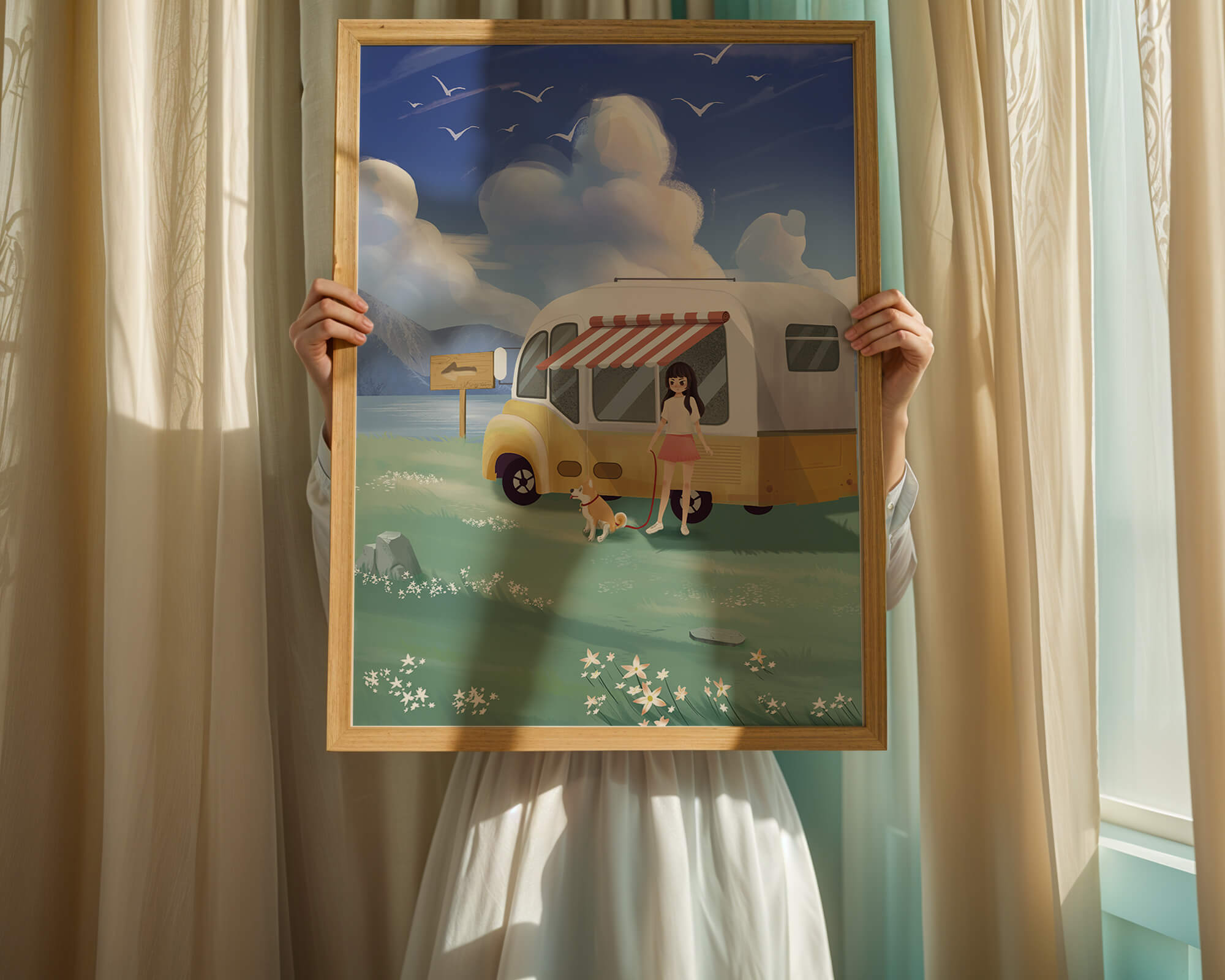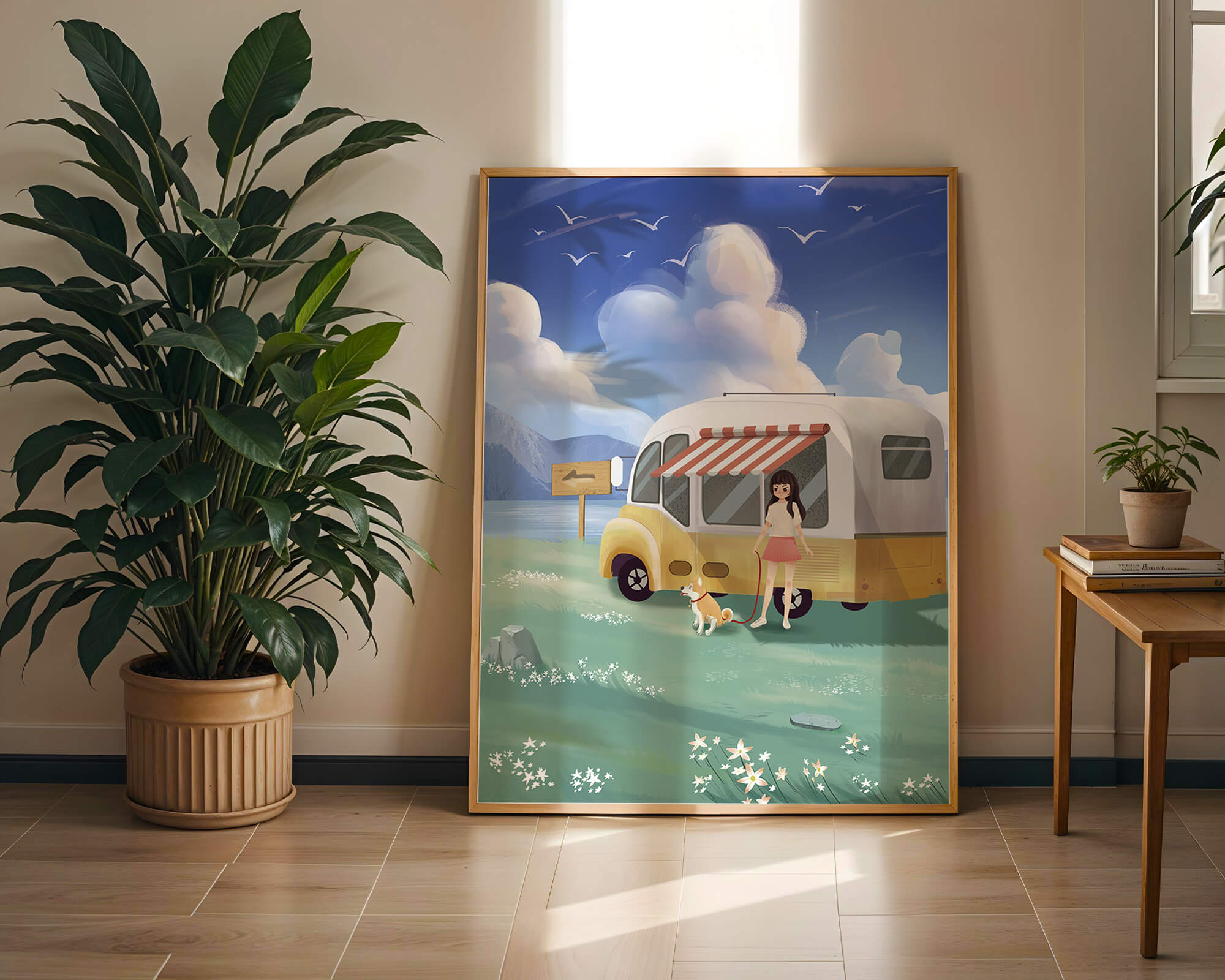 The illustration strikingly captures the essence of a tranquil outdoor adventure, with the girl and her dog exuding an air of freedom and joy. The camper van, with its retro aesthetic, suggests an enchanting journey through landscapes yet to be discovered. Surrounding them is a serene expanse of green grass sprinkled with delicate flowers, heightening the sense of a peaceful retreat.Above, a soft azure sky hosts gentle clouds and soaring birds, contributing to an idyllic scene that invites viewers to imagine their own travels. The harmonious blend of vivid colors and soothing elements makes this image a perfect representation of the allure of escaping into nature.| Type |
