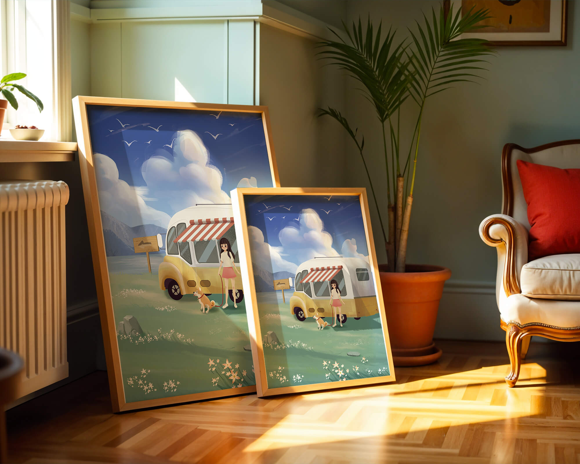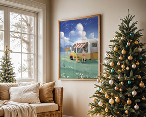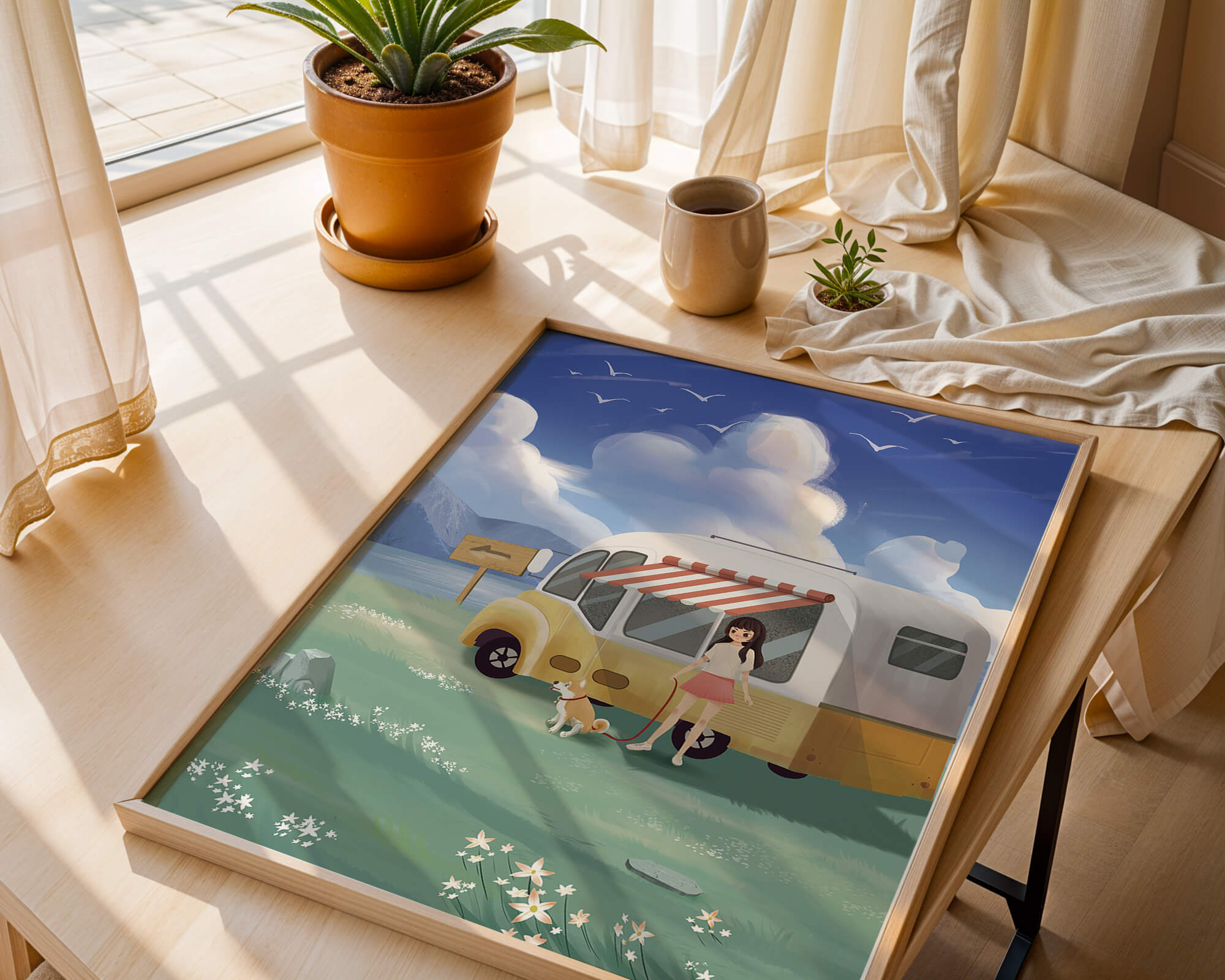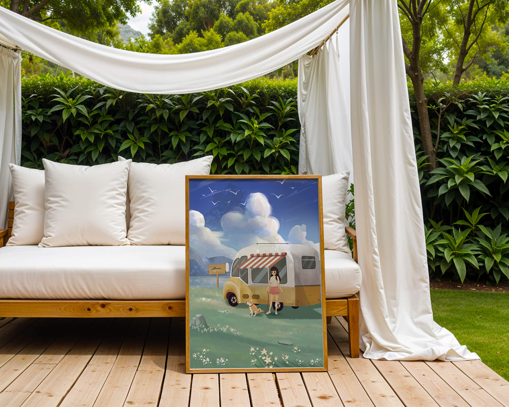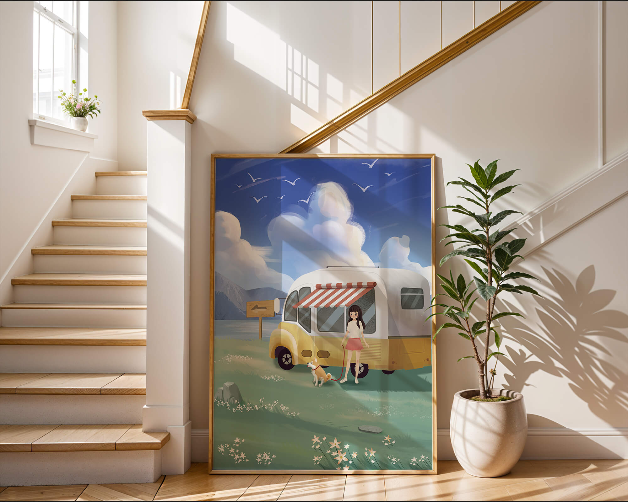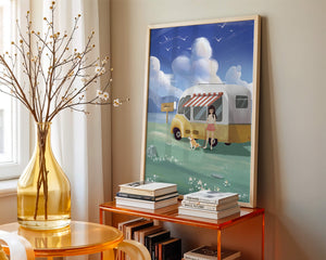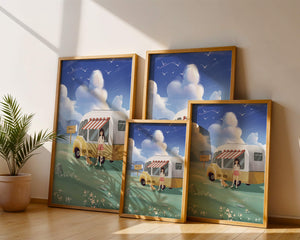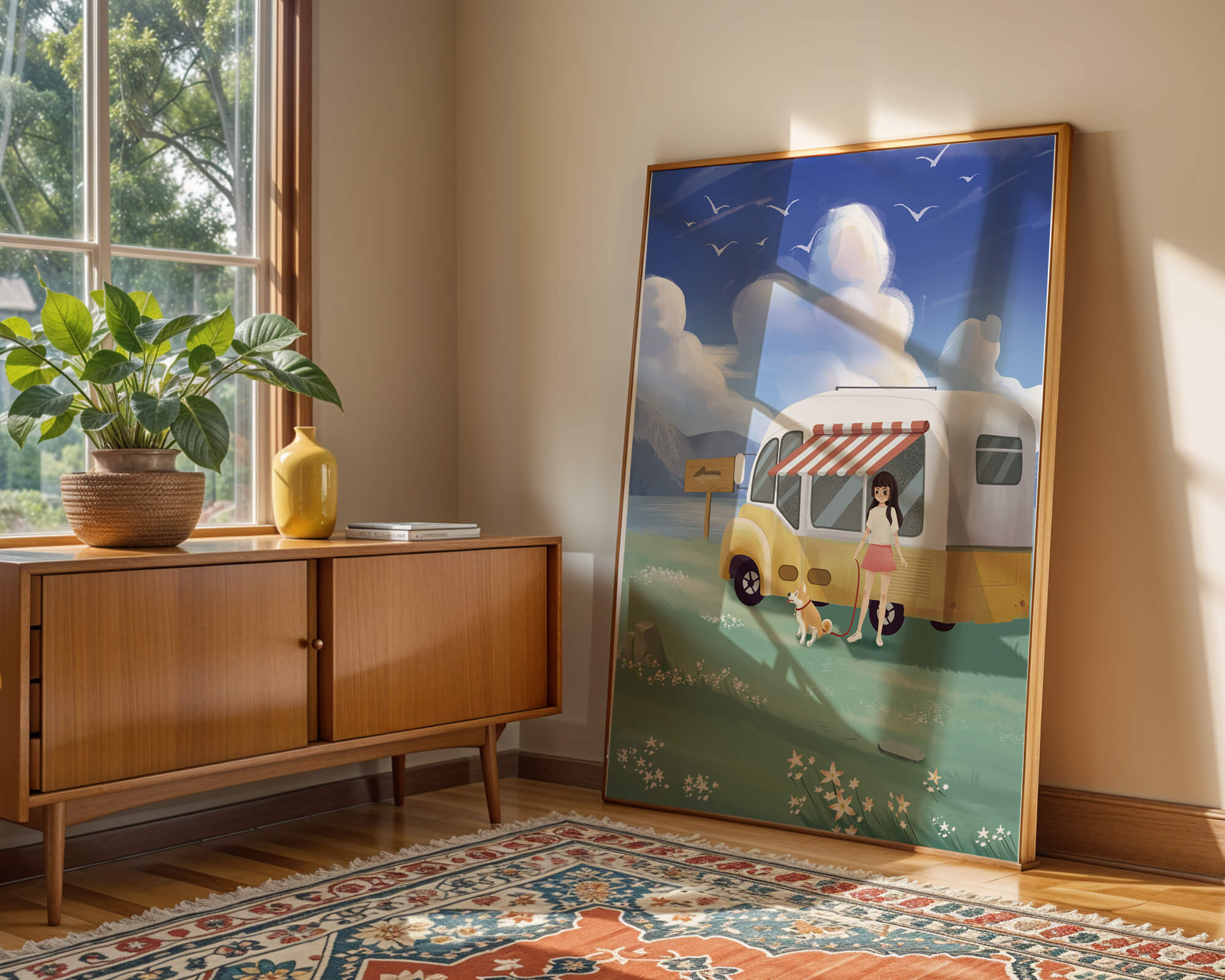 The illustration strikingly captures the essence of a tranquil outdoor adventure, with the girl and her dog exuding an air of freedom and joy. The camper van, with its retro aesthetic, suggests an enchanting journey through landscapes yet to be discovered. Surrounding them is a serene expanse of green grass sprinkled with delicate flowers, heightening the sense of a peaceful retreat.Above, a soft azure sky hosts gentle clouds and soaring birds, contributing to an idyllic scene that invites viewers to imagine their own travels. The harmonious blend of vivid colors and soothing elements makes this image a perfect representation of the allure of escaping into nature.| Type |