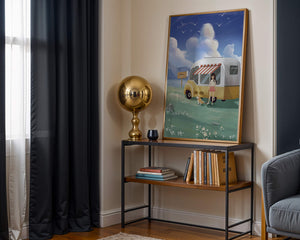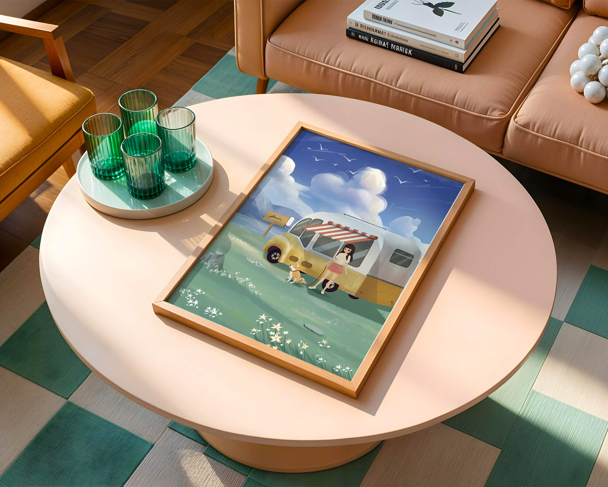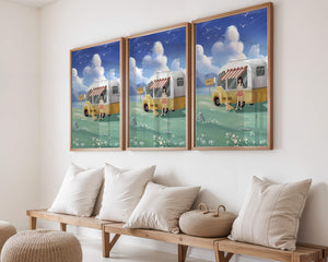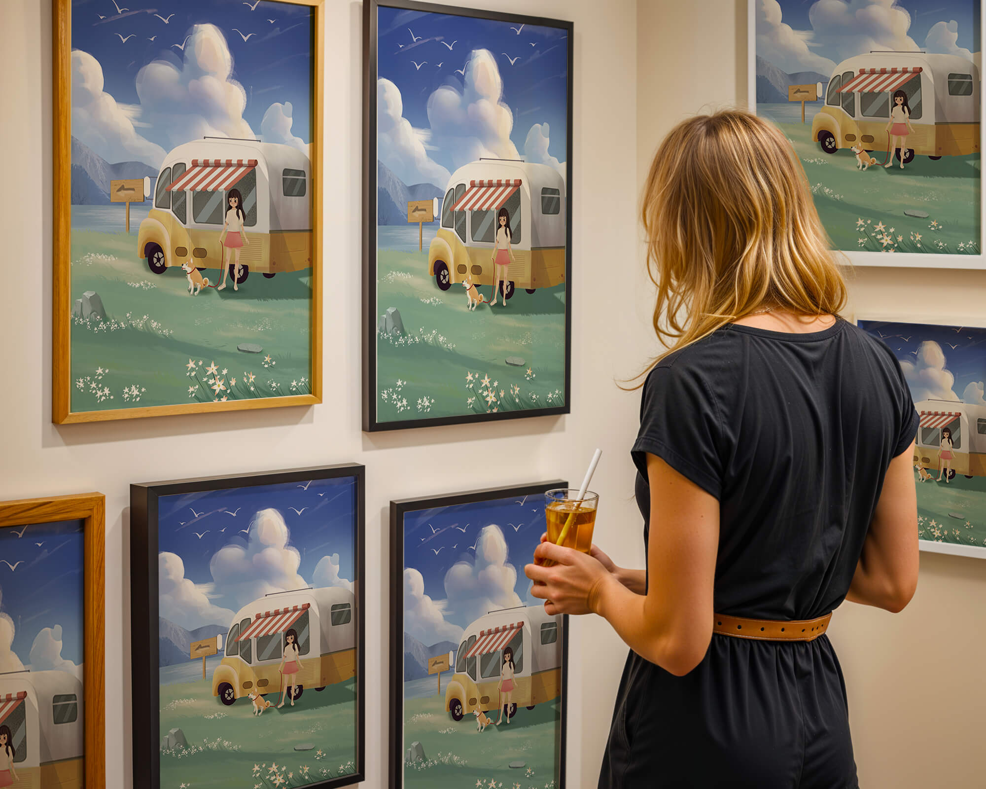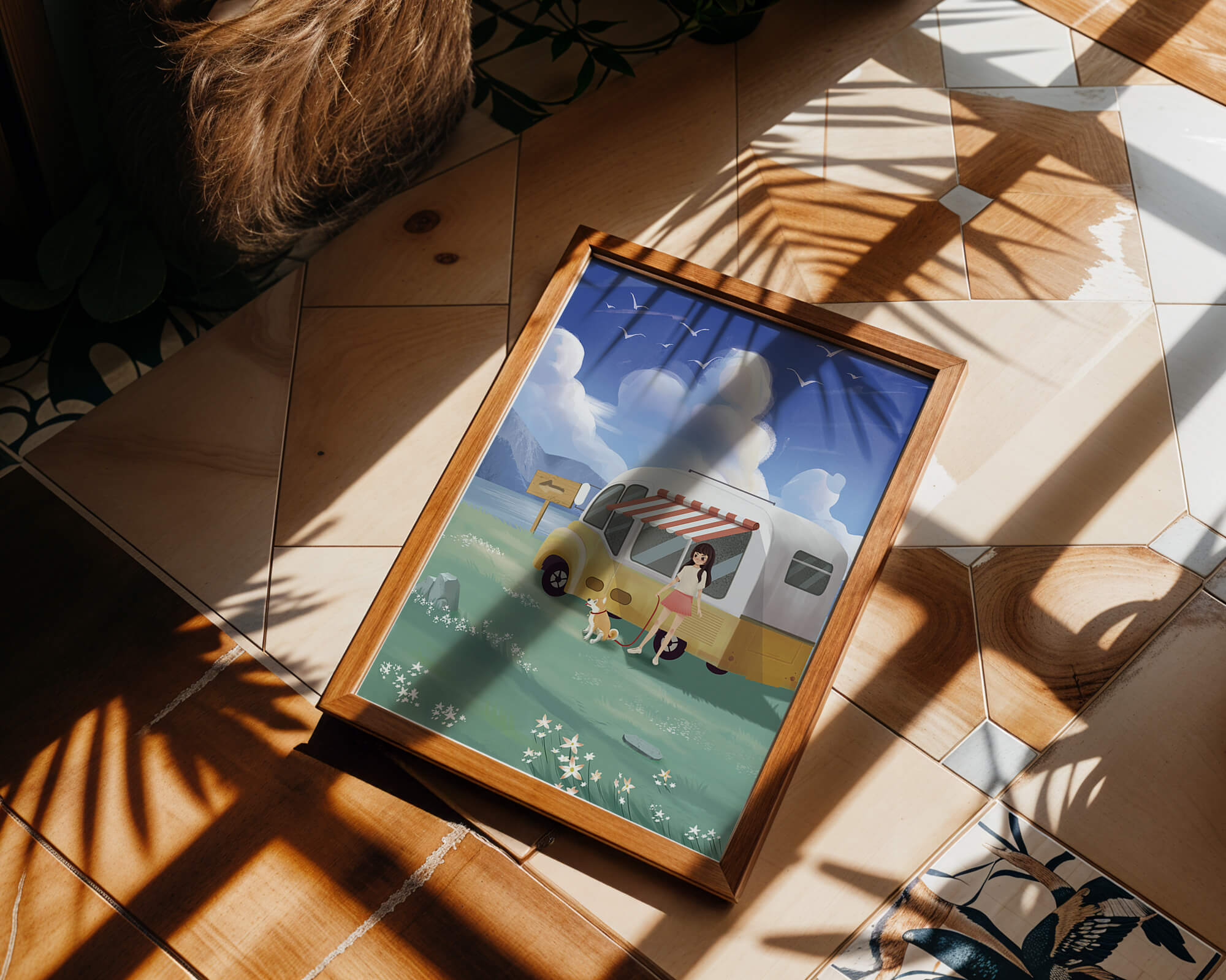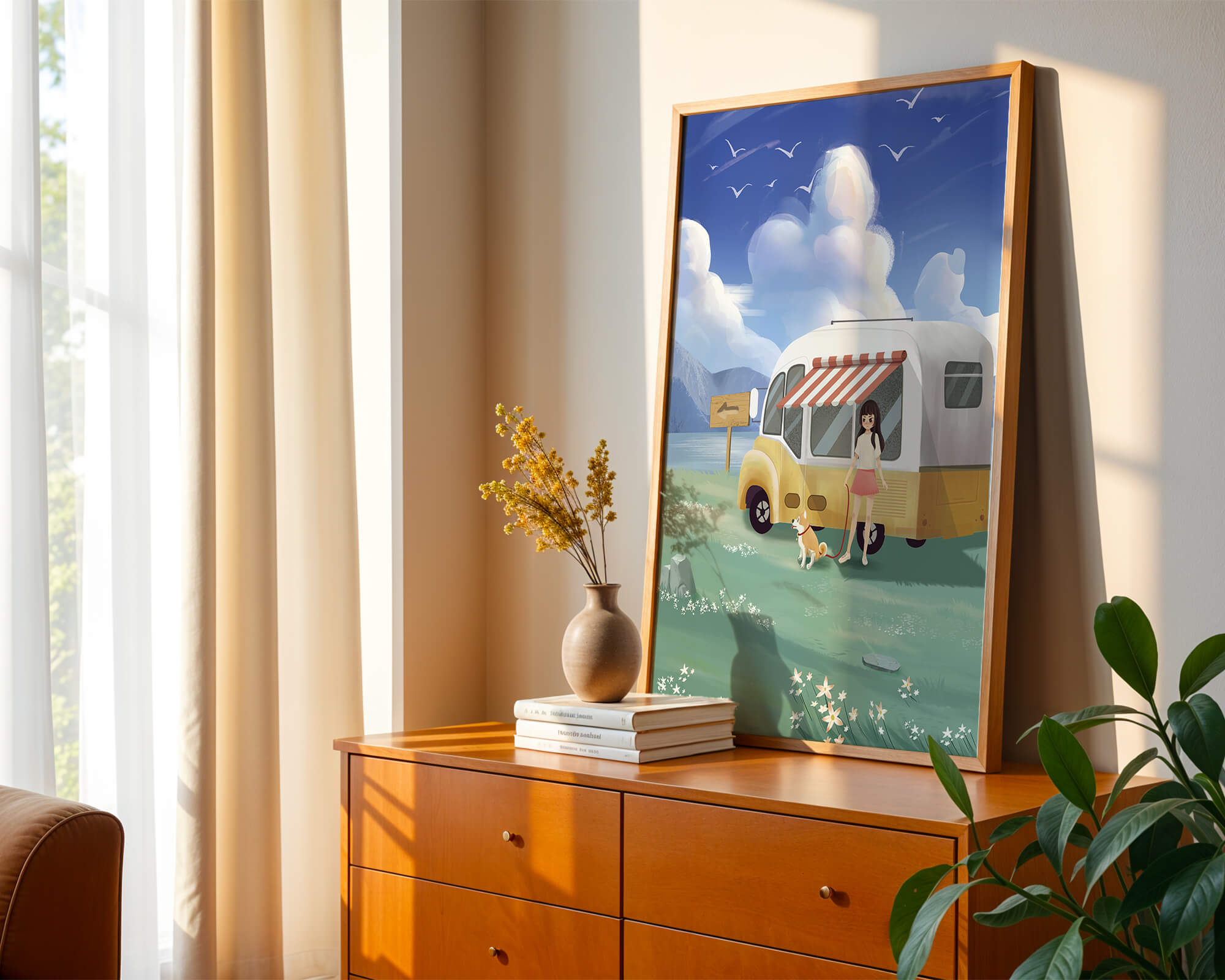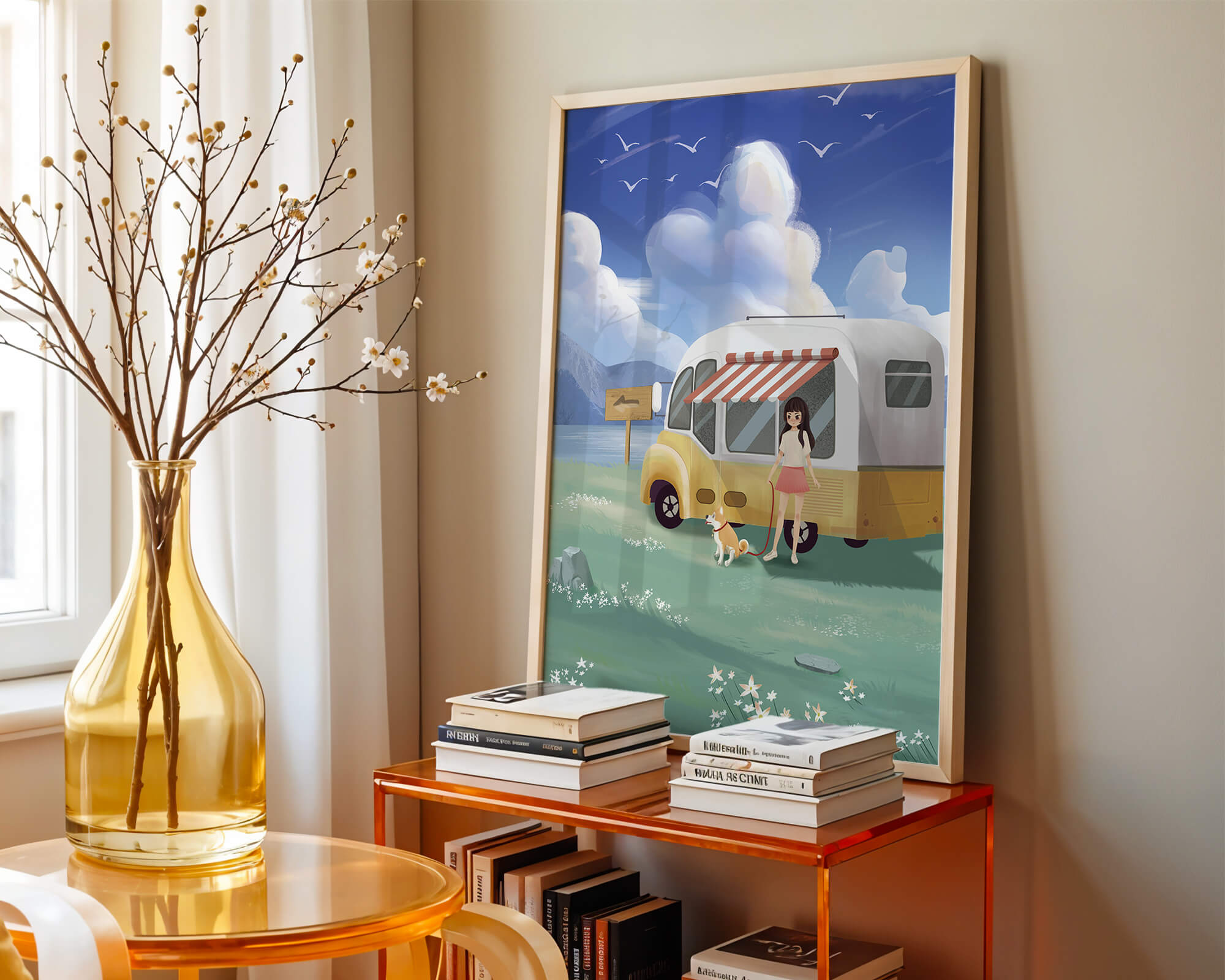 The illustration strikingly captures the essence of a tranquil outdoor adventure, with the girl and her dog exuding an air of freedom and joy. The camper van, with its retro aesthetic, suggests an enchanting journey through landscapes yet to be discovered. Surrounding them is a serene expanse of green grass sprinkled with delicate flowers, heightening the sense of a peaceful retreat.Above, a soft azure sky hosts gentle clouds and soaring birds, contributing to an idyllic scene that invites viewers to imagine their own travels. The harmonious blend of vivid colors and soothing elements makes this image a perfect representation of the allure of escaping into nature.| Type |
