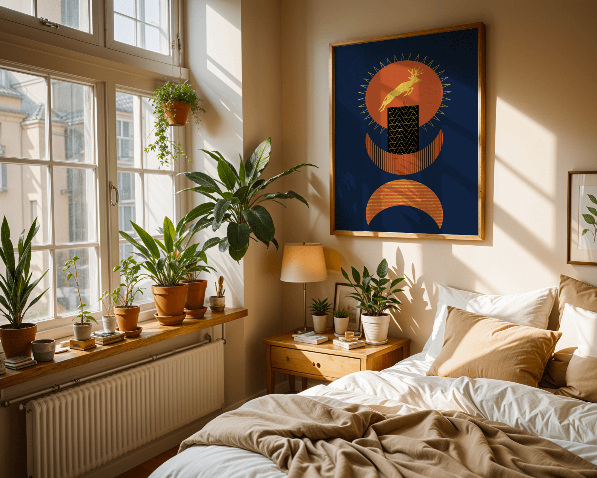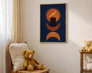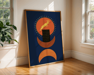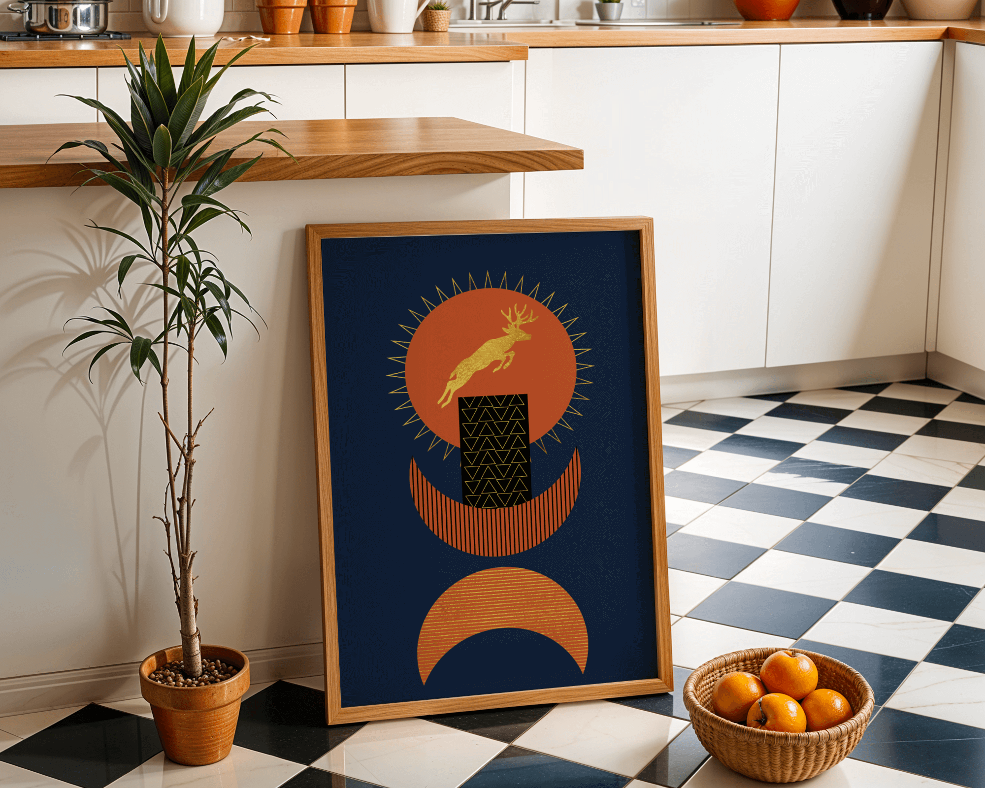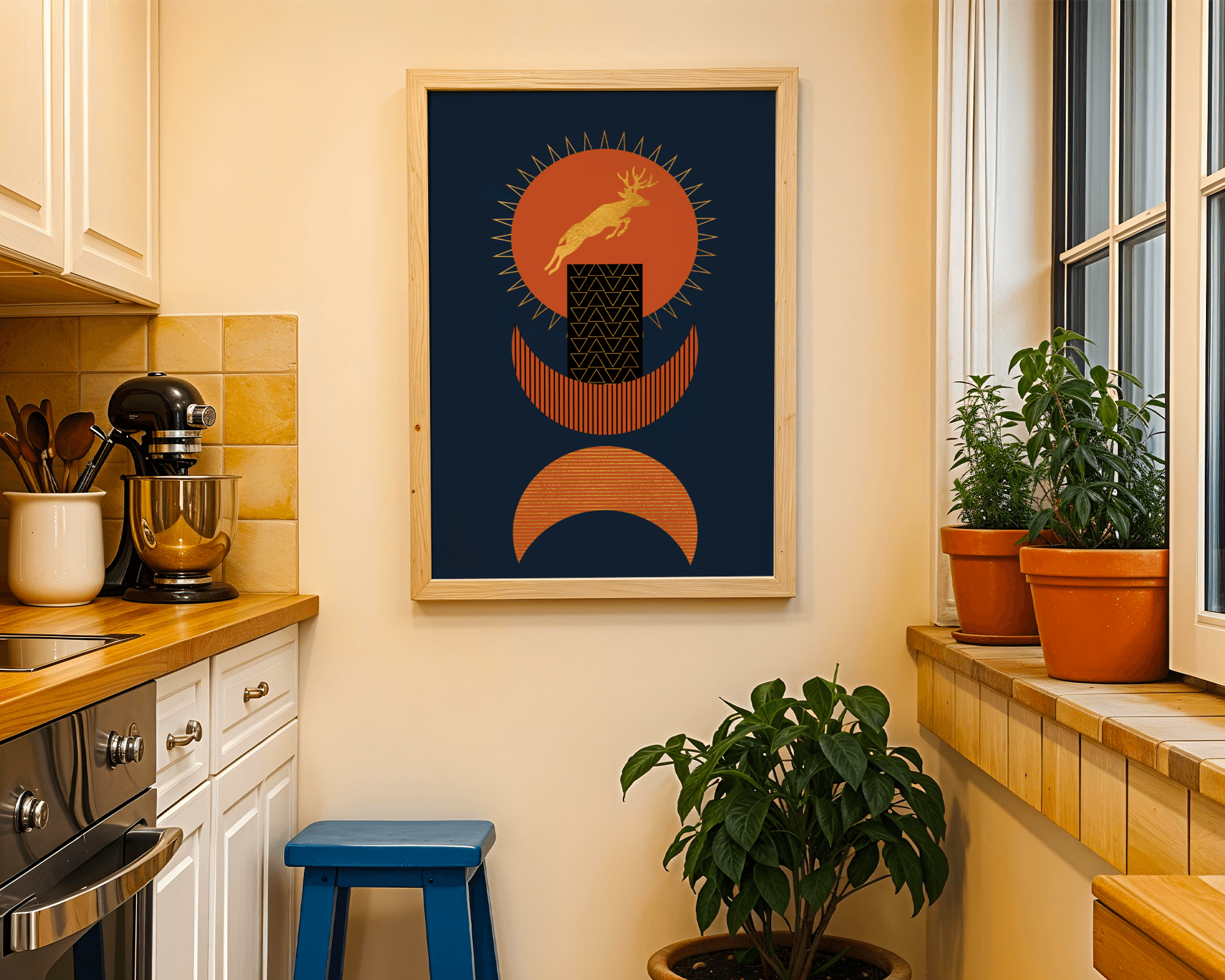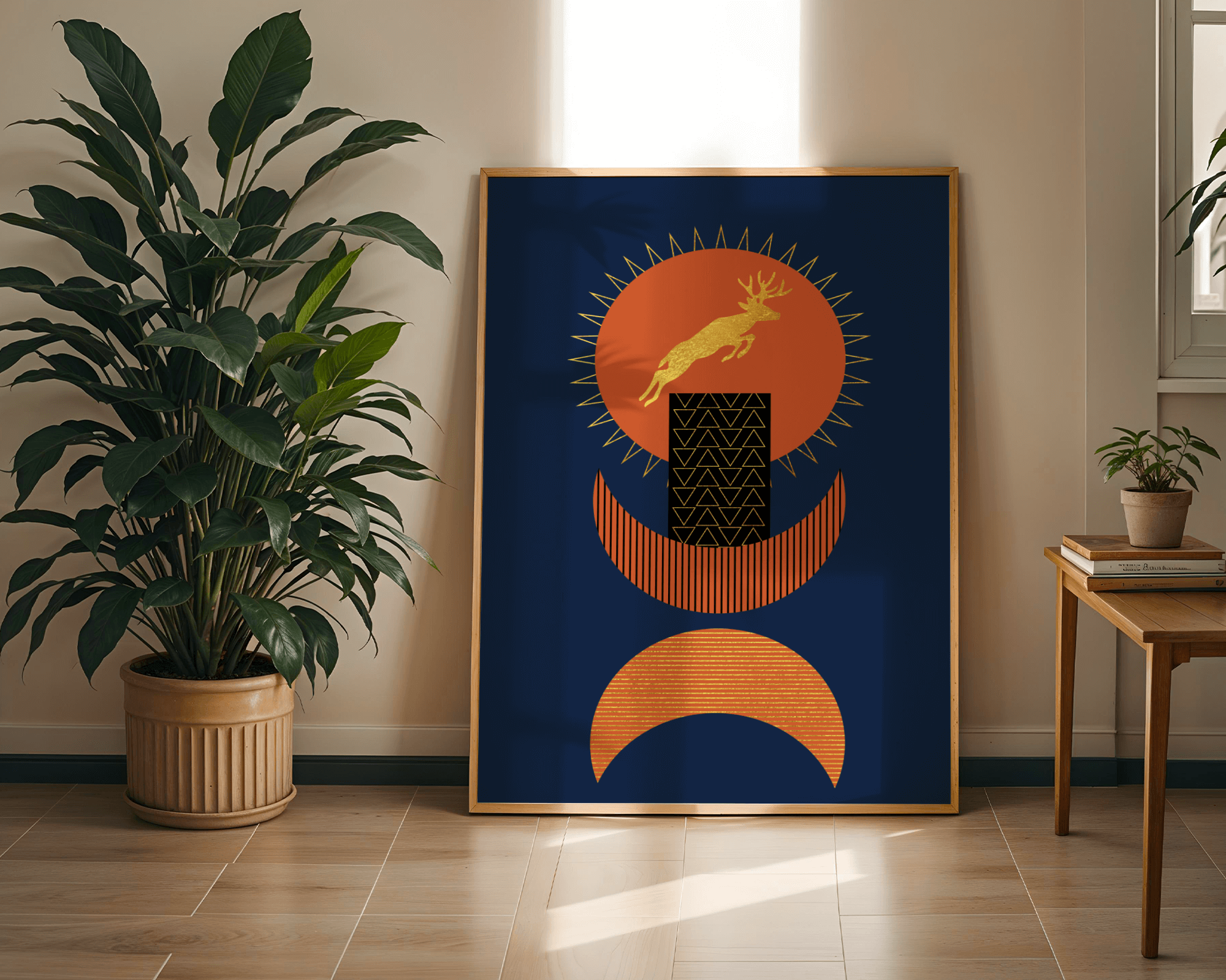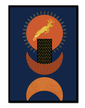 Elevate your space with this stunning golden deer artwork set against a deep blue and burnt orange geometric background.