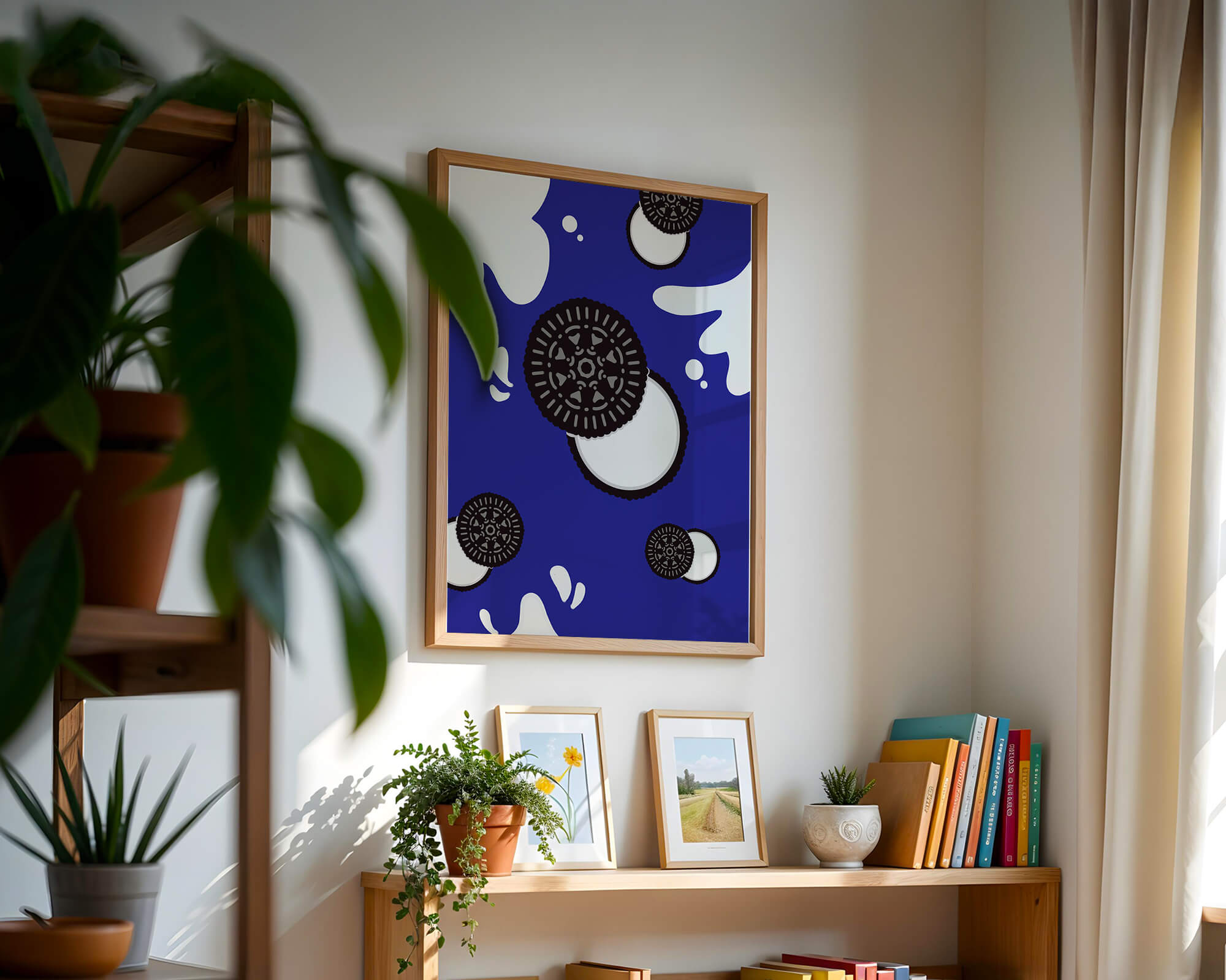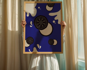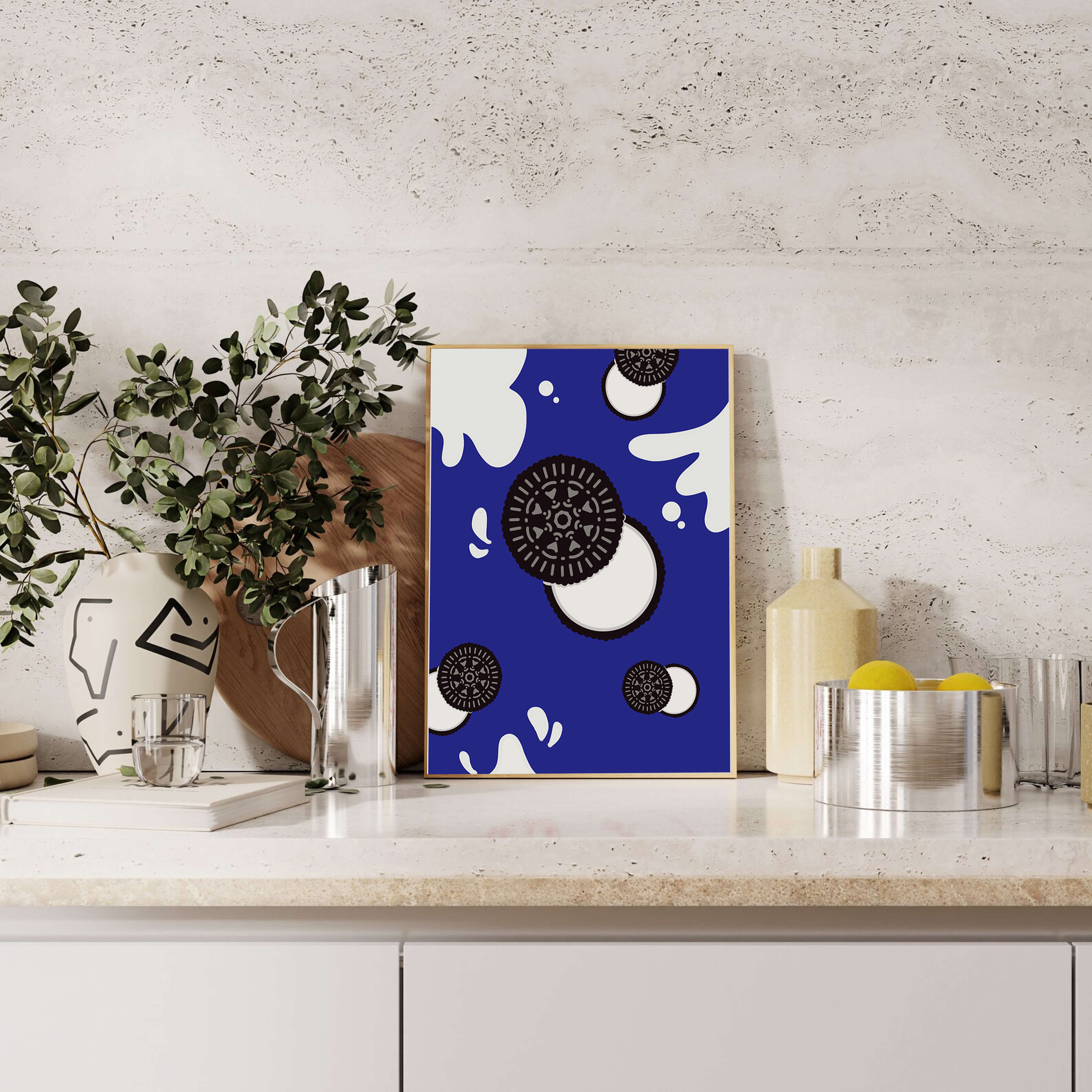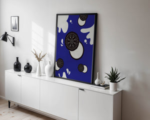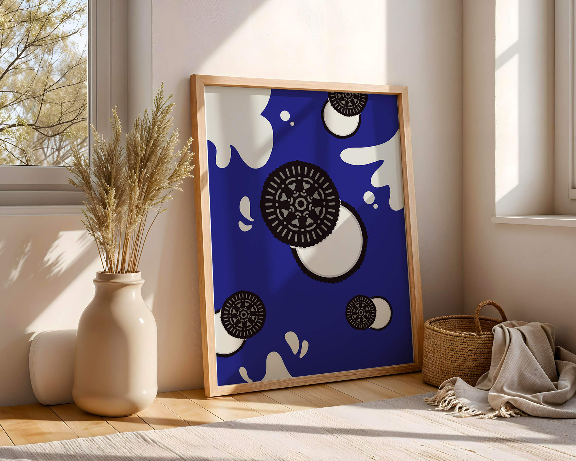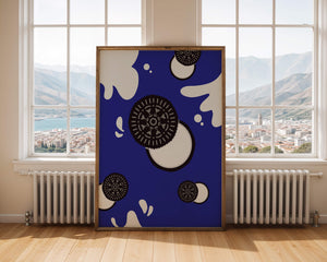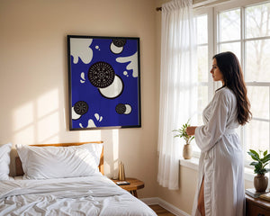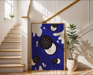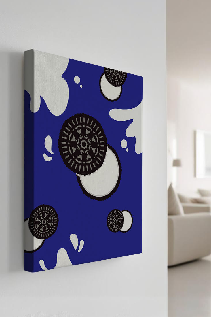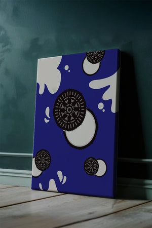 The image prominently features stylized cookies, represented by concentric black and white circles, dynamically scattered across the canvas. These are paired with abstract white splashes reminiscent of milk, creating an engaging pattern that stands out boldly against the vivid blue background. The designs simplicity is enhanced by the rich, contrasting colors, bringing a striking visual effect to the piece.Ideal for brightening up spaces like kitchens or dining areas, this graphic design seamlessly combines elements of modernity and playfulness. Its bold and artistic style not only adds a whimsical touch to the decor but also serves as an eye-catching focal point, making it a great choice for those looking to add a splash of fun to their interior space.