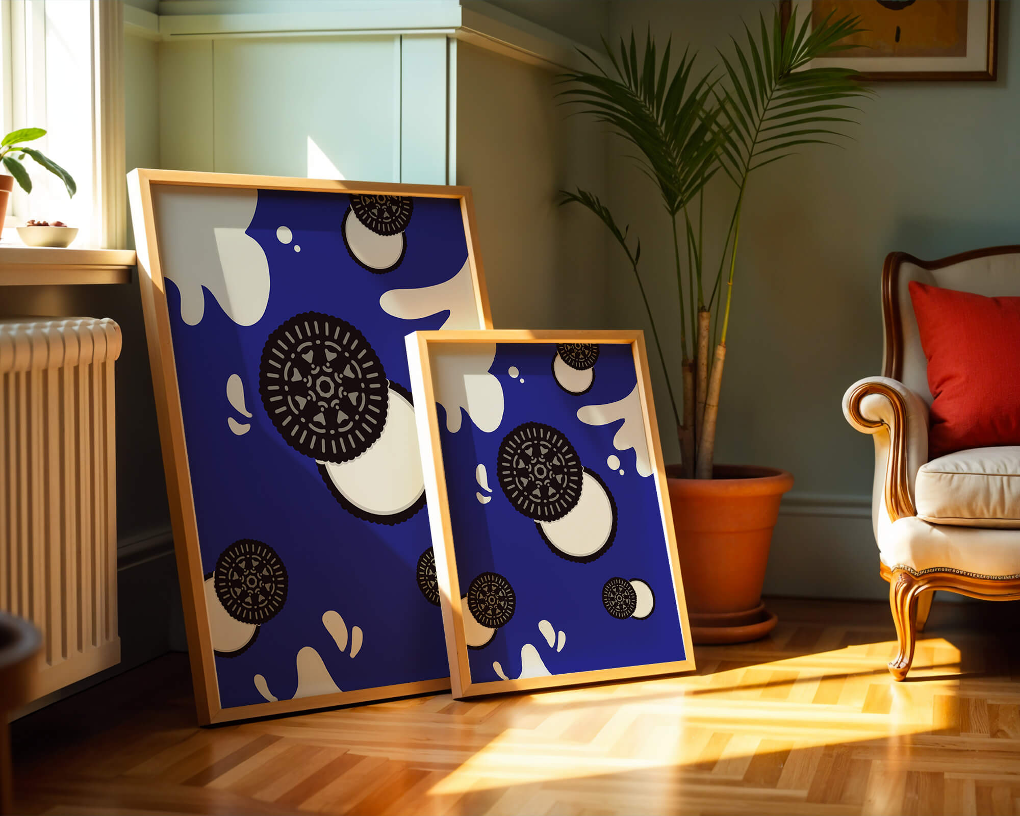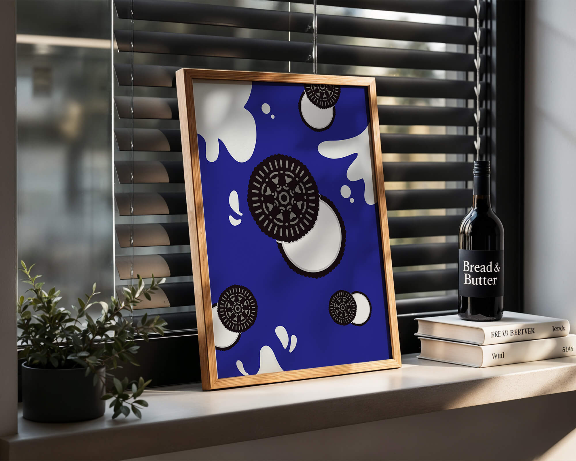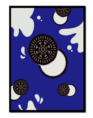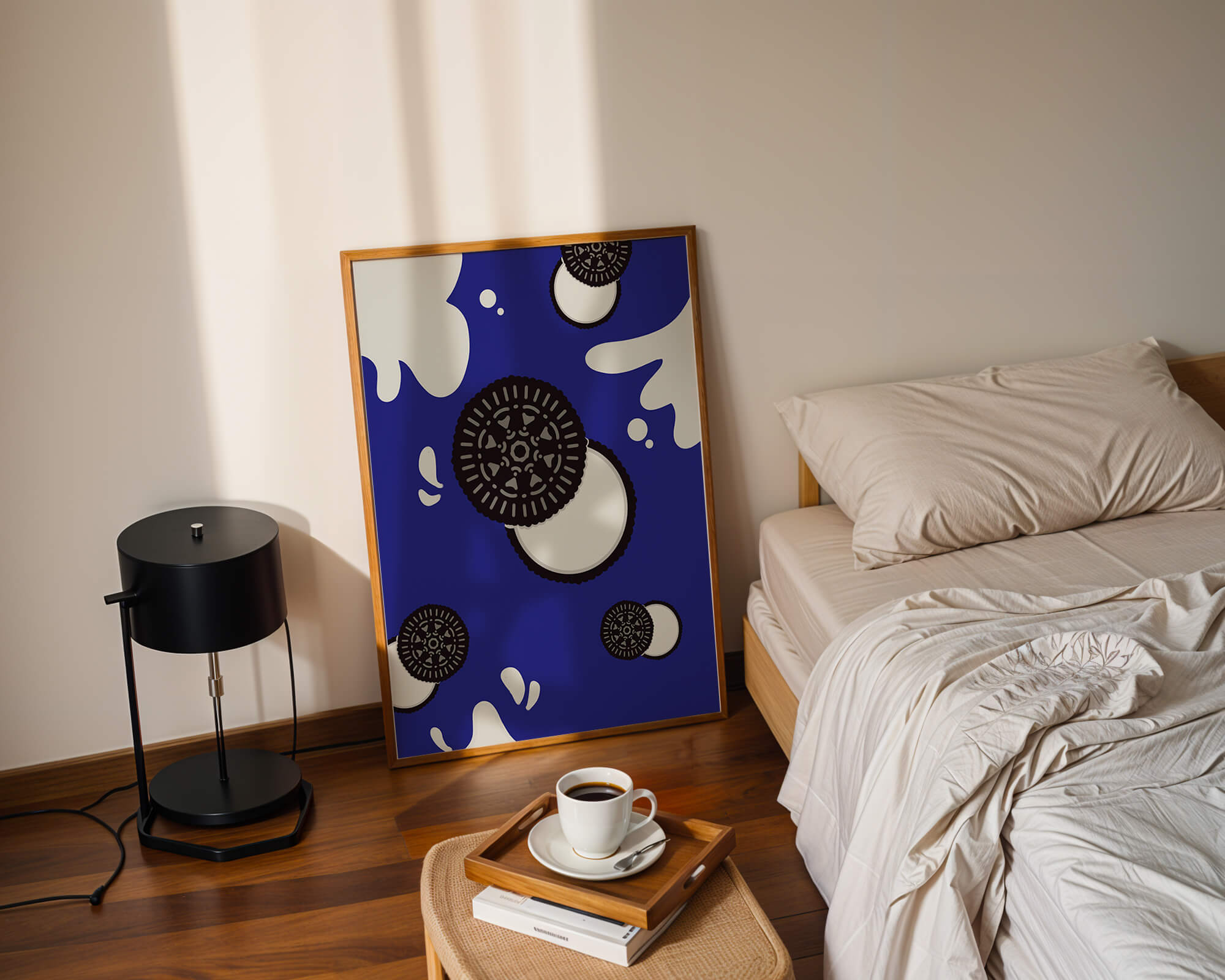 The image prominently features stylized cookies, represented by concentric black and white circles, dynamically scattered across the canvas. These are paired with abstract white splashes reminiscent of milk, creating an engaging pattern that stands out boldly against the vivid blue background. The designs simplicity is enhanced by the rich, contrasting colors, bringing a striking visual effect to the piece.Ideal for brightening up spaces like kitchens or dining areas, this graphic design seamlessly combines elements of modernity and playfulness. Its bold and artistic style not only adds a whimsical touch to the decor but also serves as an eye-catching focal point, making it a great choice for those looking to add a splash of fun to their interior space.