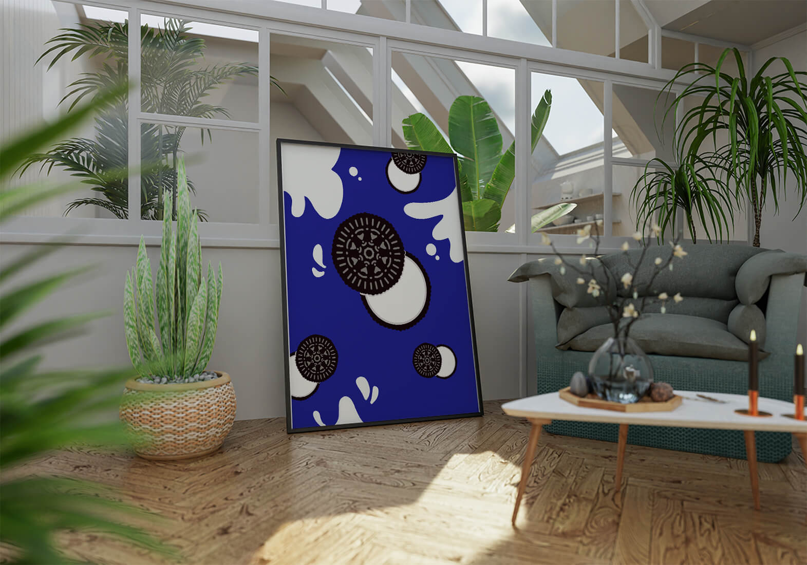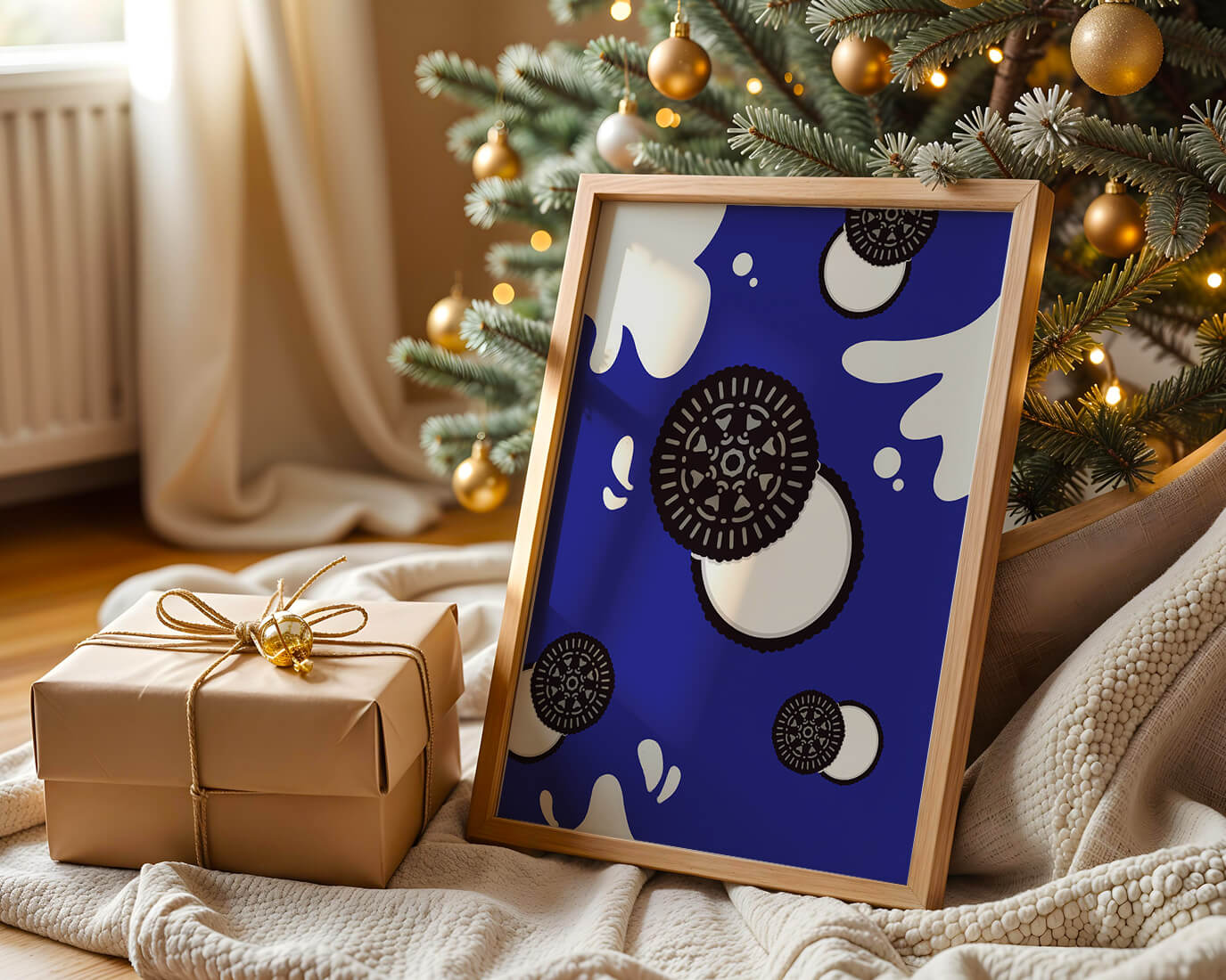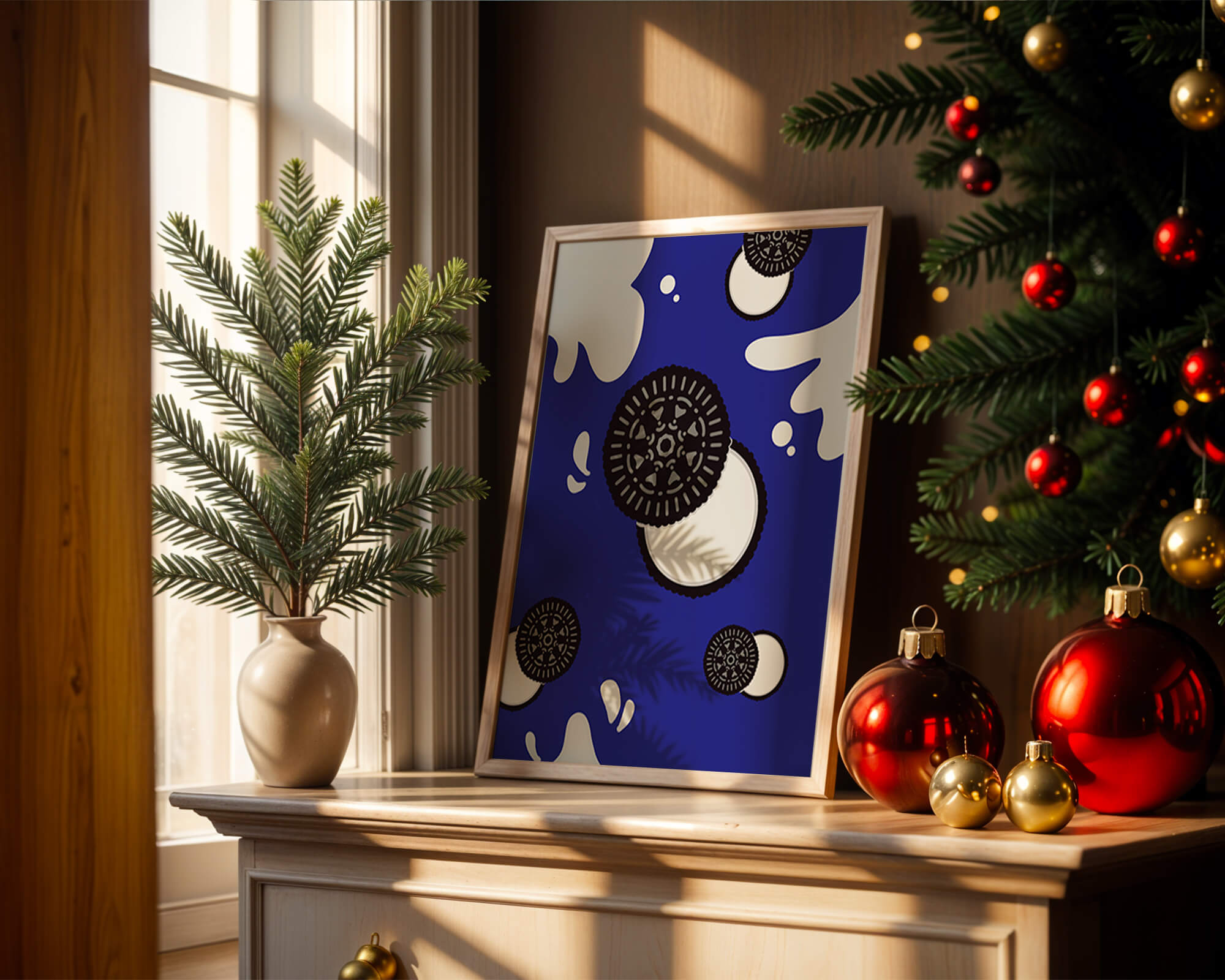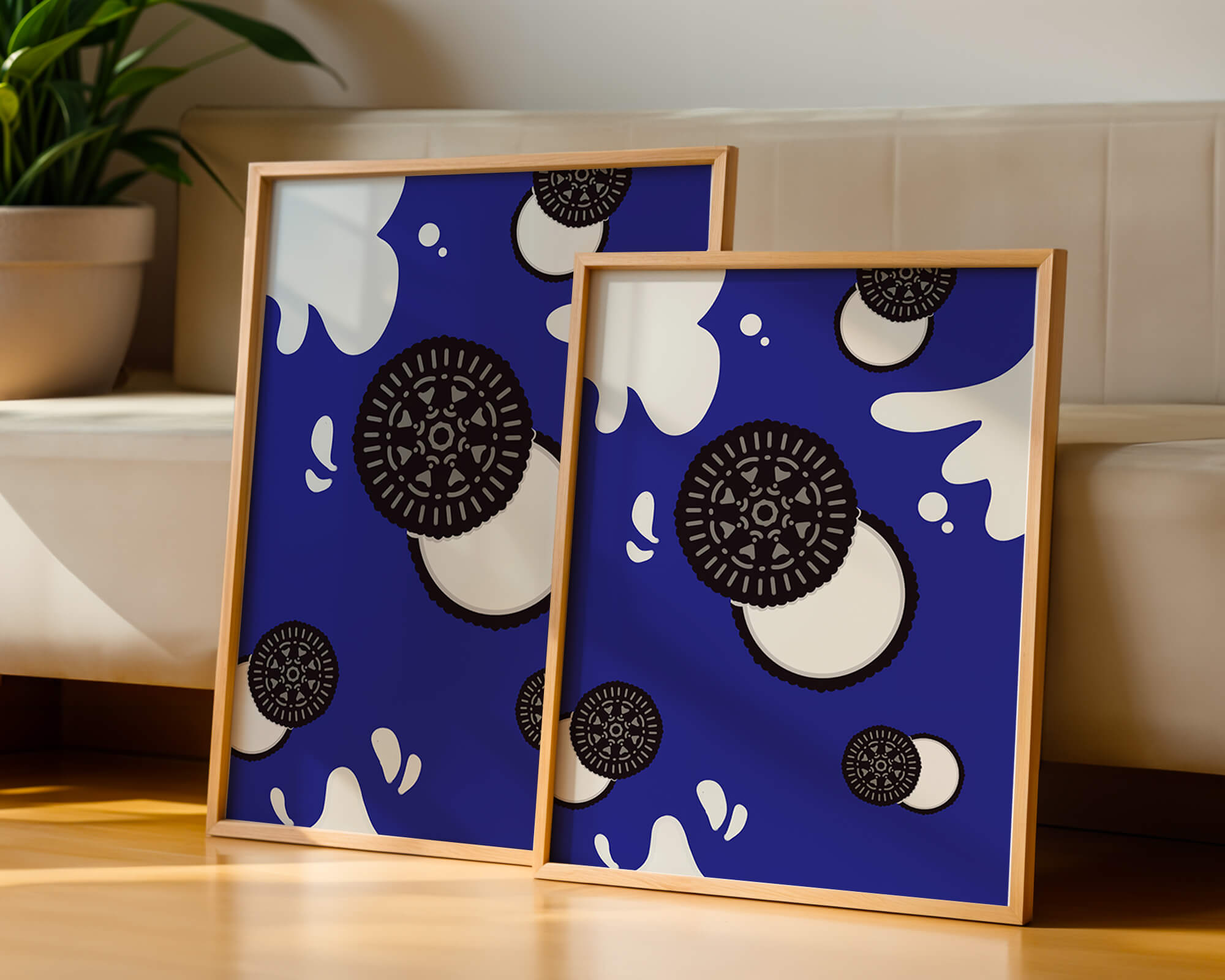 The image prominently features stylized cookies, represented by concentric black and white circles, dynamically scattered across the canvas. These are paired with abstract white splashes reminiscent of milk, creating an engaging pattern that stands out boldly against the vivid blue background. The designs simplicity is enhanced by the rich, contrasting colors, bringing a striking visual effect to the piece.Ideal for brightening up spaces like kitchens or dining areas, this graphic design seamlessly combines elements of modernity and playfulness. Its bold and artistic style not only adds a whimsical touch to the decor but also serves as an eye-catching focal point, making it a great choice for those looking to add a splash of fun to their interior space.