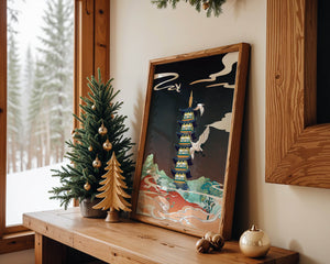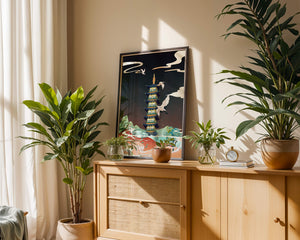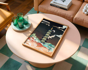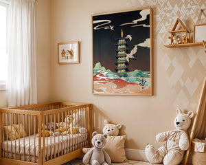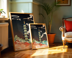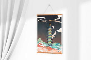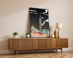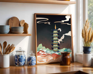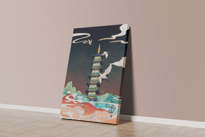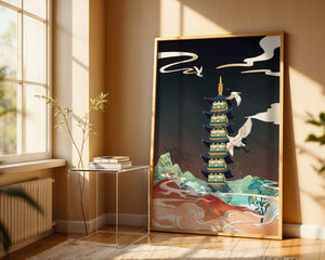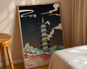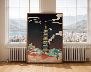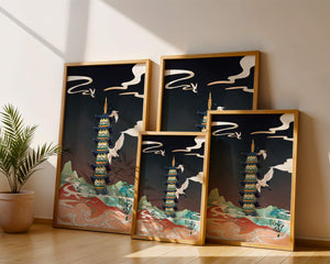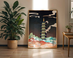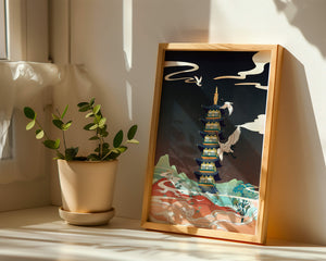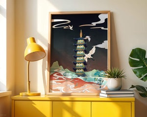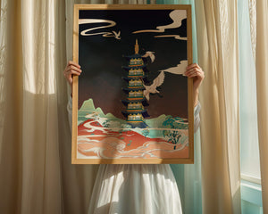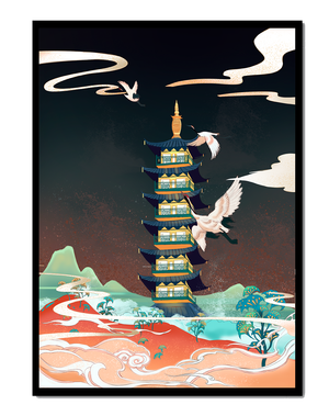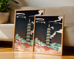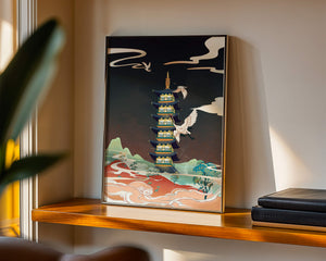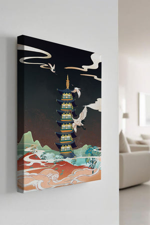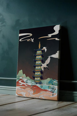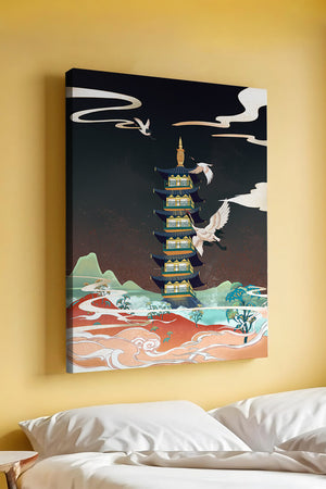 The image showcases a classic pagoda, with its distinct tiered structure, nestled within a vibrant setting. The pagodas intricate design is emphasized by the rich colors and precise lines that define its architecture. As cranes, symbols of longevity and good fortune, soar around the structure, their elegance adds motion and life to the scene.Flowing clouds and abstract land formations create a dreamlike atmosphere, drawing the viewer into the world of the illustration. The use of bold colors and smooth gradients highlights the balance between natural beauty and man-made structures, making it a perfect addition to spaces seeking a touch of the exotic and artistic.| Type |