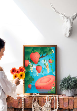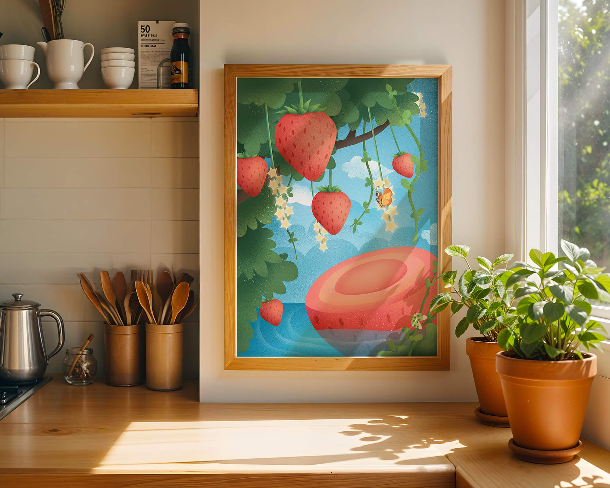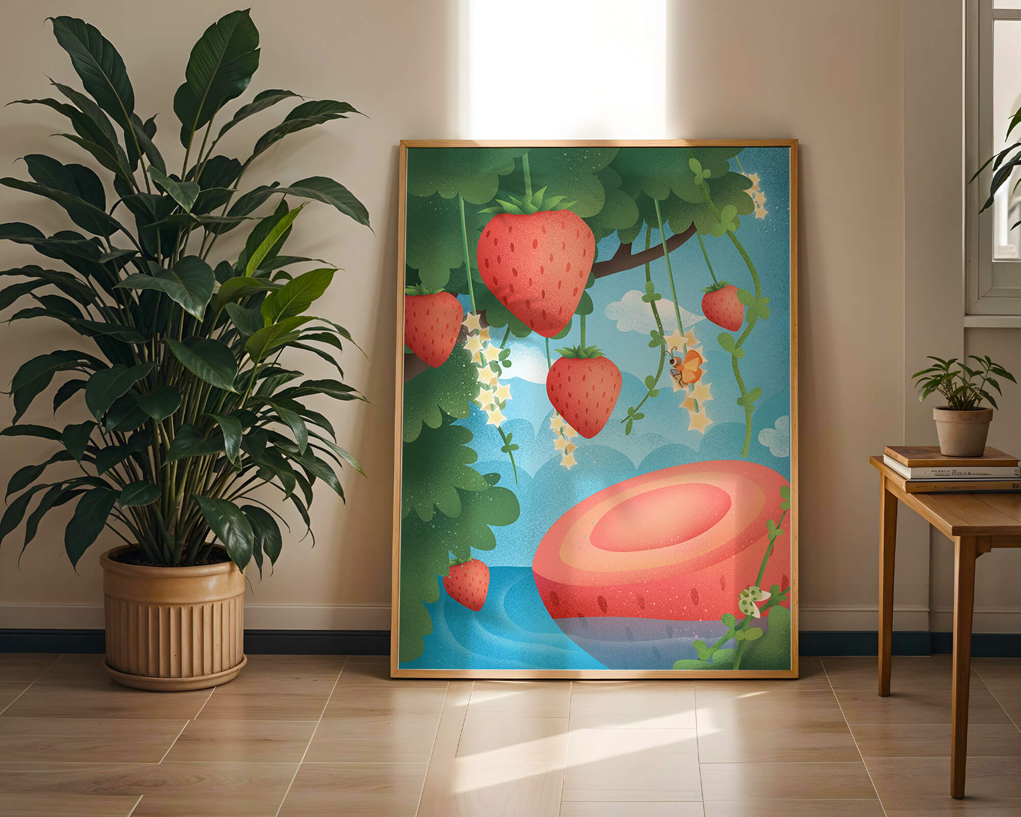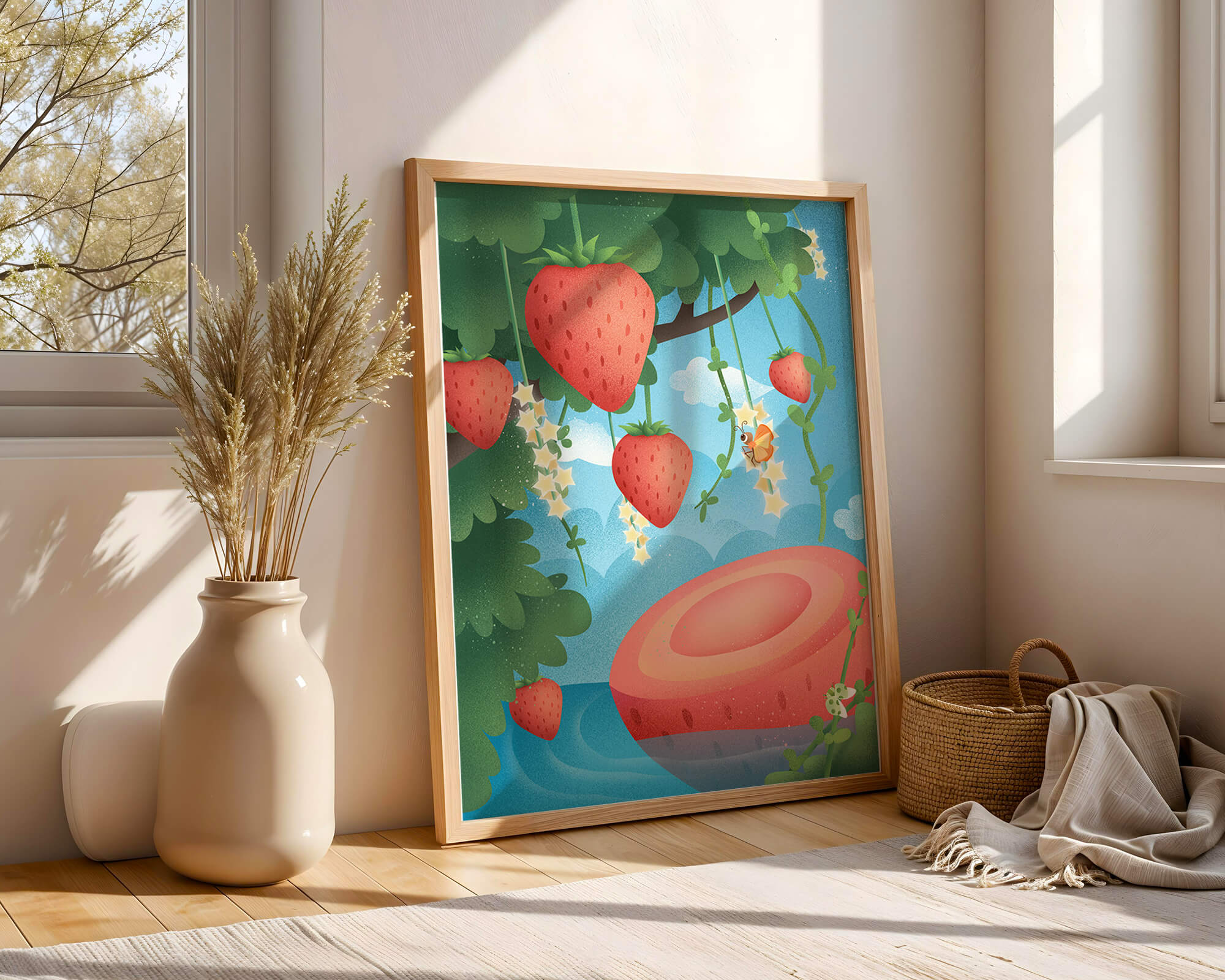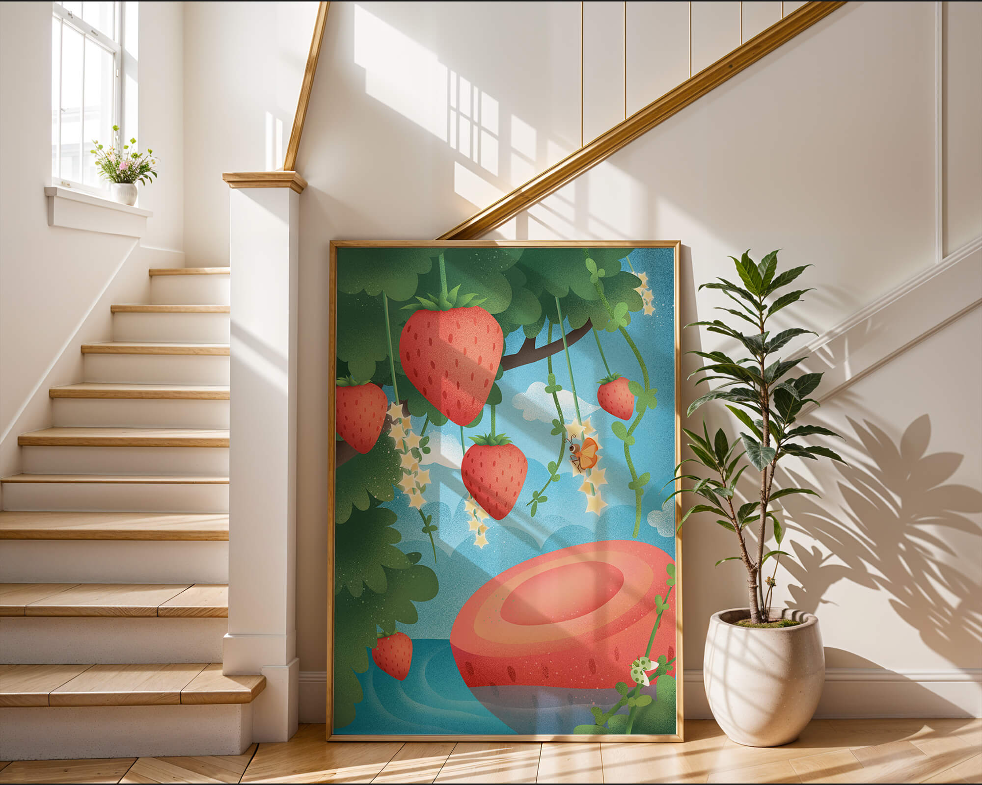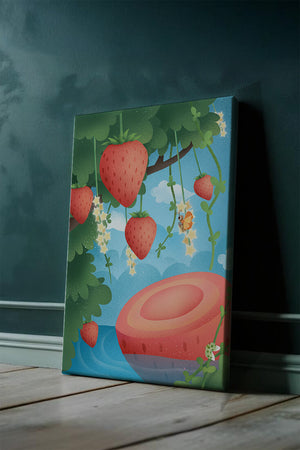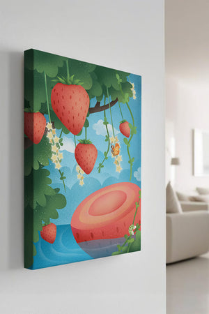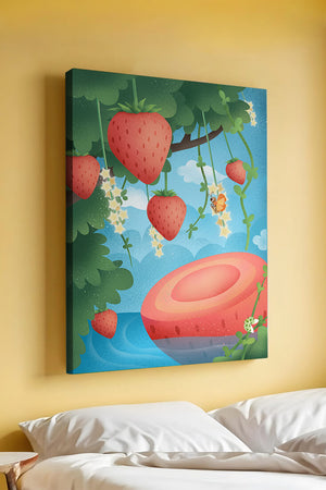 Hanging in this dreamlike environment are vivid red strawberries, showcased in a way that captures both realism and fantasy. The fruits dangle from verdant vines, their surfaces speckled with tiny seed dots, signifying freshness. A playful butterfly flits nearby, adding an element of life and animation to the image.The scene also includes the imaginative view of a large sliced strawberry, its interior revealed in vibrant hues, spiraling in layers down to the water beneath. This imaginative landscape, with its detailed textures and magical atmosphere, offers a perfect addition to children’s rooms, inspiring wonder and delight.