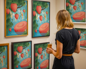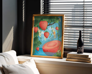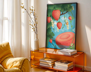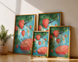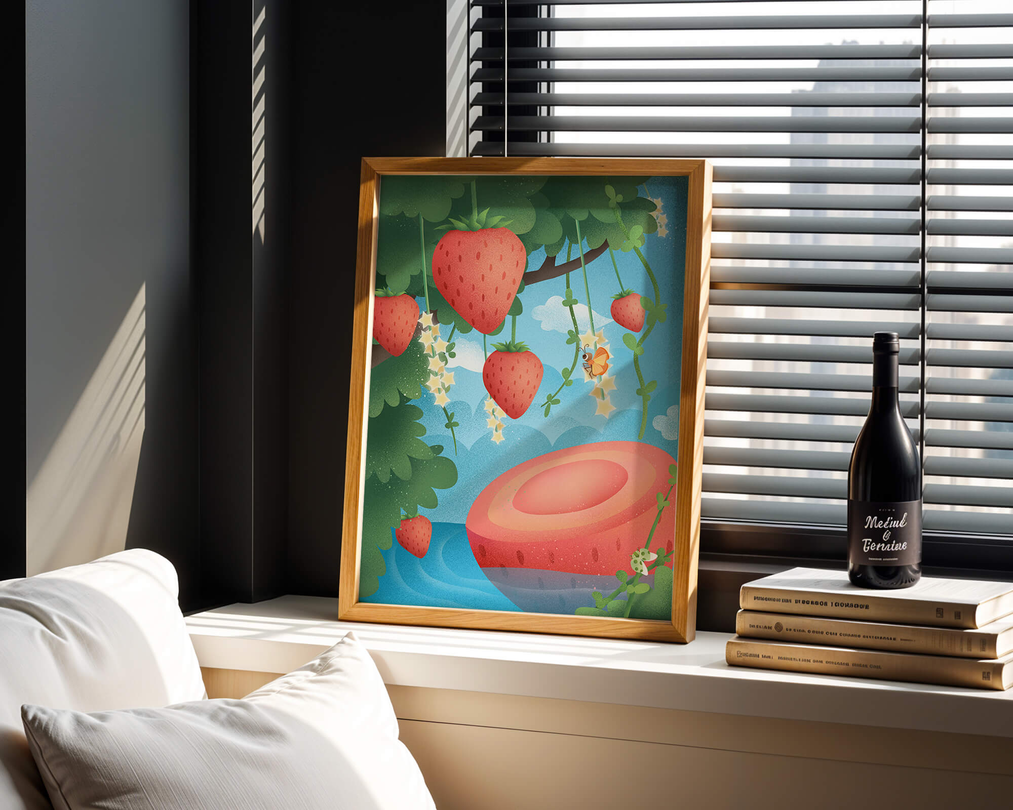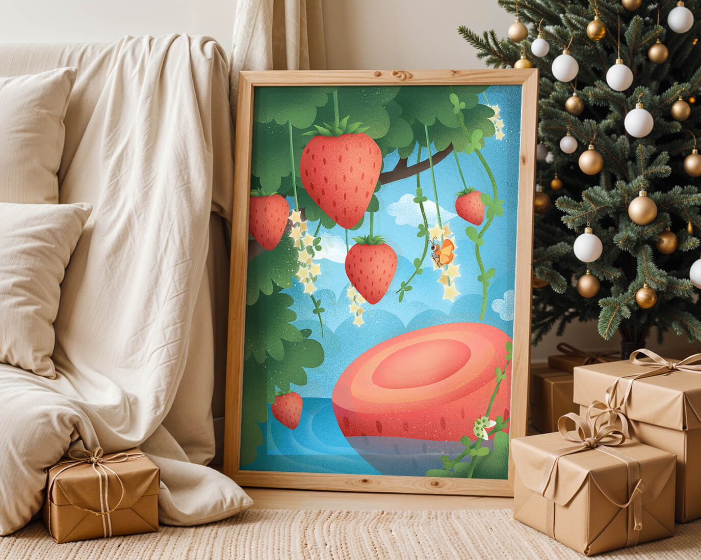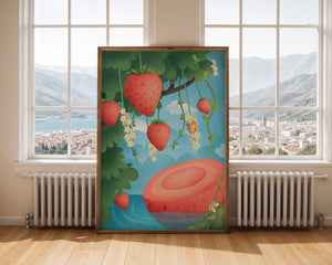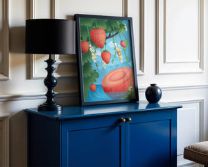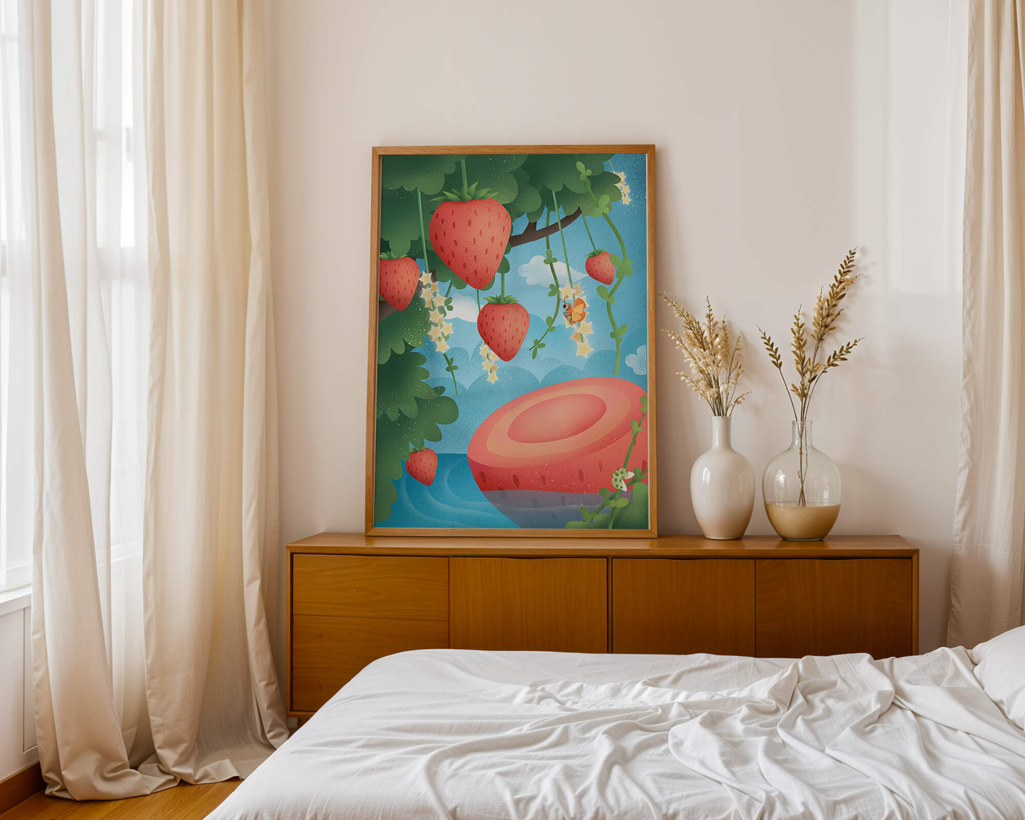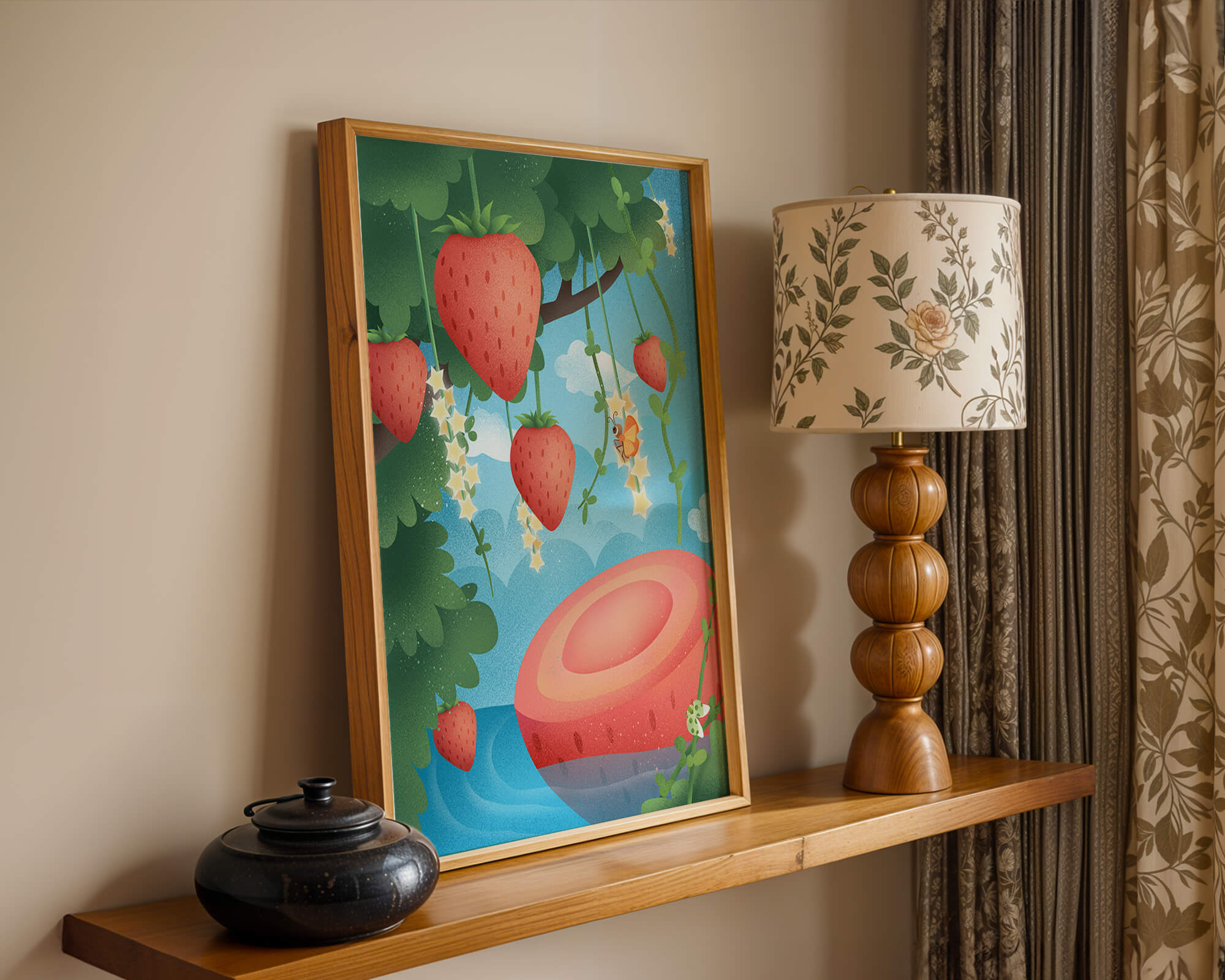 Hanging in this dreamlike environment are vivid red strawberries, showcased in a way that captures both realism and fantasy. The fruits dangle from verdant vines, their surfaces speckled with tiny seed dots, signifying freshness. A playful butterfly flits nearby, adding an element of life and animation to the image.The scene also includes the imaginative view of a large sliced strawberry, its interior revealed in vibrant hues, spiraling in layers down to the water beneath. This imaginative landscape, with its detailed textures and magical atmosphere, offers a perfect addition to children’s rooms, inspiring wonder and delight.