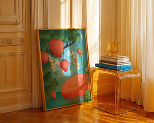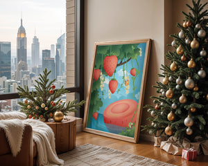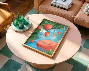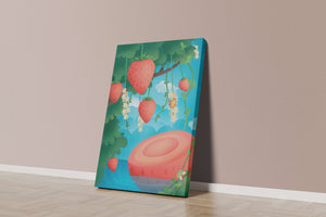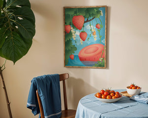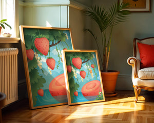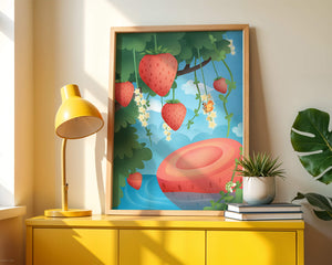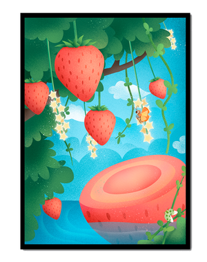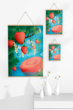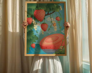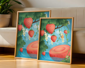 Hanging in this dreamlike environment are vivid red strawberries, showcased in a way that captures both realism and fantasy. The fruits dangle from verdant vines, their surfaces speckled with tiny seed dots, signifying freshness. A playful butterfly flits nearby, adding an element of life and animation to the image.The scene also includes the imaginative view of a large sliced strawberry, its interior revealed in vibrant hues, spiraling in layers down to the water beneath. This imaginative landscape, with its detailed textures and magical atmosphere, offers a perfect addition to children’s rooms, inspiring wonder and delight.
