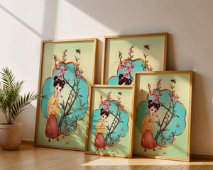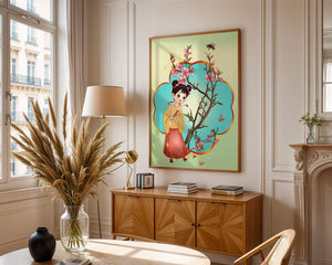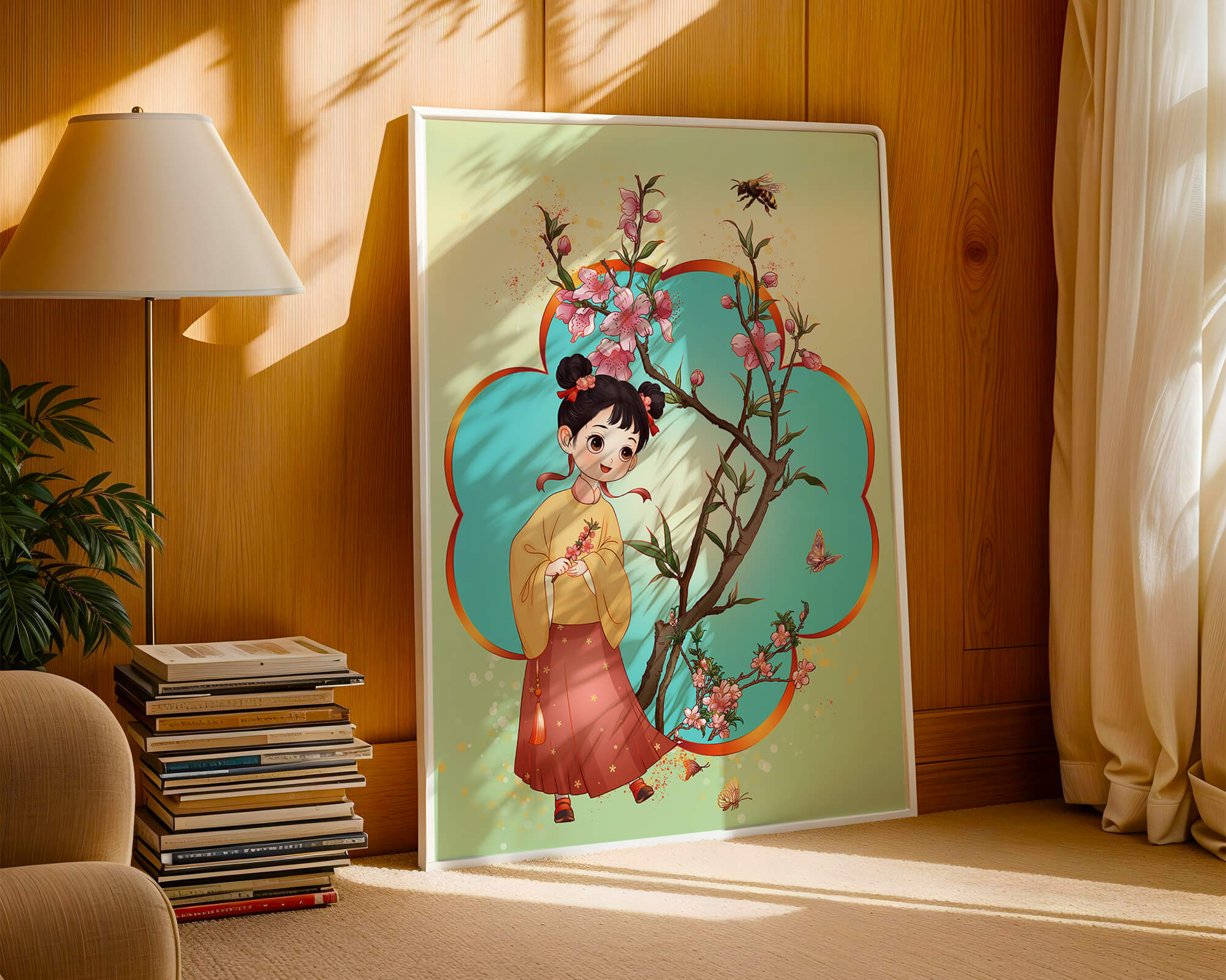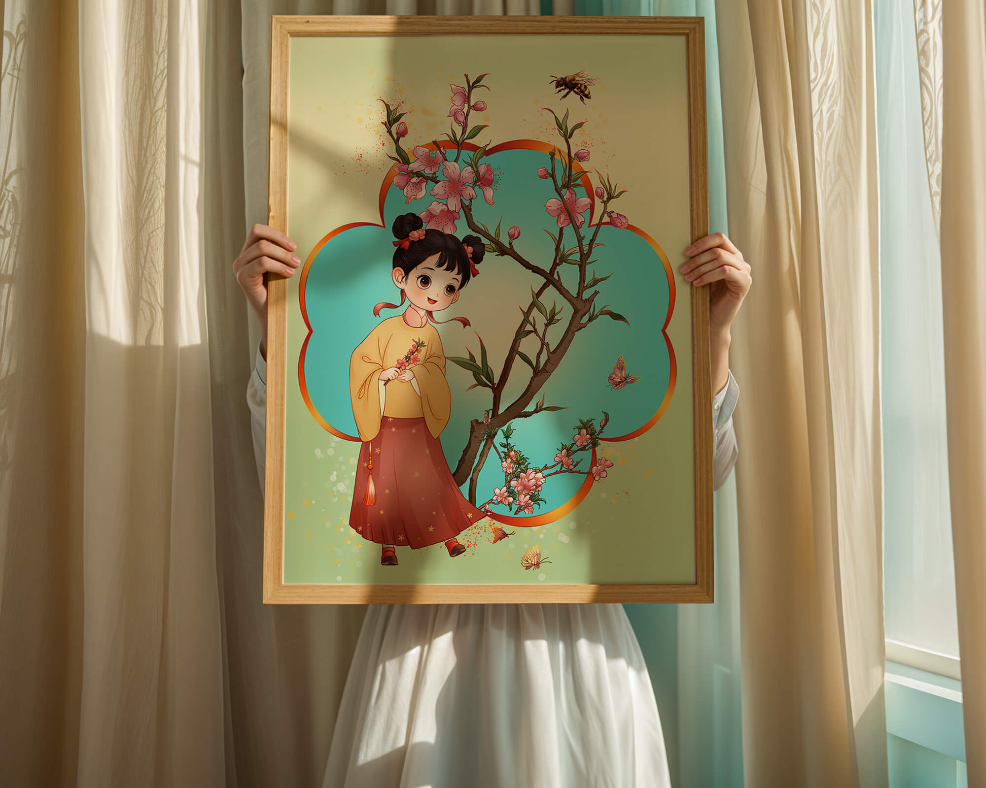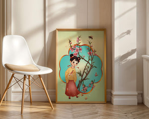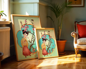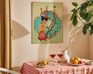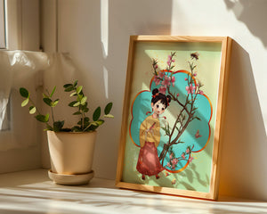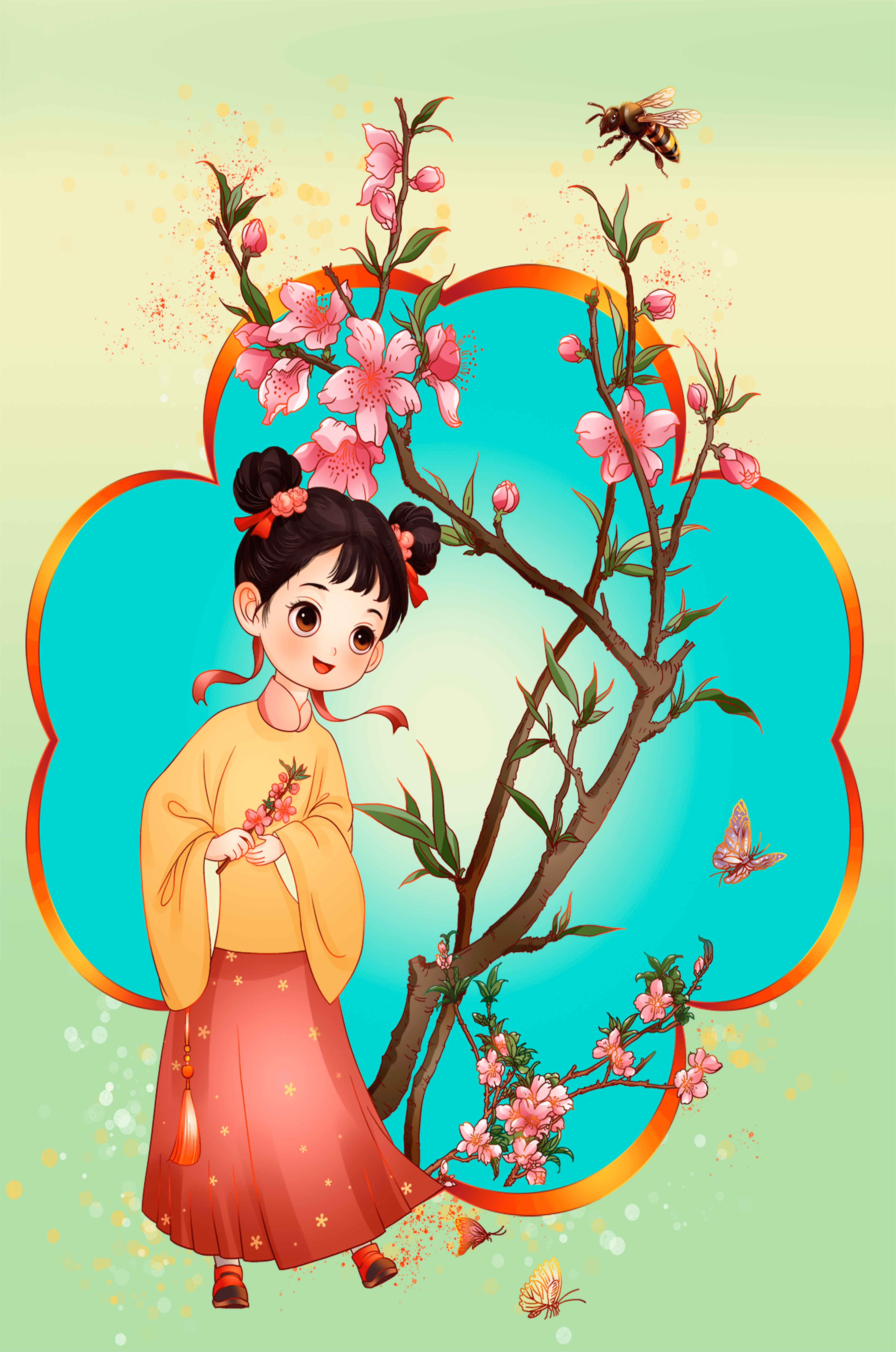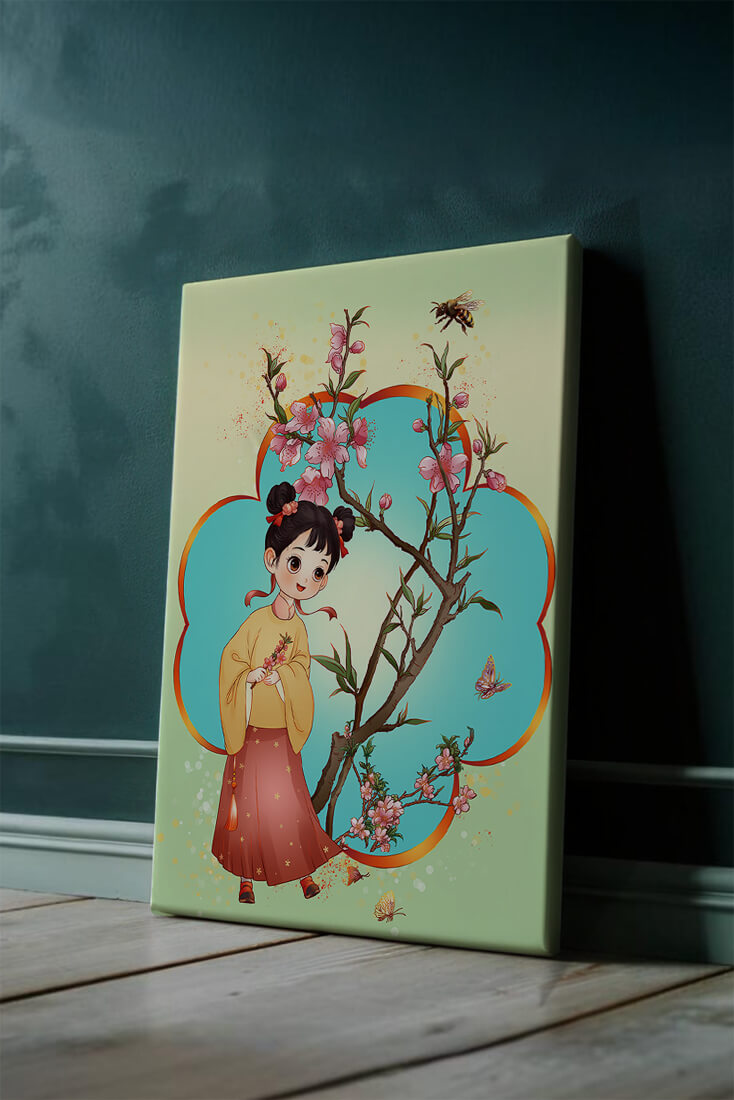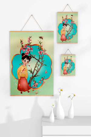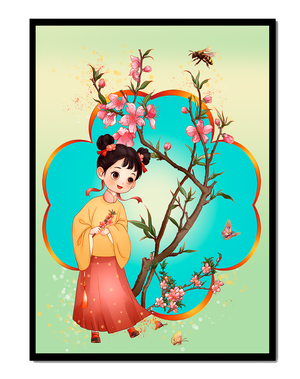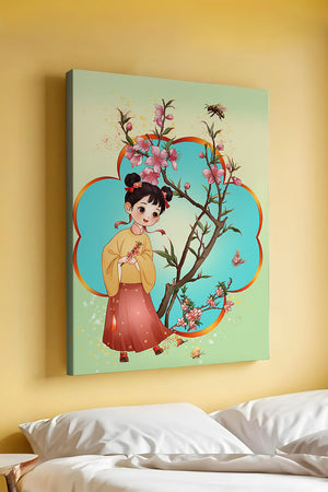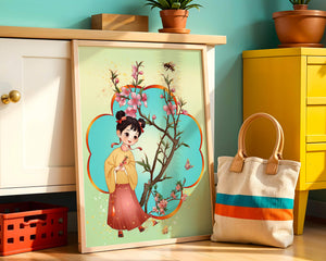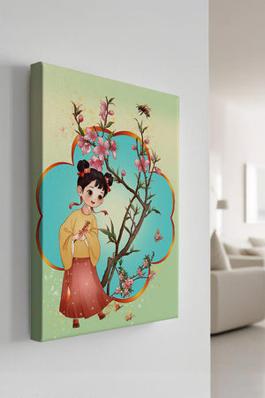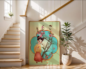 In this enchanting image, a young girl with a playful hairstyle stands poised with a sprig of cherry blossoms in her hands. Her traditional outfit, with a flowing yellow blouse and long red skirt adorned with delicate stars, adds to the whimsical feel. The blossoms are in full bloom, creating a lush floral frame around her.The background is alive with color, transitioning from a soft green to a bright blue, punctuated by fluttering butterflies and a curious bee. These natural elements bring a sense of movement and life, enhancing the overall charm and liveliness of the artwork. This illustration would be an ideal addition to a childs room, offering a delightful touch of nature and imagination.| Type |