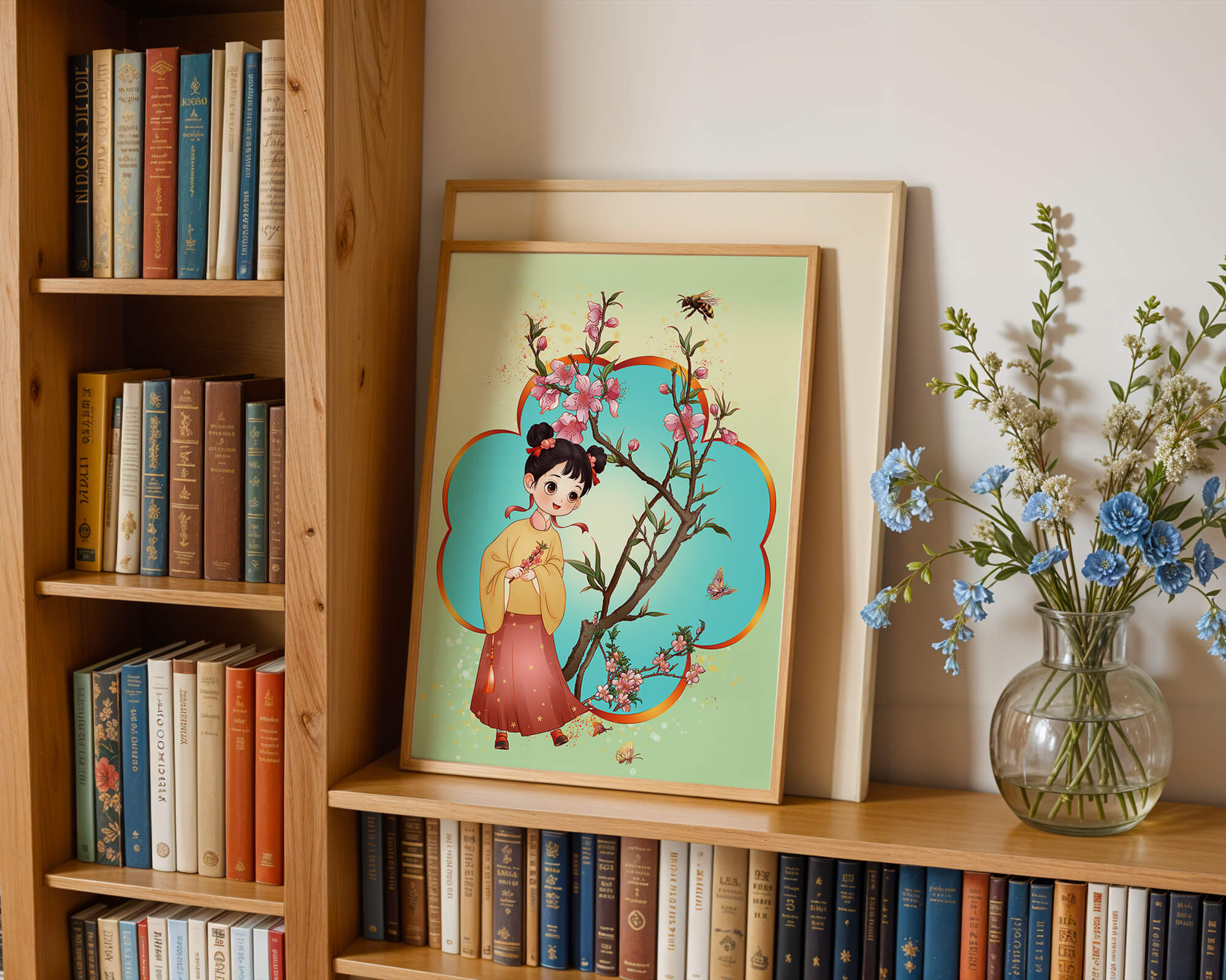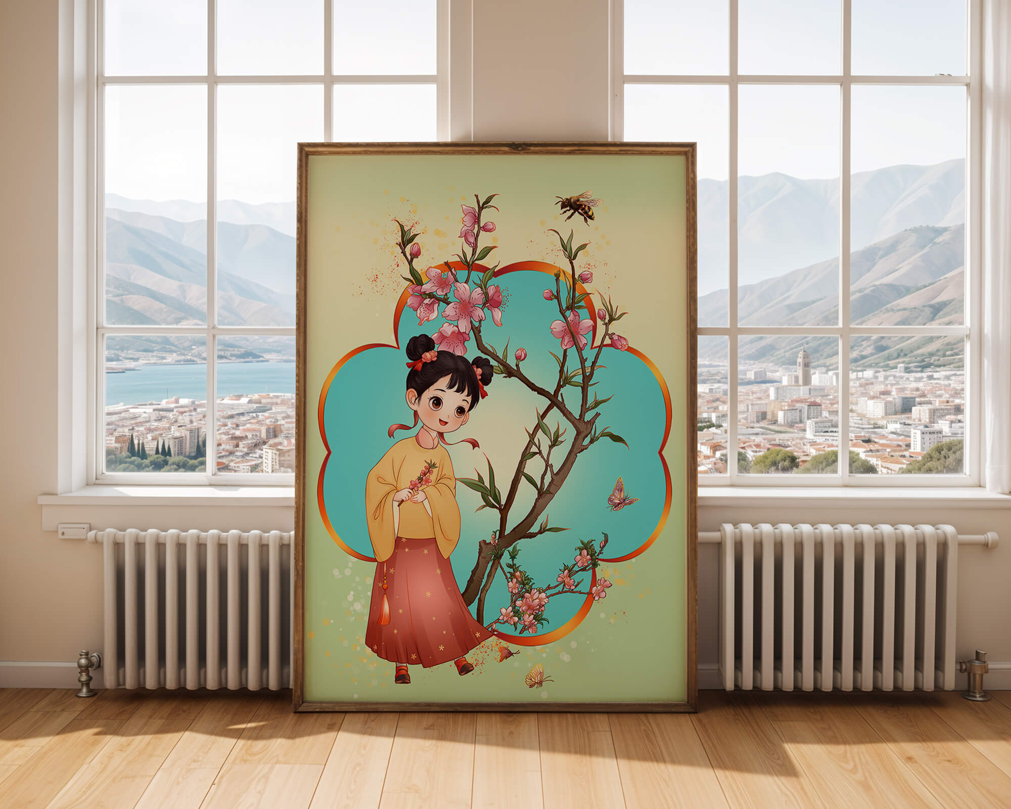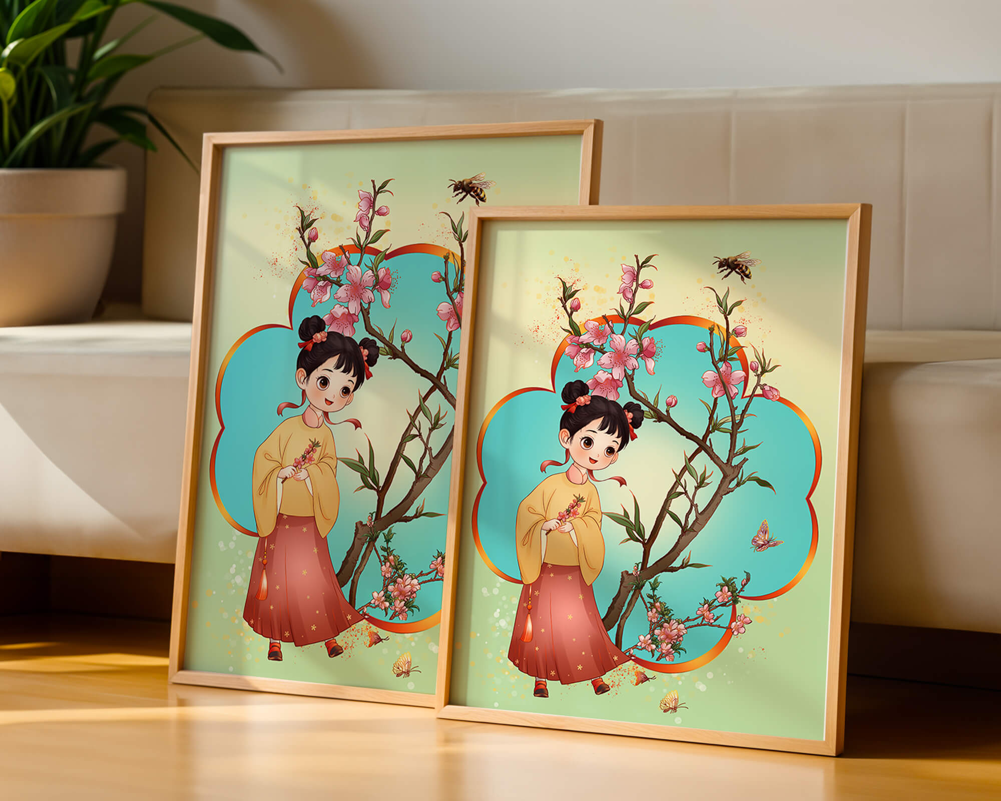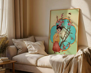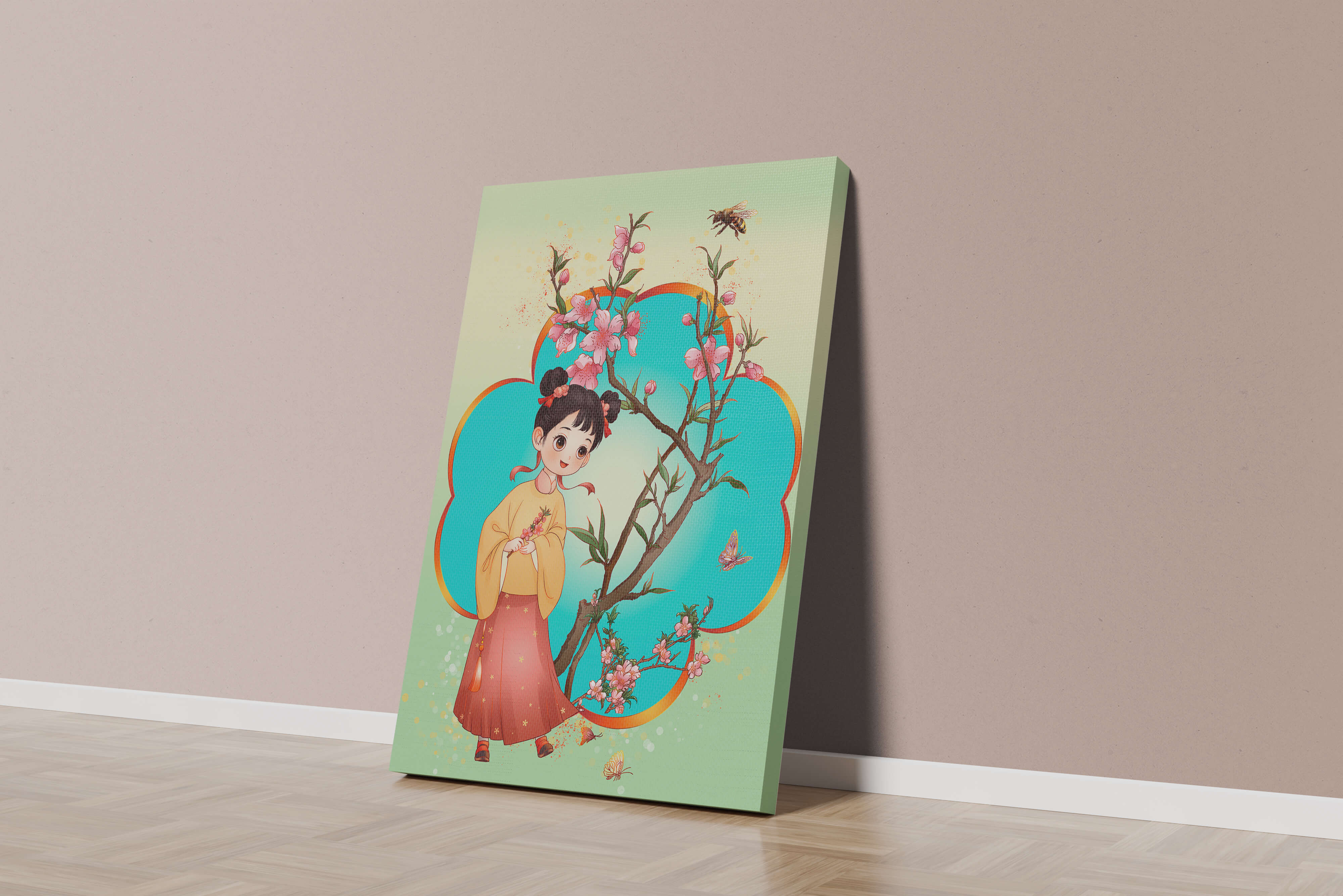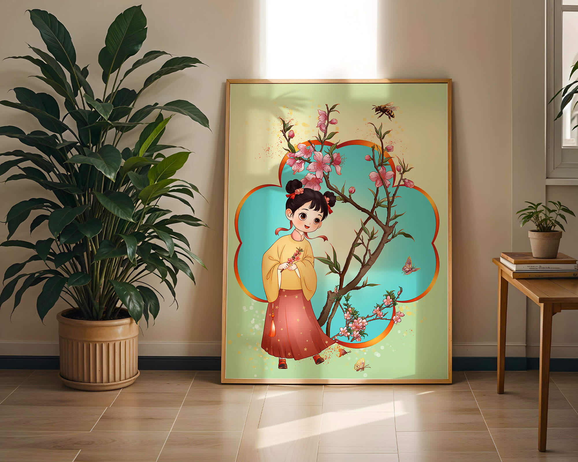 In this enchanting image, a young girl with a playful hairstyle stands poised with a sprig of cherry blossoms in her hands. Her traditional outfit, with a flowing yellow blouse and long red skirt adorned with delicate stars, adds to the whimsical feel. The blossoms are in full bloom, creating a lush floral frame around her.The background is alive with color, transitioning from a soft green to a bright blue, punctuated by fluttering butterflies and a curious bee. These natural elements bring a sense of movement and life, enhancing the overall charm and liveliness of the artwork. This illustration would be an ideal addition to a childs room, offering a delightful touch of nature and imagination.| Type |