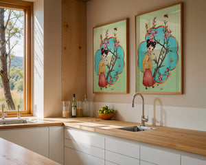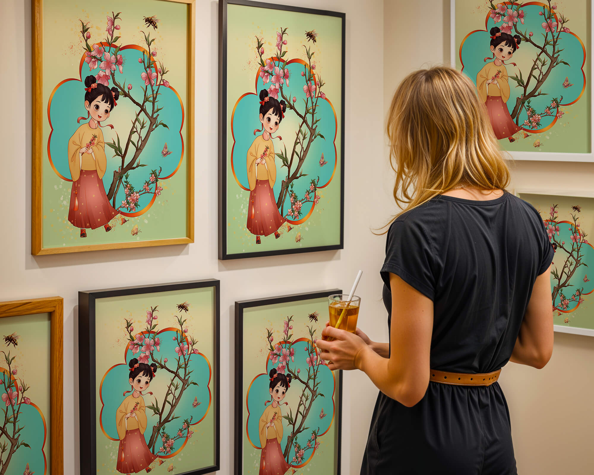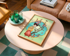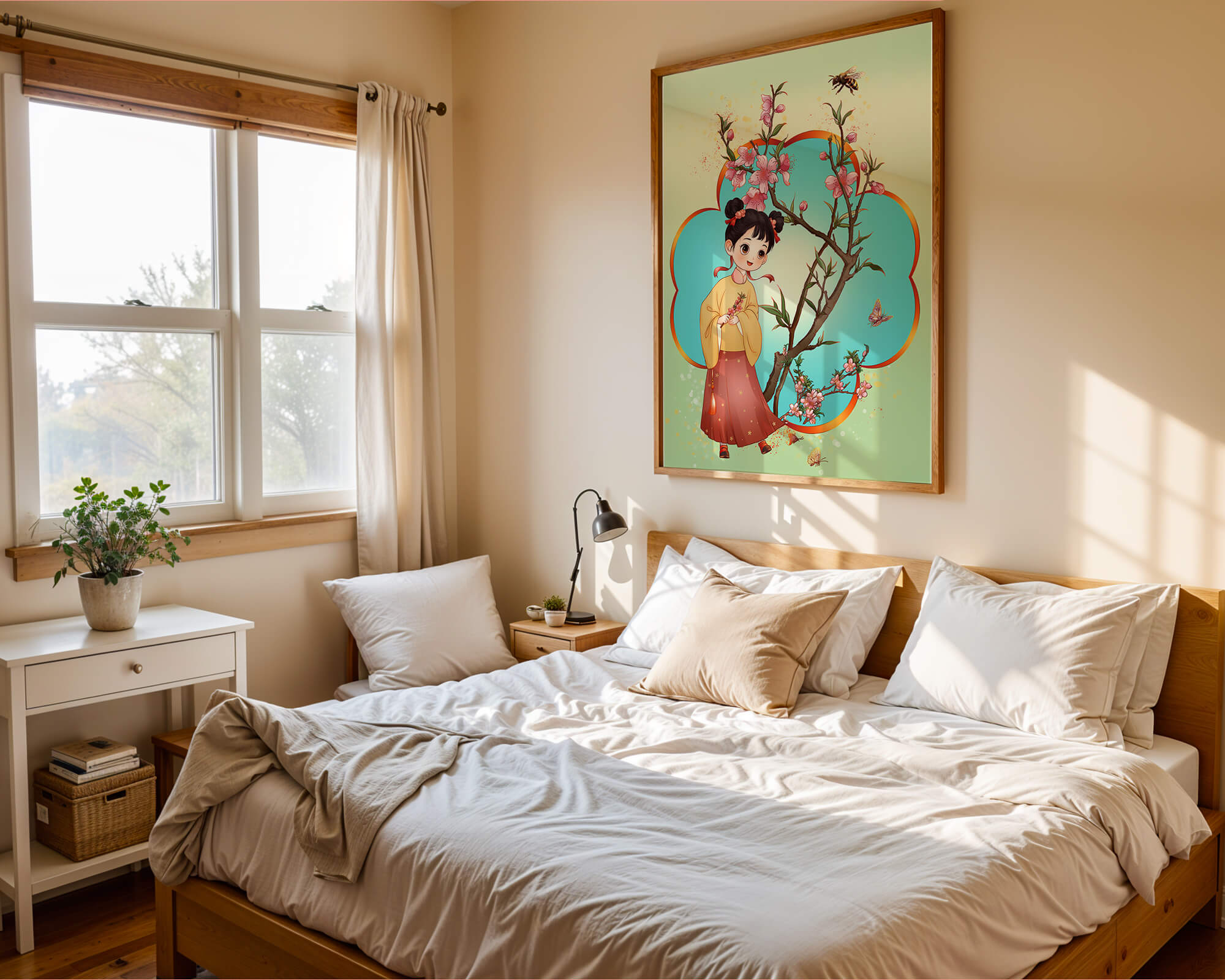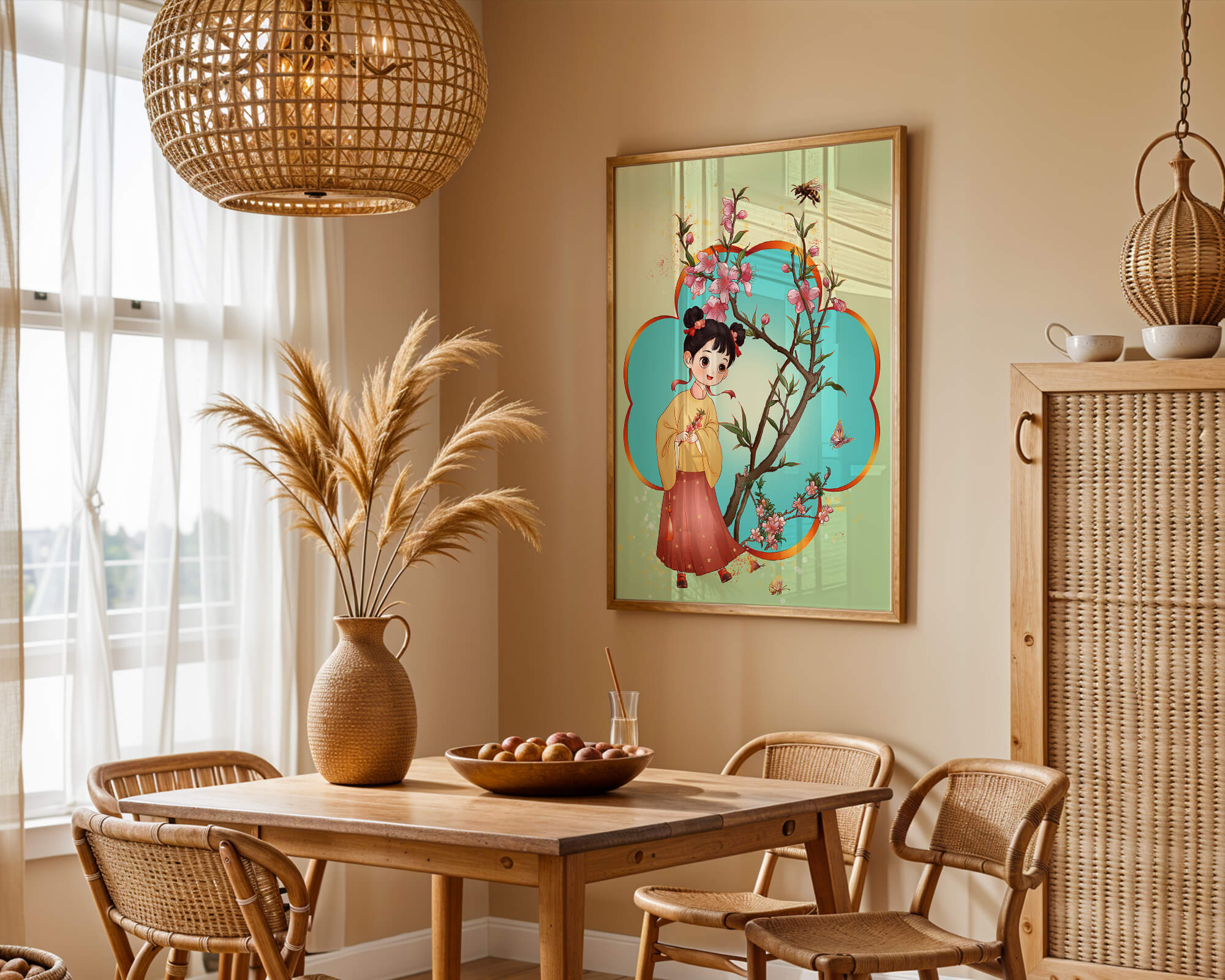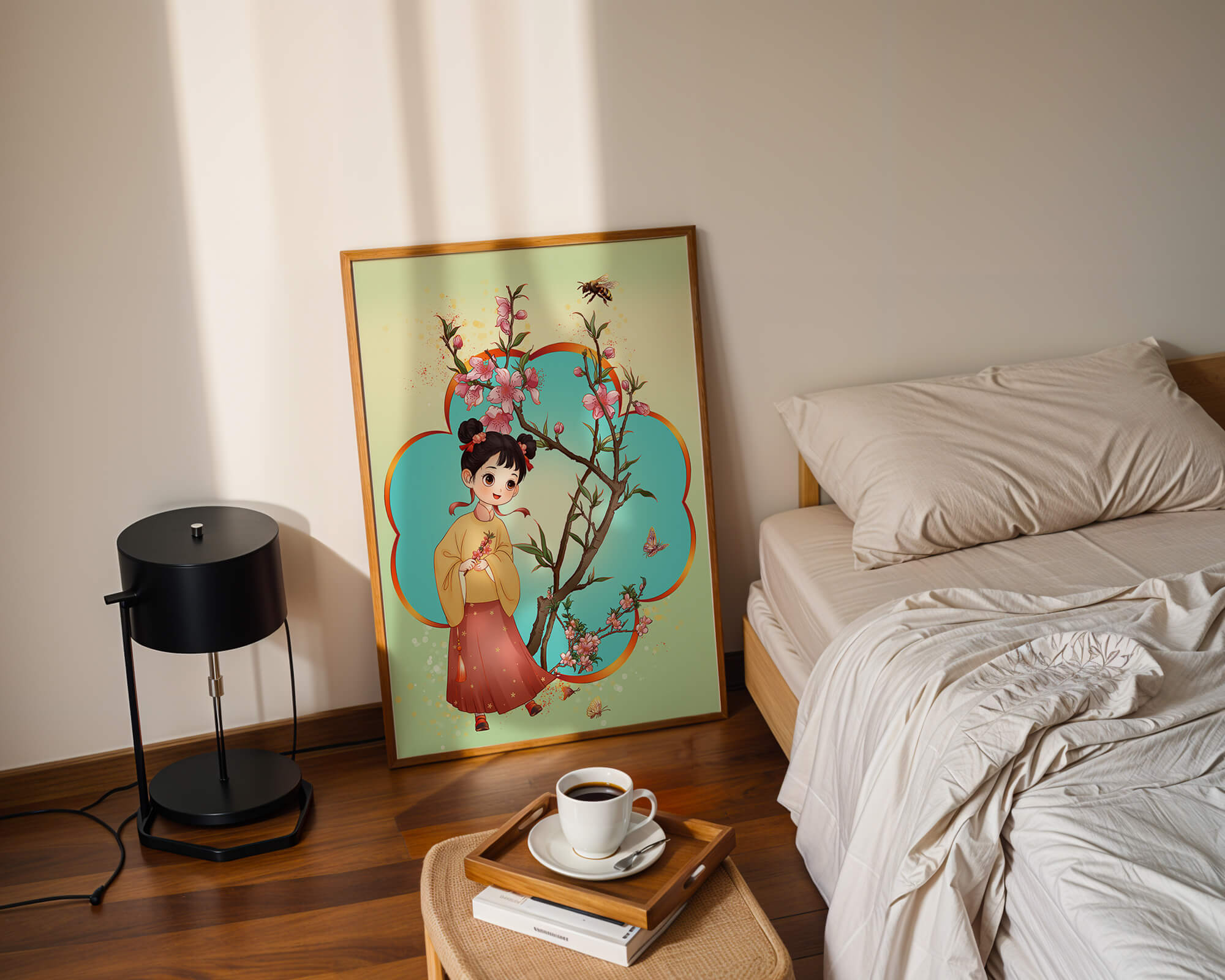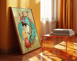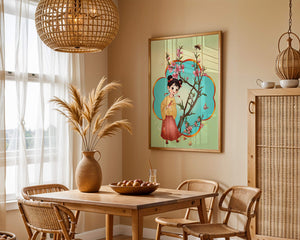 In this enchanting image, a young girl with a playful hairstyle stands poised with a sprig of cherry blossoms in her hands. Her traditional outfit, with a flowing yellow blouse and long red skirt adorned with delicate stars, adds to the whimsical feel. The blossoms are in full bloom, creating a lush floral frame around her.The background is alive with color, transitioning from a soft green to a bright blue, punctuated by fluttering butterflies and a curious bee. These natural elements bring a sense of movement and life, enhancing the overall charm and liveliness of the artwork. This illustration would be an ideal addition to a childs room, offering a delightful touch of nature and imagination.| Type |