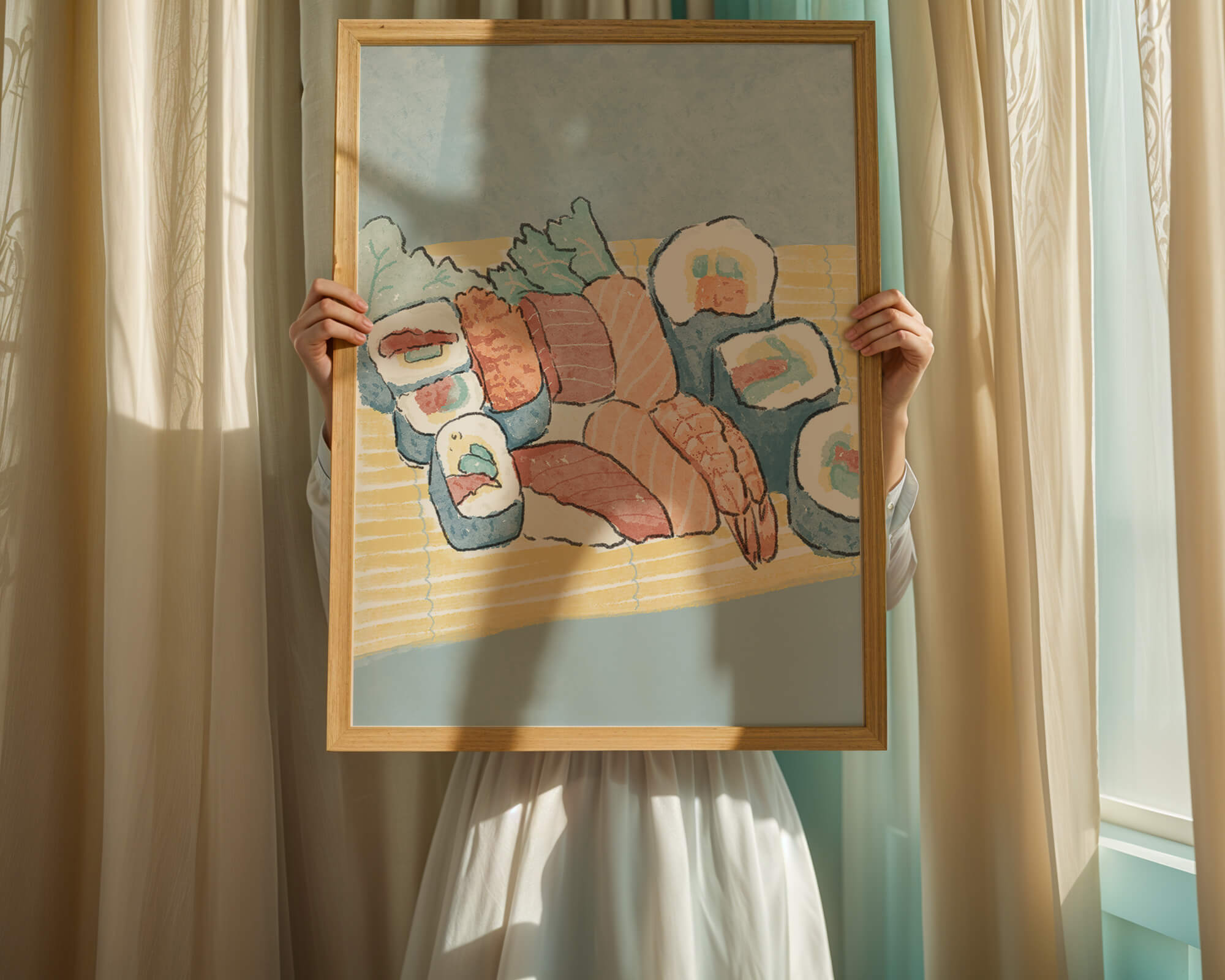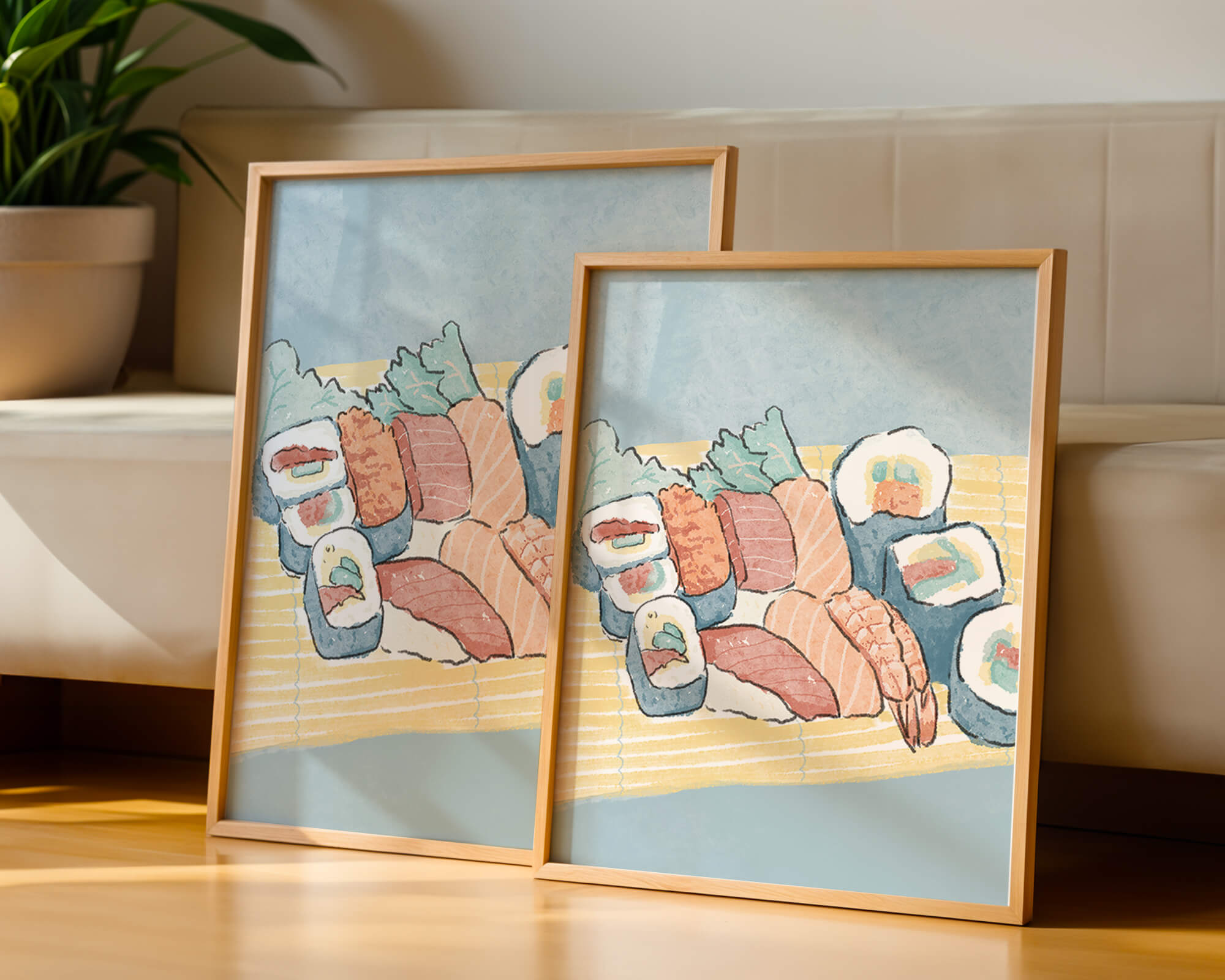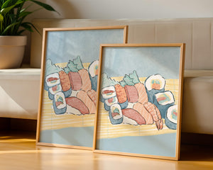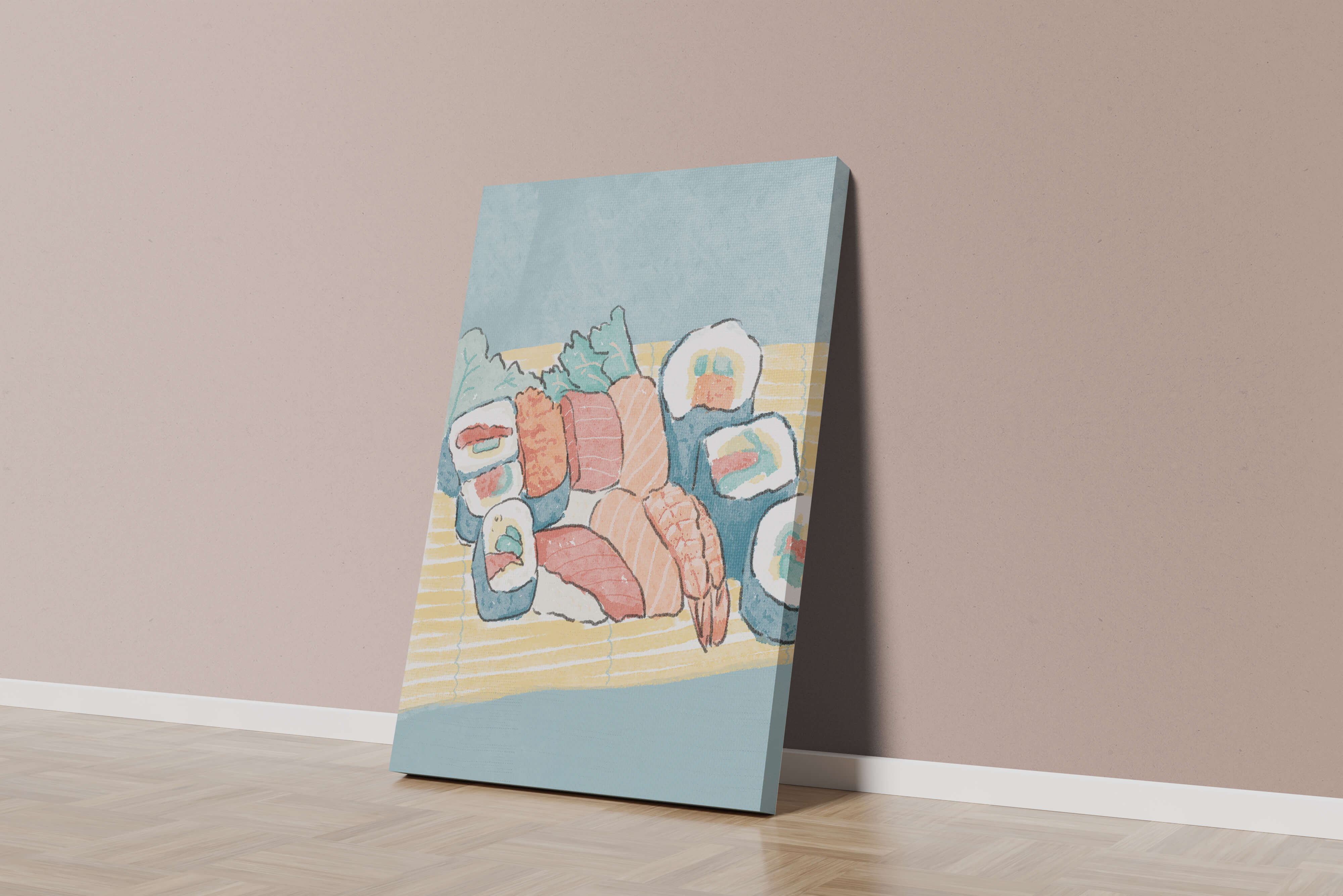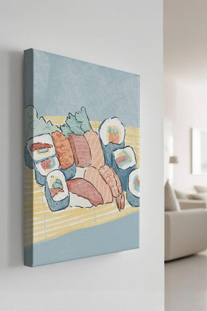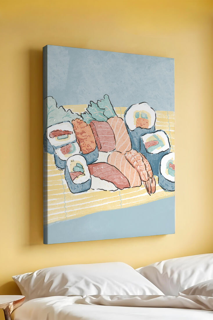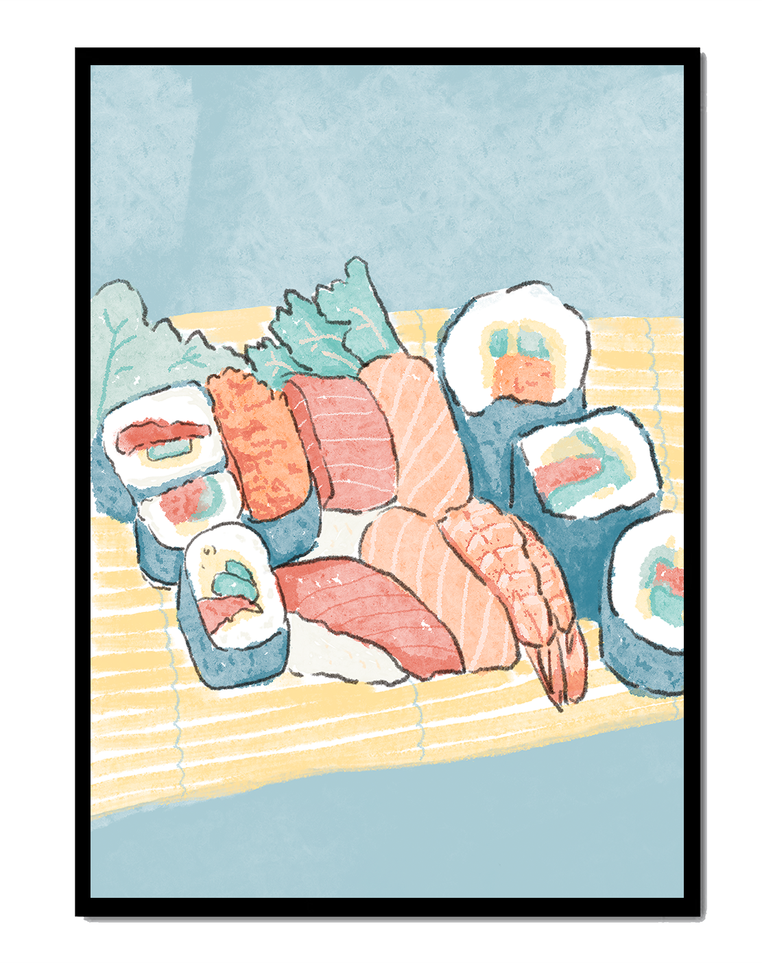 This artistic depiction showcases a harmonious collection of sushi, emphasizing the rich textures and vibrant colors of fresh seafood. The arrangement consists of an assortment of sushi rolls, each highlighting key ingredients like salmon, shrimp, and fresh greens. The delicate interplay of colors and textures creates a visually appealing experience, inviting viewers to appreciate both the culinary artistry and the aesthetic charm.The background features a soft, muted tone, allowing the sushi to take center stage. The bamboo mat underlines the cultural authenticity of the presentation, offering a glimpse into the traditional Japanese dining setting. This illustration not only stimulates the senses but also inspires a deeper appreciation of sushi as an art form, where culinary expertise and visual aesthetics converge.