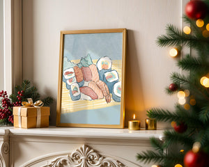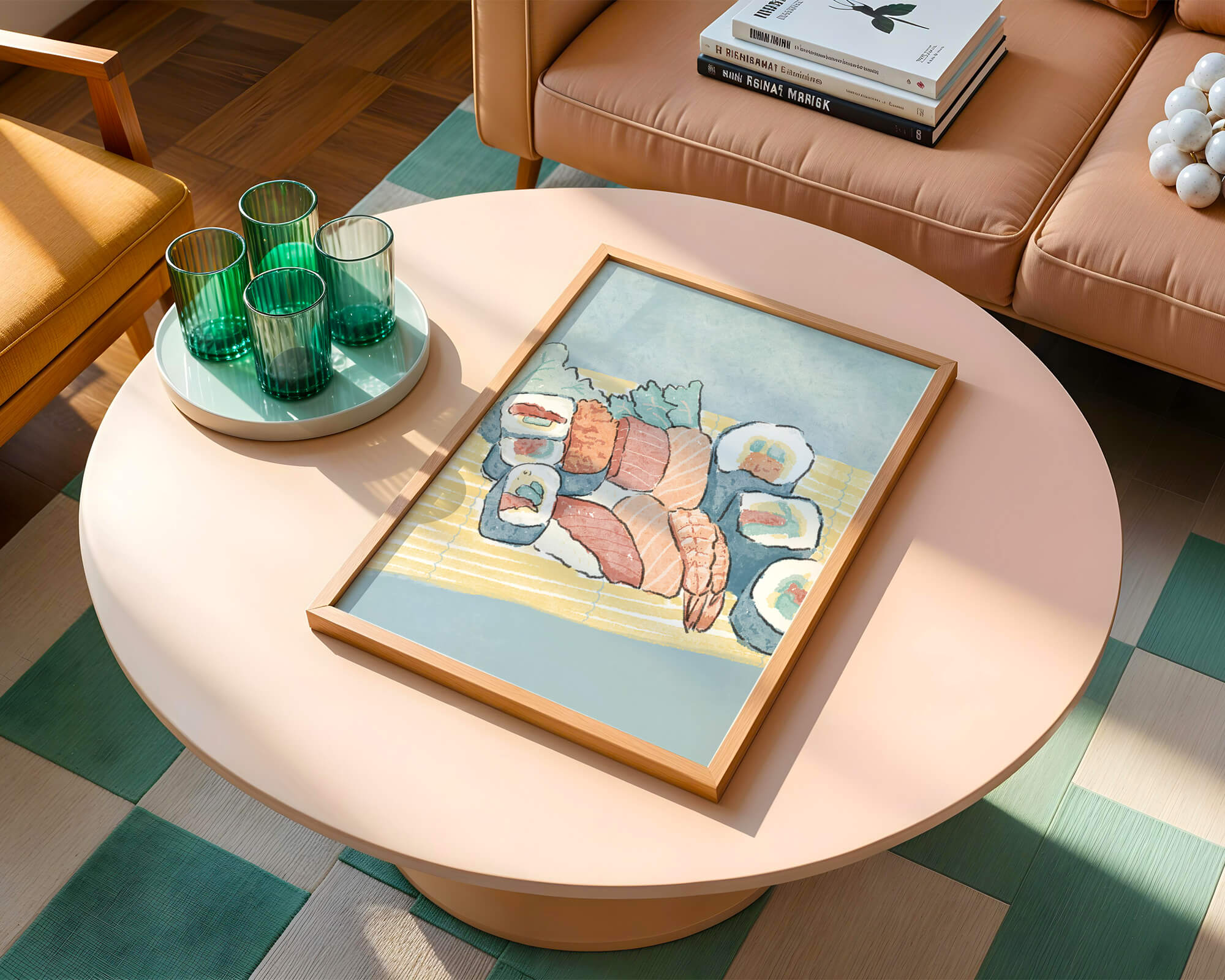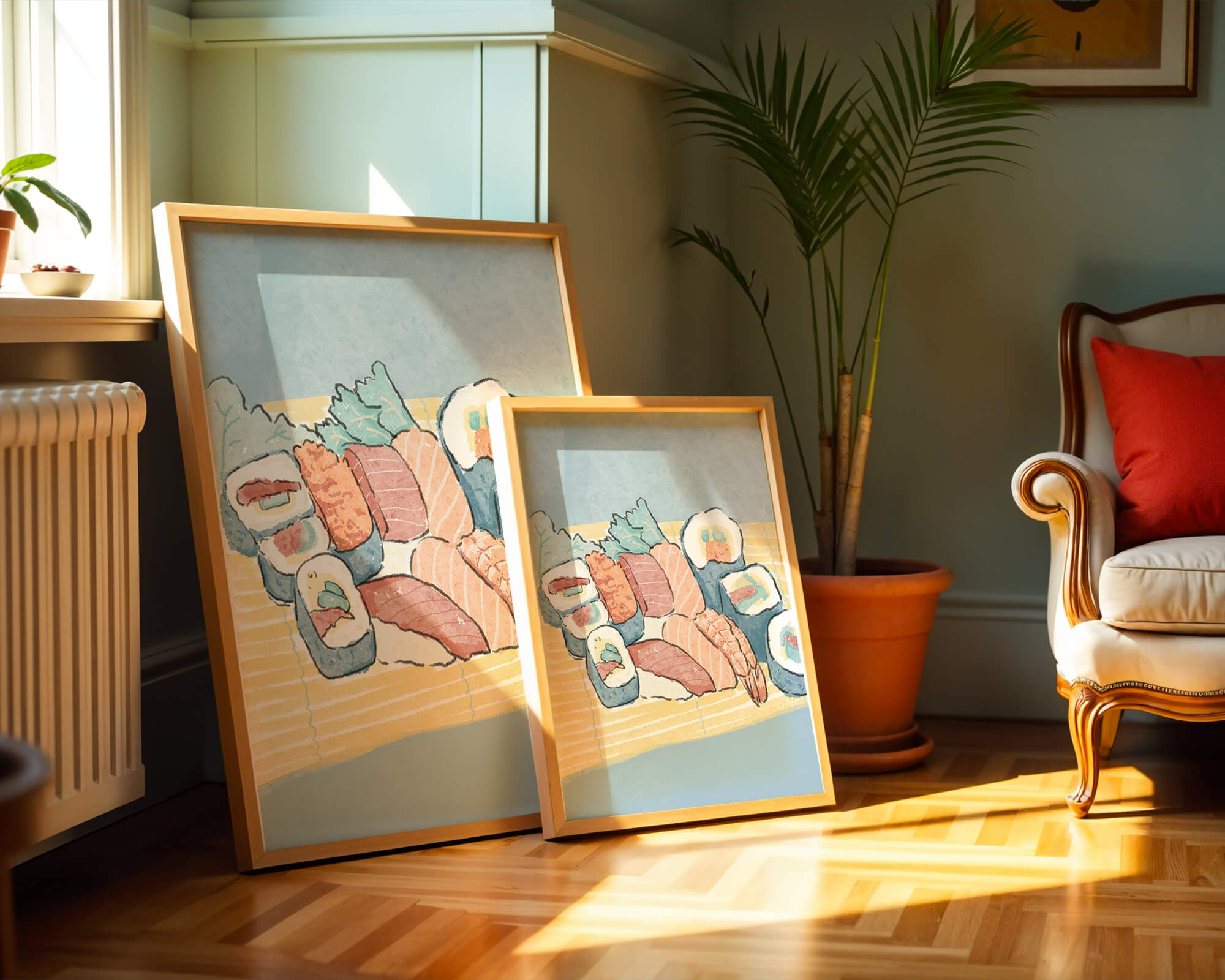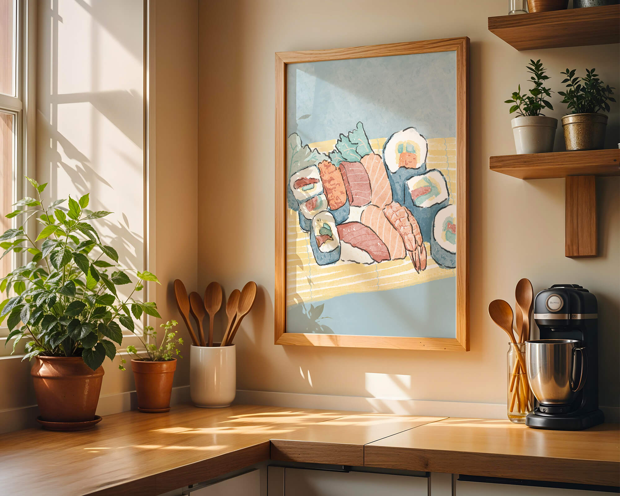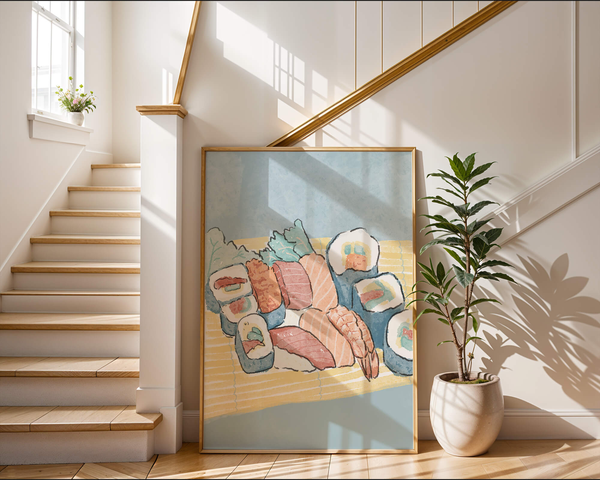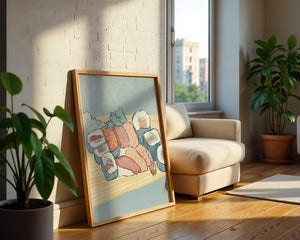 This artistic depiction showcases a harmonious collection of sushi, emphasizing the rich textures and vibrant colors of fresh seafood. The arrangement consists of an assortment of sushi rolls, each highlighting key ingredients like salmon, shrimp, and fresh greens. The delicate interplay of colors and textures creates a visually appealing experience, inviting viewers to appreciate both the culinary artistry and the aesthetic charm.The background features a soft, muted tone, allowing the sushi to take center stage. The bamboo mat underlines the cultural authenticity of the presentation, offering a glimpse into the traditional Japanese dining setting. This illustration not only stimulates the senses but also inspires a deeper appreciation of sushi as an art form, where culinary expertise and visual aesthetics converge.