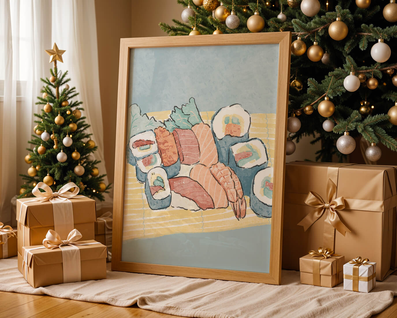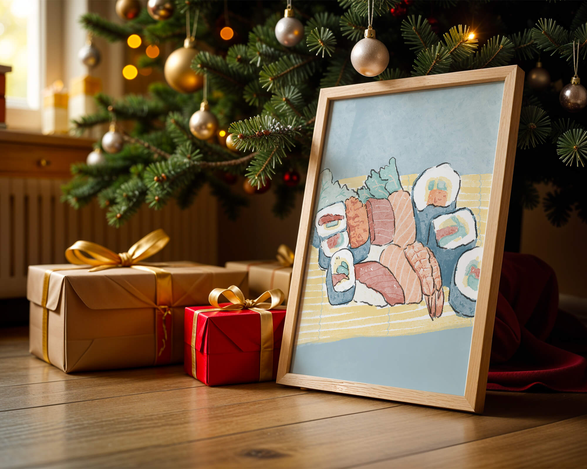 Illustration of assorted sushi rolls with shrimp and salmon on a bamboo mat