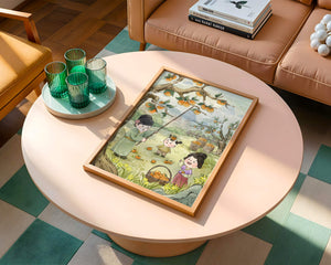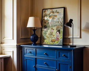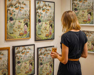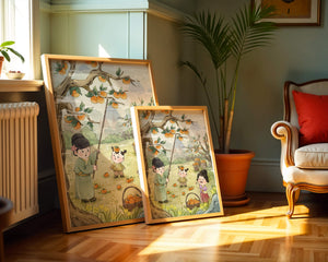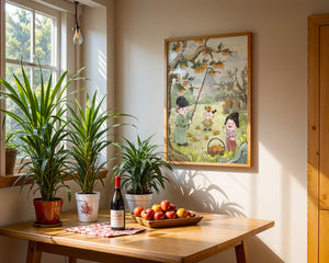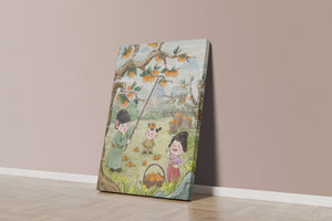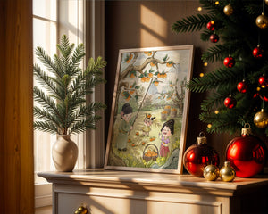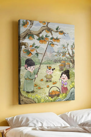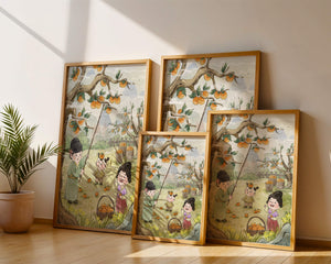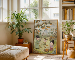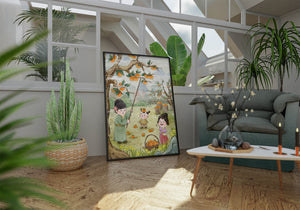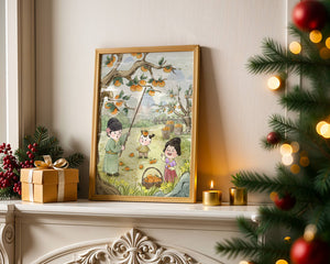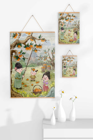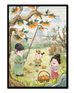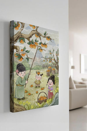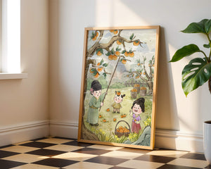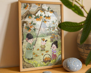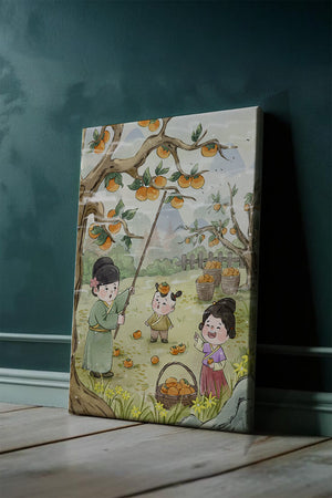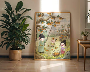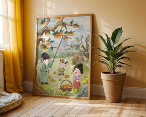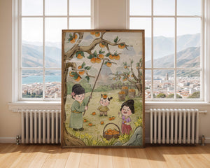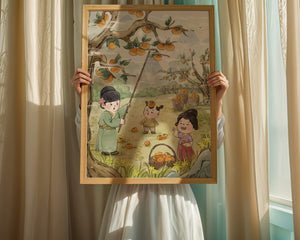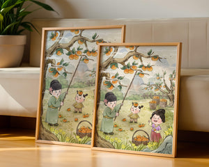 In this enchanting illustration, children are actively involved in picking ripe persimmons from trees. Their expressions are filled with joy and playfulness, capturing a nostalgic and heartwarming moment. The scene is set outdoors, with lush greenery and a backdrop of rolling hills, adding to the serene ambiance.The traditional attire of the children blends seamlessly with the natural setting, enhancing the authenticity of the scene. Baskets full of persimmons sit nearby, ready to be taken home. This illustration beautifully portrays a fusion of cultural heritage and the simplicity of rural life, making it a captivating piece.| Type |