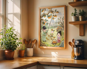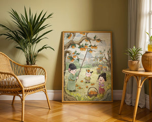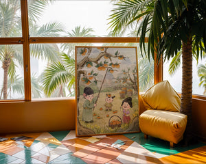 The image depicts a delightful scene where children engage in the joyful activity of harvesting persimmons. The setting is traditional, with children dressed in traditional attire, surrounded by nature.