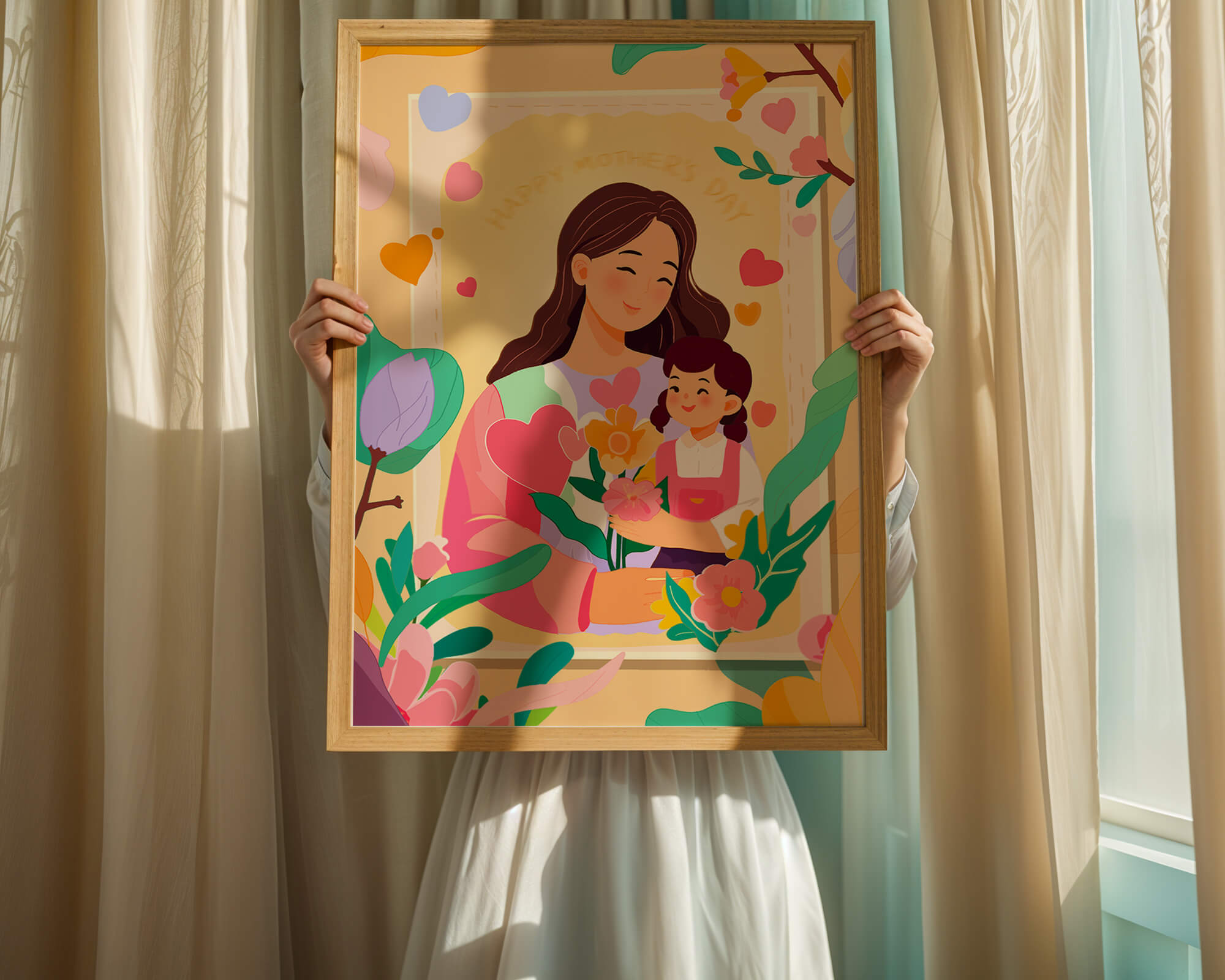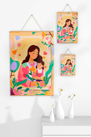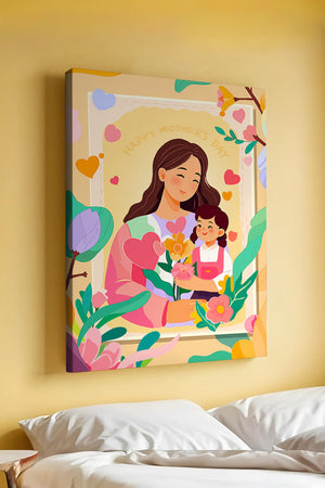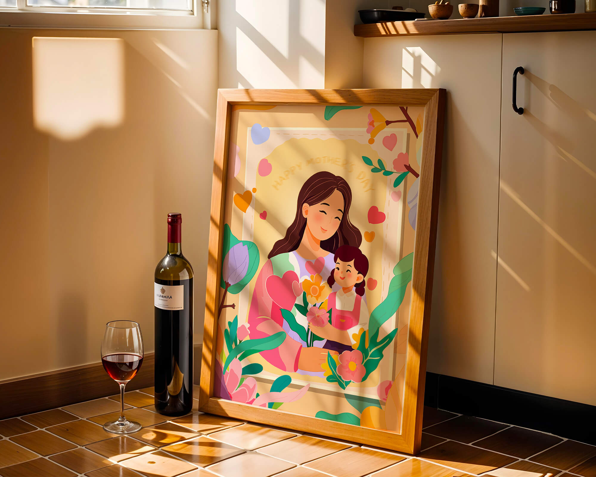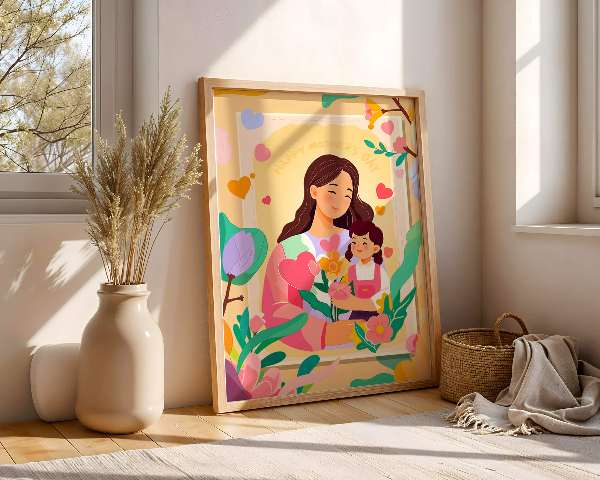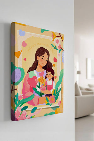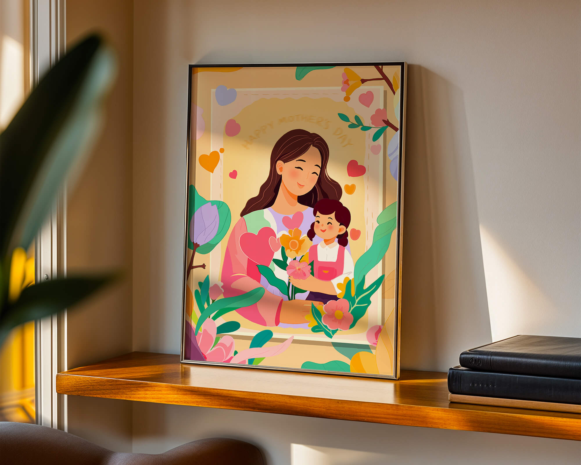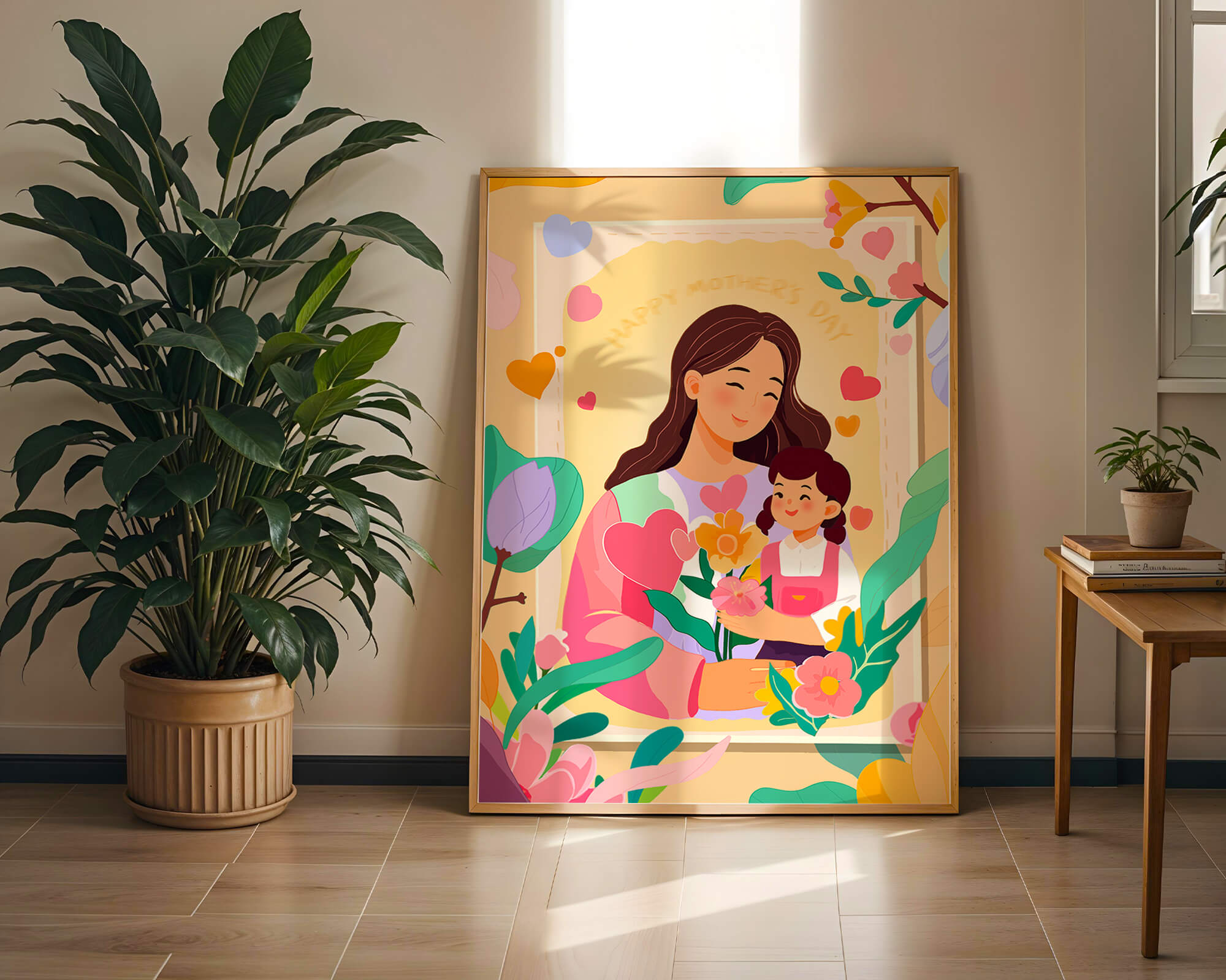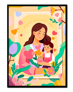 In the heart of the image, a loving mother holds her daughter close as they both envelop a bouquet of fresh flowers. Their expressions convey pure happiness and mutual affection. The artwork is accentuated by a vivid array of hearts, blossoms, and lush leaves, symbolizing the nurturing environment the mother provides.The background further enhances the festive mood with pastel tones and the gentle phrase "Happy Mother"s Day" arching elegantly above them. This illustration not only makes for an ideal gift but also serves as a perfect piece for home decor, bringing joy into spaces such as the living room or childrens room.