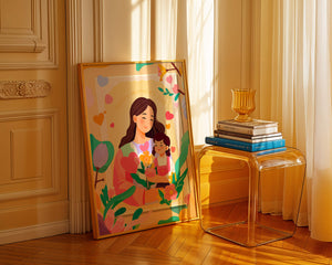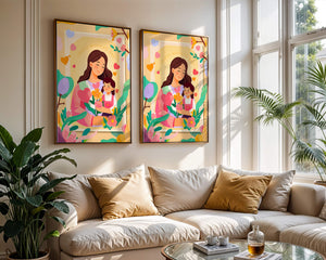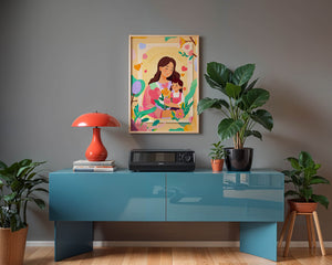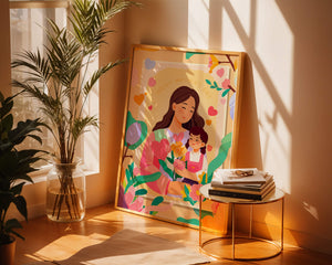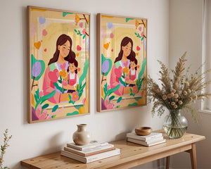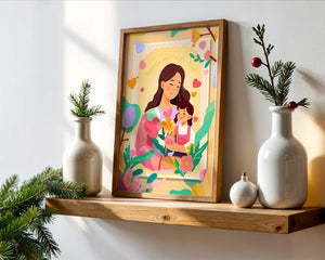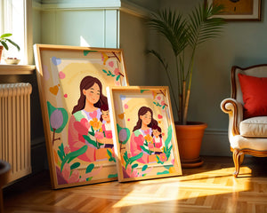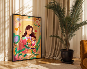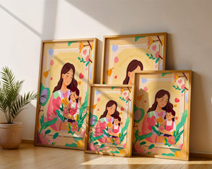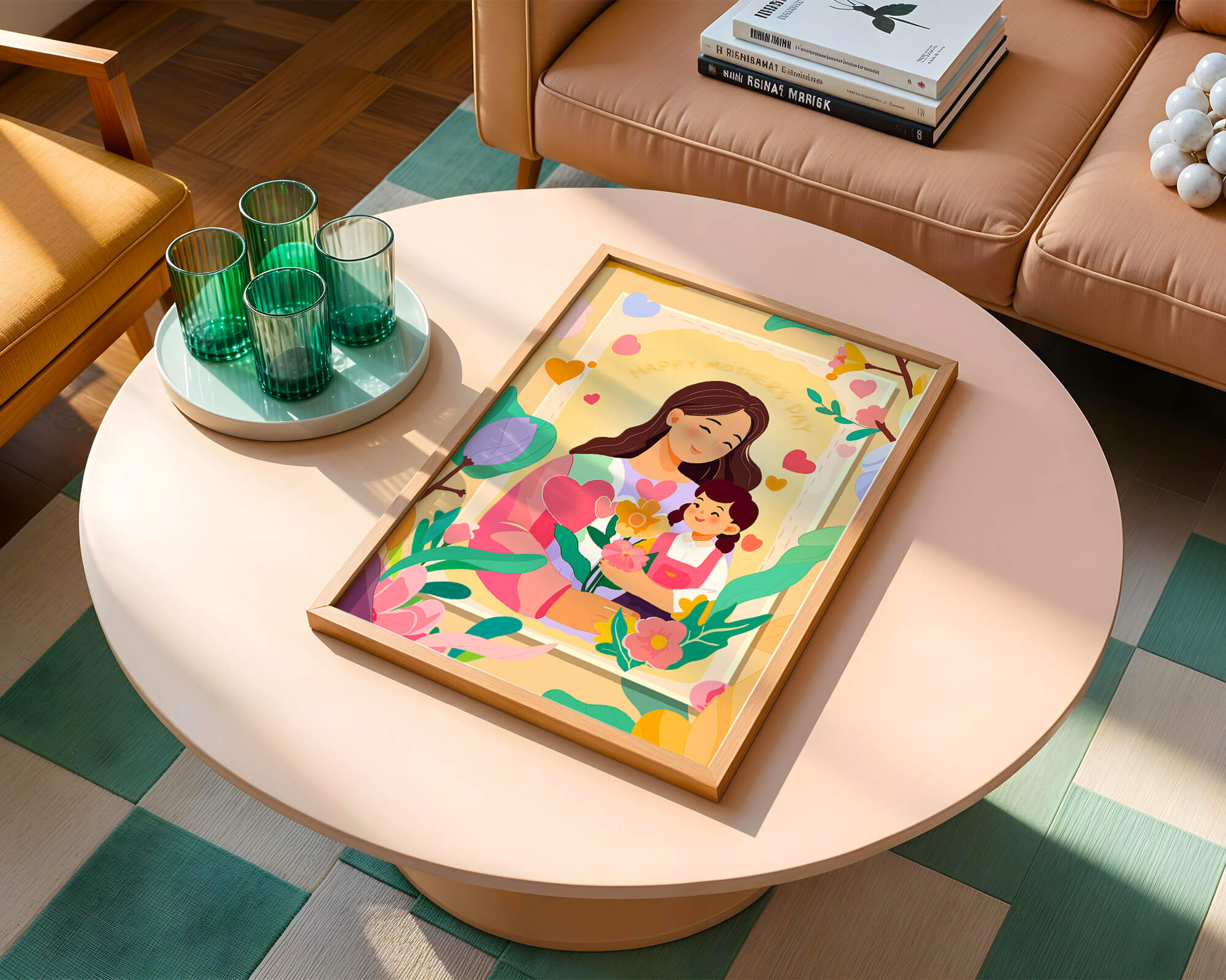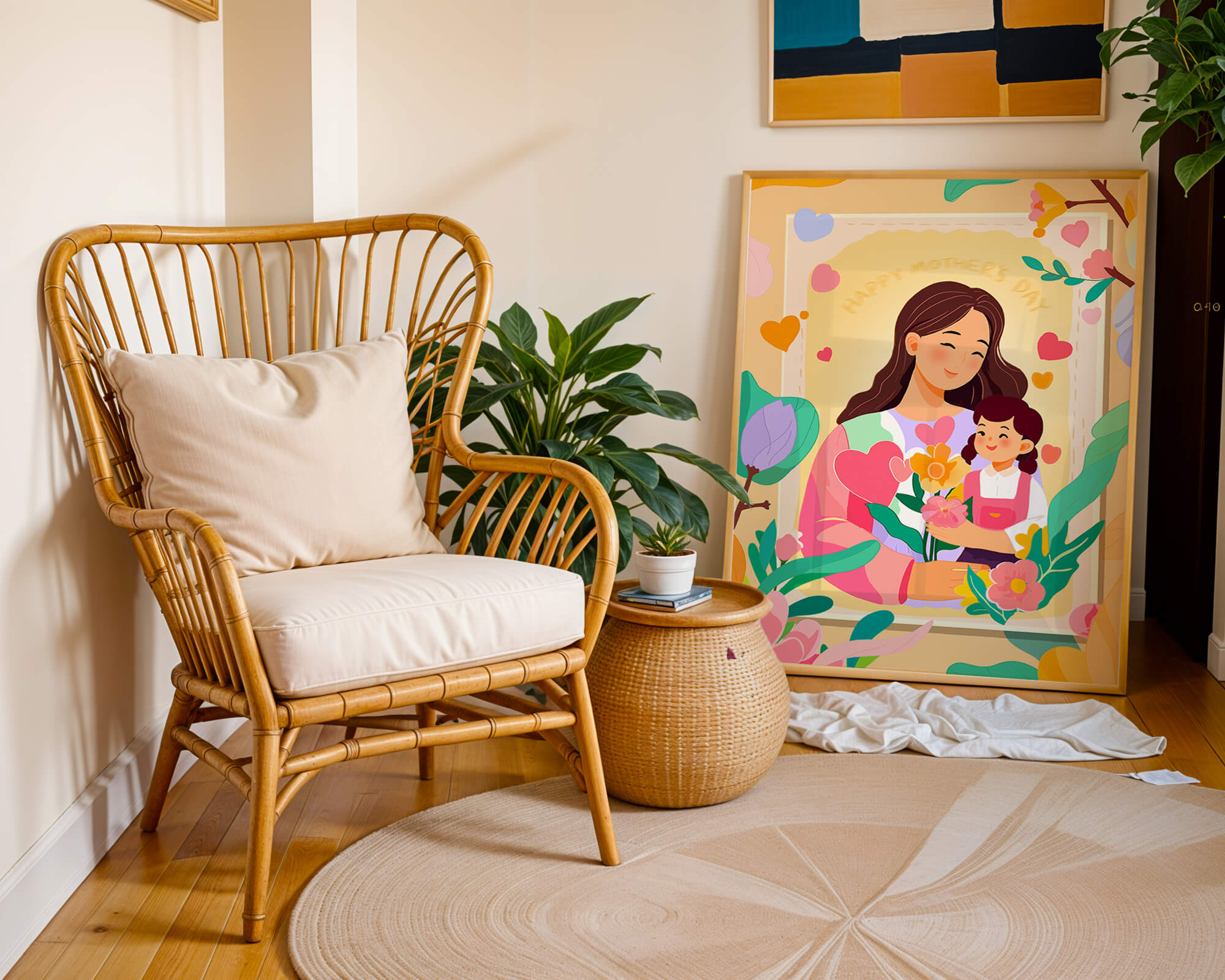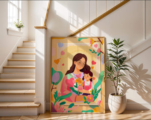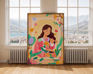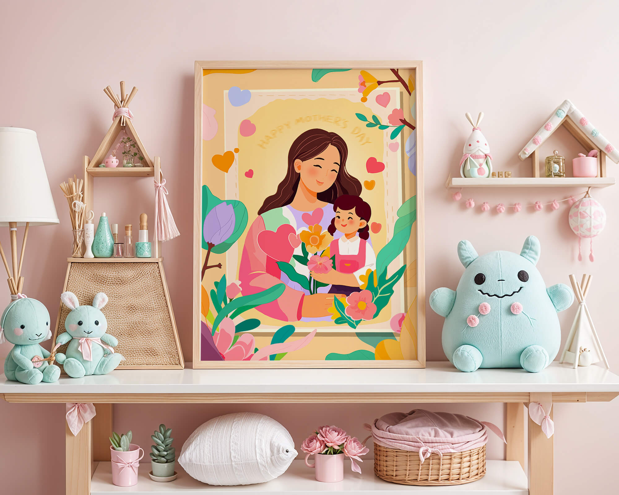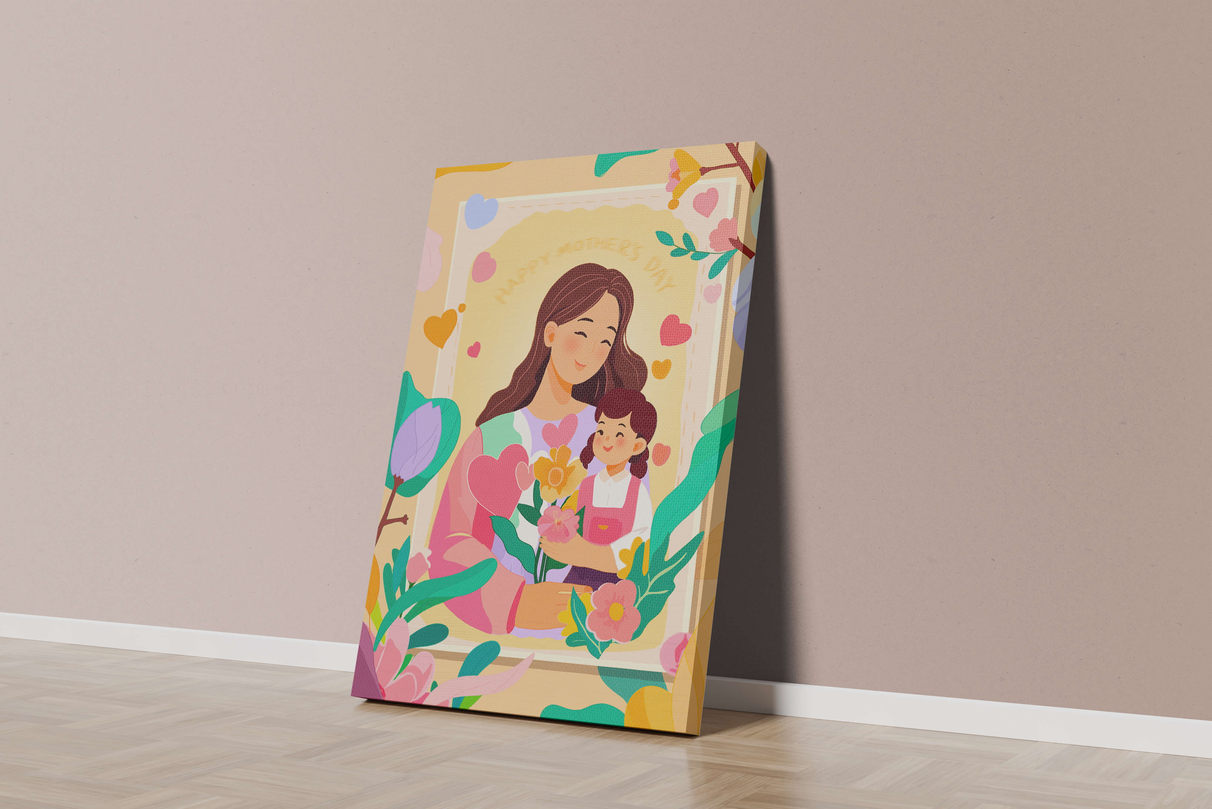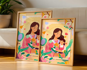 In the heart of the image, a loving mother holds her daughter close as they both envelop a bouquet of fresh flowers. Their expressions convey pure happiness and mutual affection. The artwork is accentuated by a vivid array of hearts, blossoms, and lush leaves, symbolizing the nurturing environment the mother provides.The background further enhances the festive mood with pastel tones and the gentle phrase "Happy Mother"s Day" arching elegantly above them. This illustration not only makes for an ideal gift but also serves as a perfect piece for home decor, bringing joy into spaces such as the living room or childrens room.