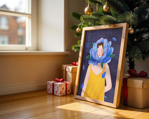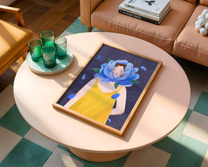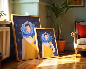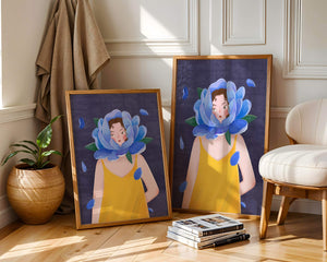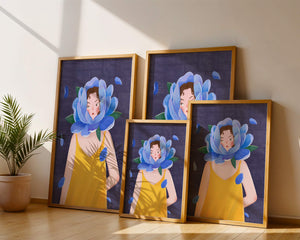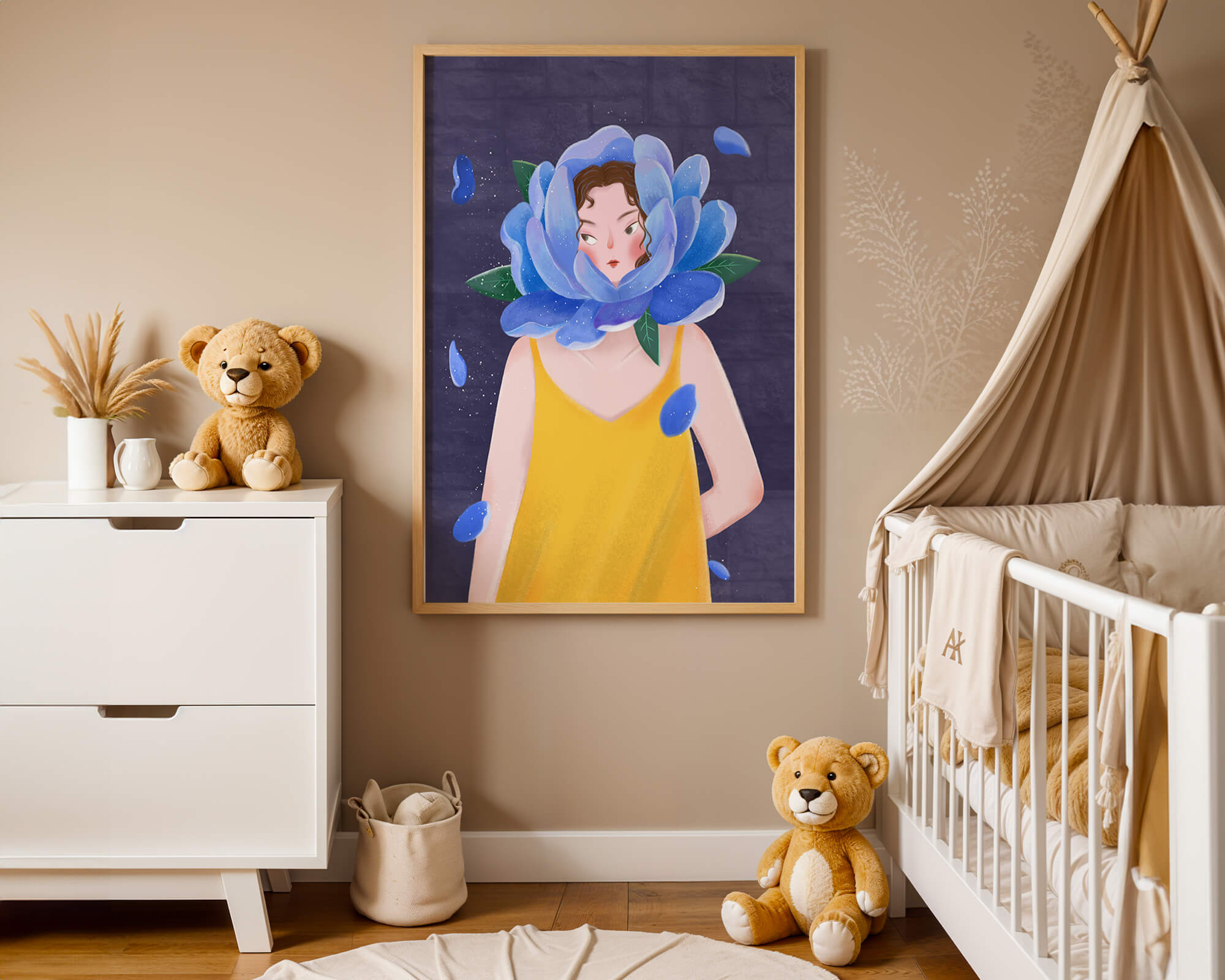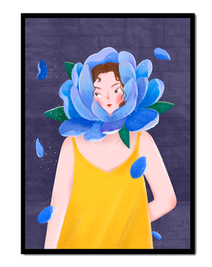 The artwork presents a unique fusion of human and floral elements, suggesting a harmonious connection between nature and personal expression. The blue petals, meticulously detailed with hints of sparkle and texture, give a sense of depth and dynamism to the piece. Her poised expression, emerging from within the flower, adds an intriguing and whimsical touch.The choice of colors and the blending of human and floral motifs make this illustration perfect for modern spaces seeking a splash of creativity and vibrant storytelling. Its an ideal piece for those who appreciate innovative art that challenges traditional boundaries and celebrates imaginative possibilities.