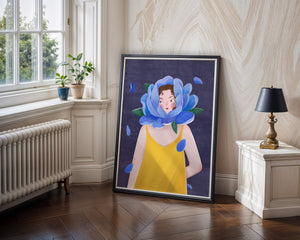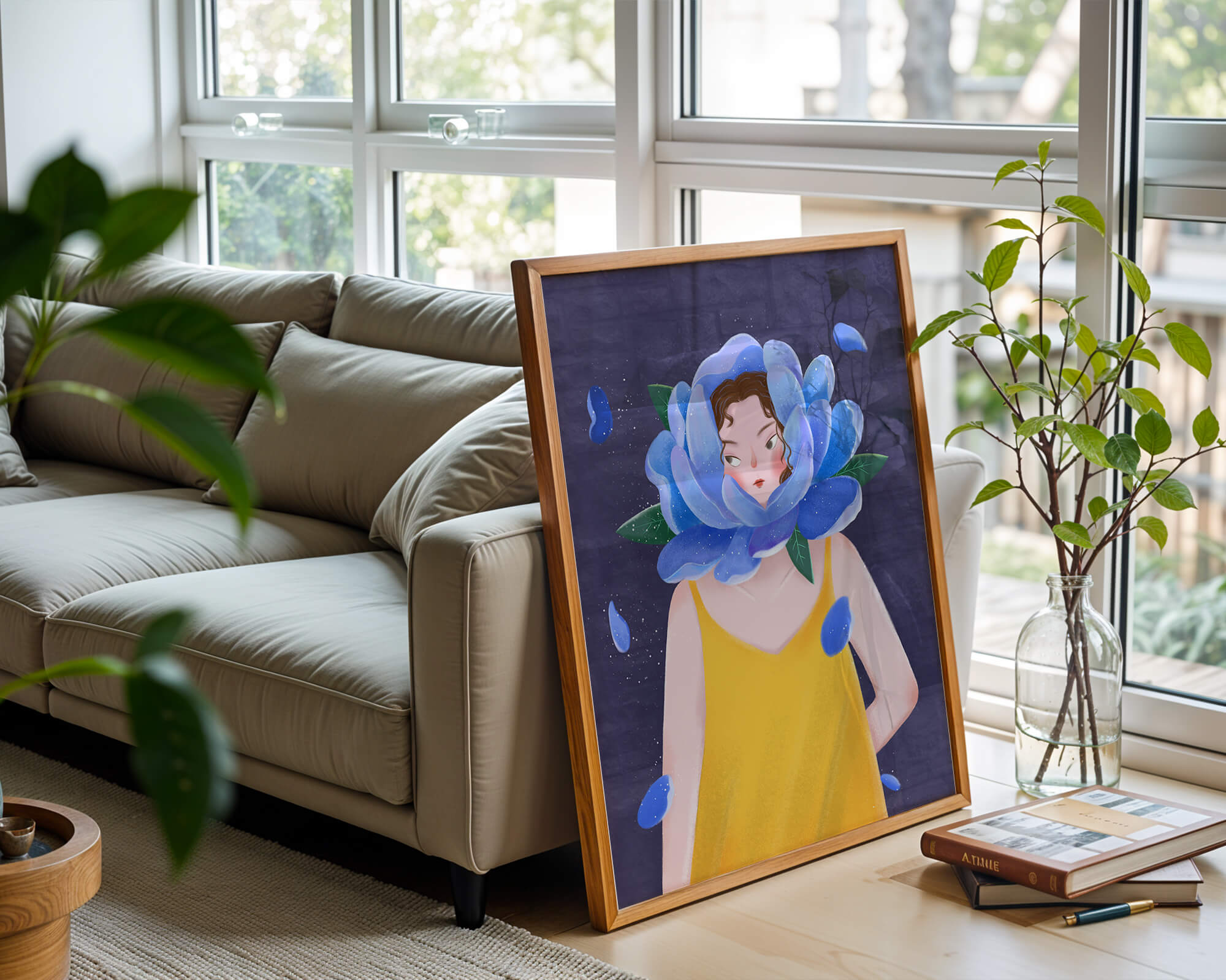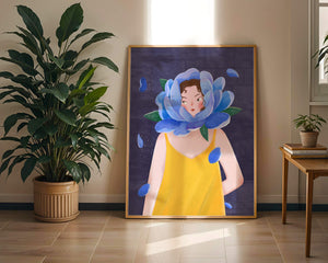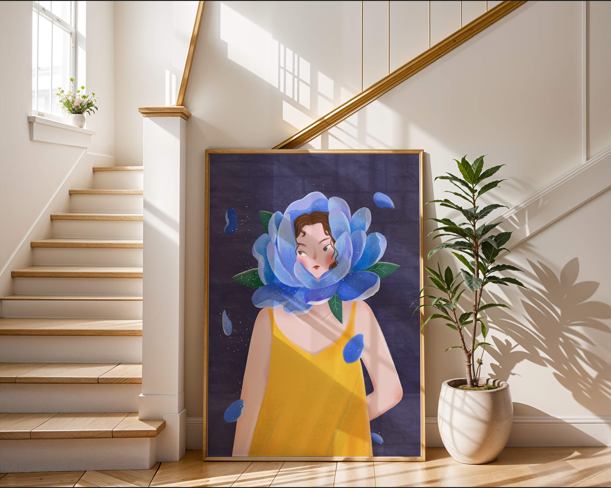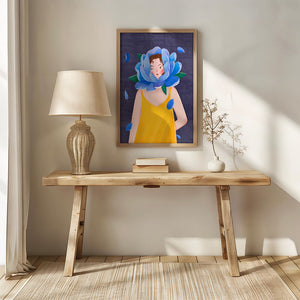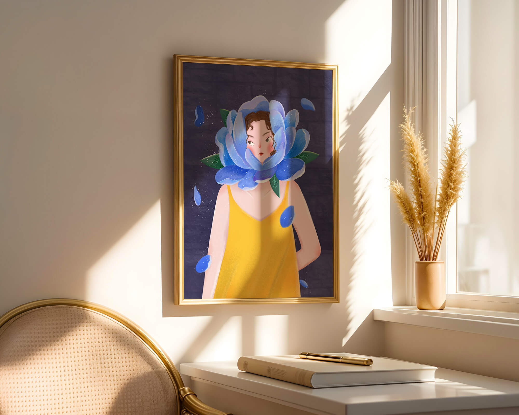This captivating illustration features a woman whose head is artistically portrayed as a large blue flower, adding an imaginative twist to her appearance. Her vibrant yellow dress contrasts beautifully with the cool tones of the petals, creating an eye-catching composition.