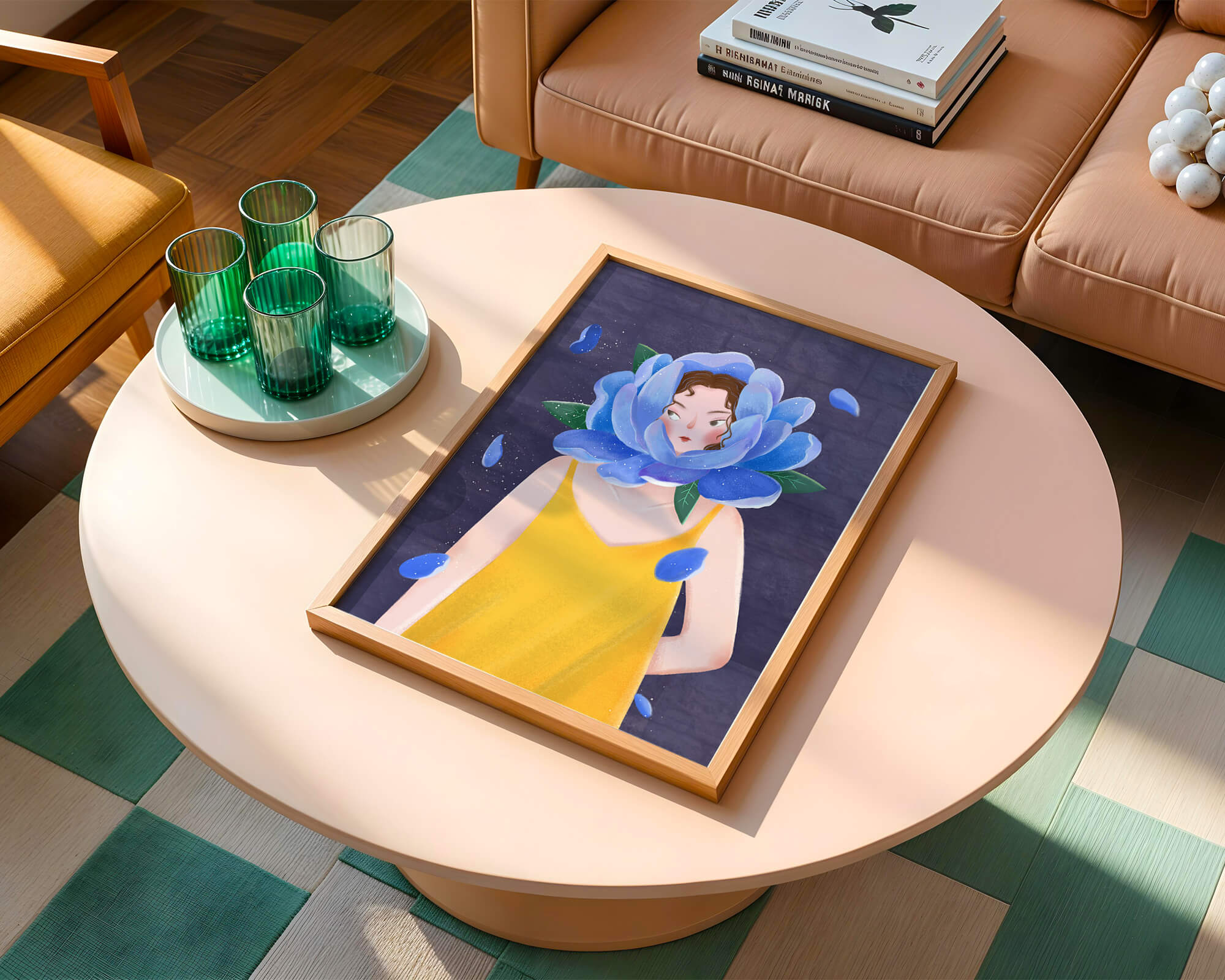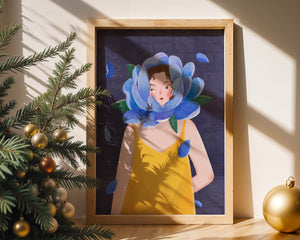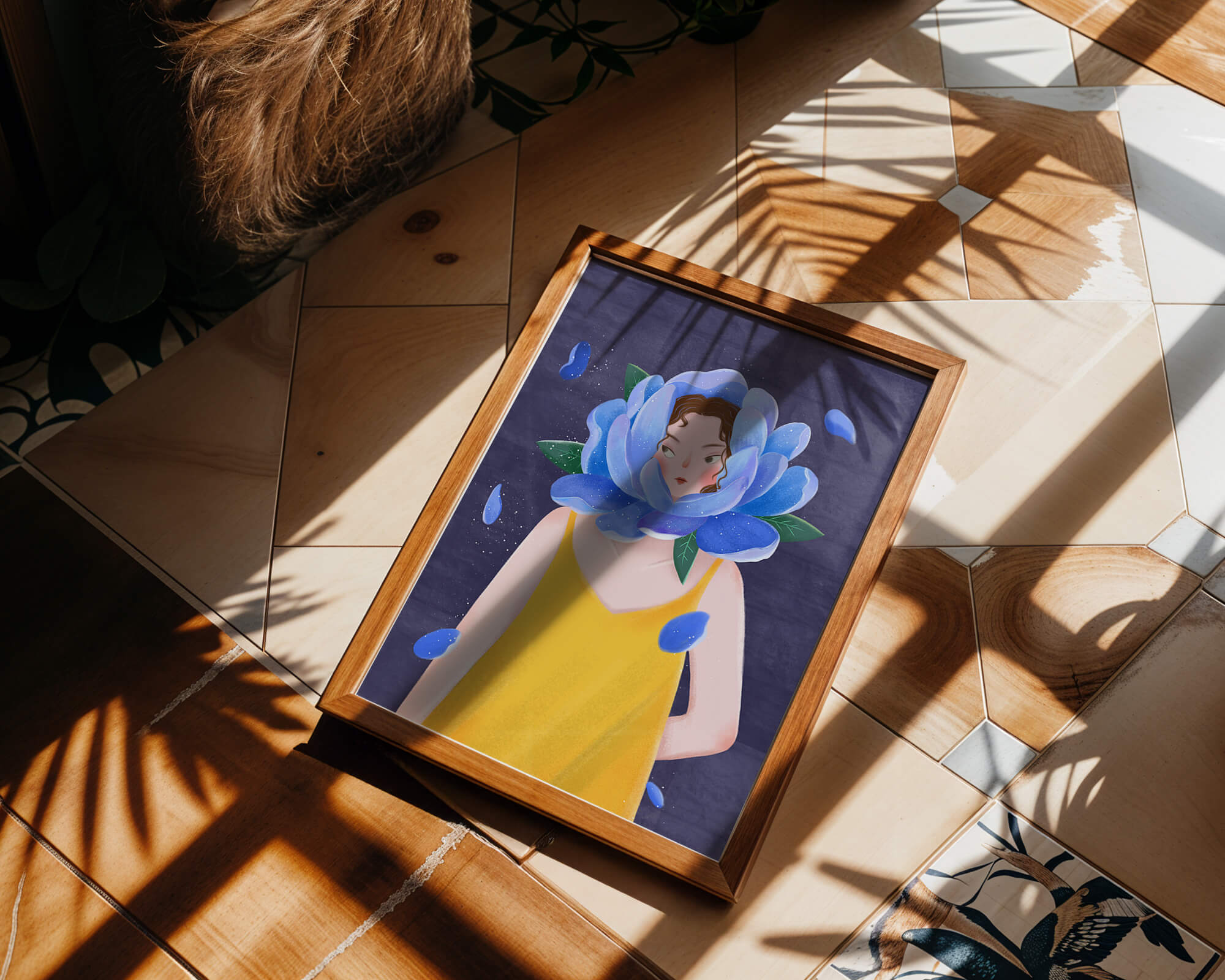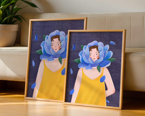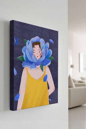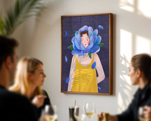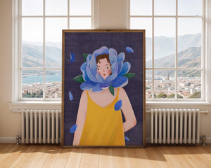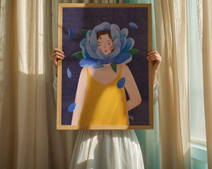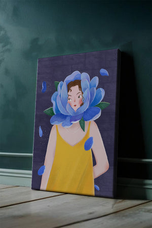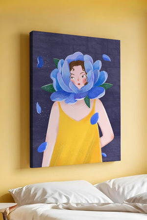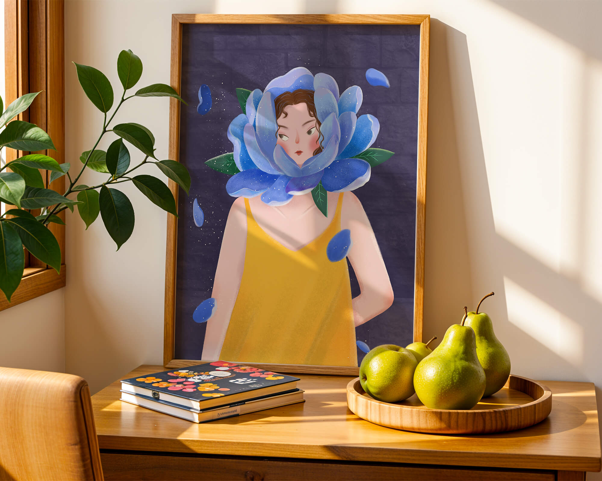 This captivating illustration features a woman whose head is artistically portrayed as a large blue flower, adding an imaginative twist to her appearance. Her vibrant yellow dress contrasts beautifully with the cool tones of the petals, creating an eye-catching composition.