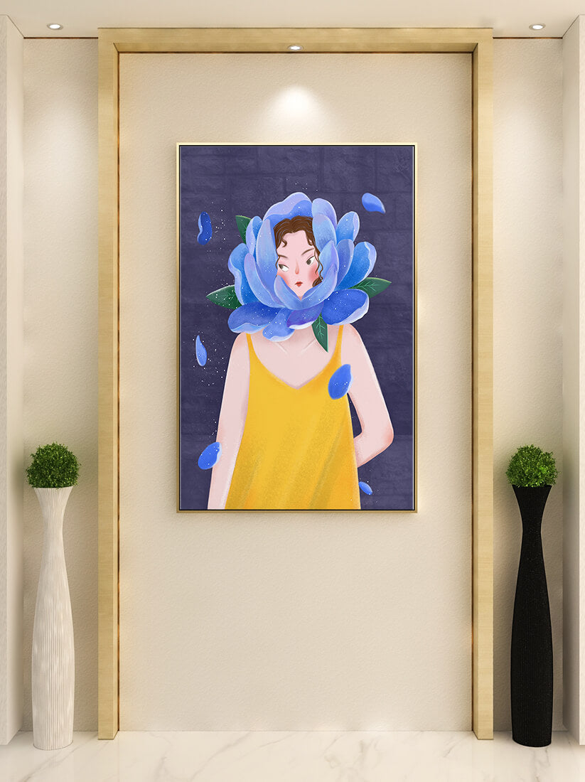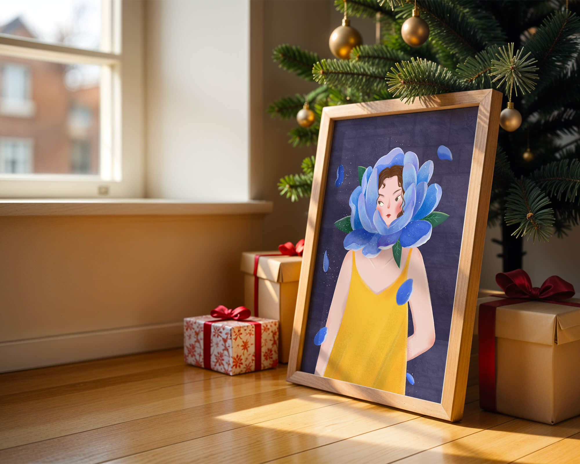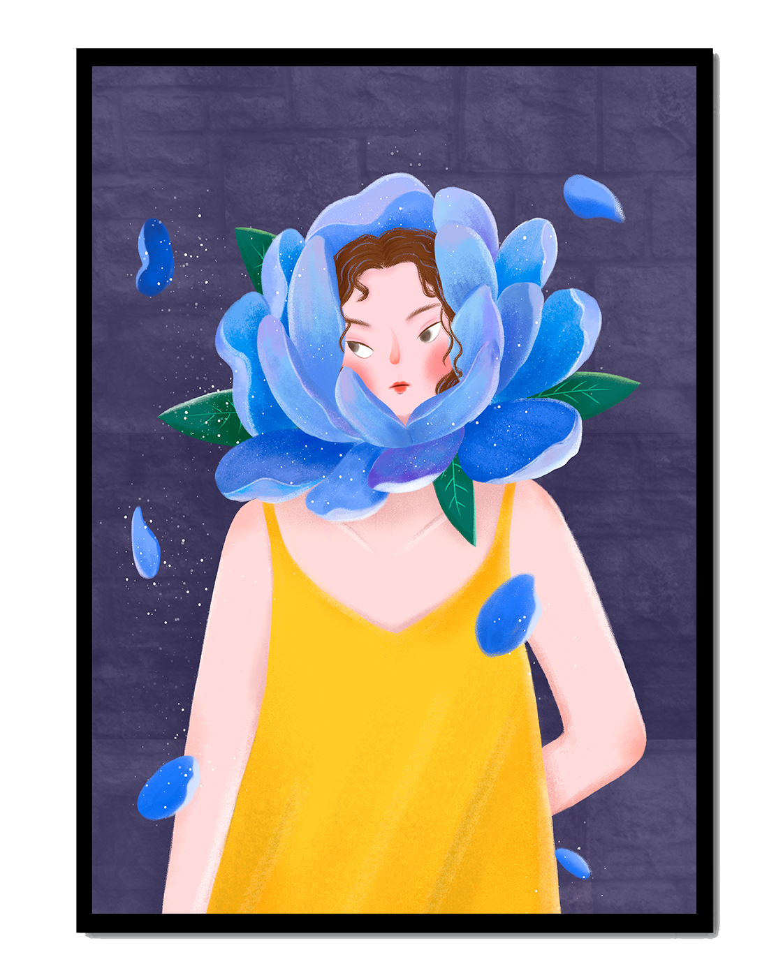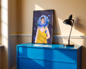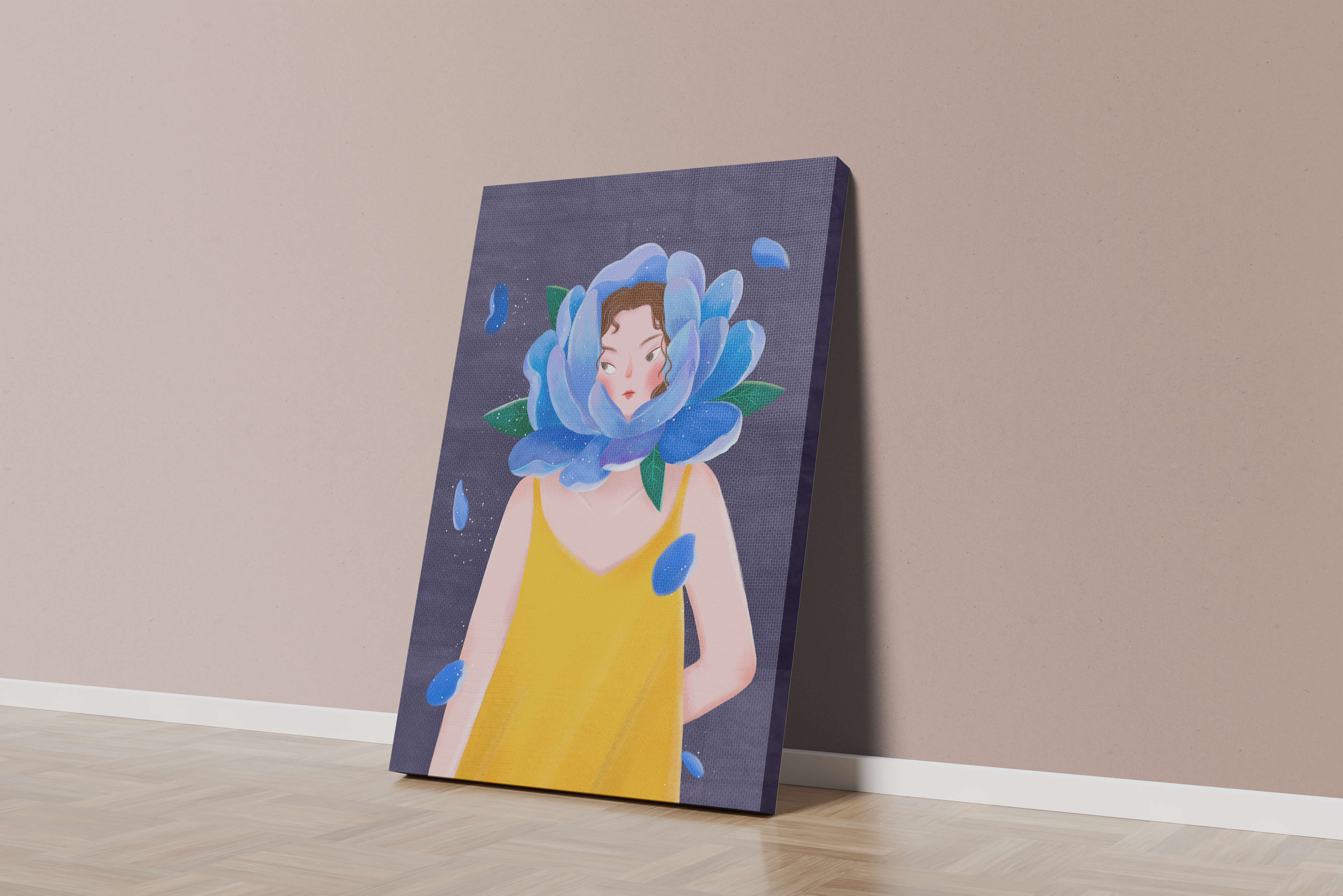 This captivating illustration features a woman whose head is artistically portrayed as a large blue flower, adding an imaginative twist to her appearance. Her vibrant yellow dress contrasts beautifully with the cool tones of the petals, creating an eye-catching composition.