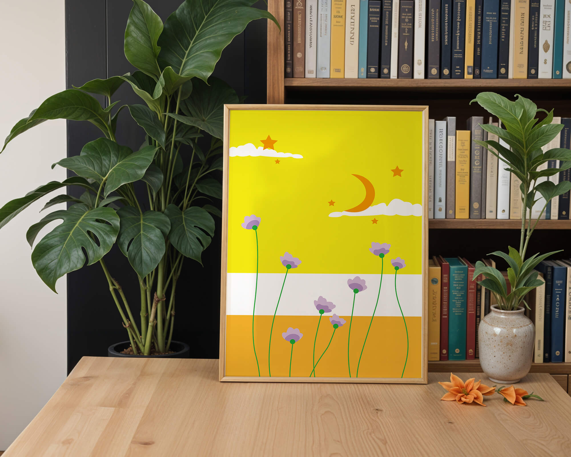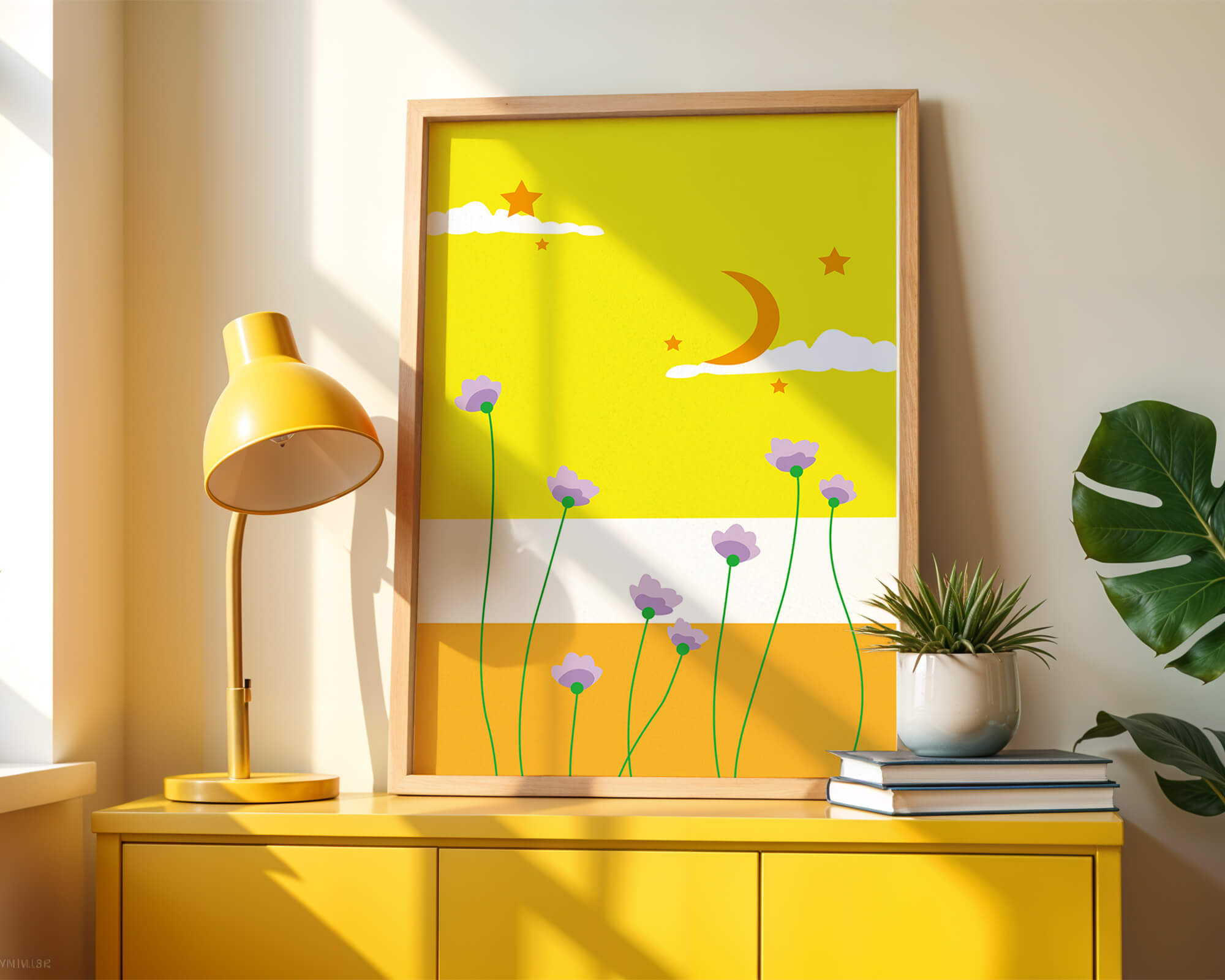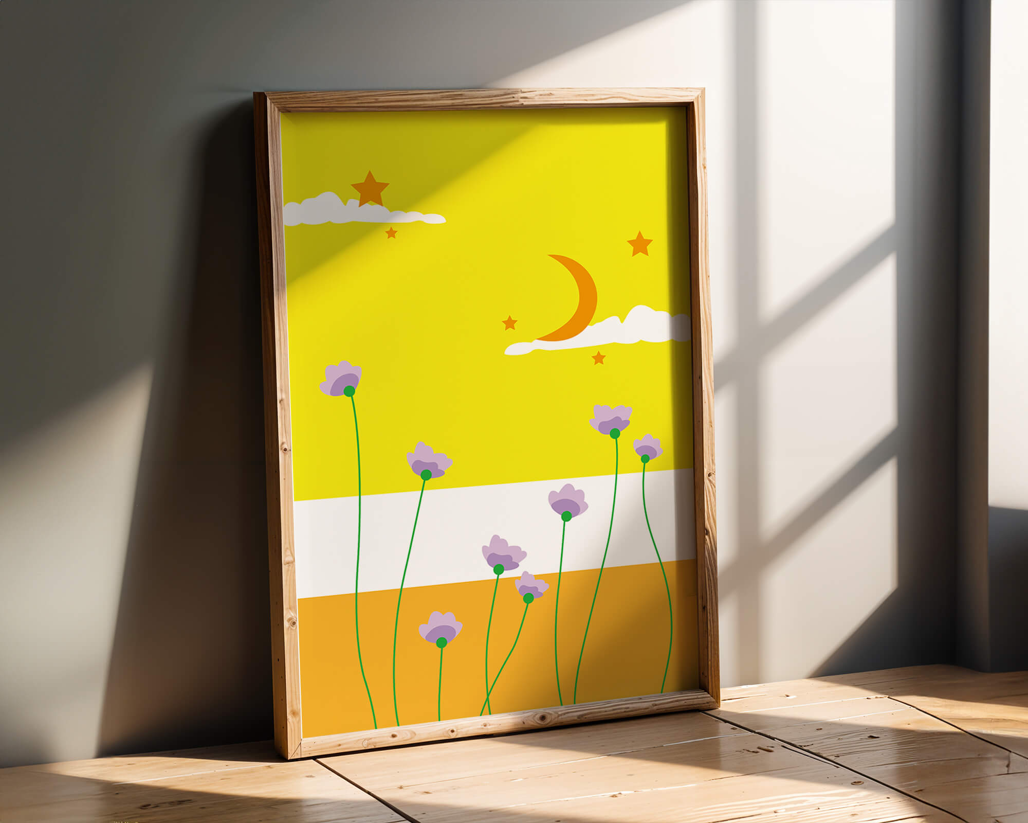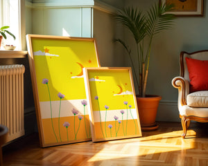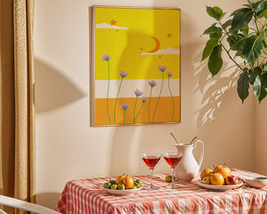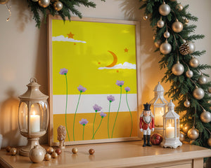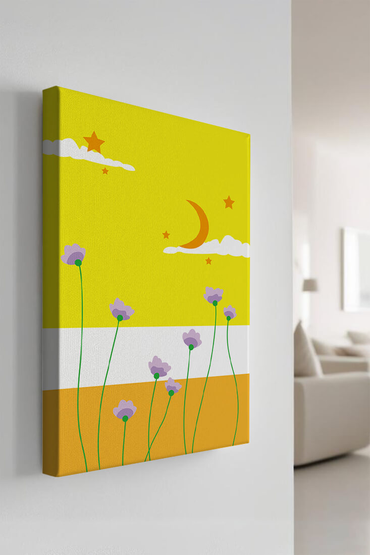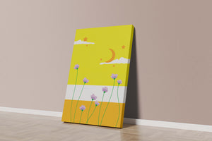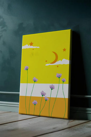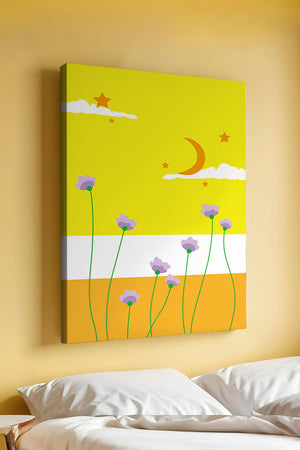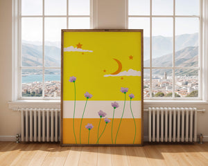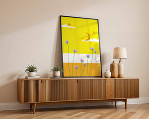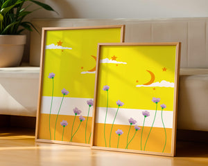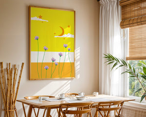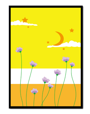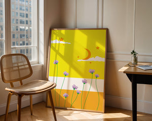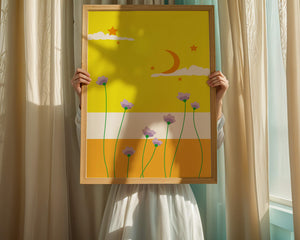 In the foreground, delicate purple flowers with green stems reach upwards, adding a lively touch to the composition. Their presence against the bold yellow and orange bands of the horizon evokes a sense of calm and wonder. The use of bold colors combined with simple, yet striking imagery makes this piece suitable for a variety of spaces.Whether for a childrens room to spark imagination or as an accent piece in a living area, this illustration brings a unique blend of warmth and visual interest. Its playful elements invite the viewer to dream and explore, making it a charming addition to any decor.| Type |