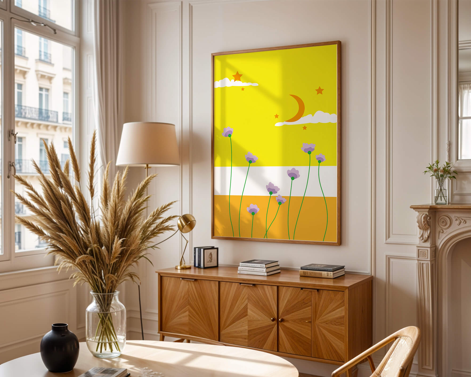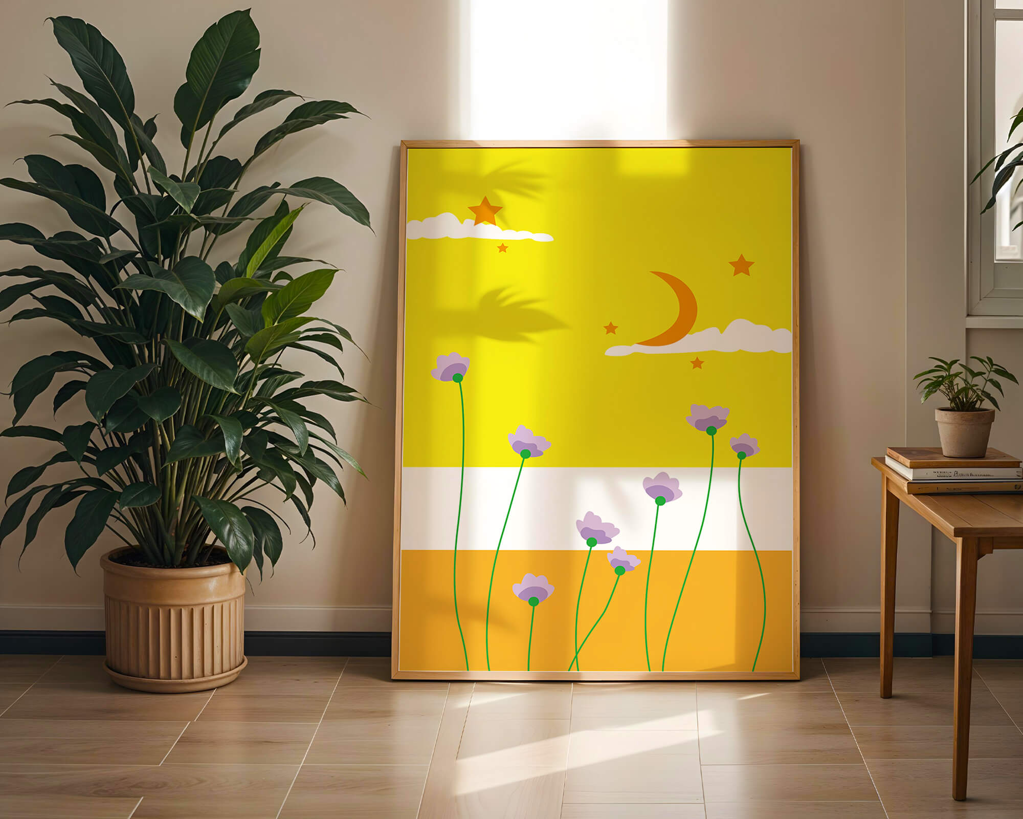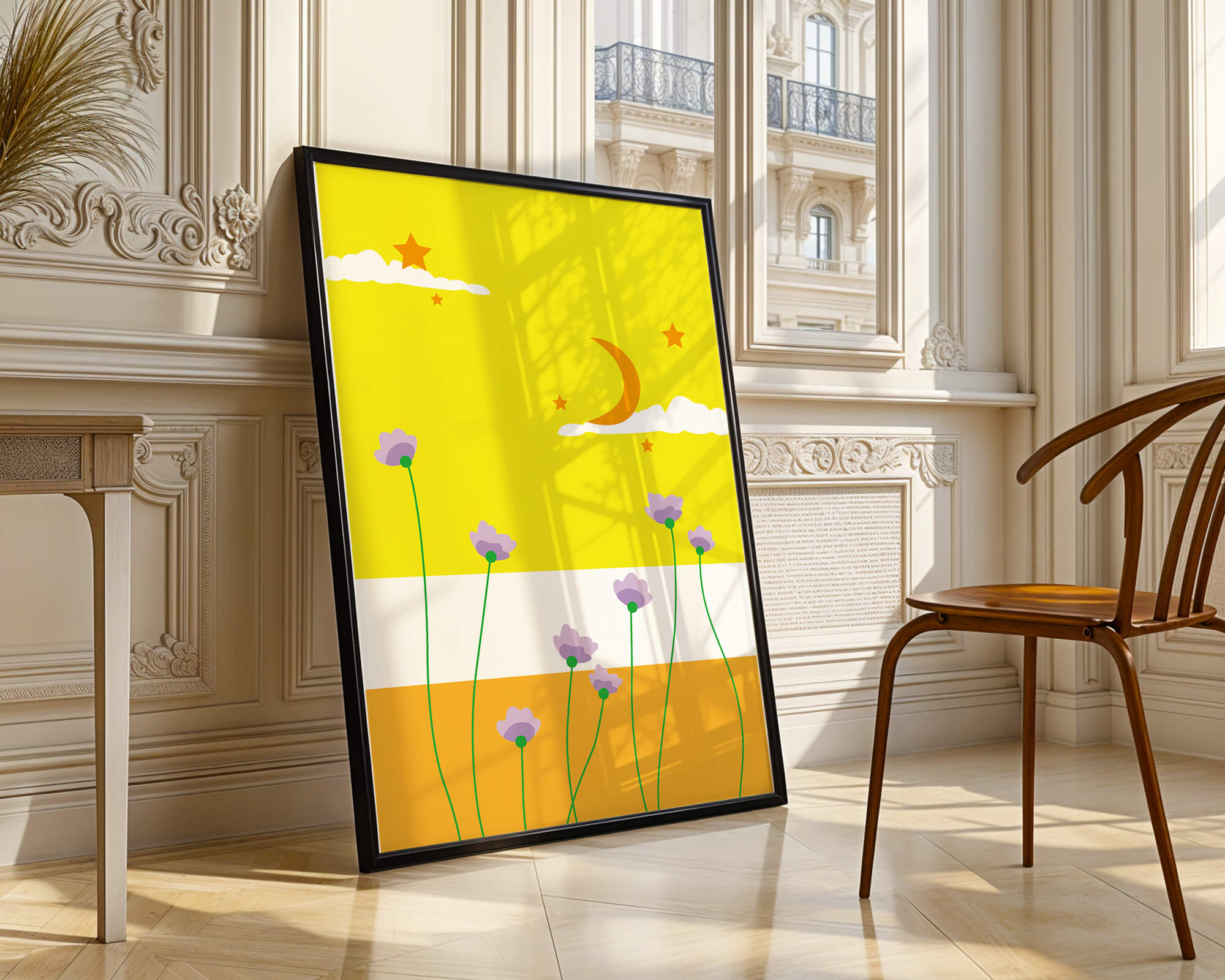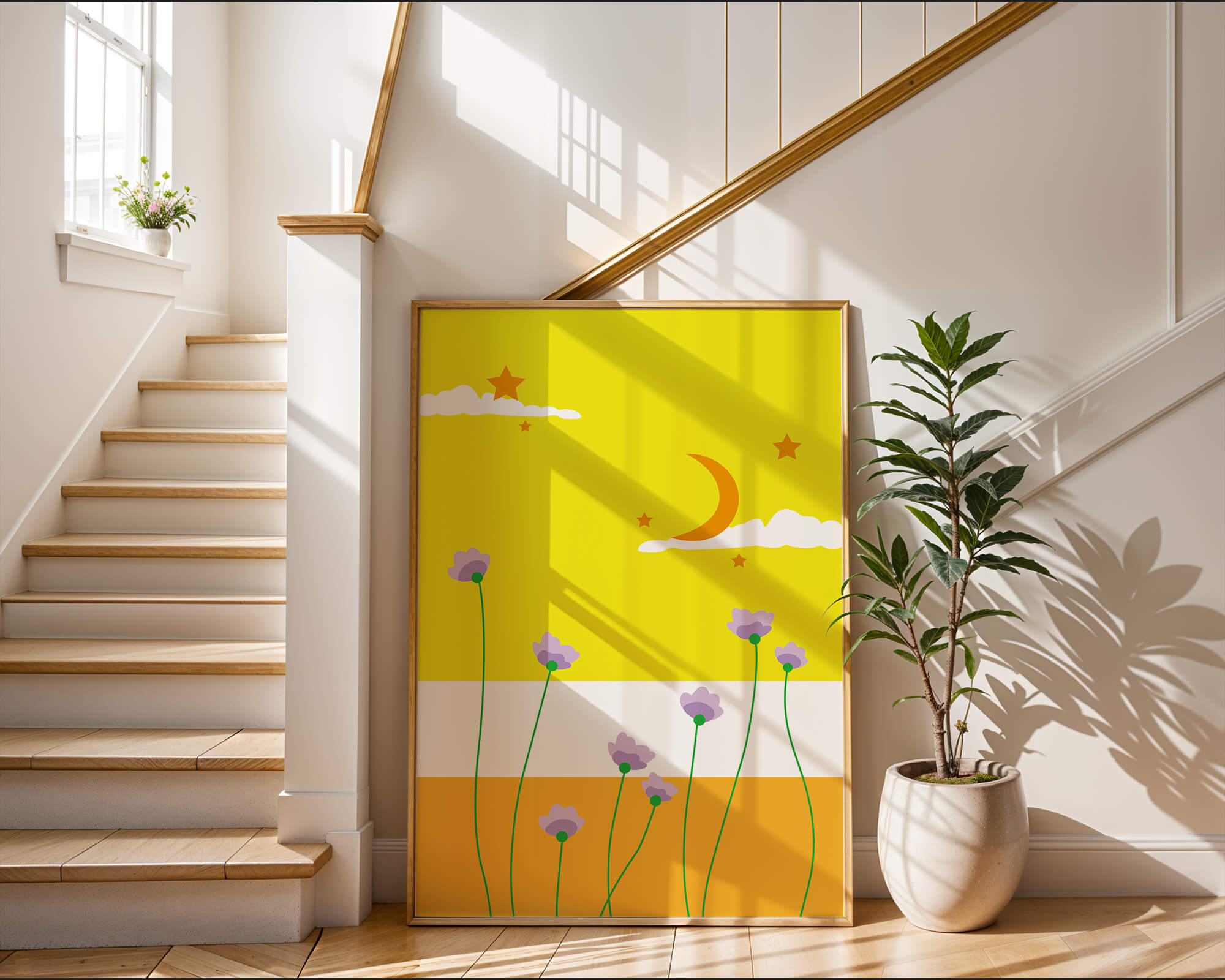 In the foreground, delicate purple flowers with green stems reach upwards, adding a lively touch to the composition. Their presence against the bold yellow and orange bands of the horizon evokes a sense of calm and wonder. The use of bold colors combined with simple, yet striking imagery makes this piece suitable for a variety of spaces.Whether for a childrens room to spark imagination or as an accent piece in a living area, this illustration brings a unique blend of warmth and visual interest. Its playful elements invite the viewer to dream and explore, making it a charming addition to any decor.| Type |