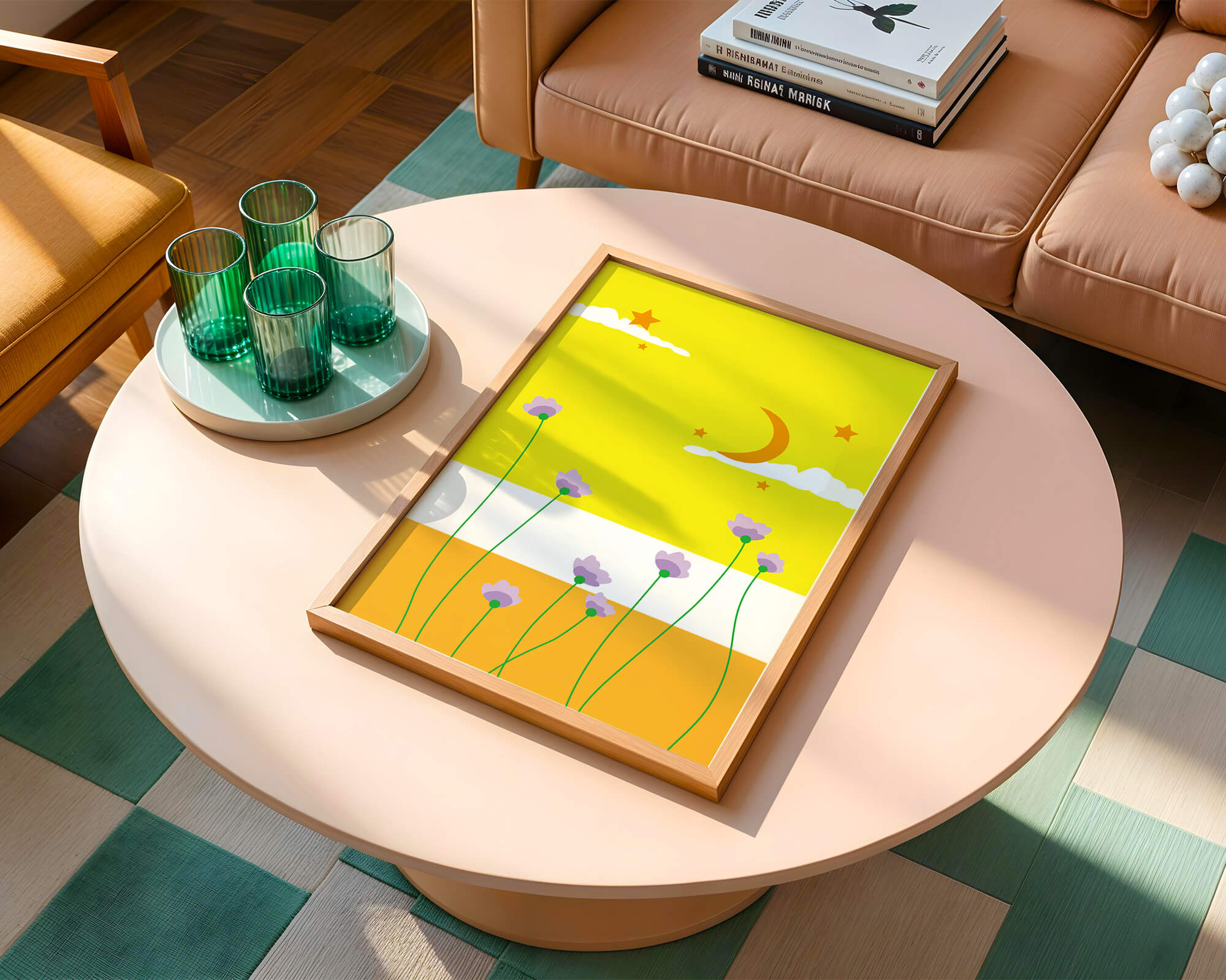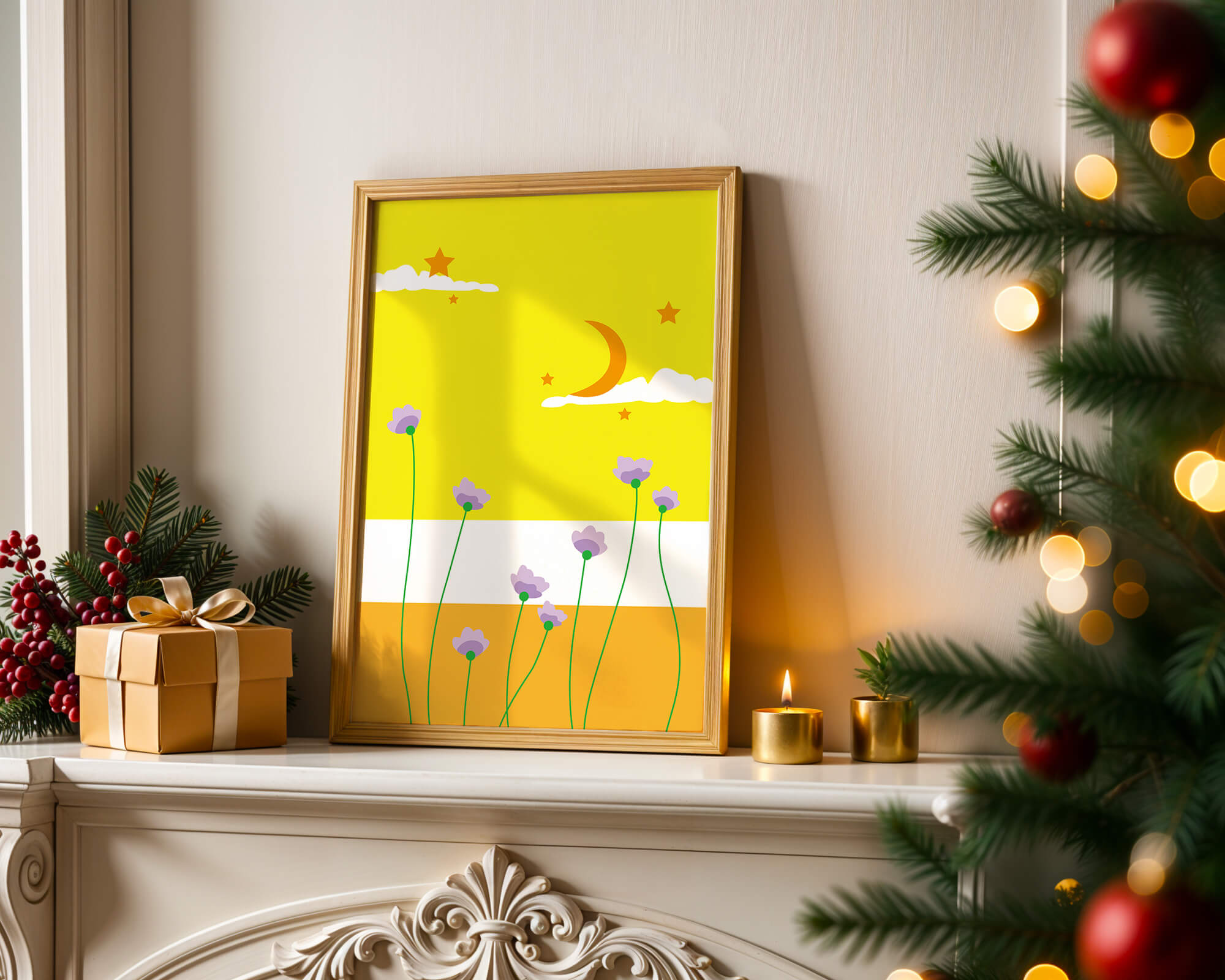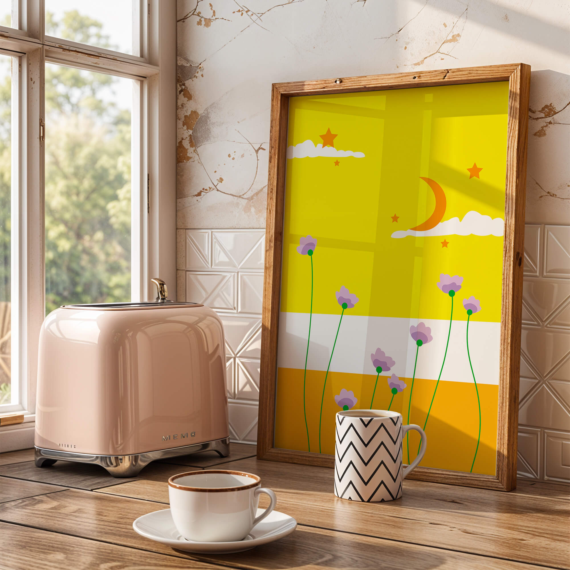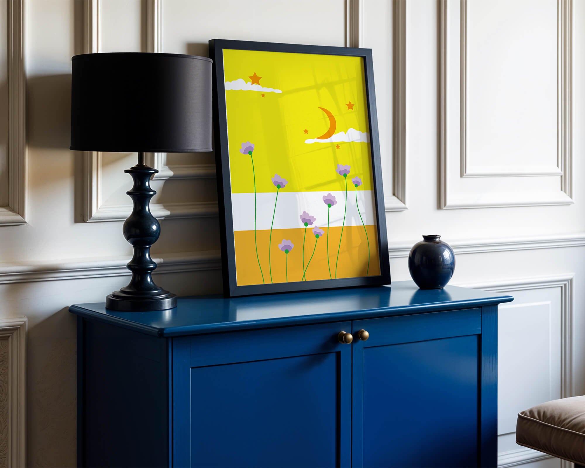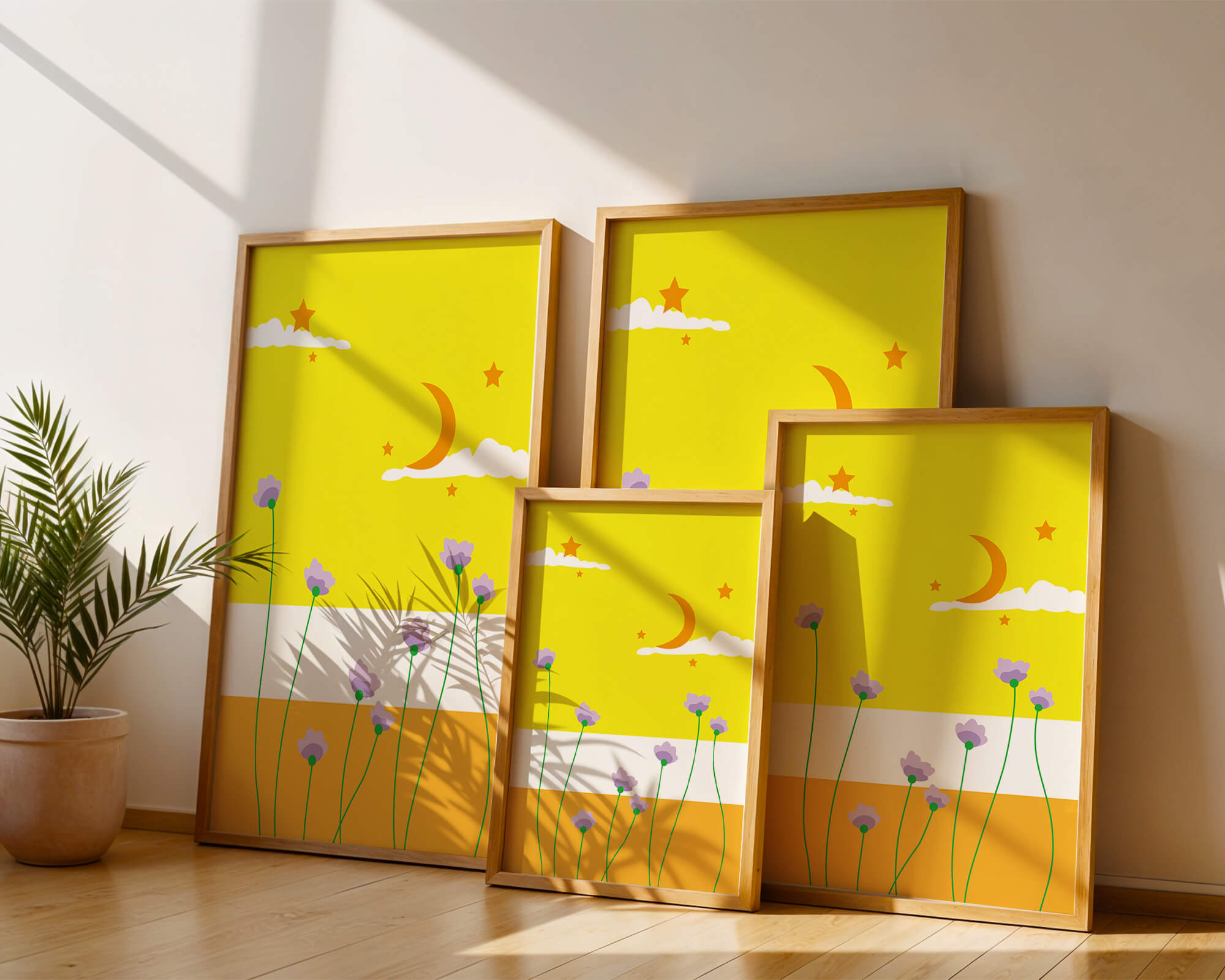 In the foreground, delicate purple flowers with green stems reach upwards, adding a lively touch to the composition. Their presence against the bold yellow and orange bands of the horizon evokes a sense of calm and wonder. The use of bold colors combined with simple, yet striking imagery makes this piece suitable for a variety of spaces.Whether for a childrens room to spark imagination or as an accent piece in a living area, this illustration brings a unique blend of warmth and visual interest. Its playful elements invite the viewer to dream and explore, making it a charming addition to any decor.| Type |