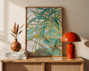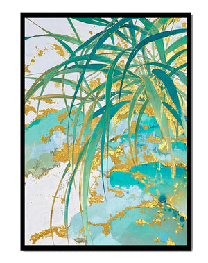 The interplay of organic shapes and metallic highlights evokes the beauty of tropical landscapes with a refined, contemporary twist. Whether adorning a living room, bedroom, or office, this piece adds a touch of serenity and artistic charm, making it a perfect choice for those who appreciate modern botanical aesthetics.