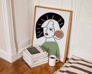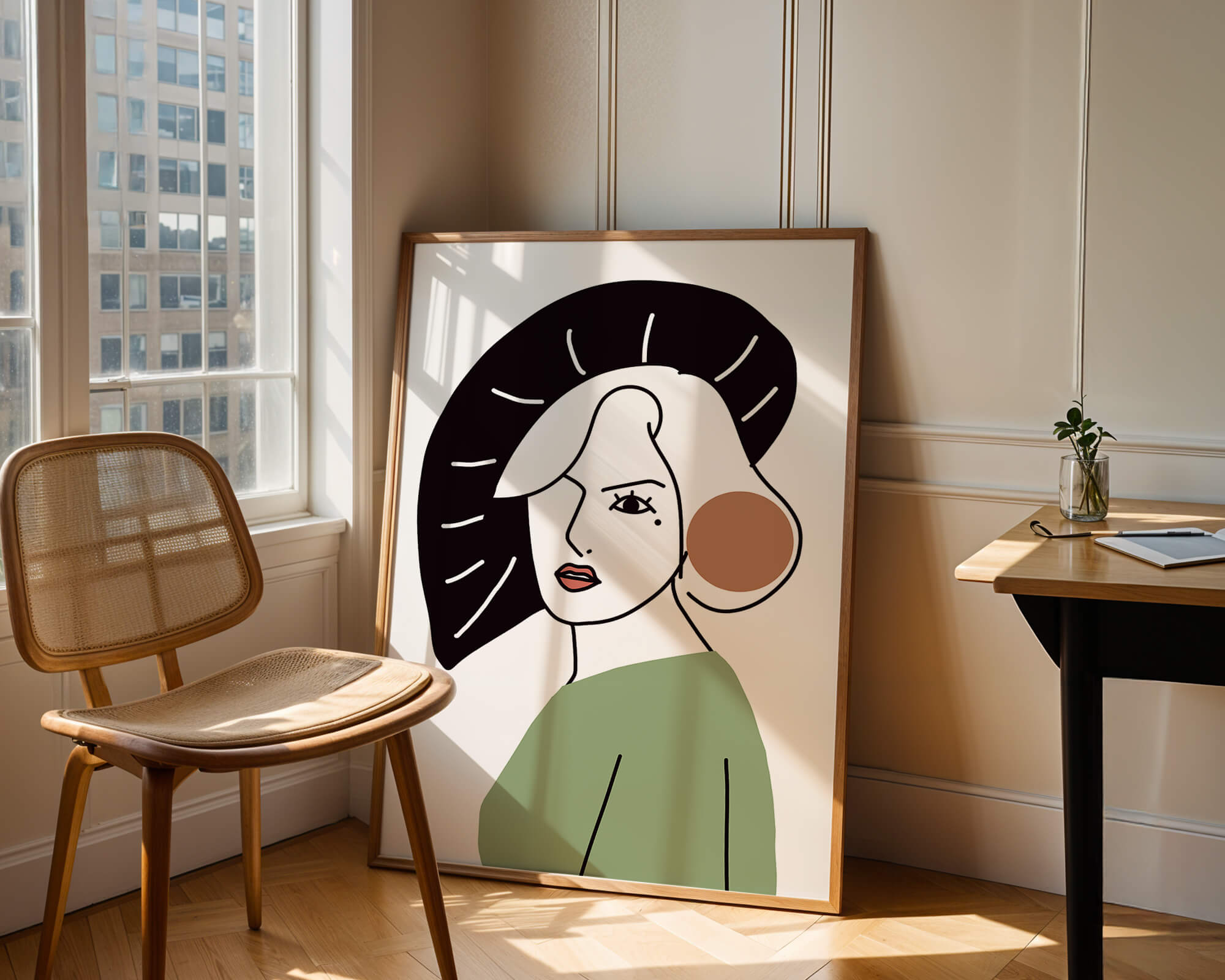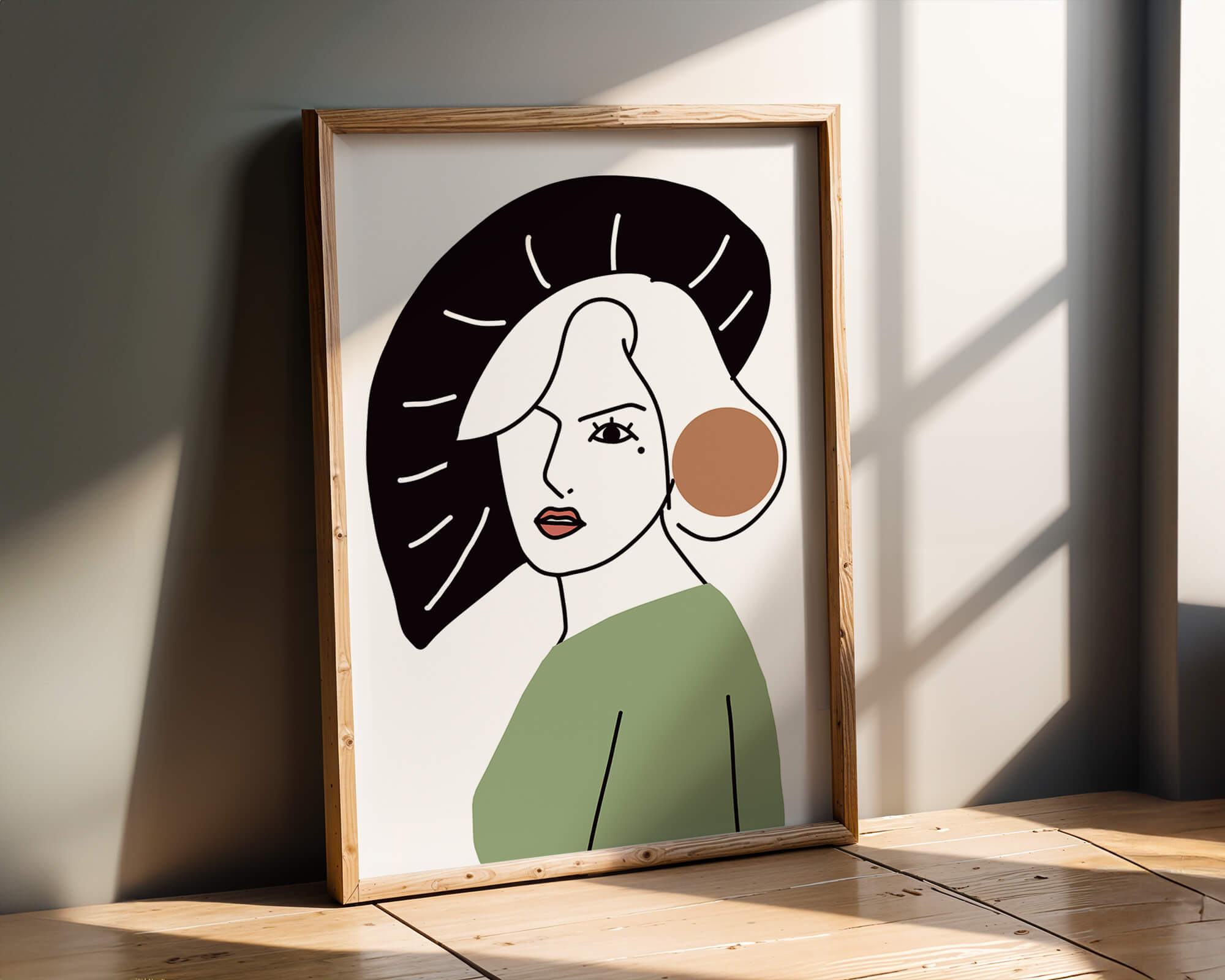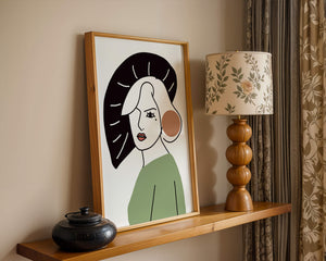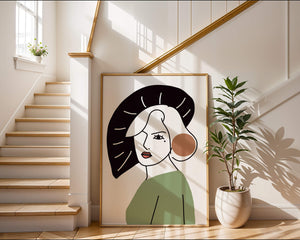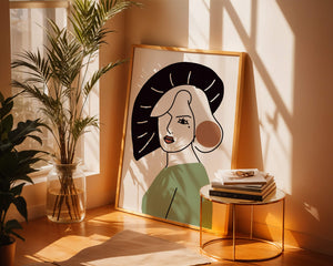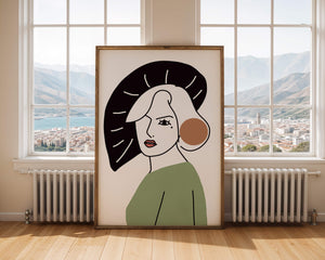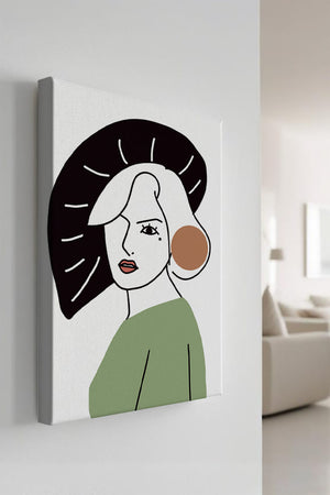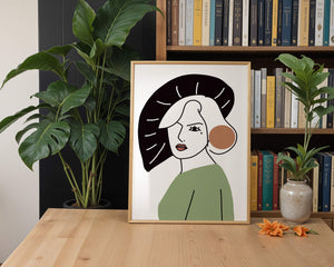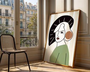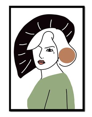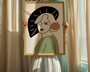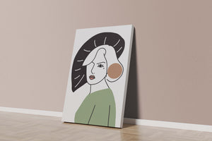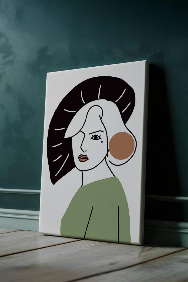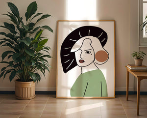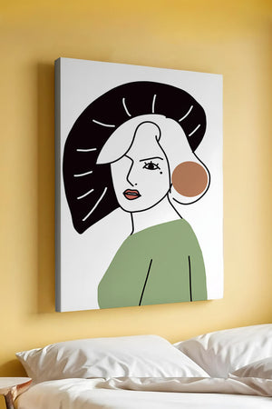 Experience the charm of minimalist design with this abstract portrait. The artwork features a woman with distinct facial features, accentuated by a large black hat and a round accent on her cheek. The combination of earthy tones and bold lines makes it a captivating piece.