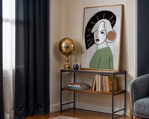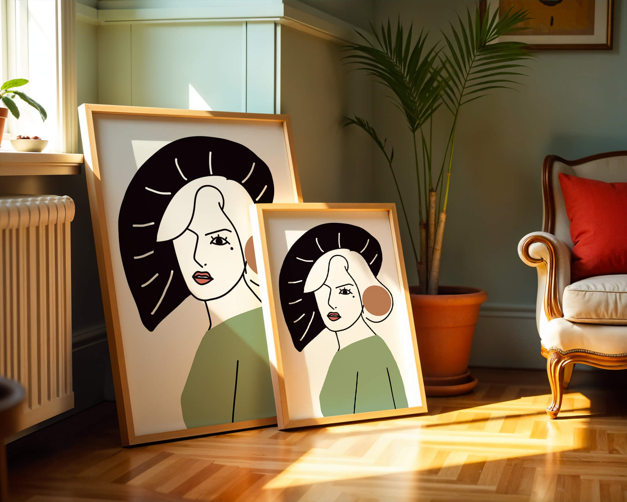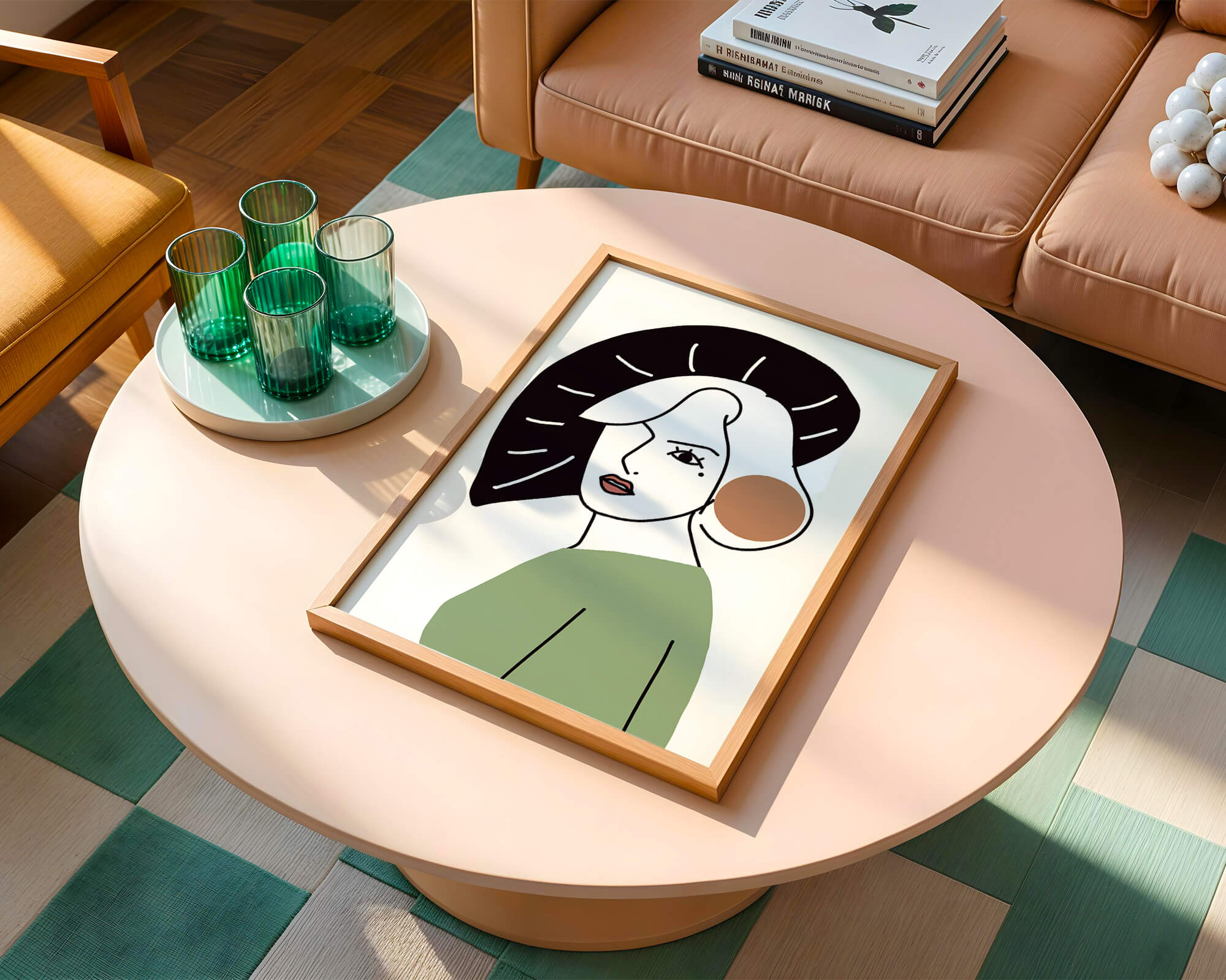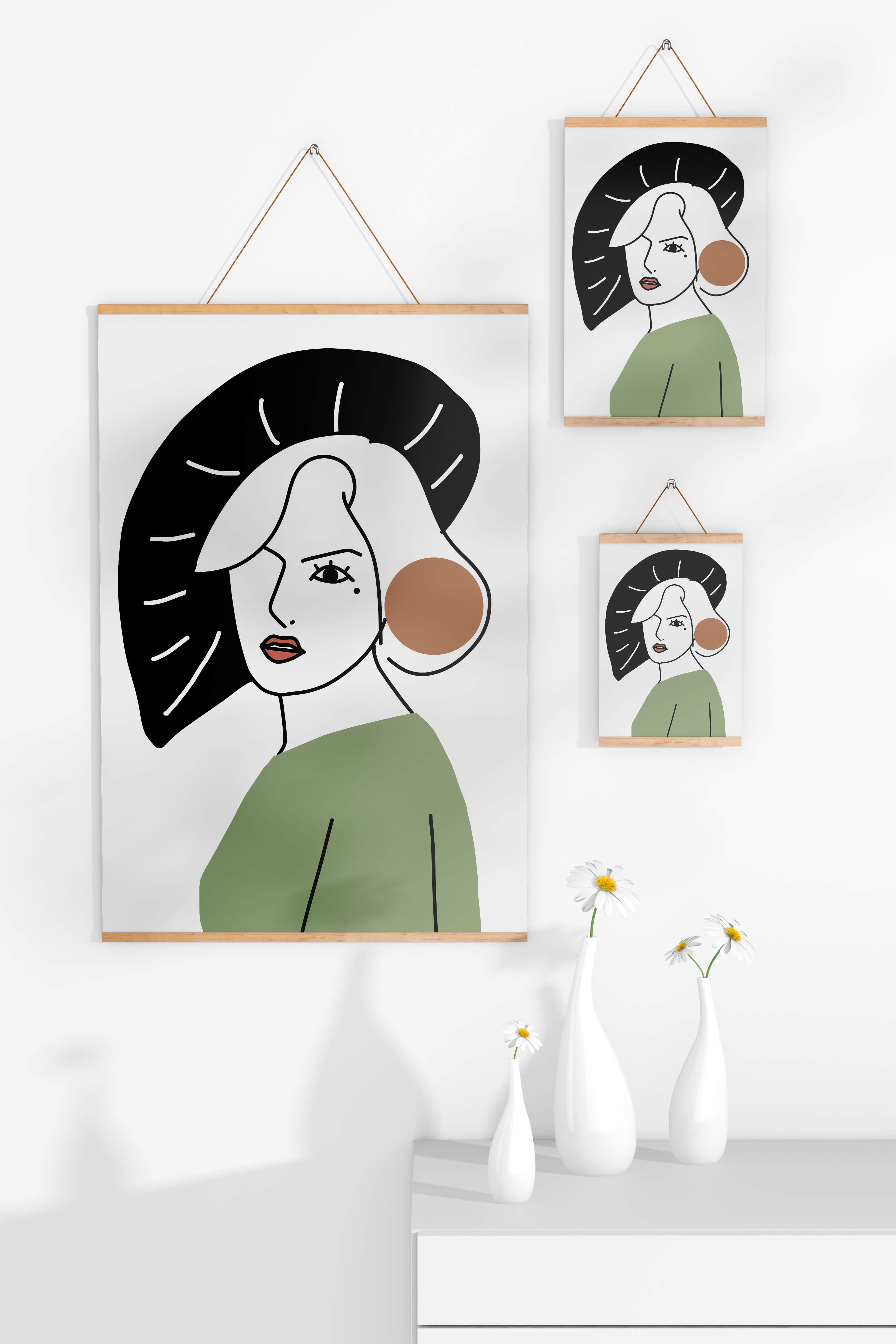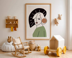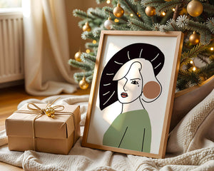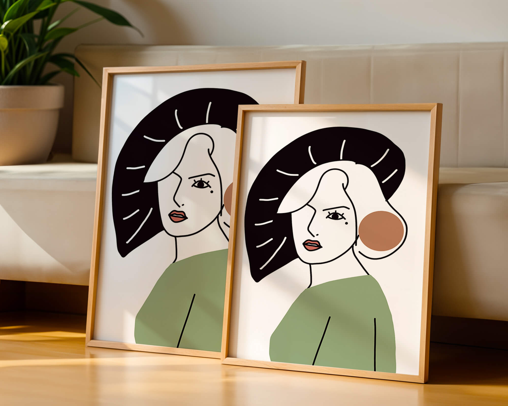 Experience the charm of minimalist design with this abstract portrait. The artwork features a woman with distinct facial features, accentuated by a large black hat and a round accent on her cheek. The combination of earthy tones and bold lines makes it a captivating piece.