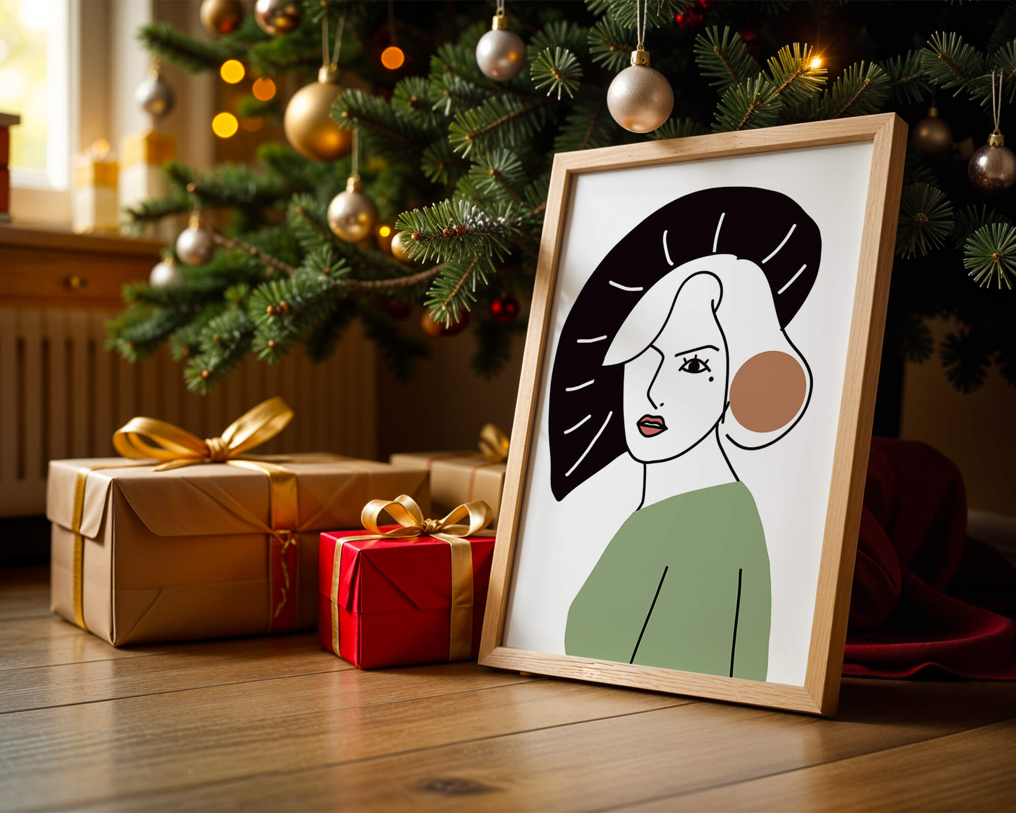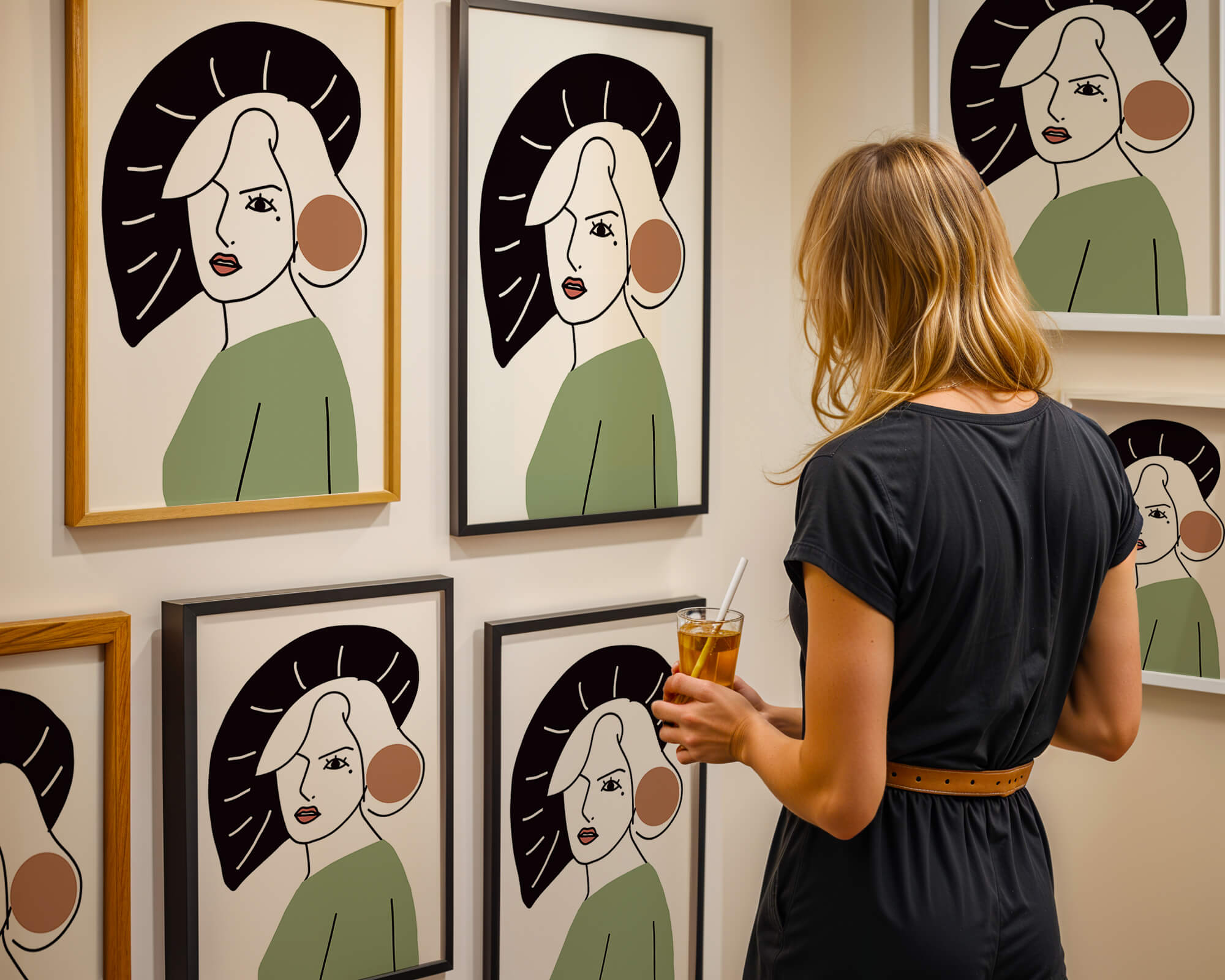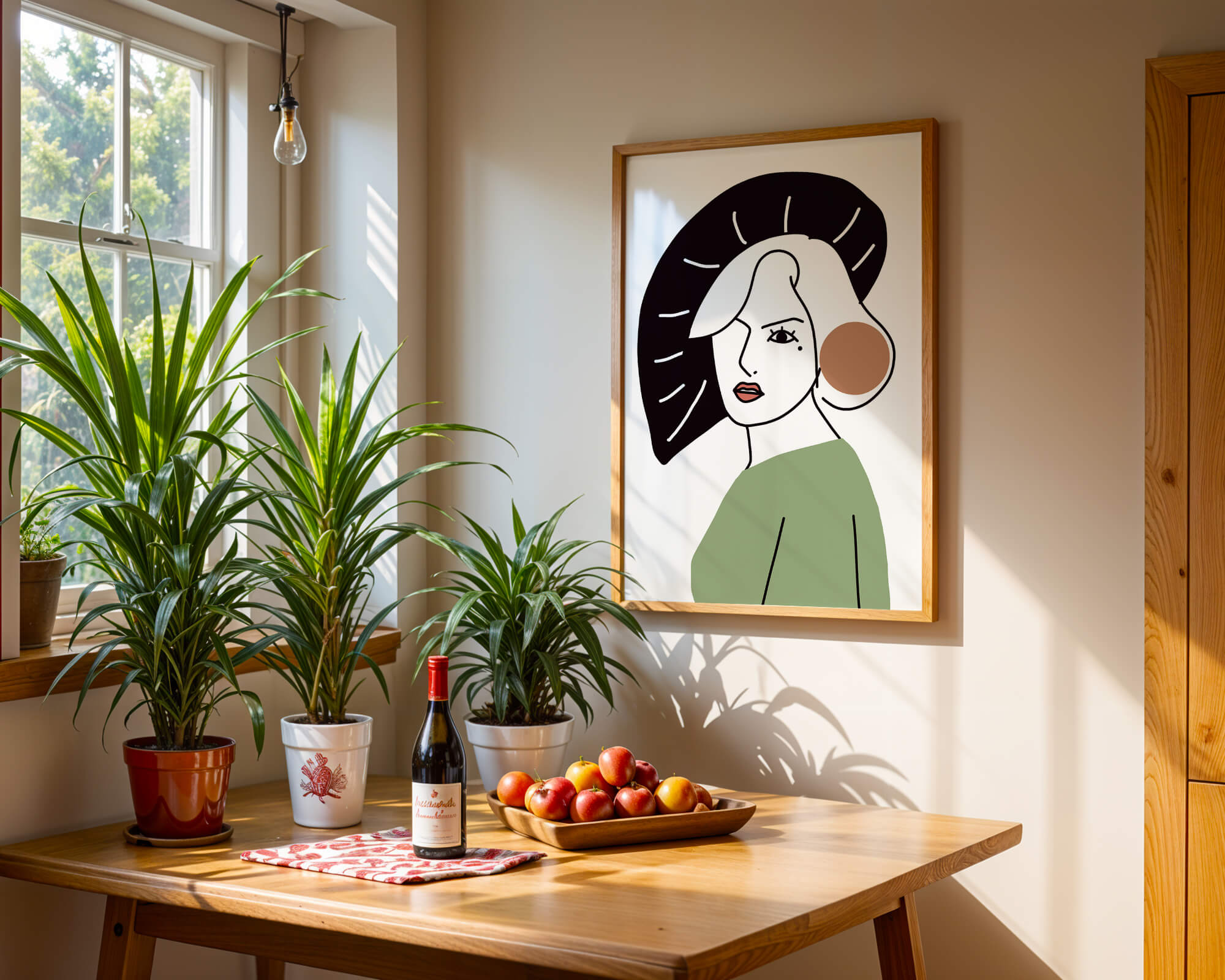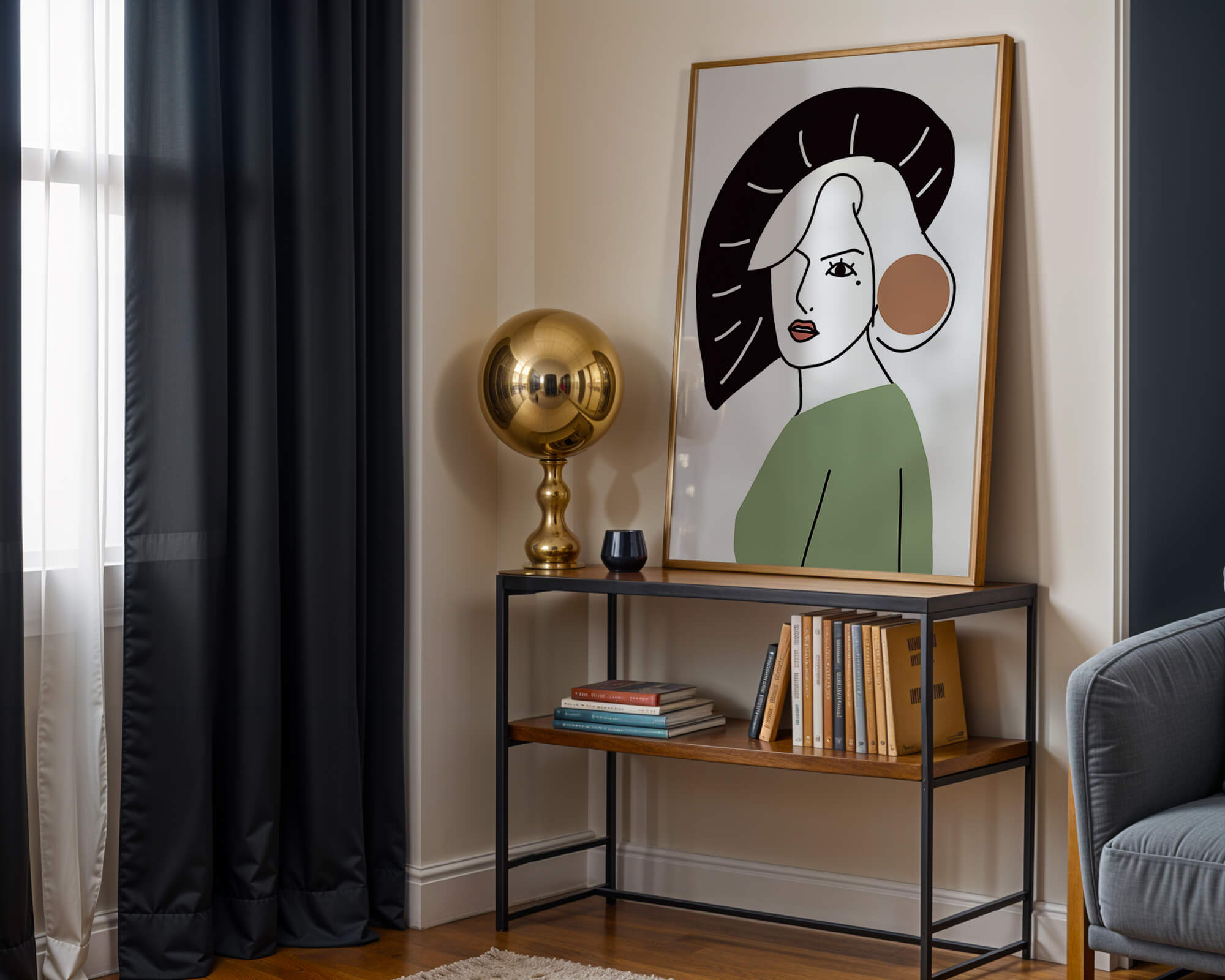 Experience the charm of minimalist design with this abstract portrait. The artwork features a woman with distinct facial features, accentuated by a large black hat and a round accent on her cheek. The combination of earthy tones and bold lines makes it a captivating piece.